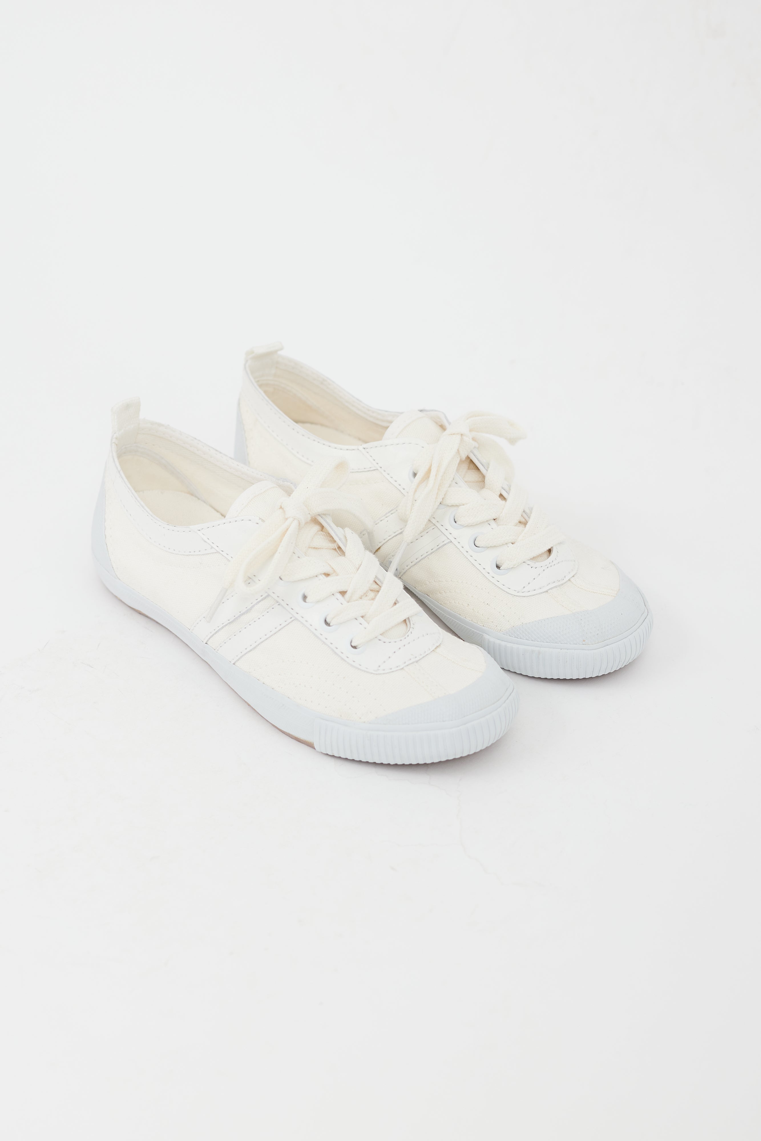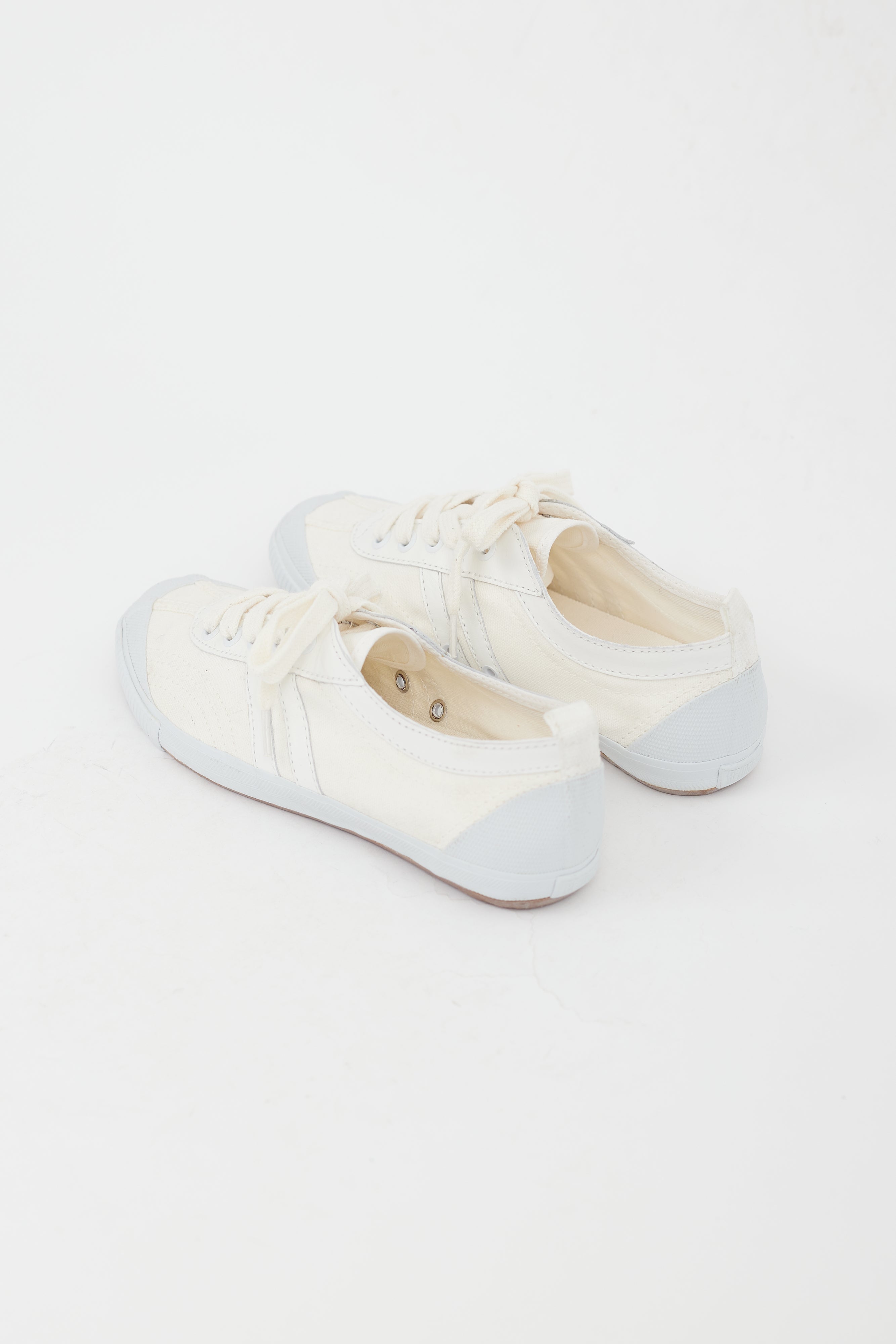 Pre-owned Re/Done white sneakers featuring a round toe, stripes at sides, pull tab at heel, and lace up closure.