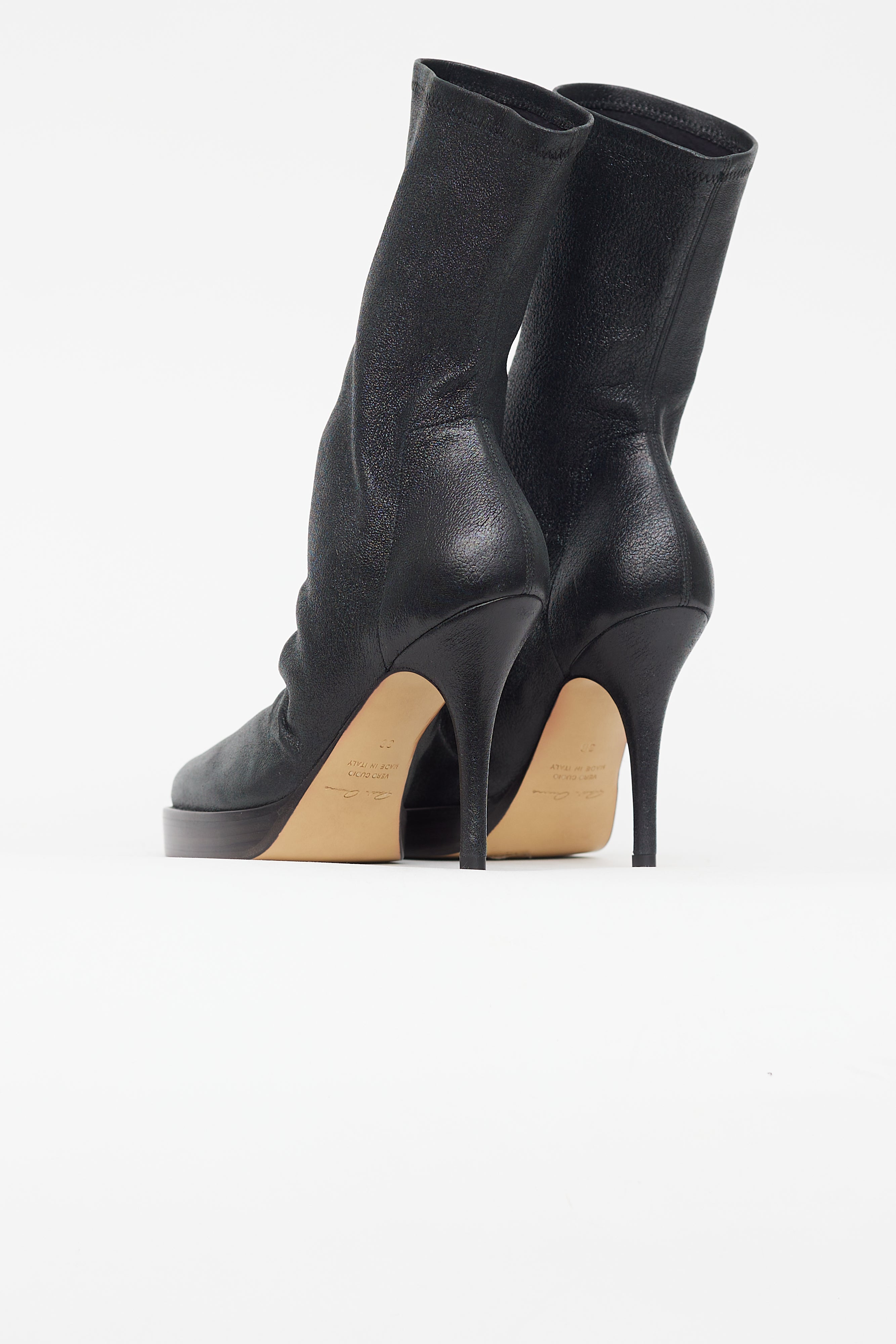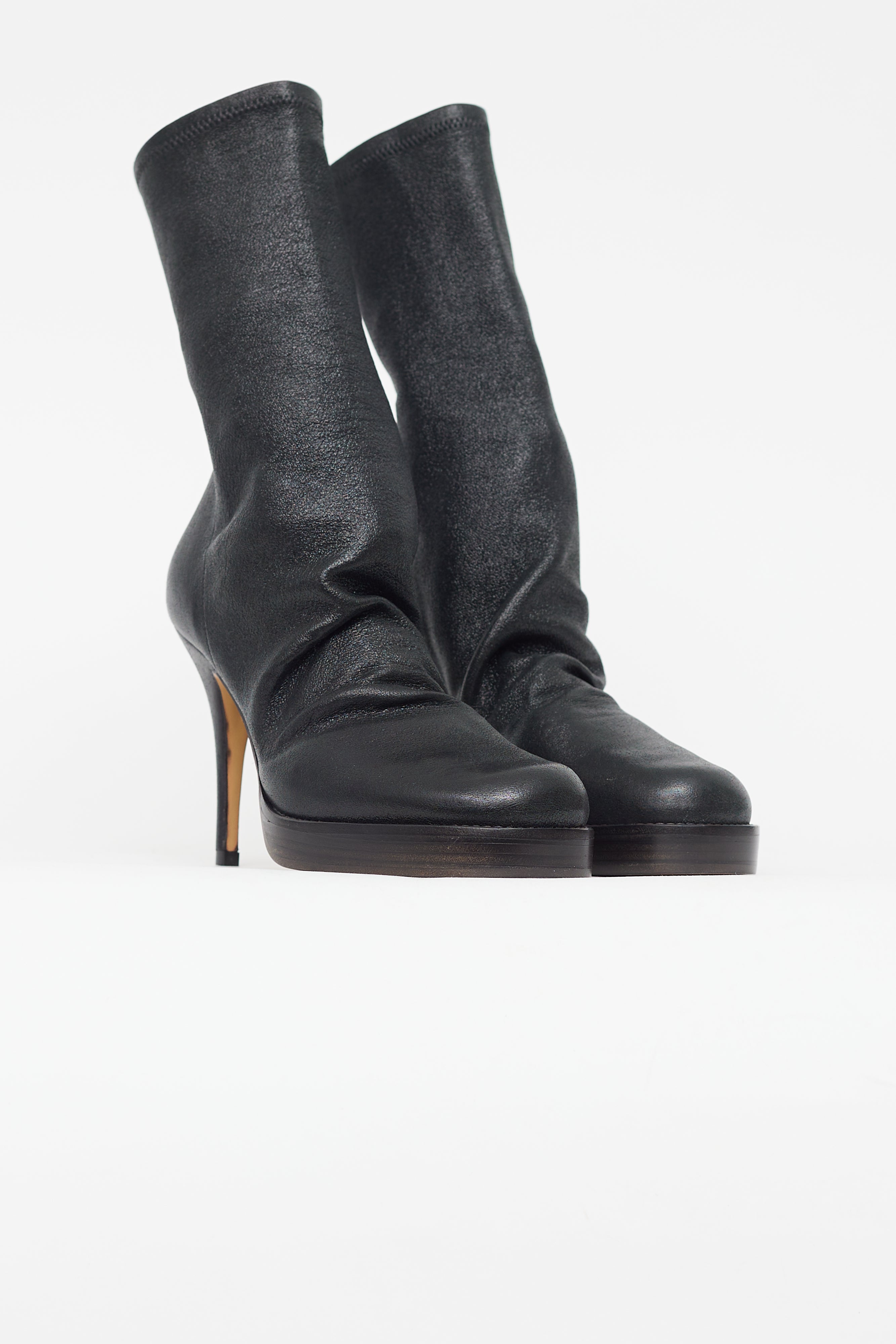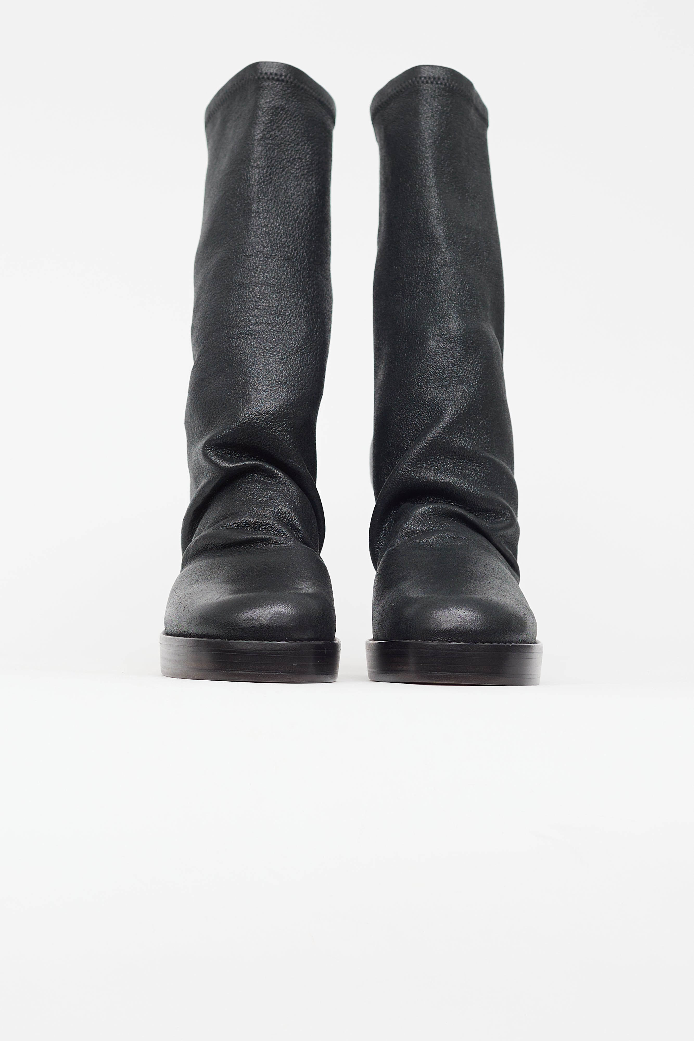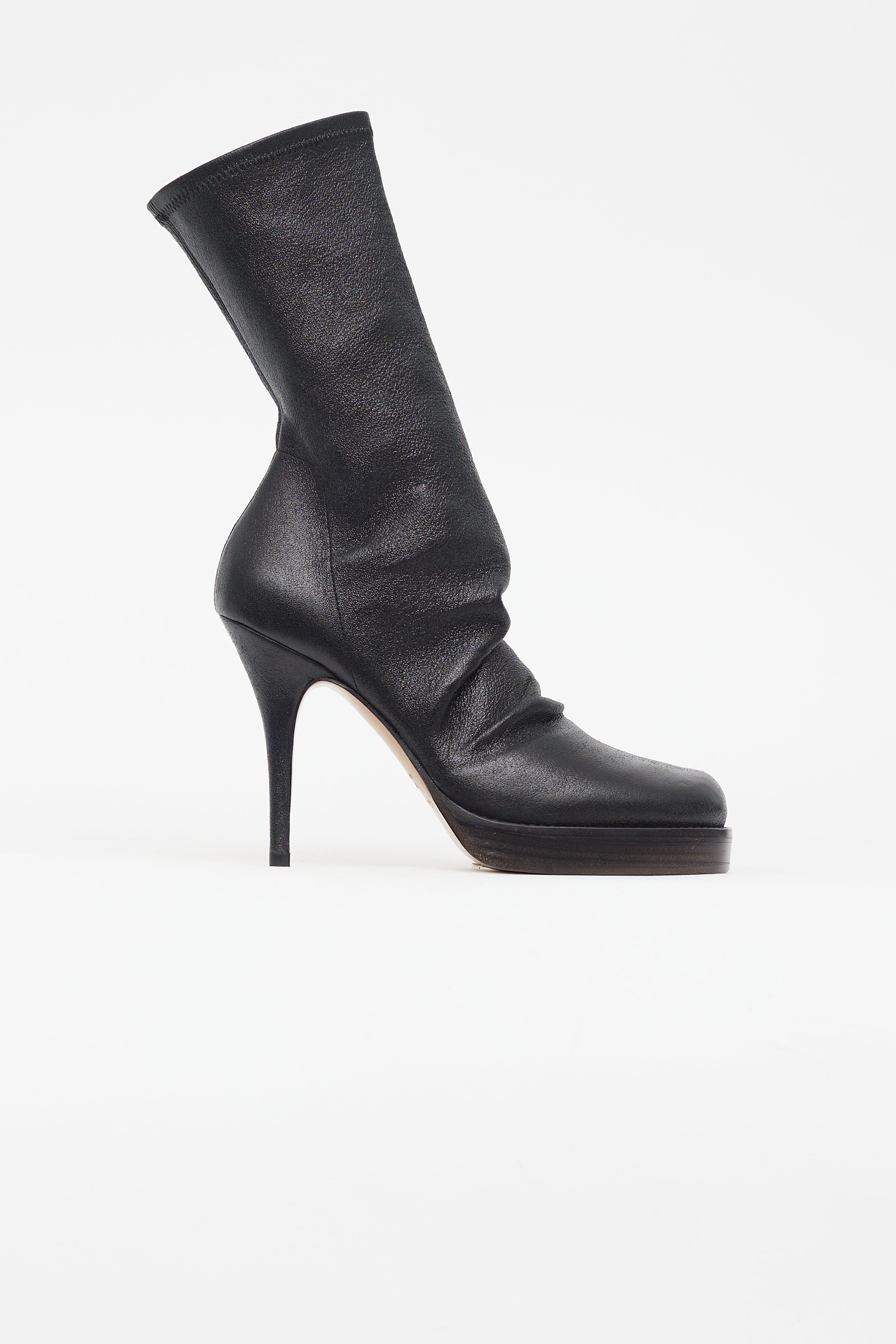Pre-owned Rick Owens black boots featuring rounded square toe, sock style upper, structured toe cap and heel counter, platform toe box, slip on entry, and stiletto heel. Comes with original tote bag and box.