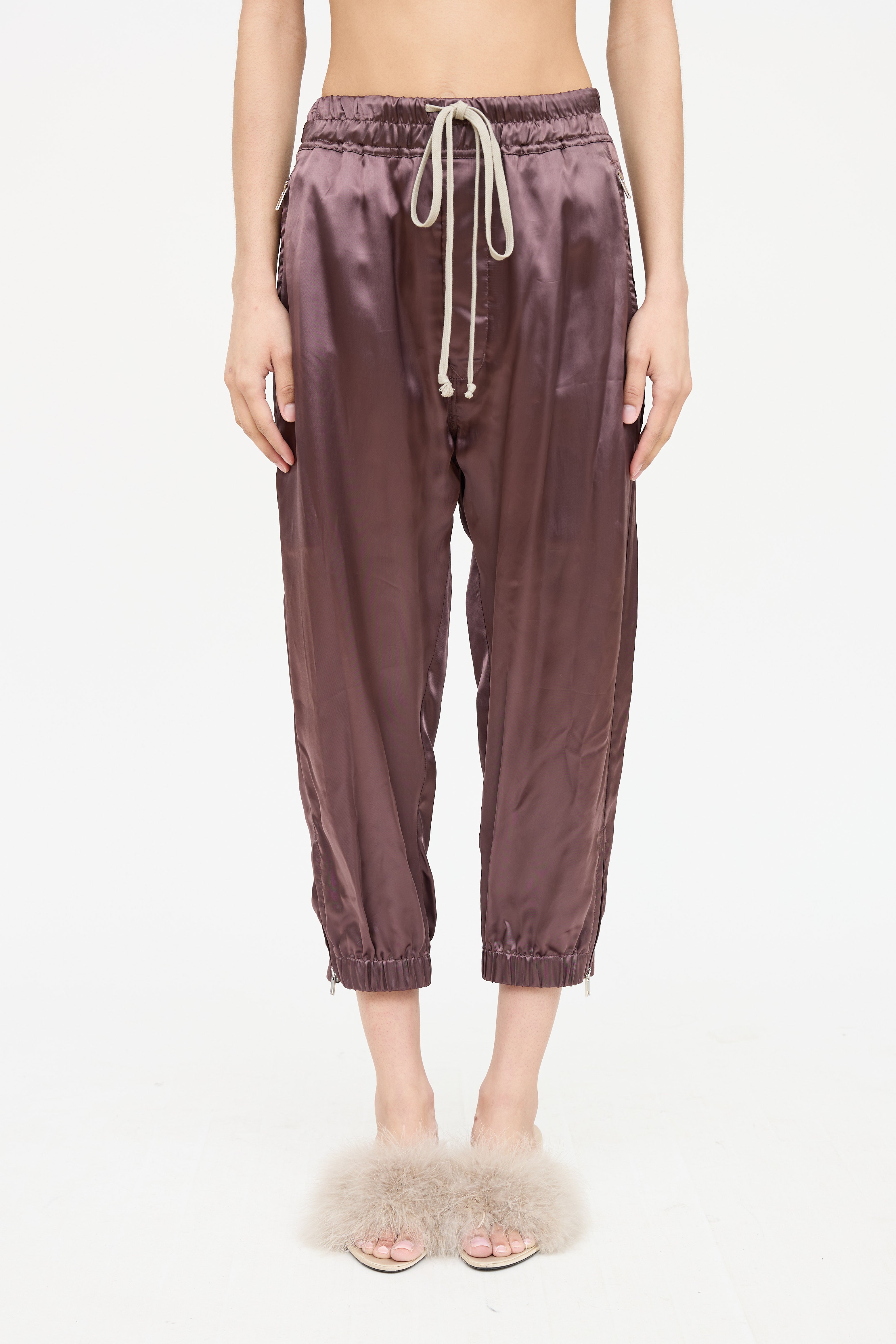 Pre-owned Rick Owens Fall Winter 2023 purple cropped jogger pants featuring drawstring at waist, button fly closure, two zip pockets at front, zip at cuffs and two buttoned slip pockets at back.