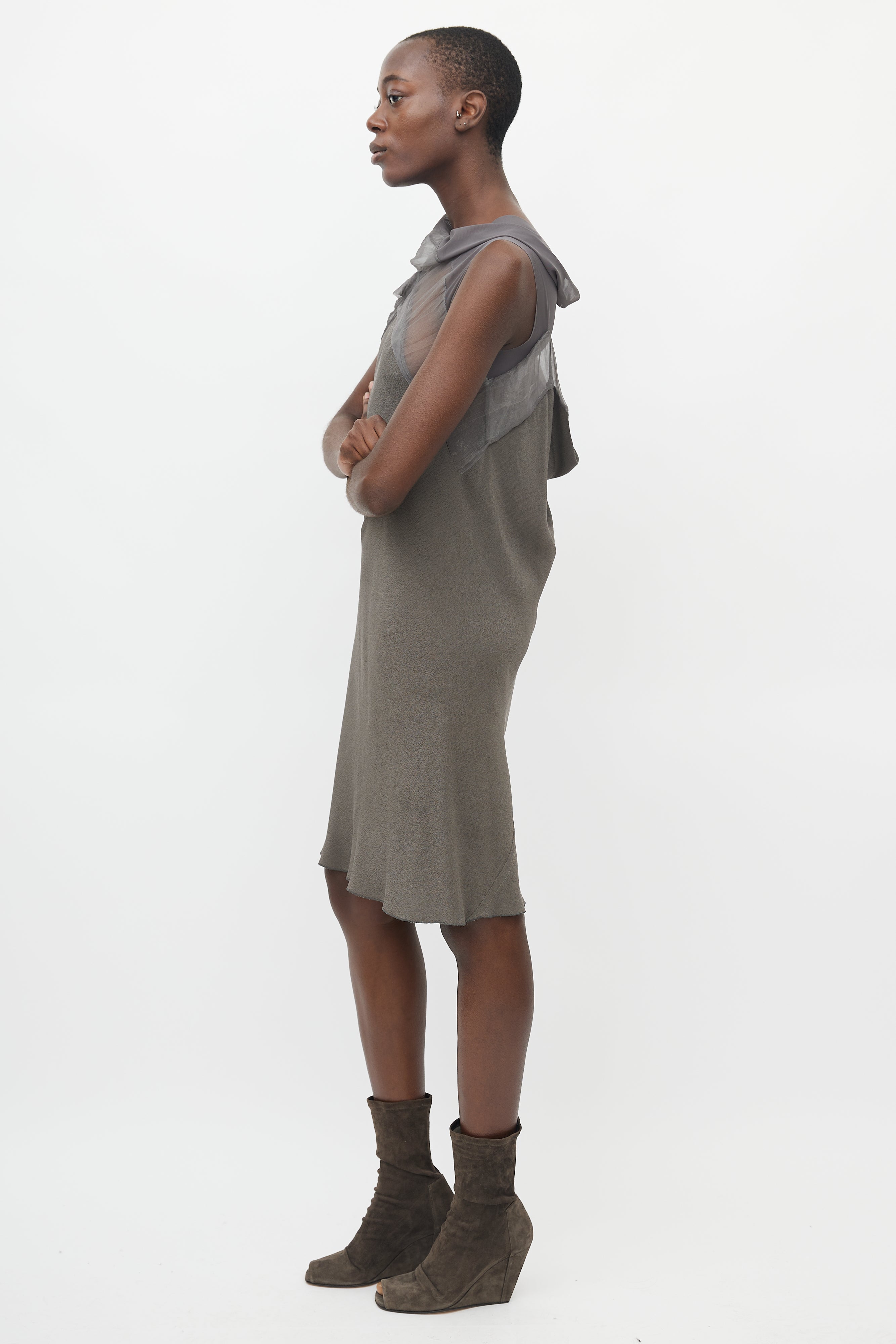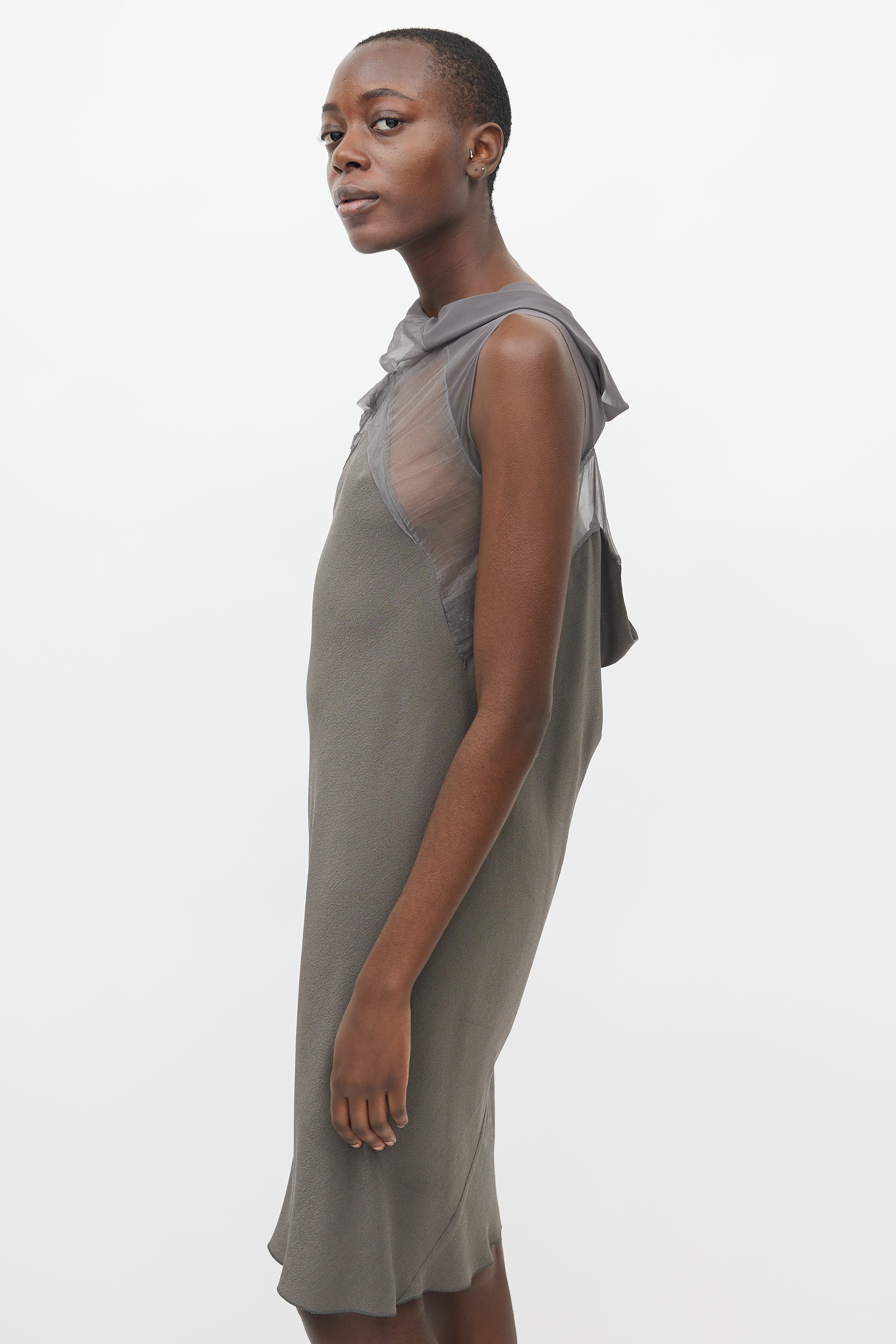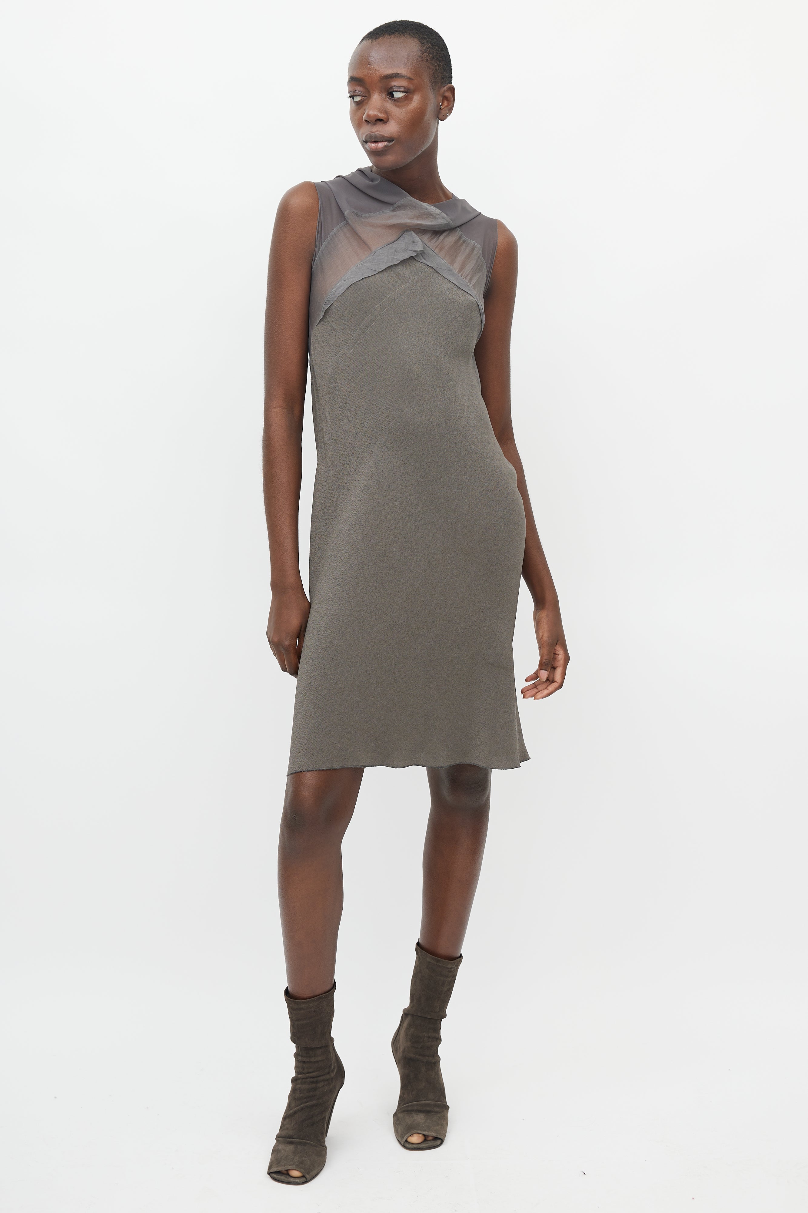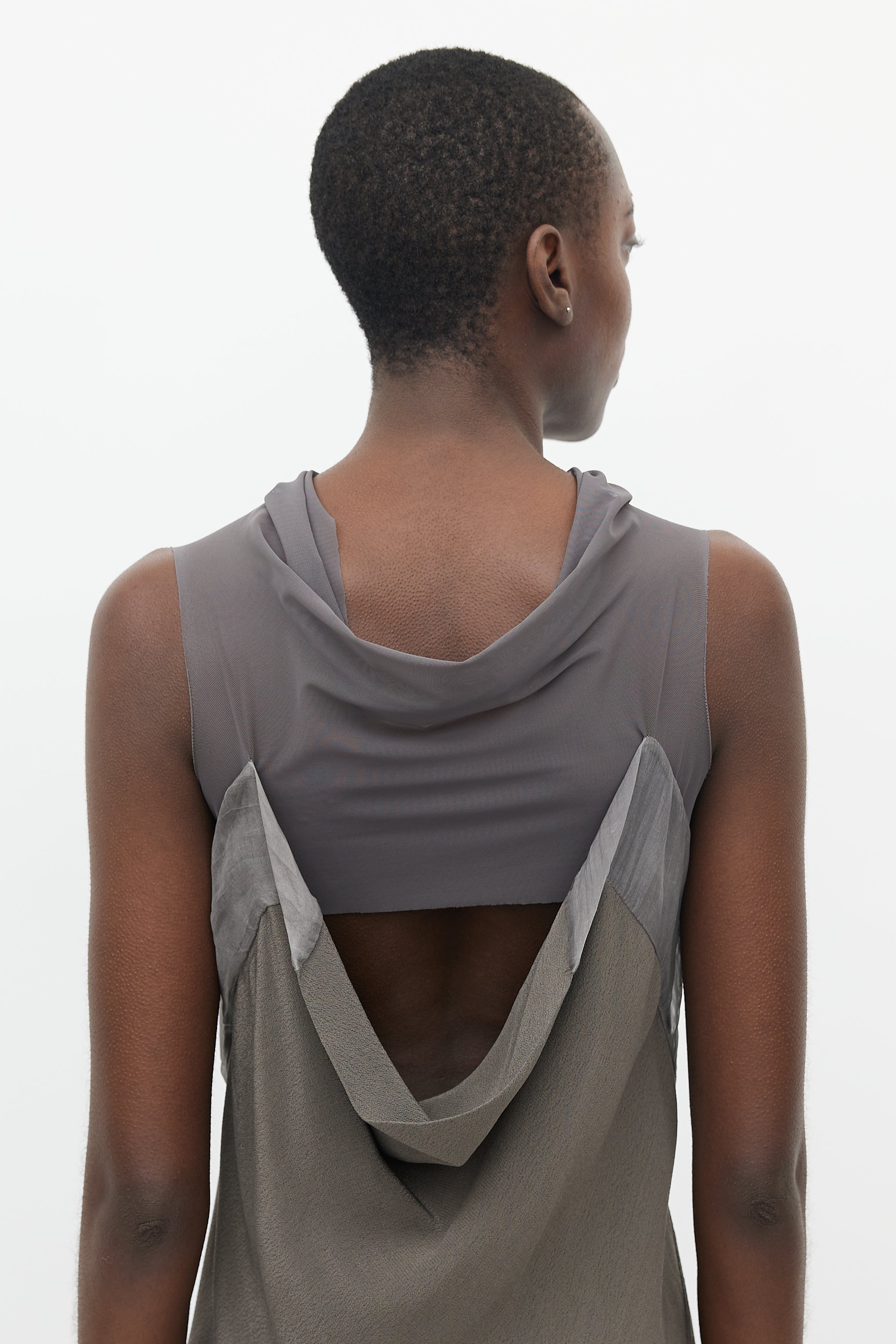 Pre-owned Rick Owens Spring/Summer 2010 bias cut grey sleeveless midi dress featuring sheer mesh cowl neck and open back.