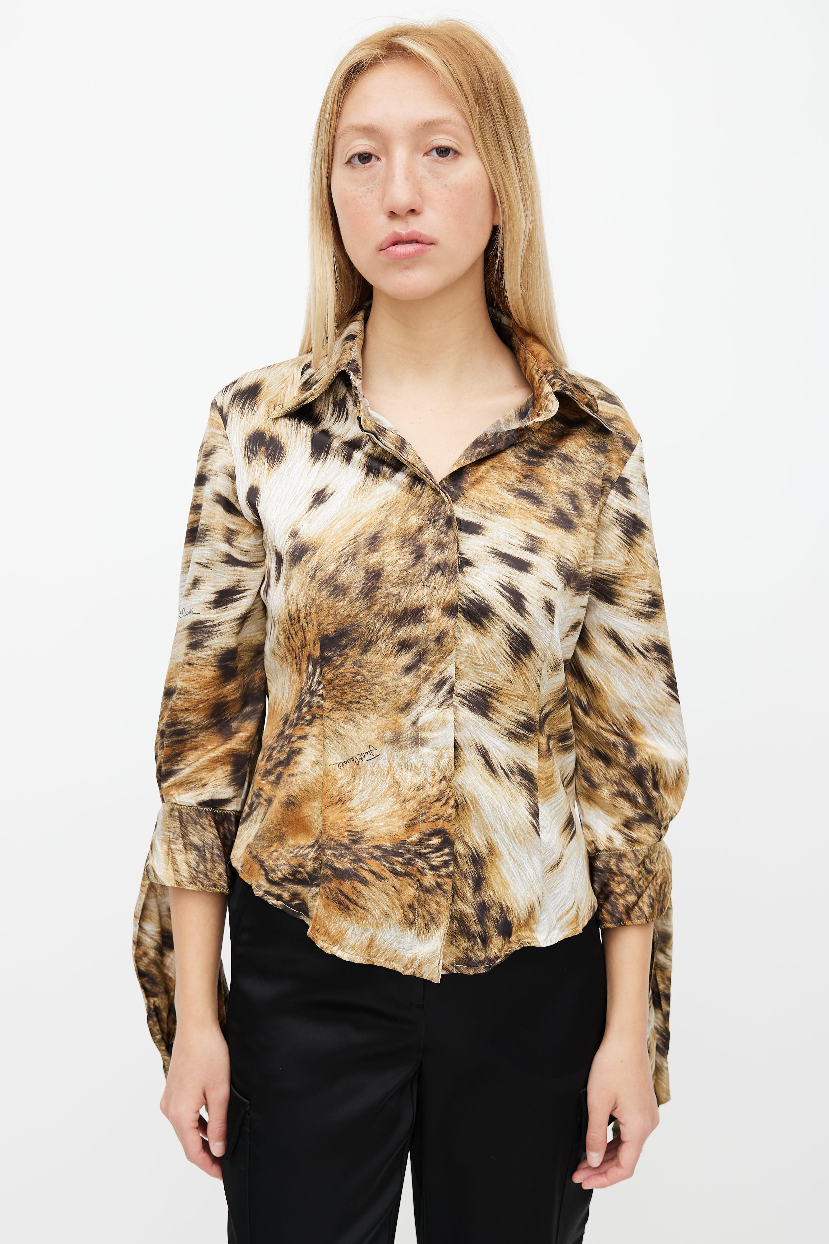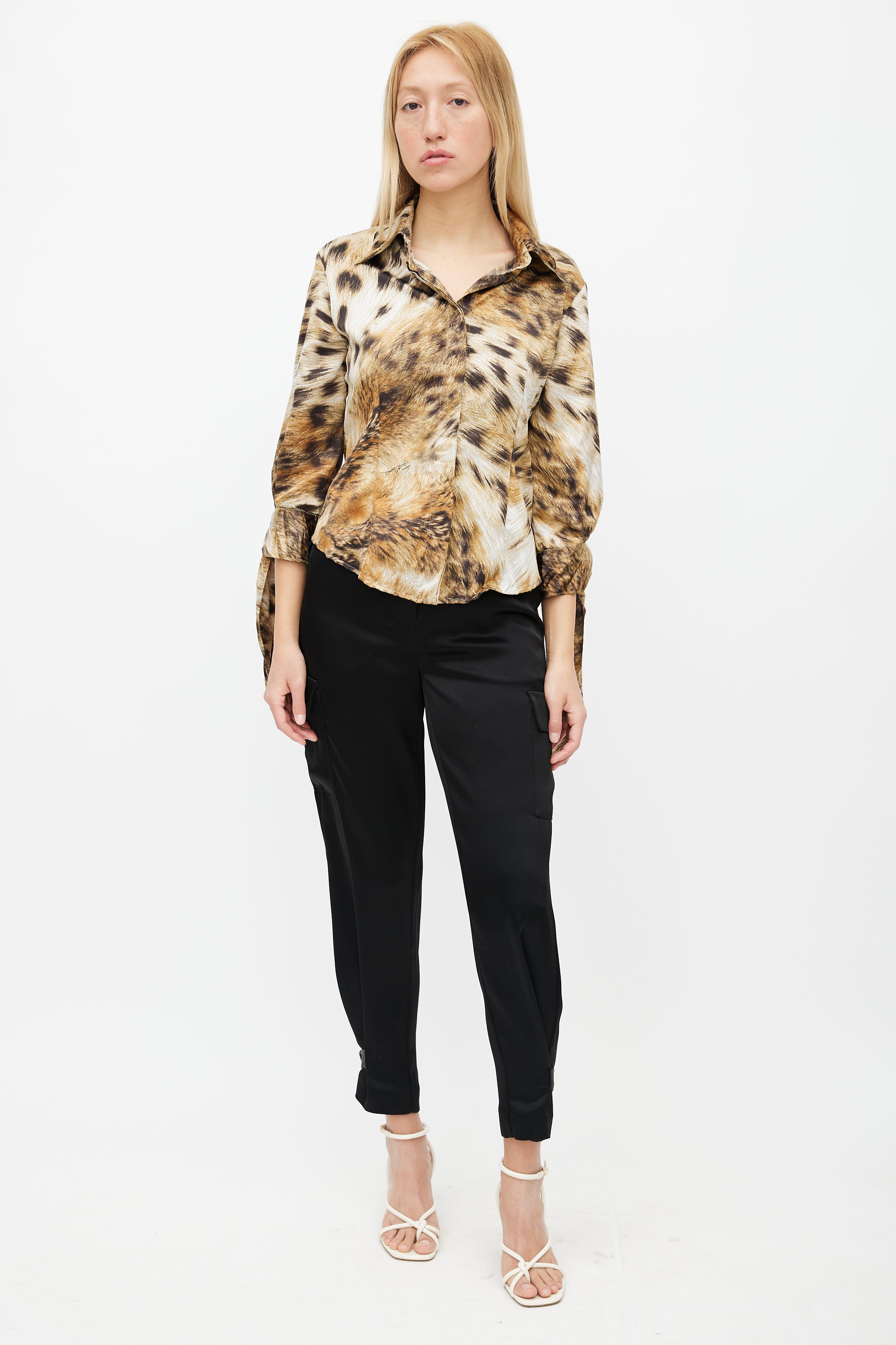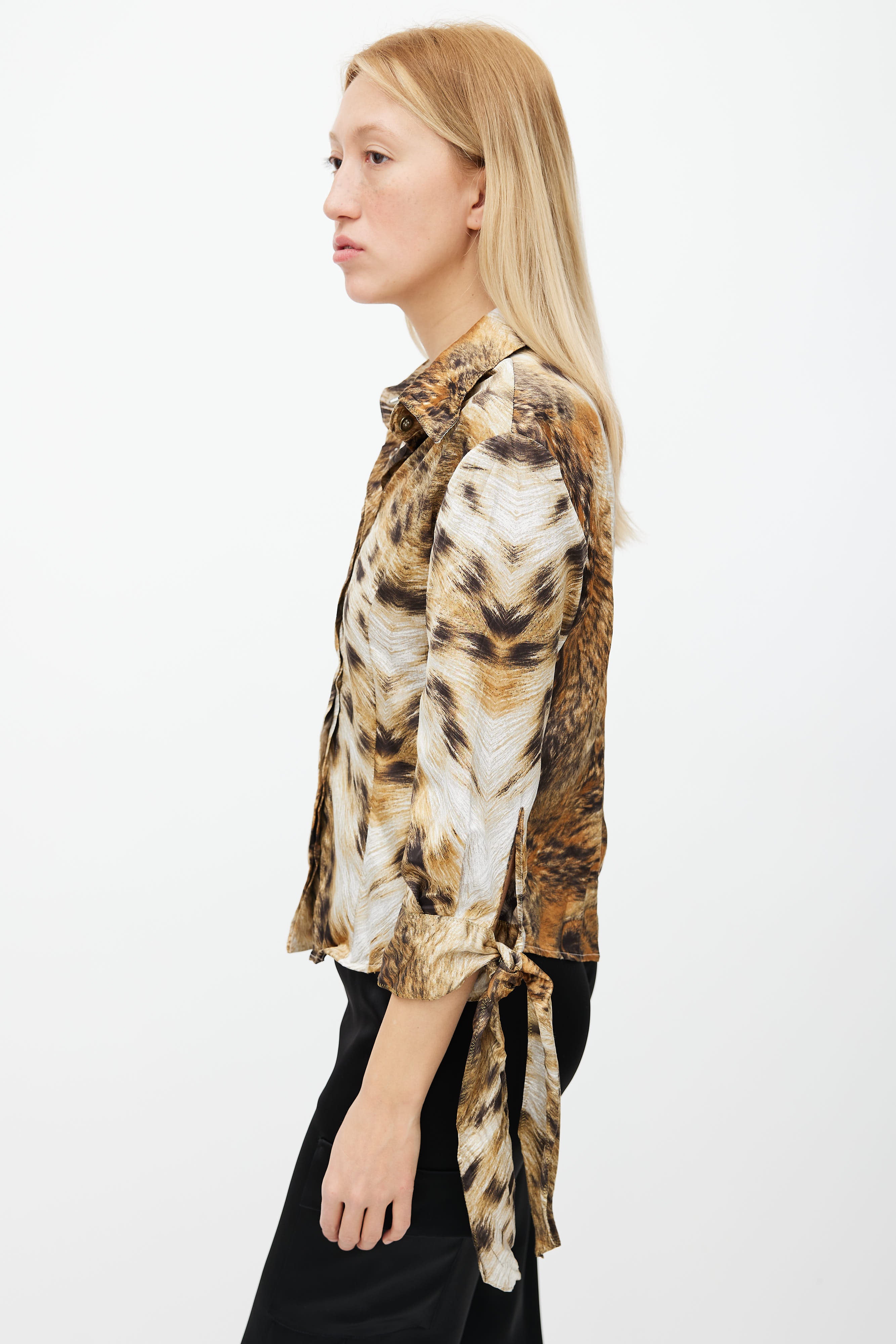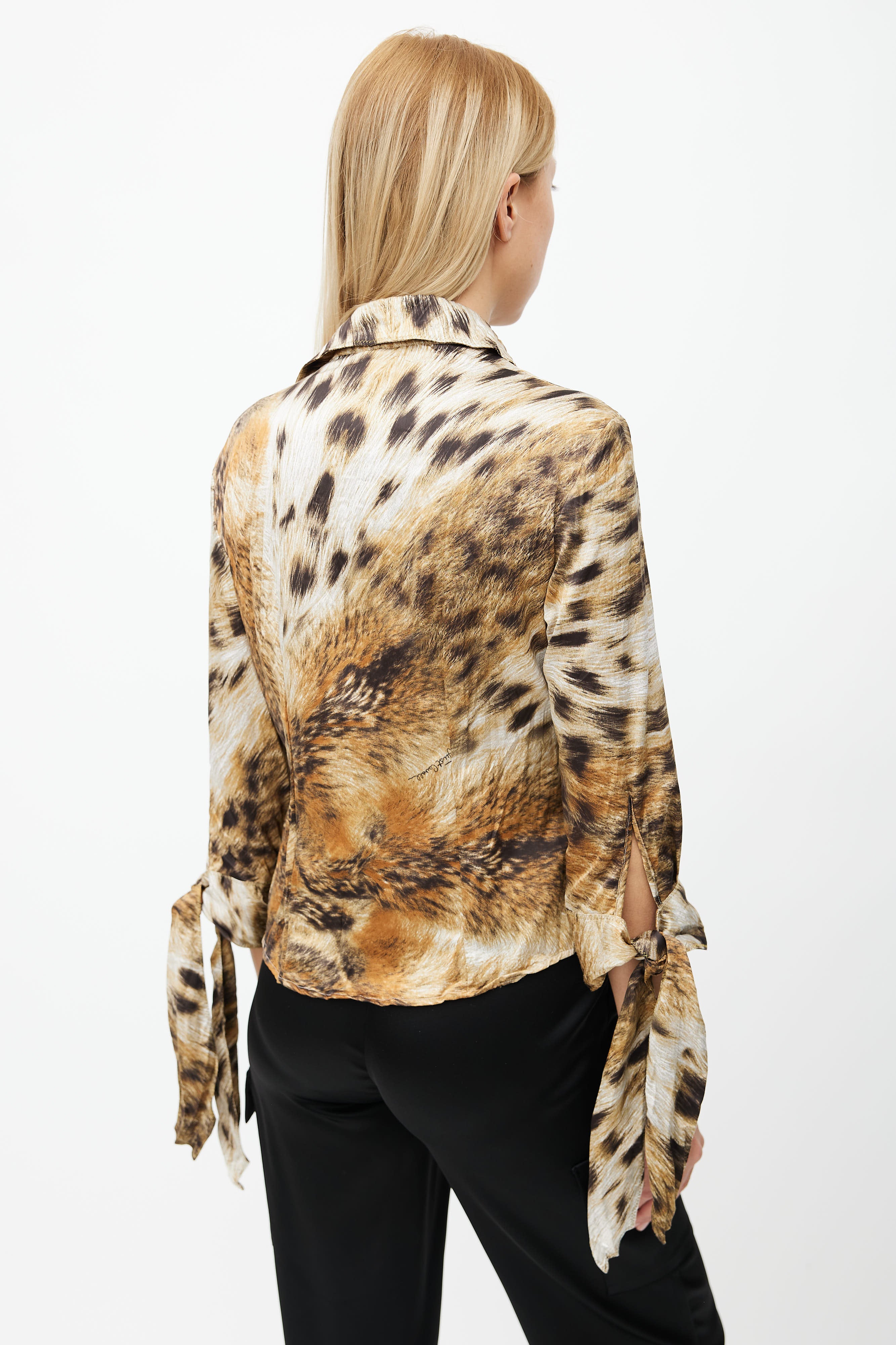 Pre-owned Just Cavalli shirt in brown and black featuring allover animal print, a classic collar, buttons closure at front, and long sleeves with tie at cuffs.