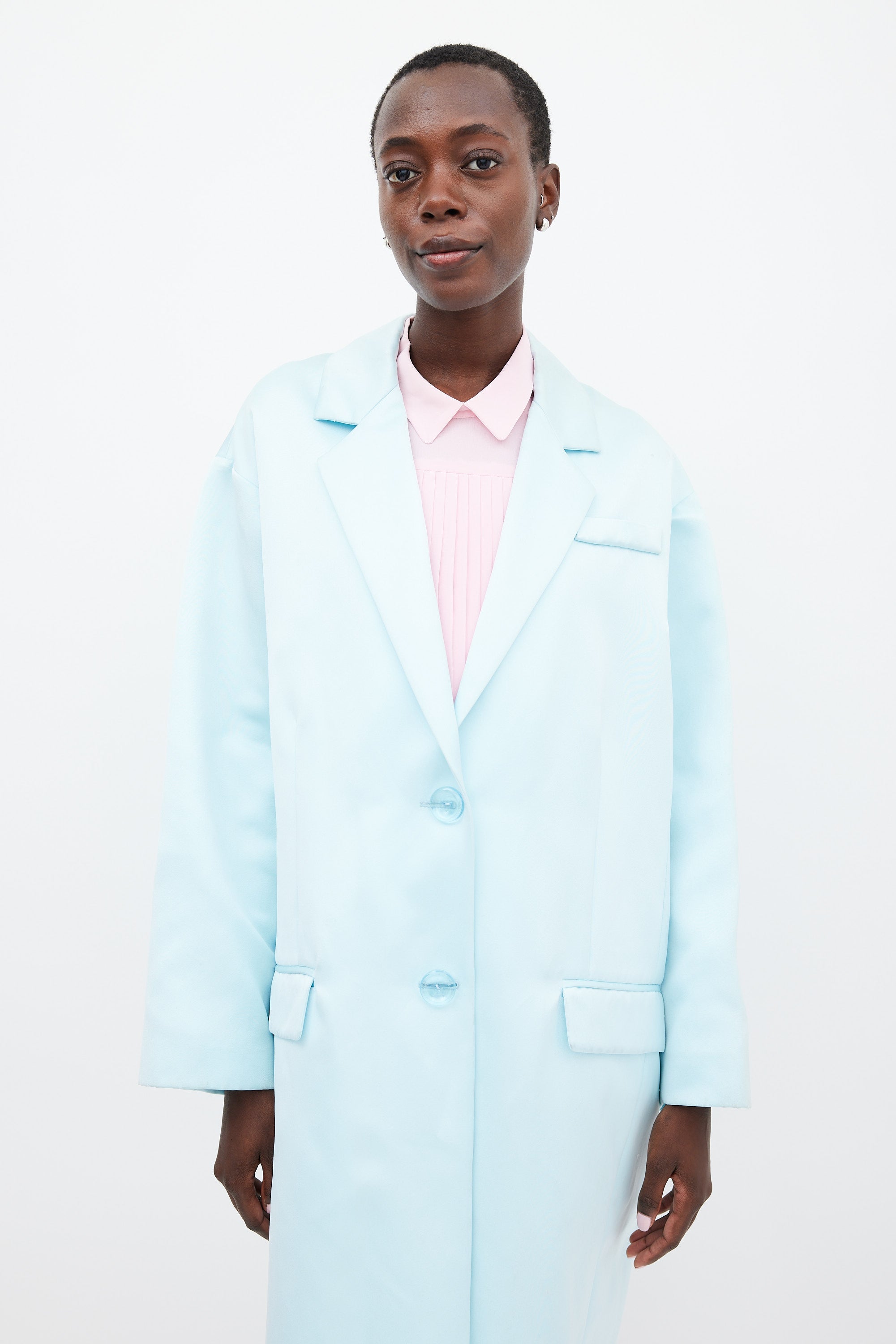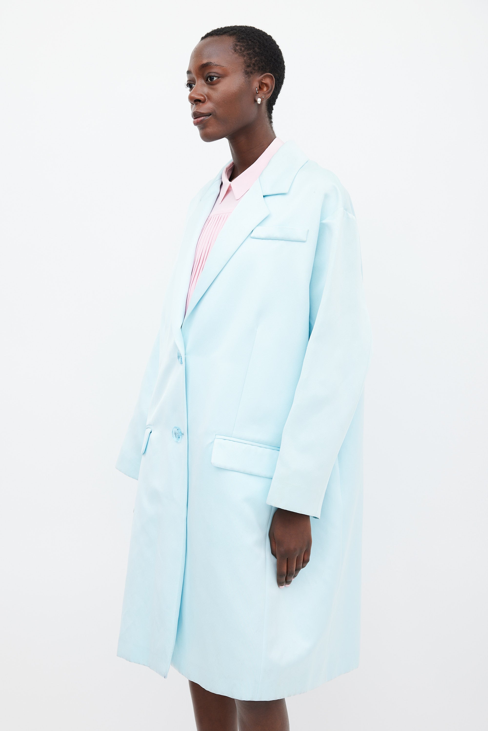 Pre-owned Rochas light blue satin coat featuring a notched collar, single breast two button front, slip pocket at left chest, two front flap pockets, back vent, and long sleeves.
