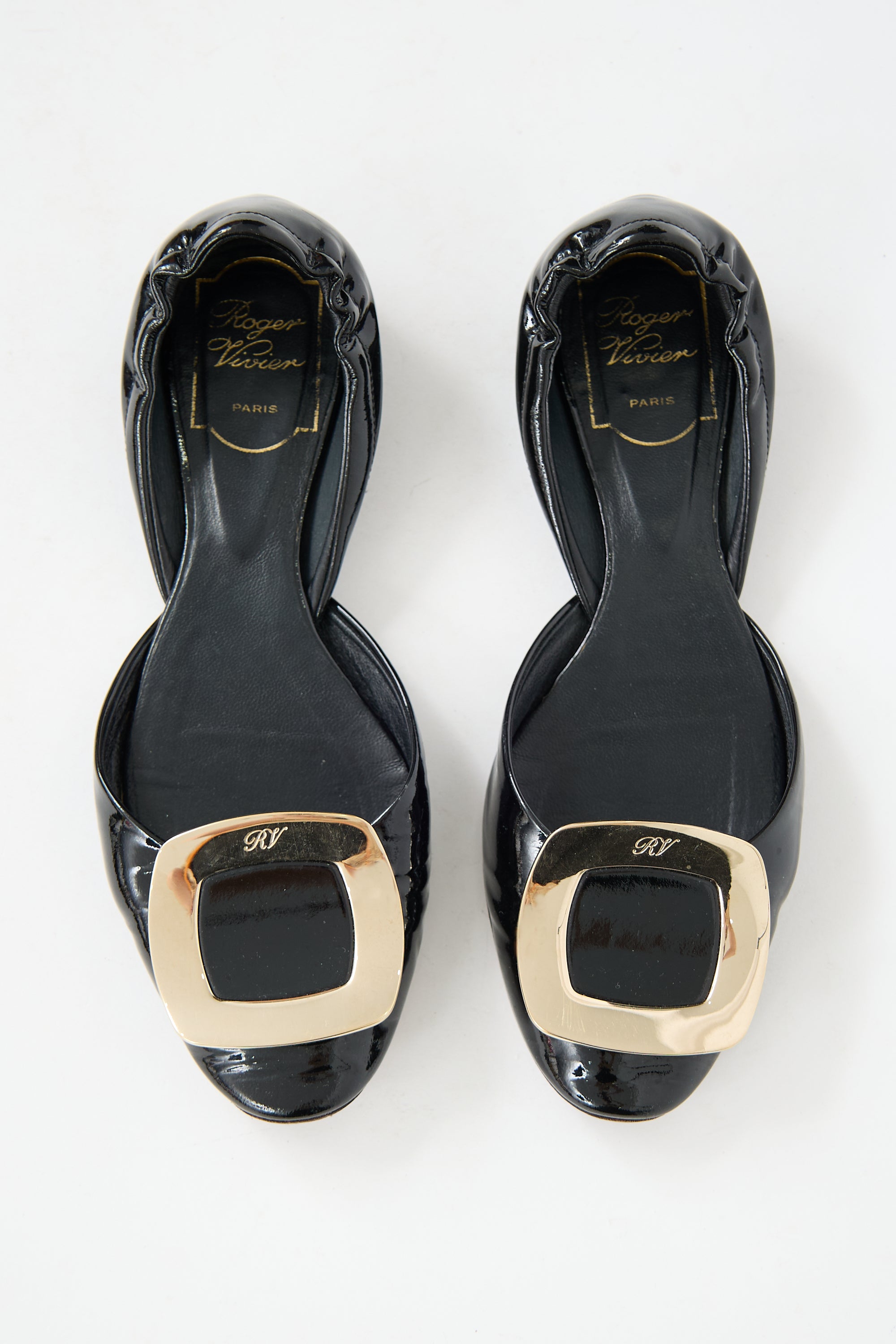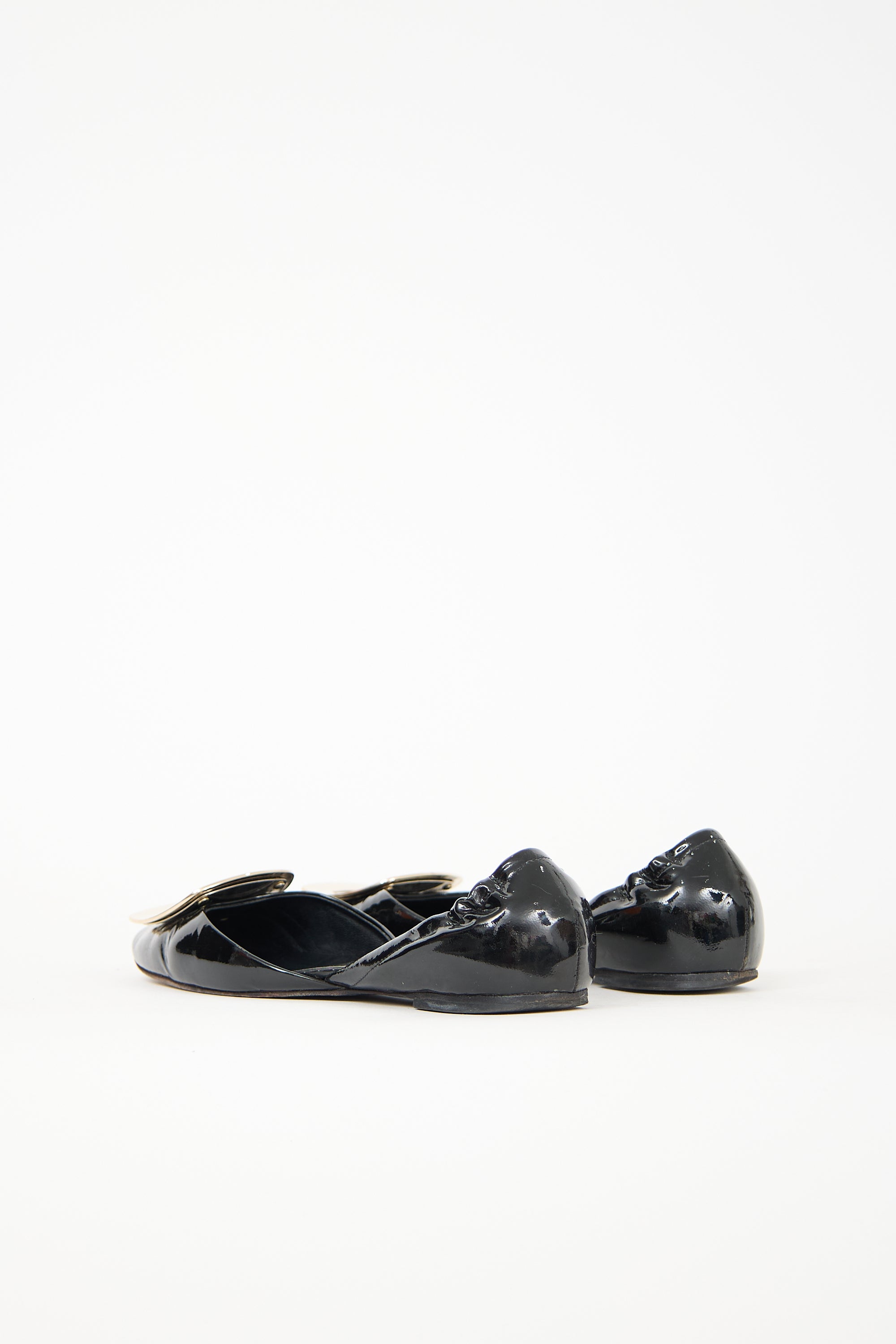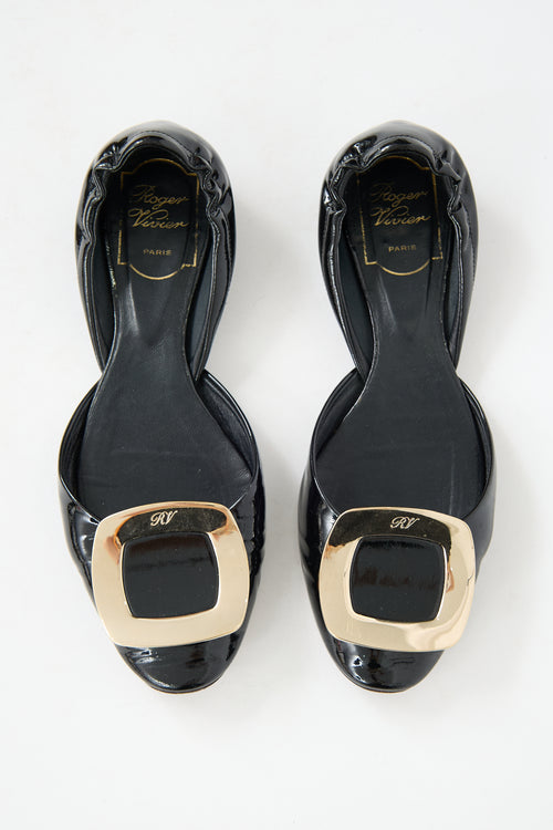 Pre-owned Roger Vivier black patent leather Chips D'Orsay flats featuring almond toe, mirrored gold tone buckle at vamp, elasticized counter, and slip on entry.