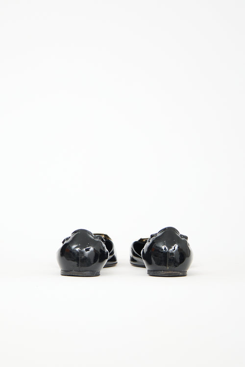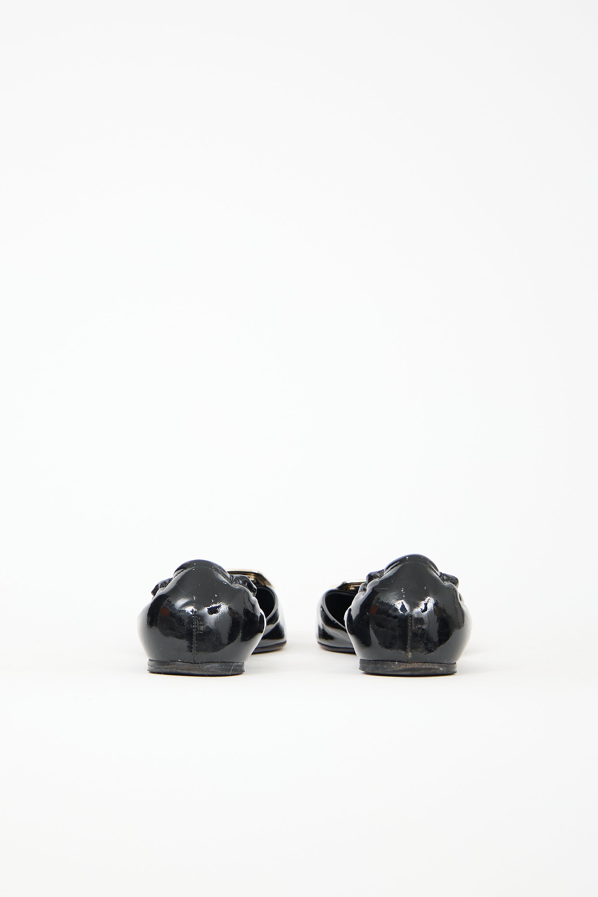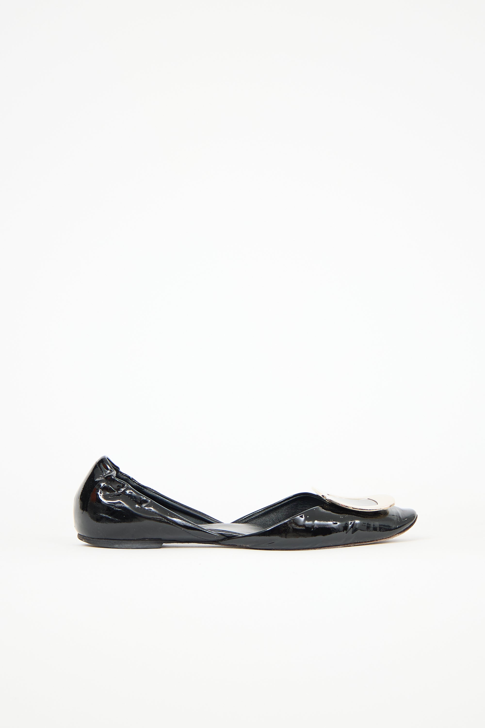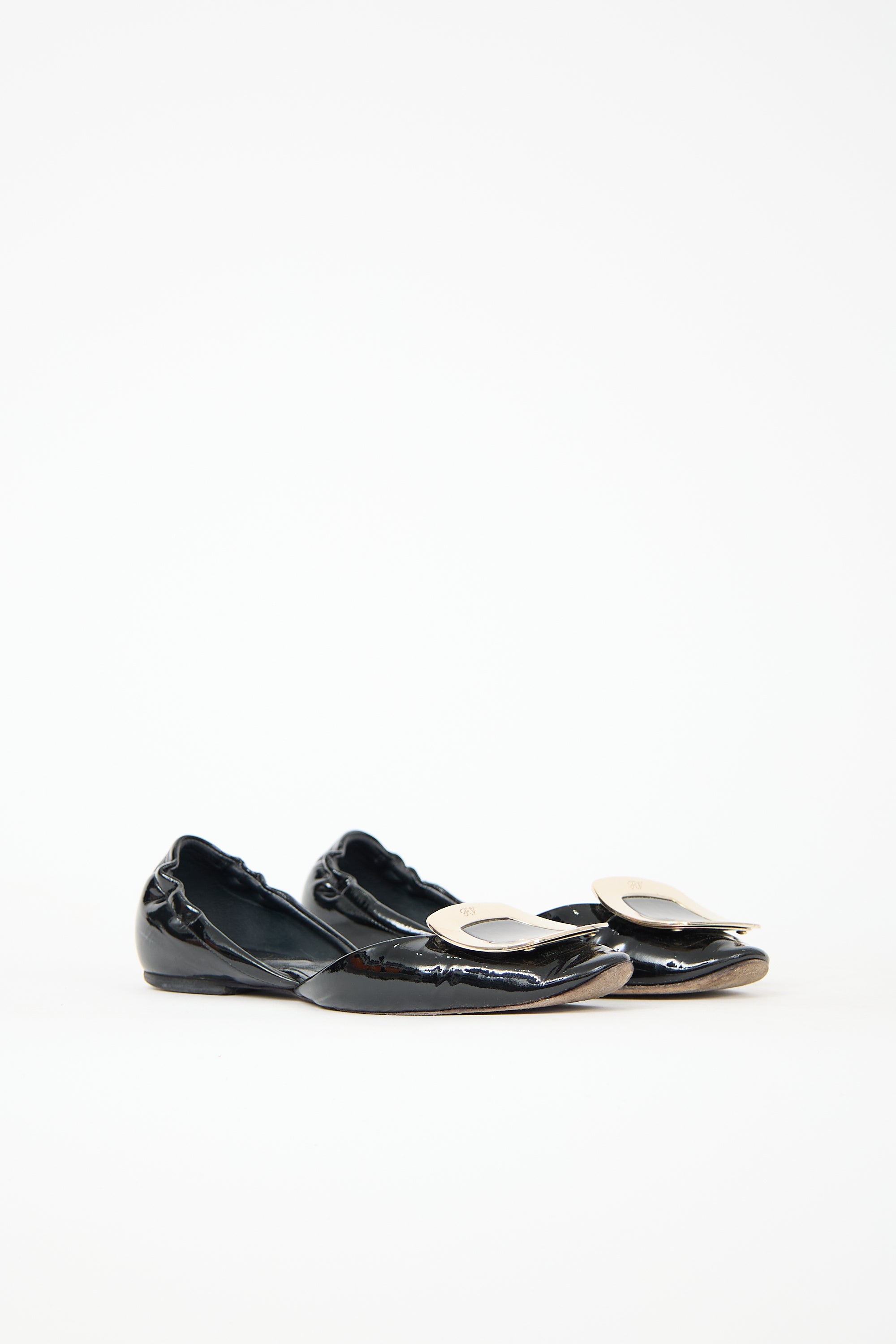 Pre-owned Roger Vivier black patent leather Chips D'Orsay flats featuring almond toe, mirrored gold tone buckle at vamp, elasticized counter, and slip on entry.