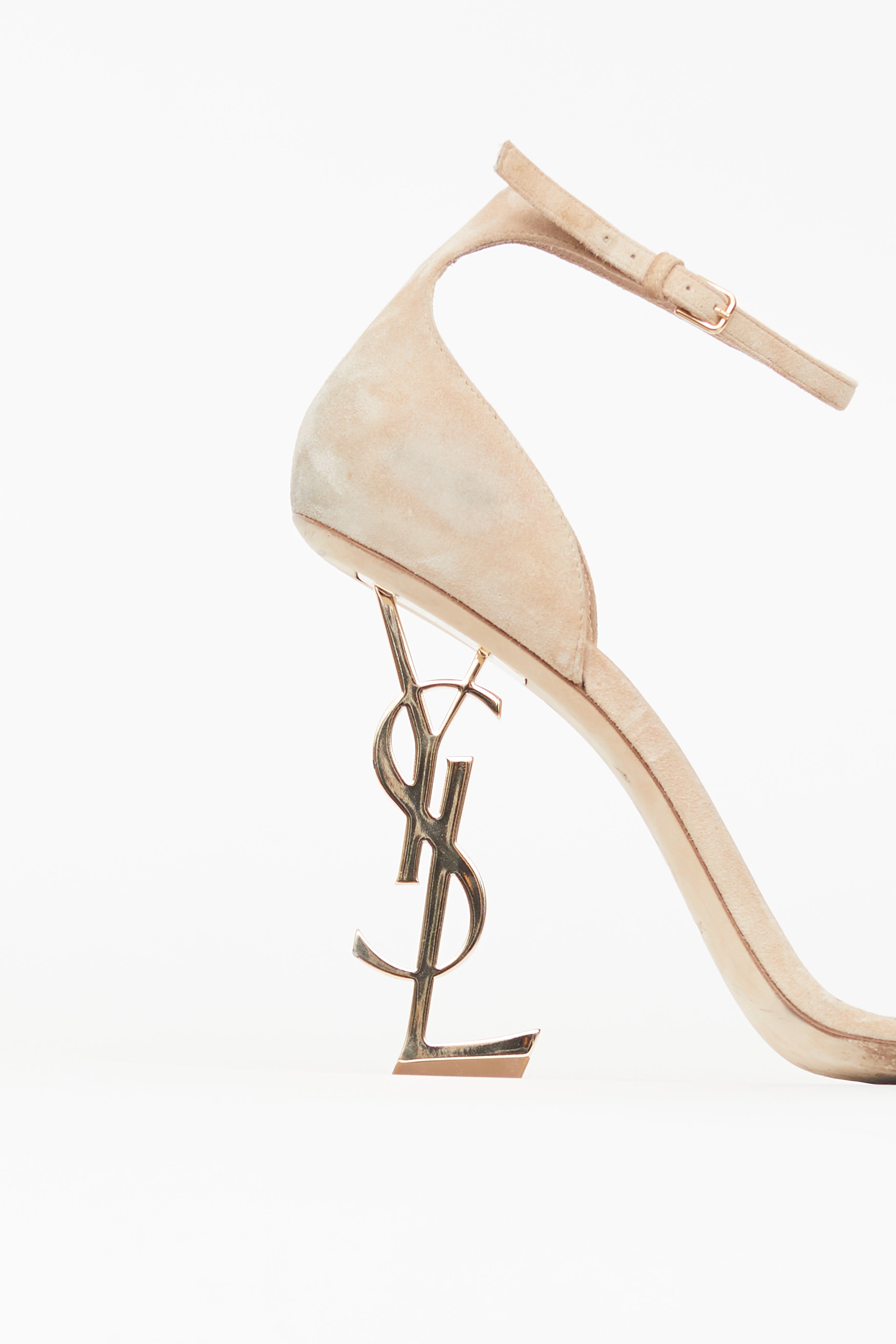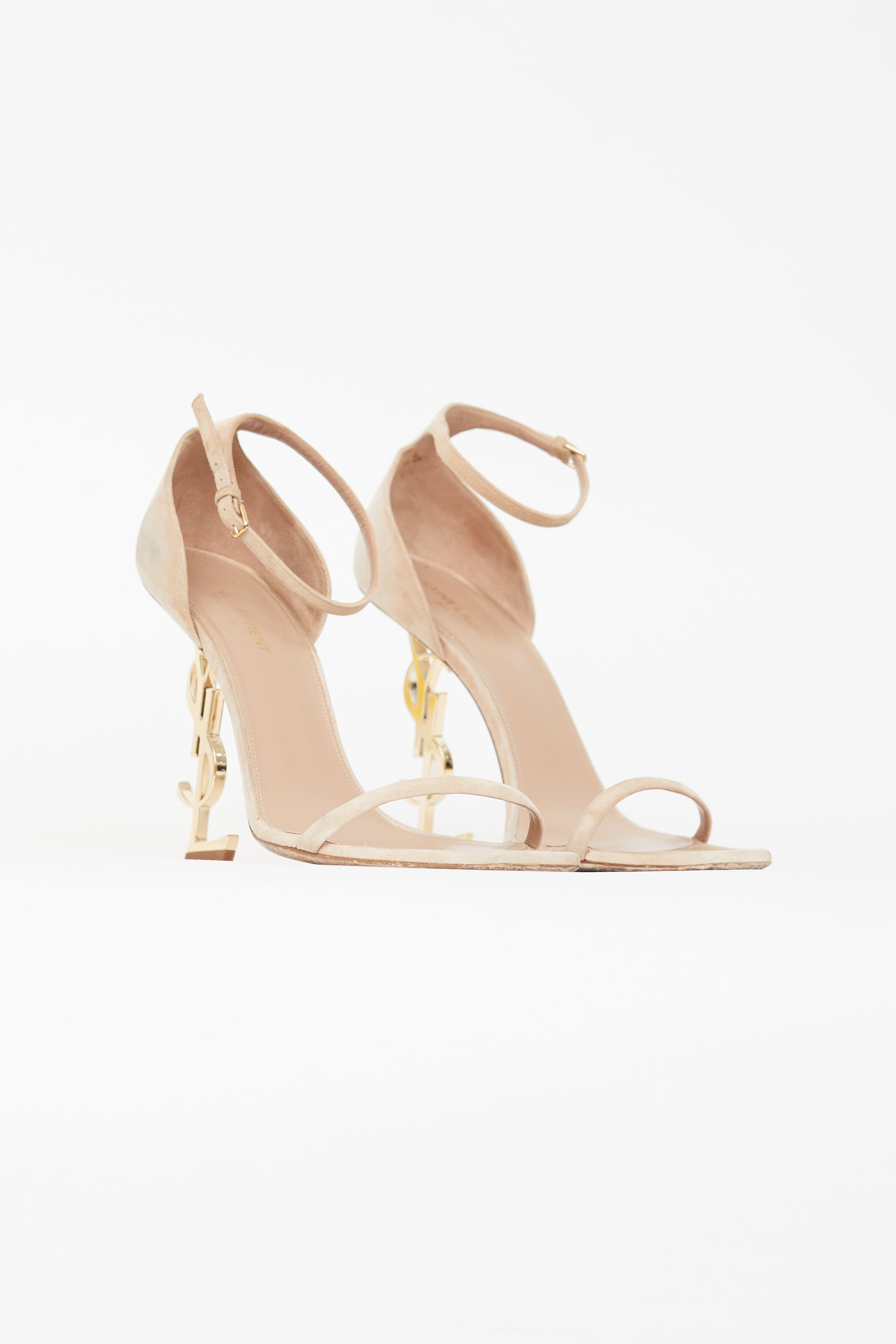 Pre-owned Saint Laurent beige Opyum 110 suede sandals featuring an open square toe, strap at vamp, gold tone Cassandre hardware heel, and adjustable strap at ankle.