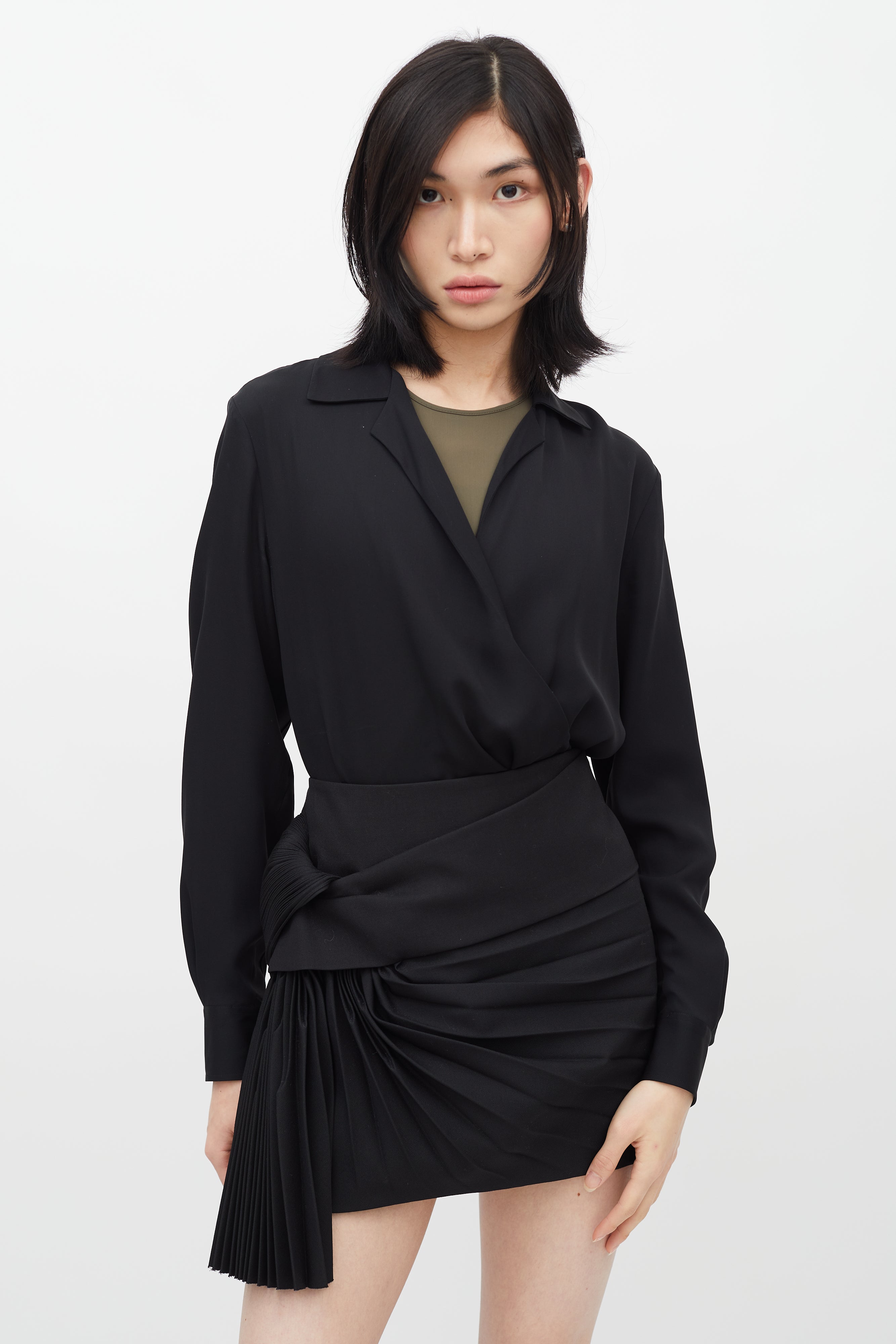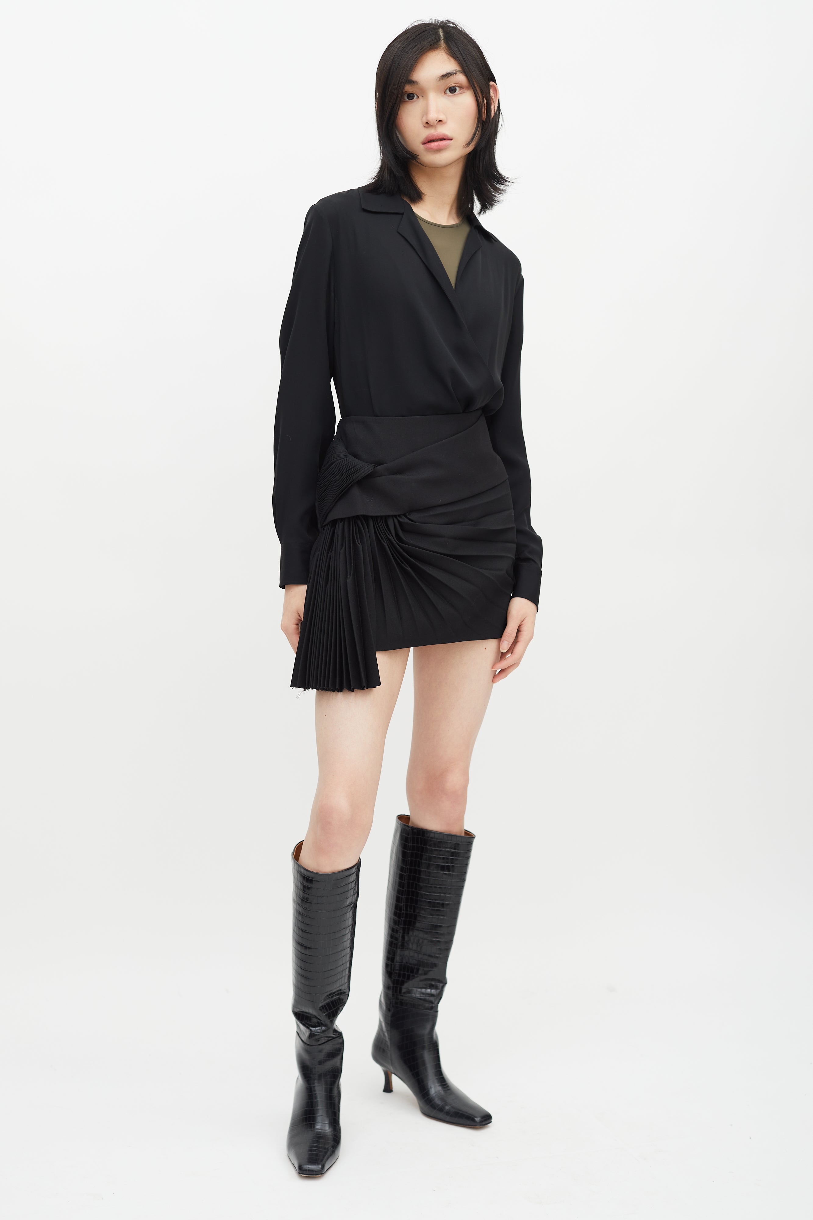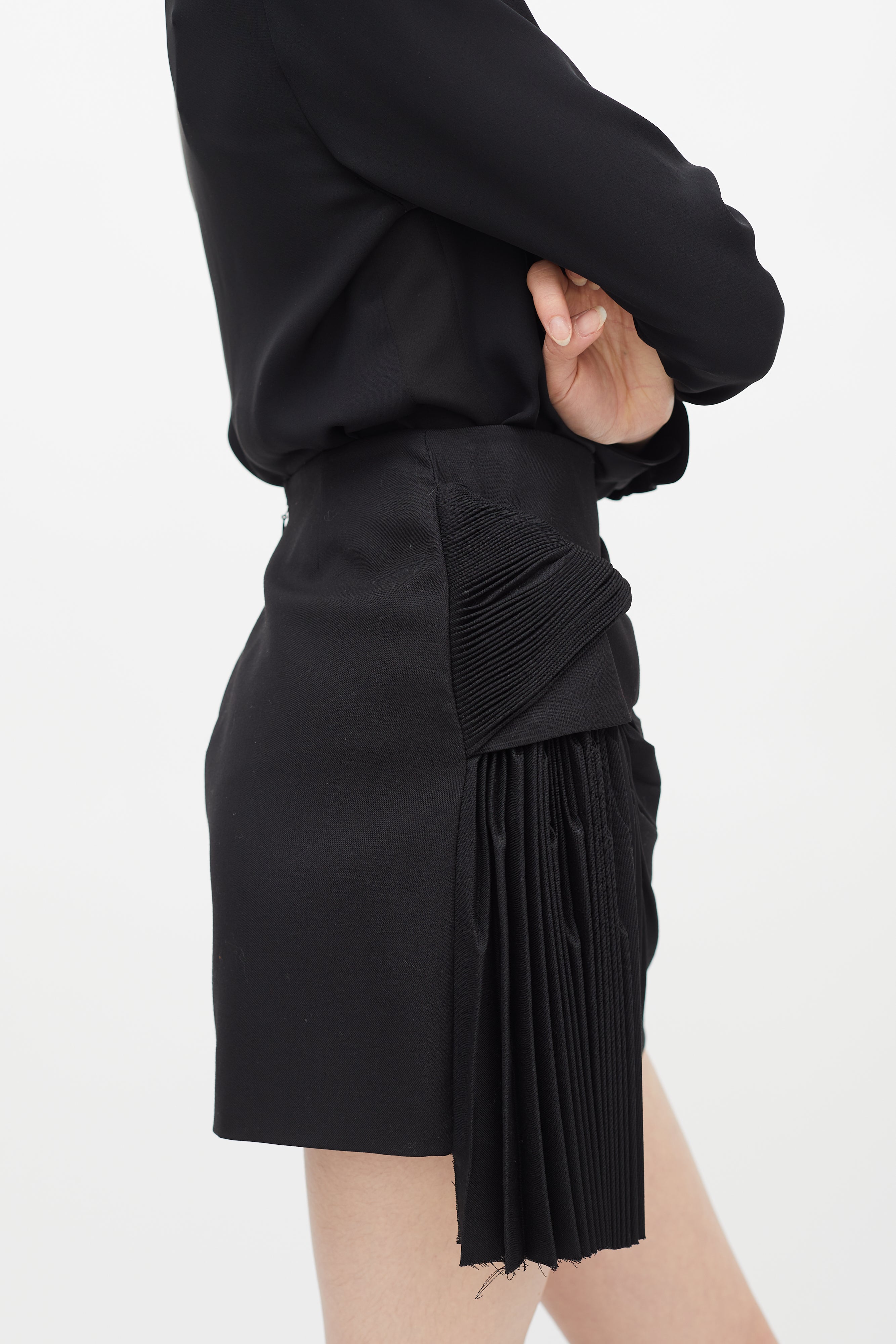 Saint Laurent black mini skirt featuring asymmetrical pleating detail with raw hem, concealed zip closure at back, and fixed waistband. Lined. Clipped to fit model.