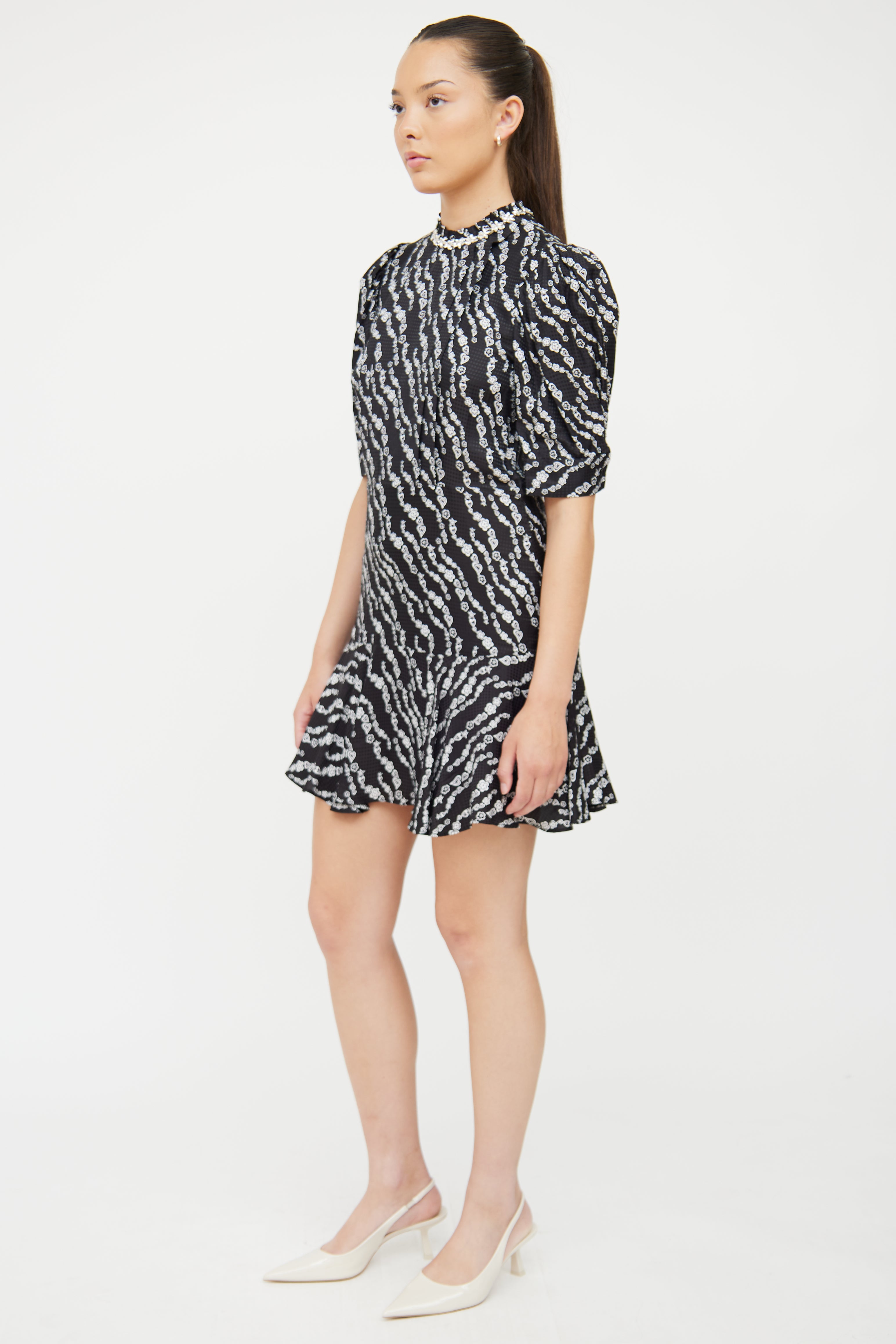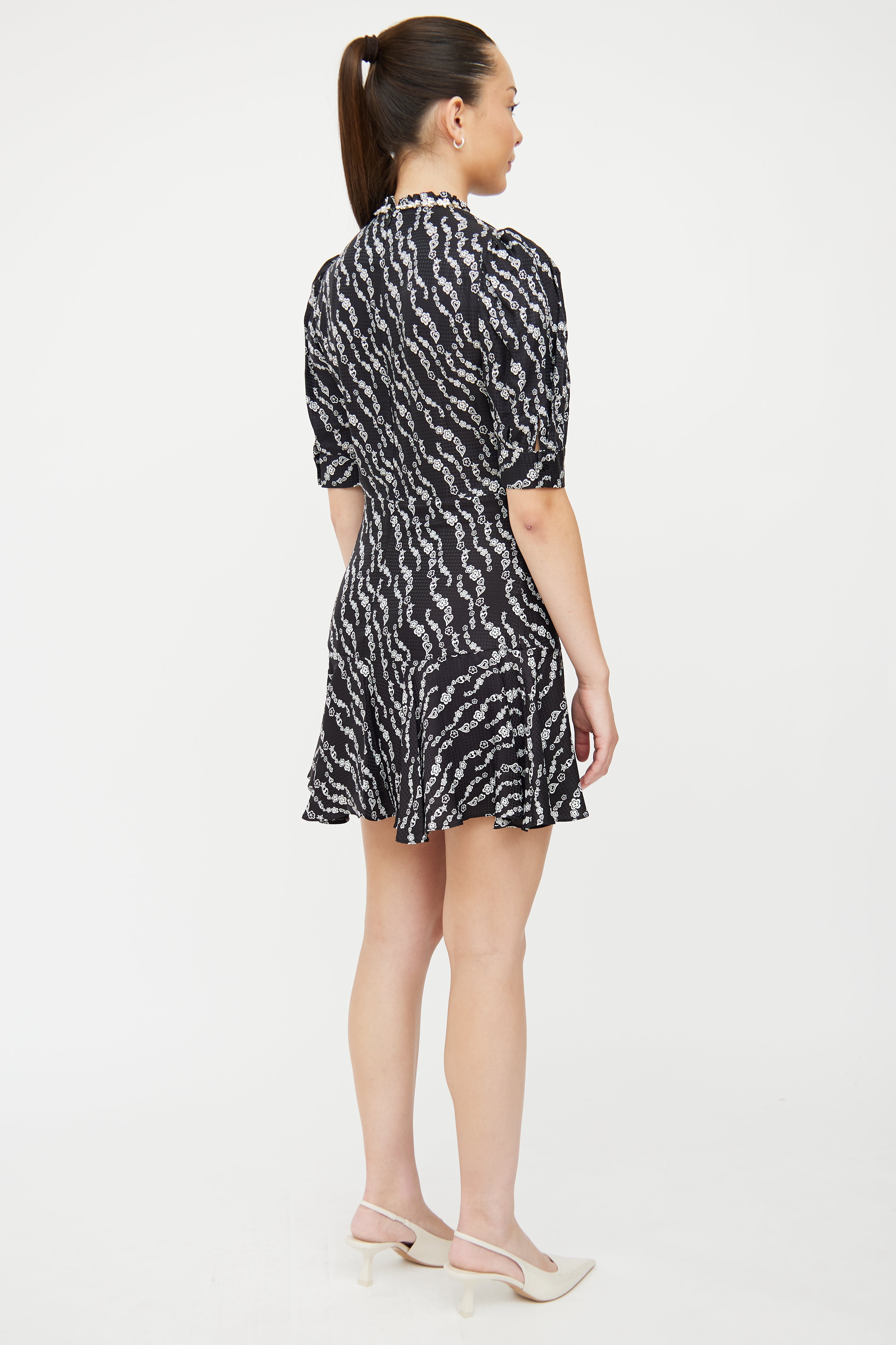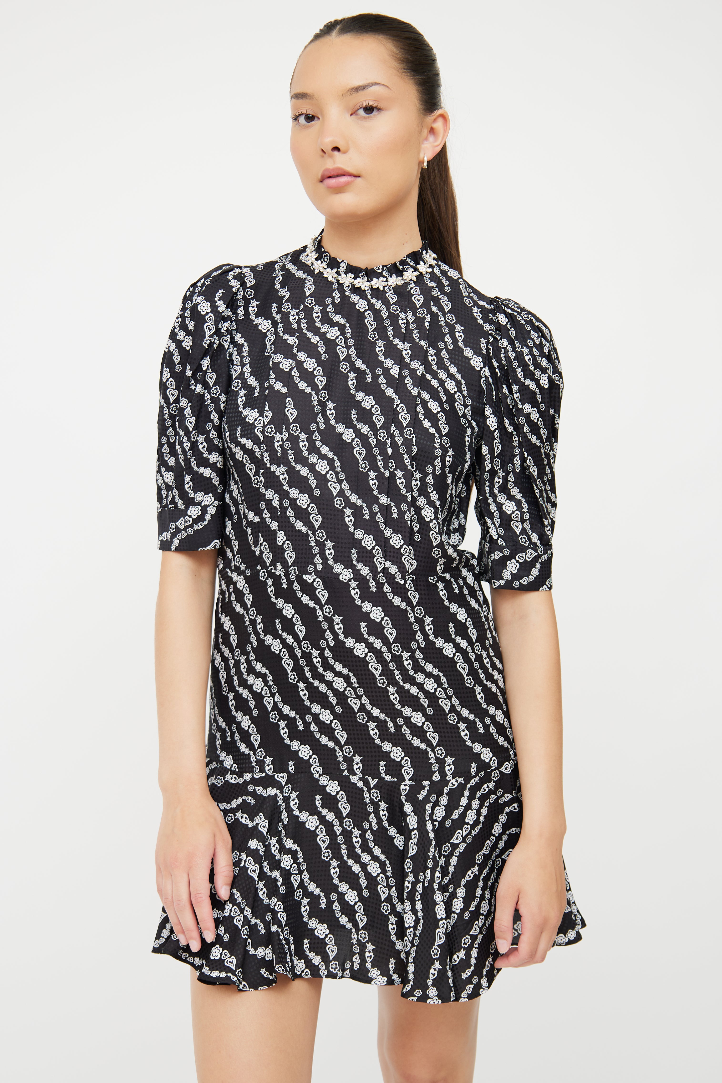 Pre-owned Sandro black silk blend dress featuring high ruffled neckline with crystal flower embellishments, slight padding at shoulders, half puff sleeves with button cuffs, concealed back zip closure, pleat detail at chest, ruffle detail at hem and white heart and flower pattern throughout. Partially lined.