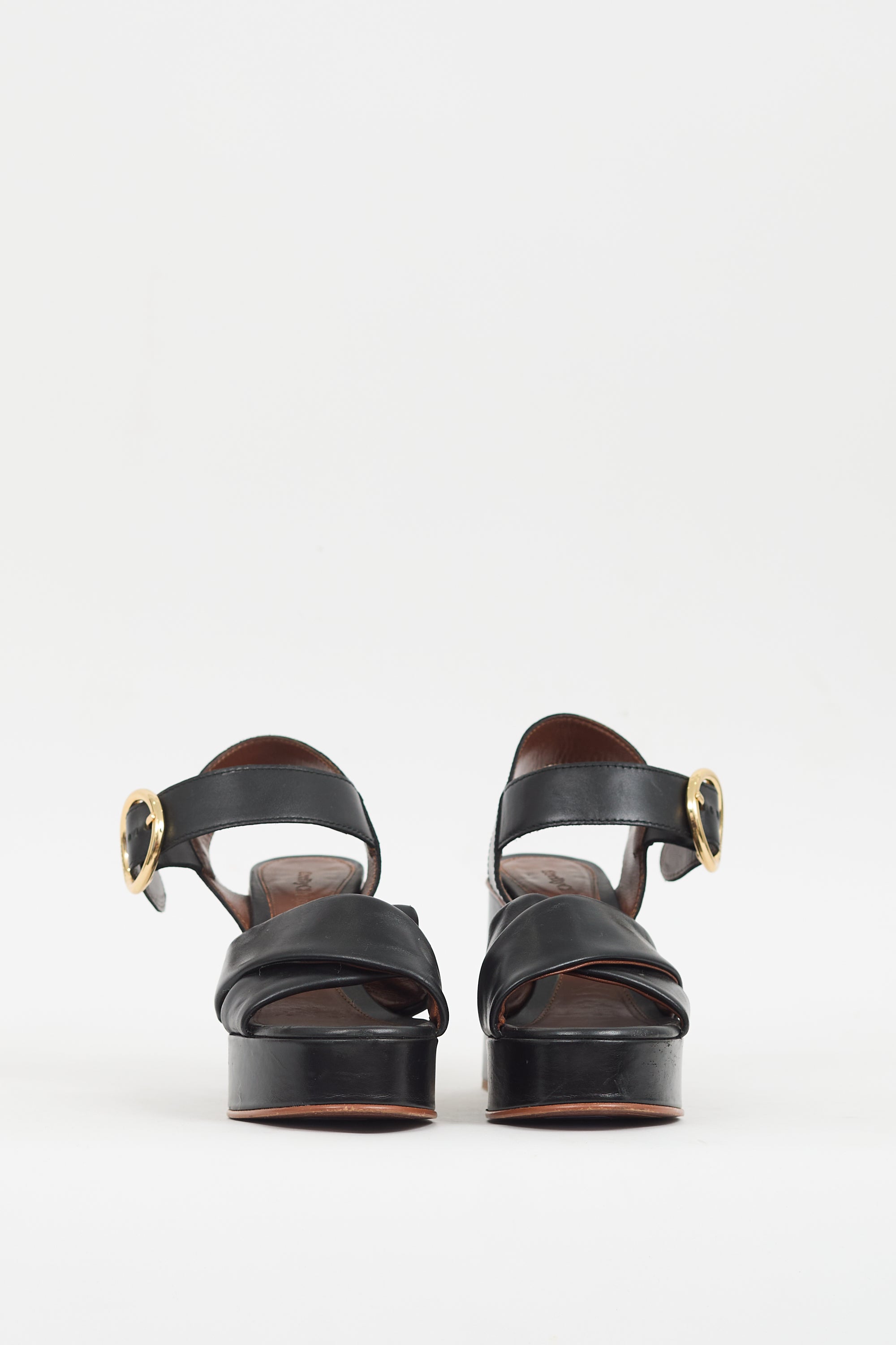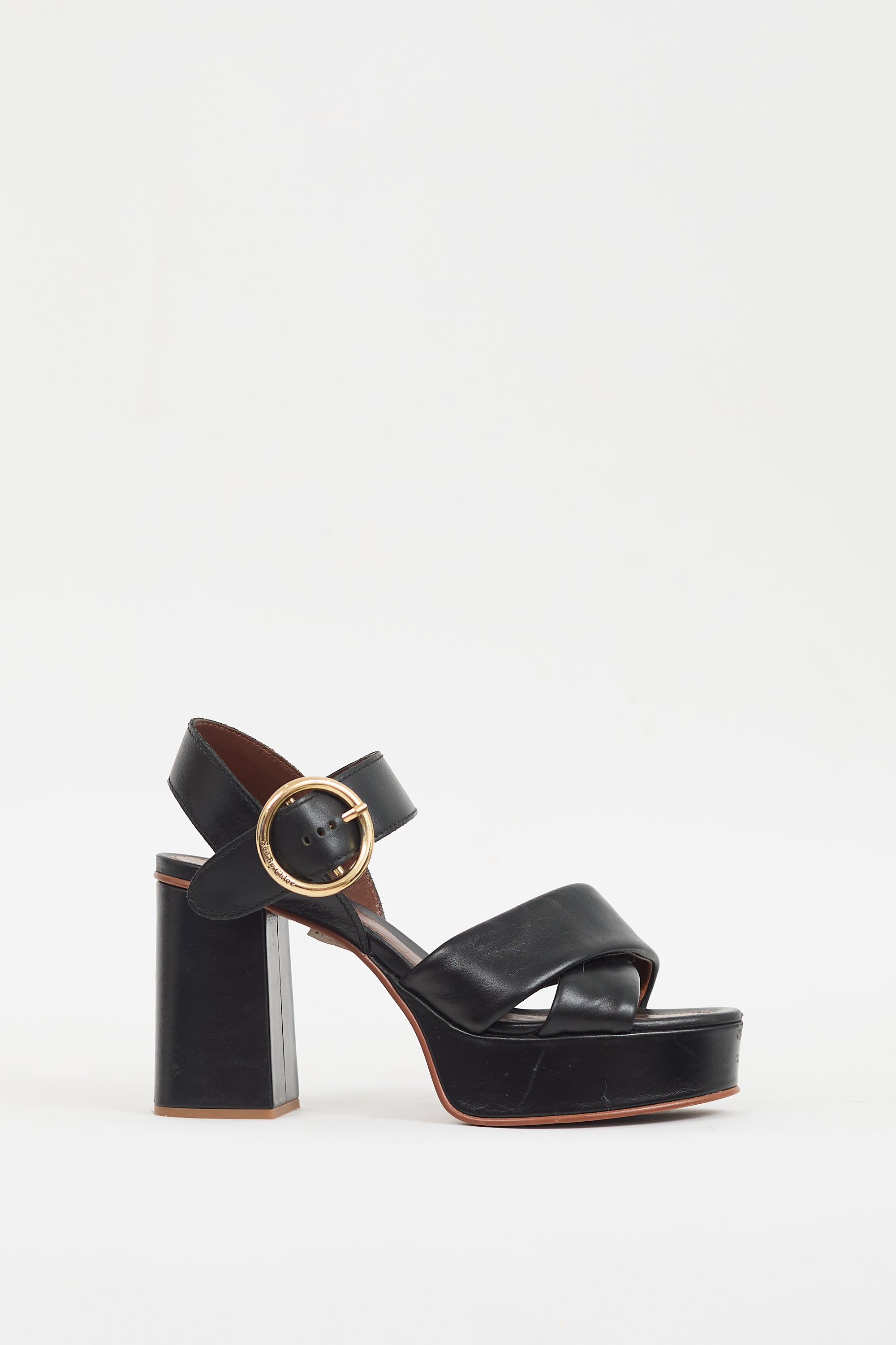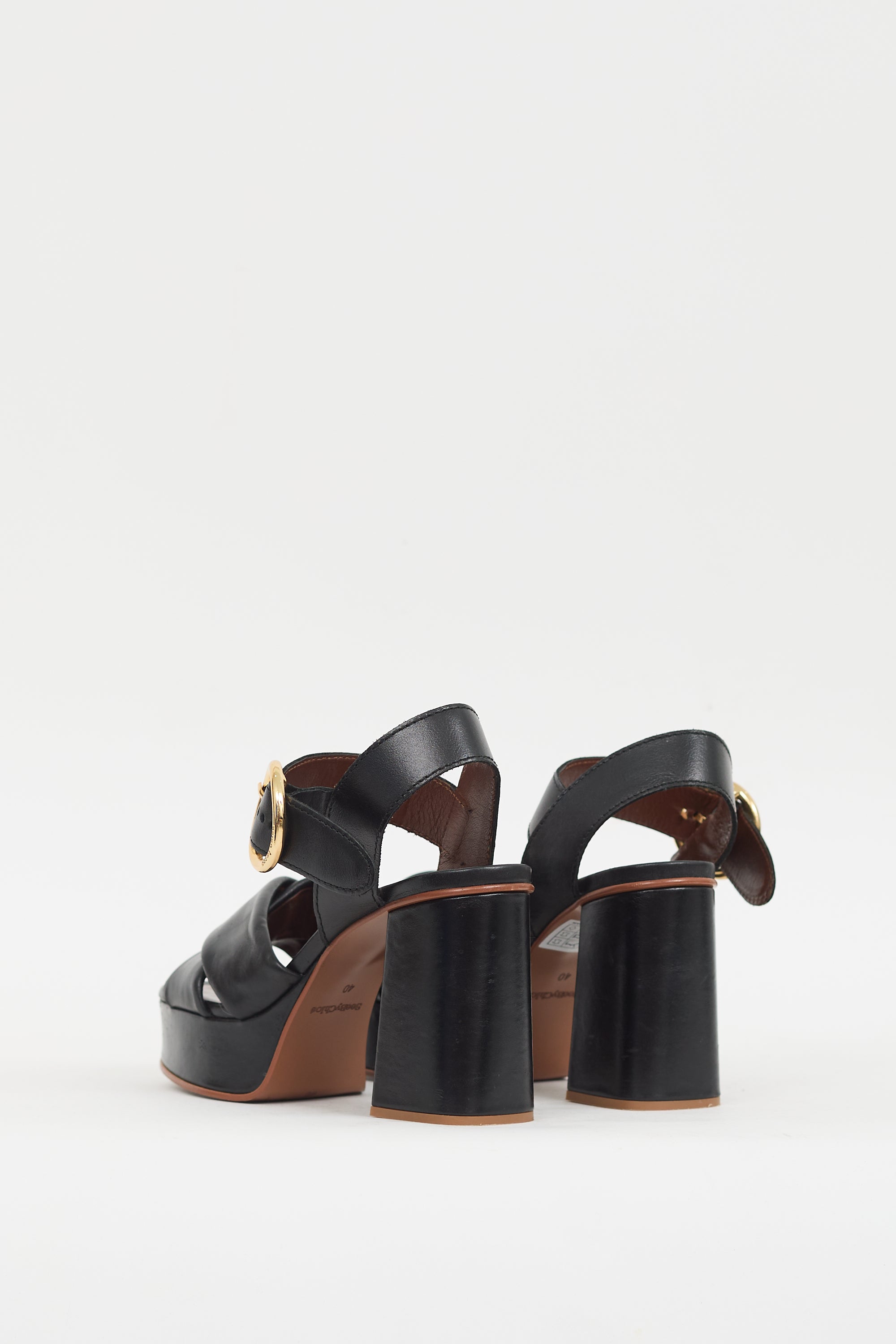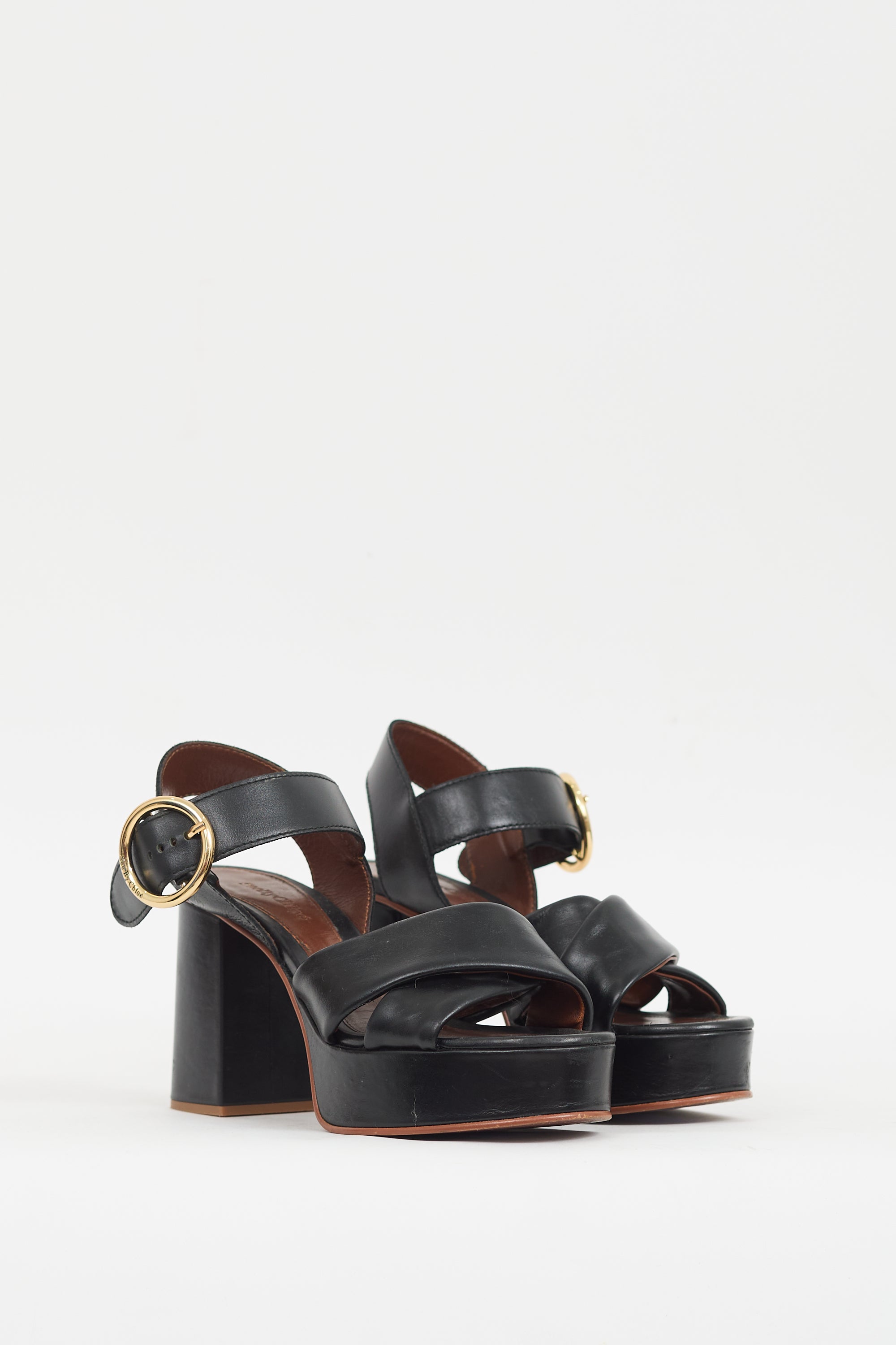 Pre-owned See By Chloé black leather Lyna heels featuring an open rounded toe, criss cross straps across vamp, adjustable ankle strap with gold tone circular buckle, covered platform, and covered block heel.