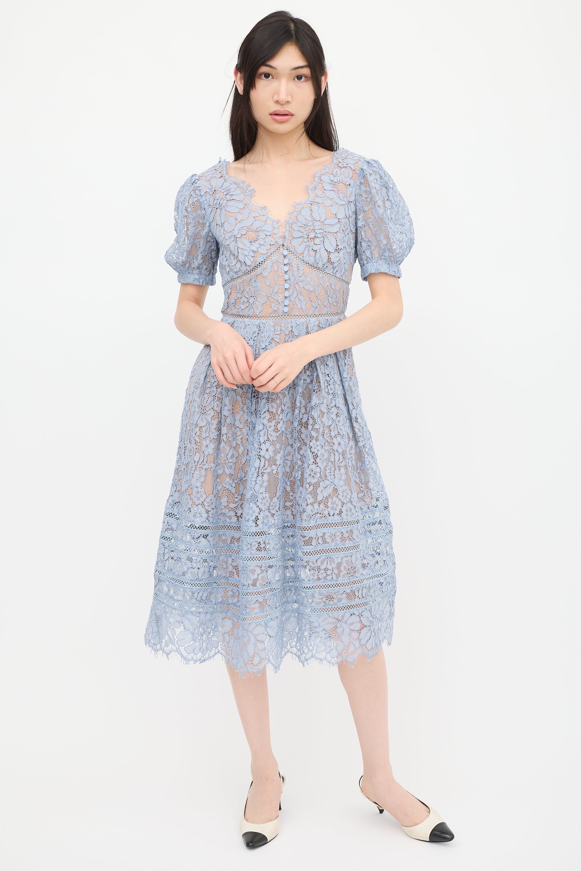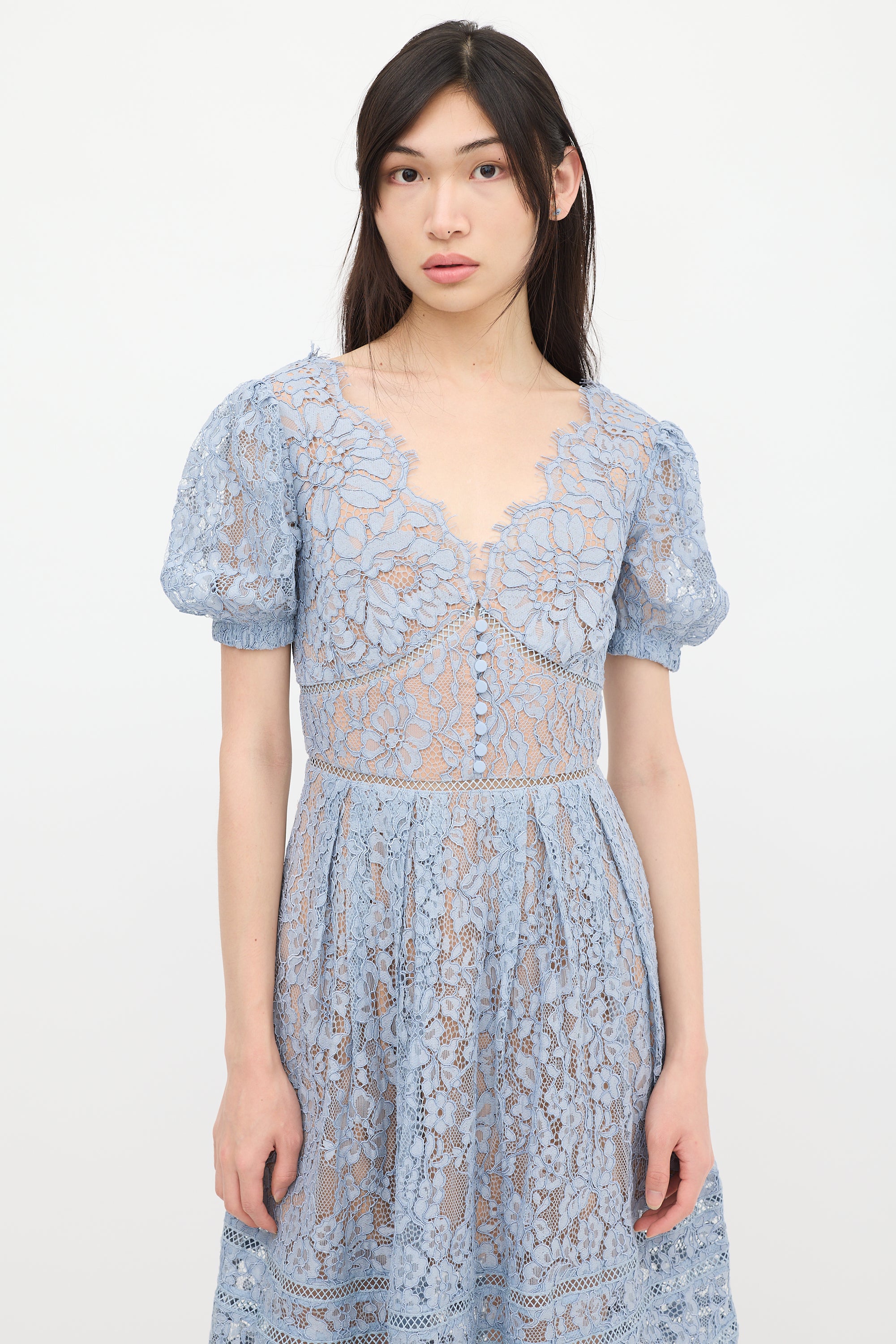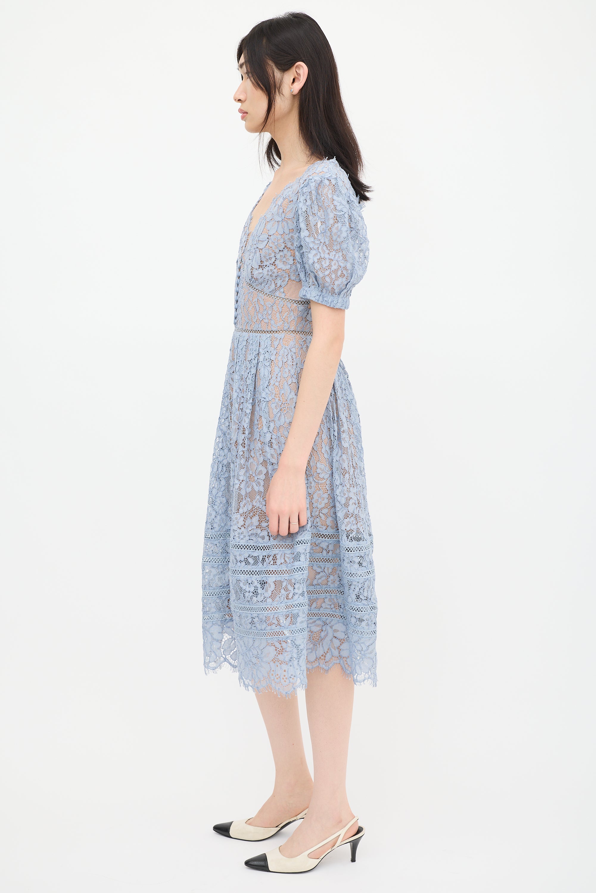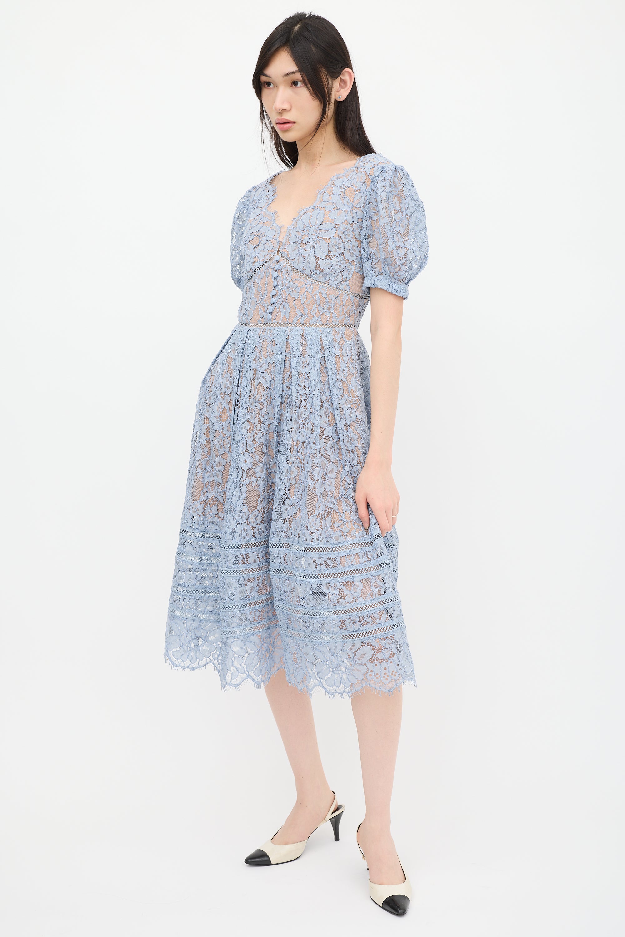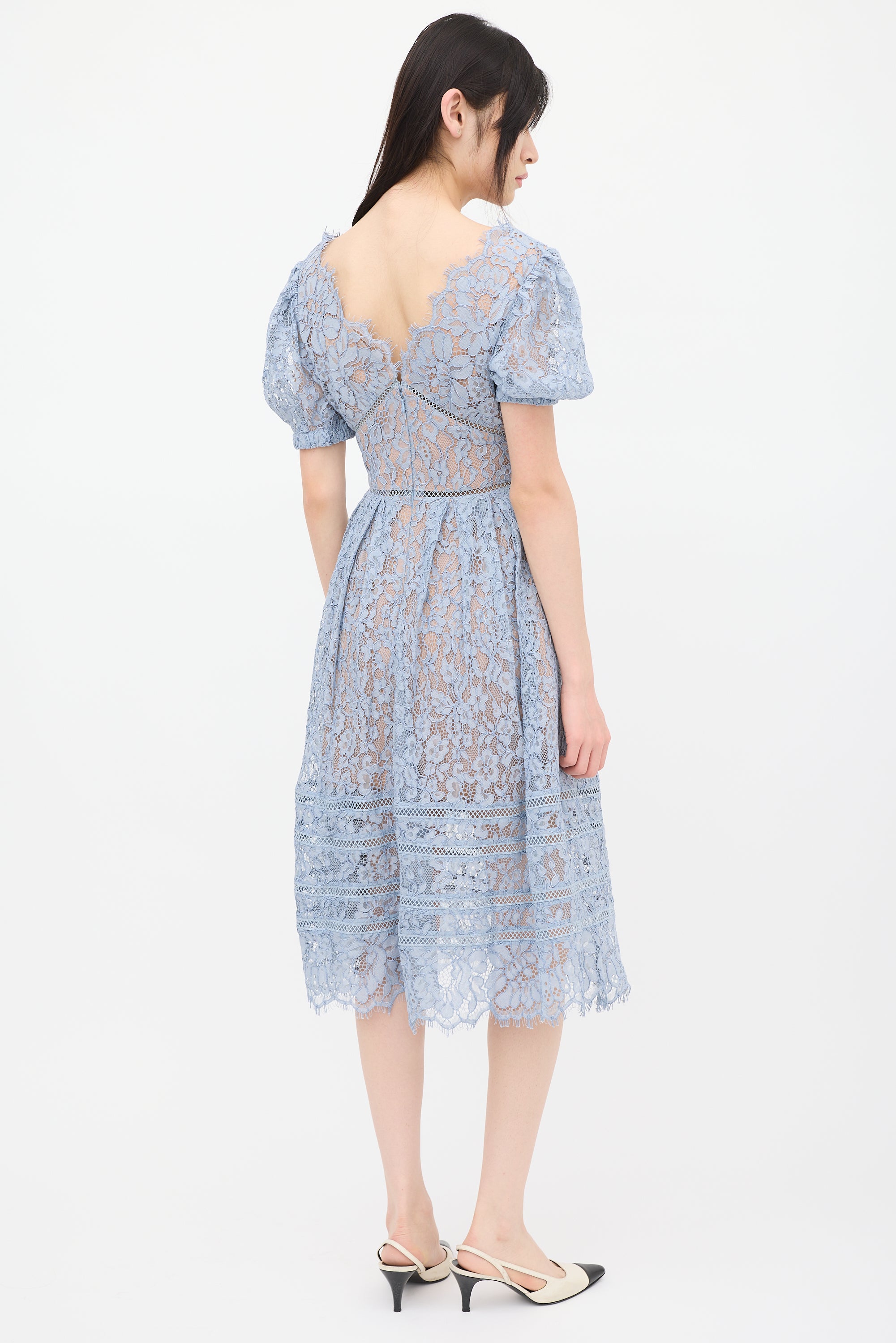 Self-Portrait blue midi dress featuring floral lace detailing, V-neckline, short puffed sleeves, button detail at bust, pleated skirt, scalloped hem, and zip at back with hook and eye closure. Lined.
