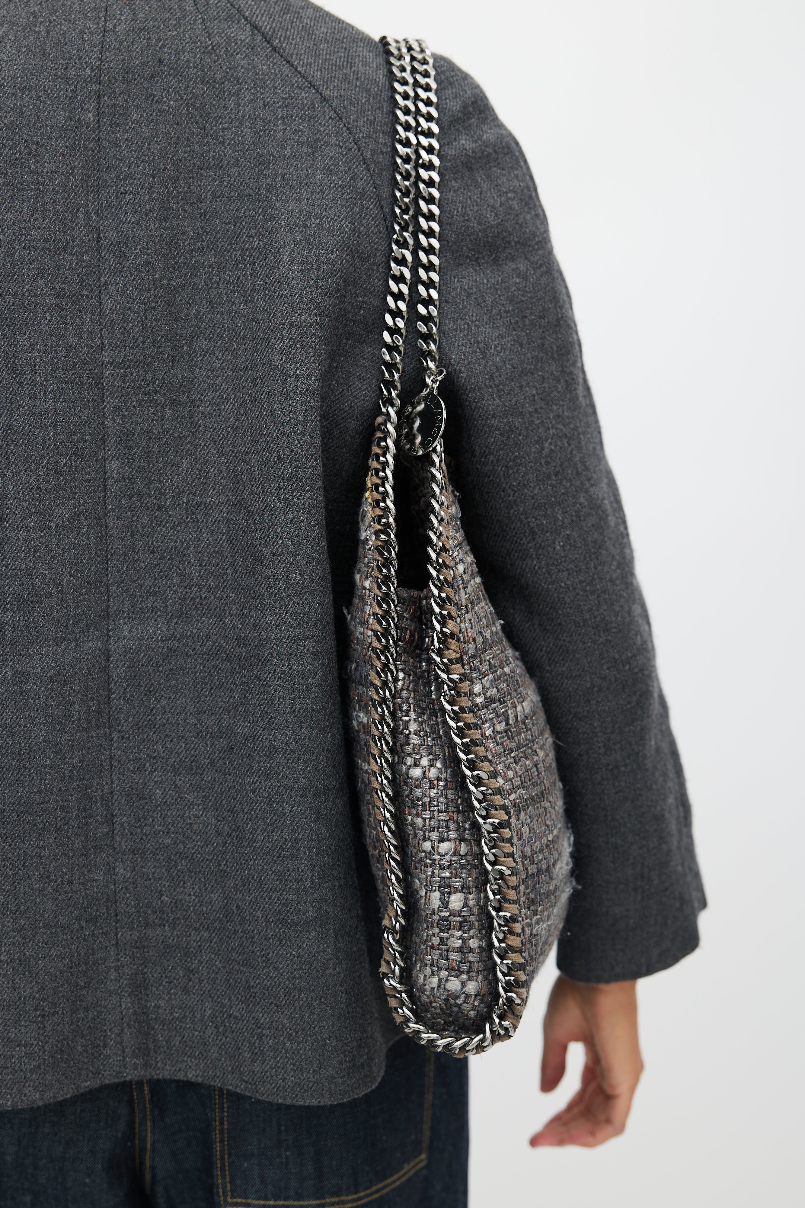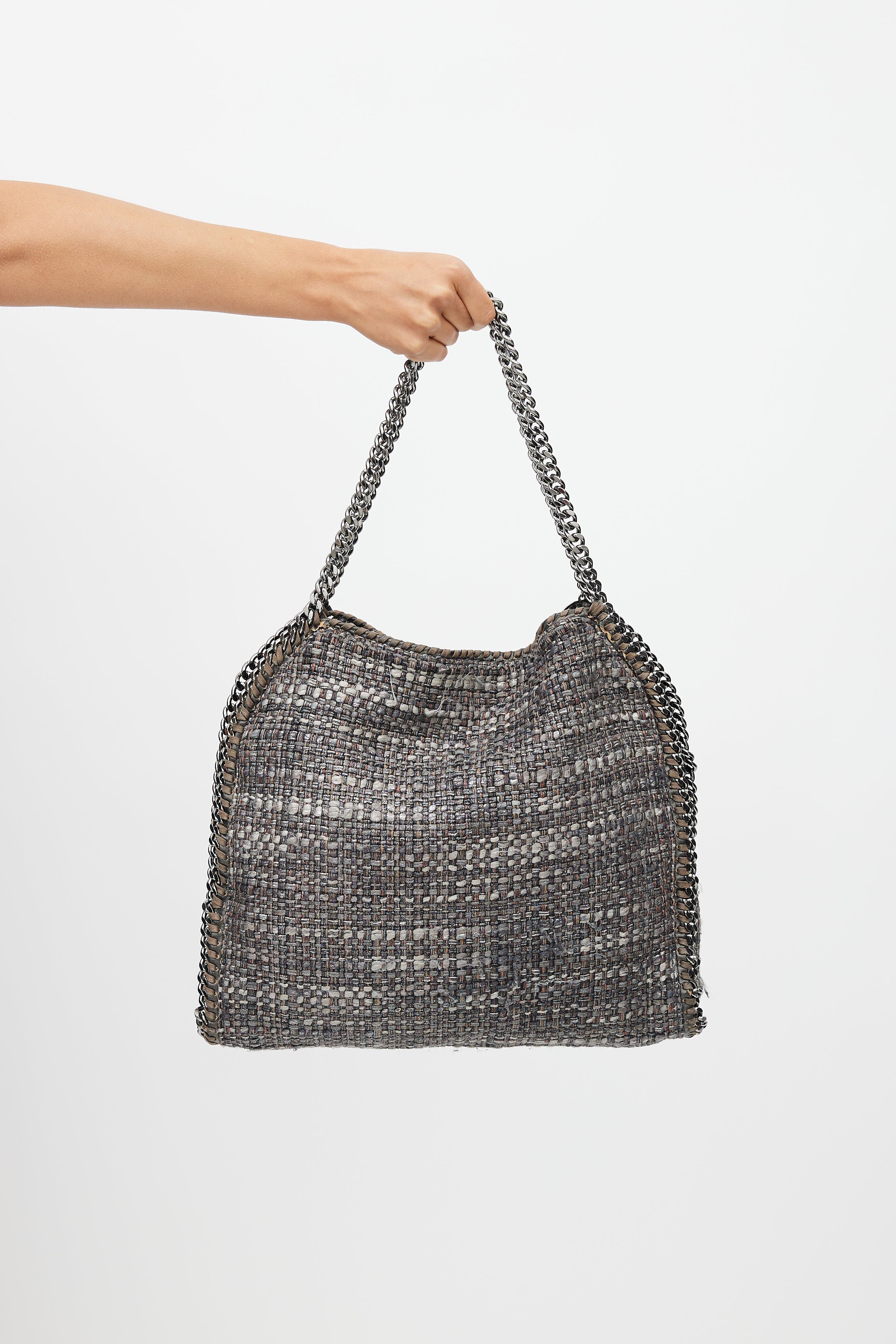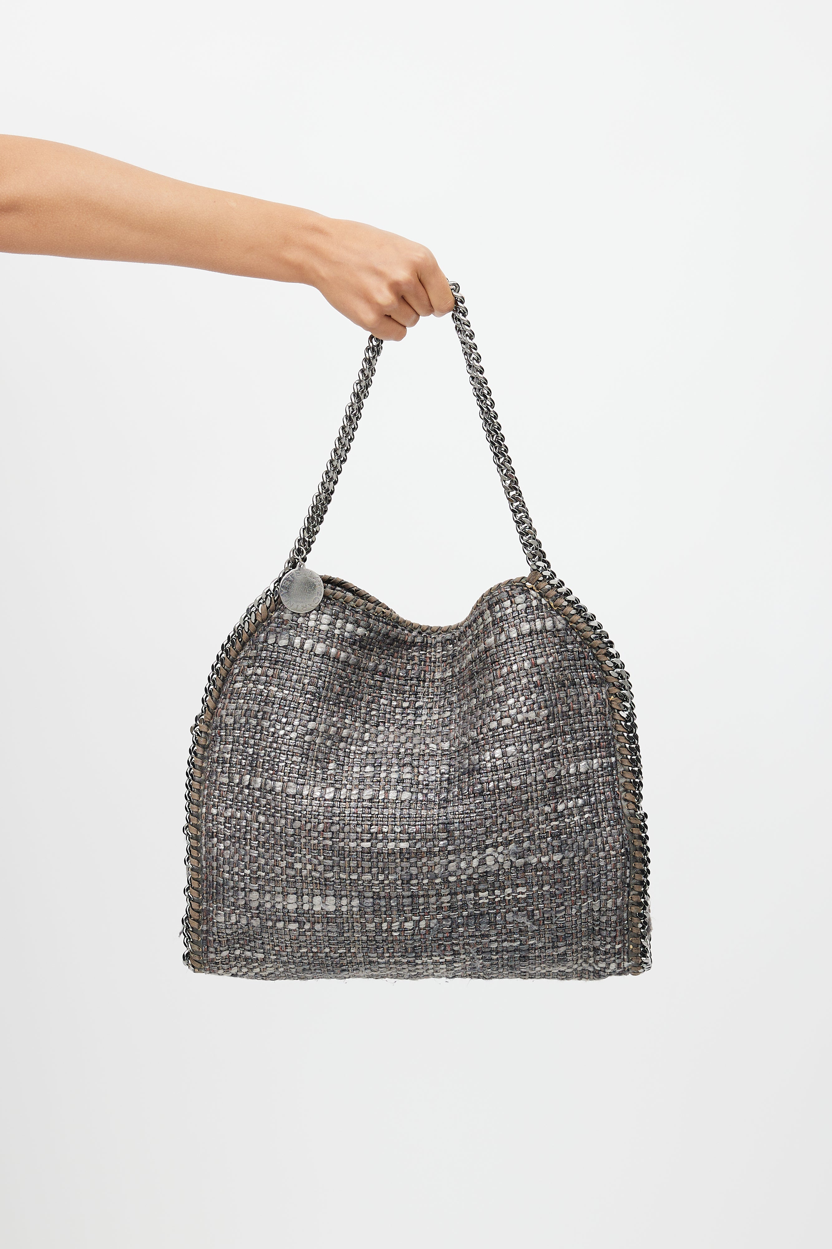 Pre-owned Stella McCartney grey Falabella shoulder bag featuring a metallic woven tweed throughout, silver tone braided chain trim at side, chain link shoulder straps, one main compartment with one zip pocket, and magnetic top closure.