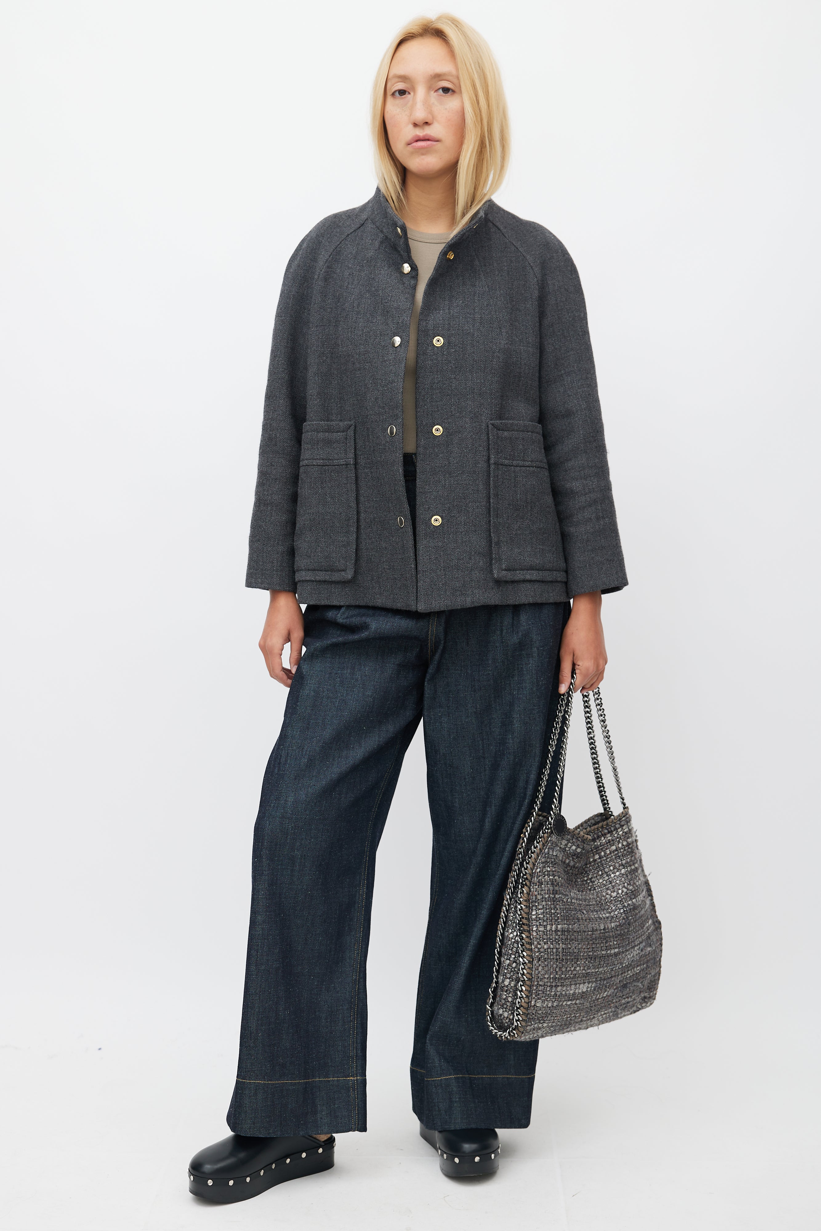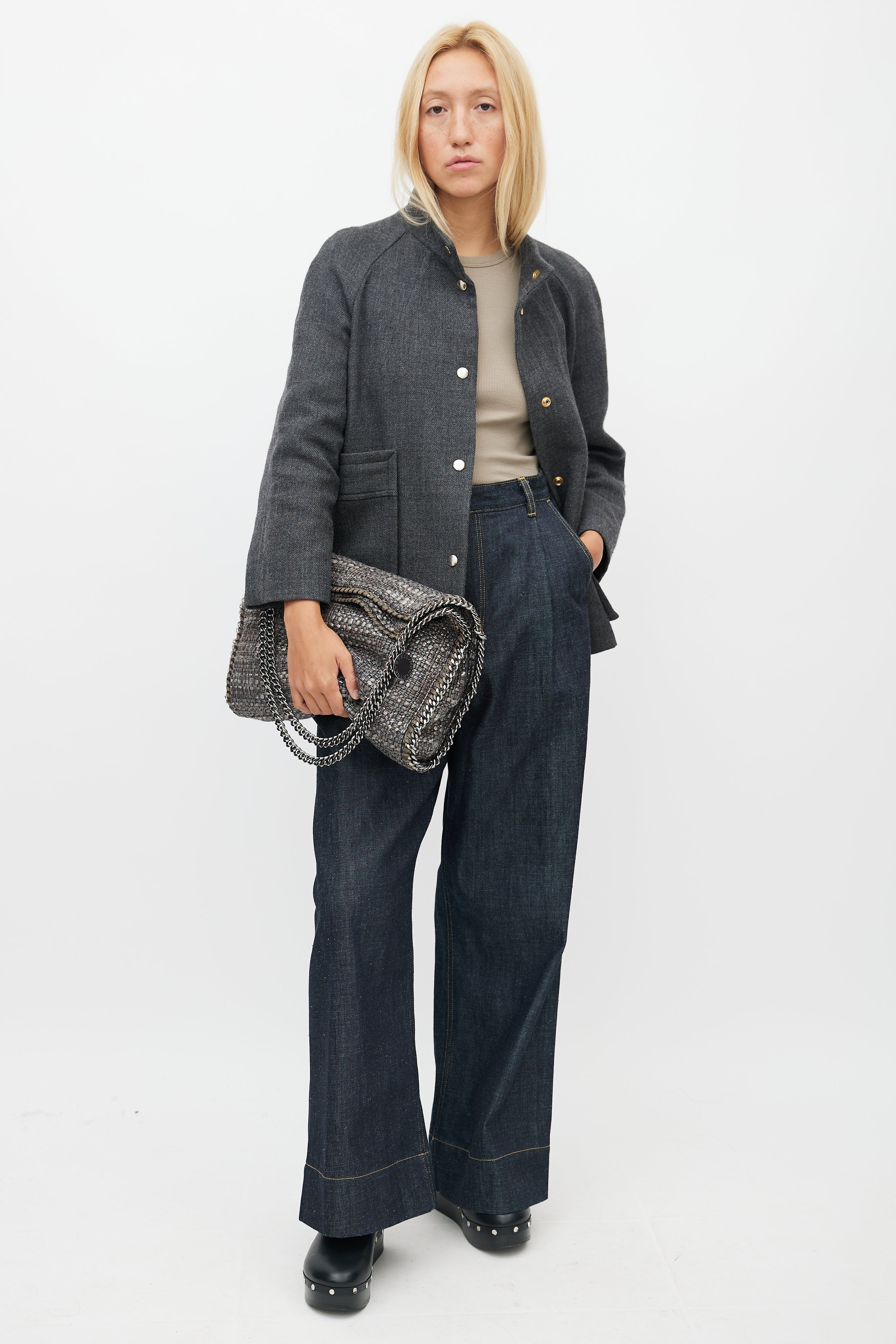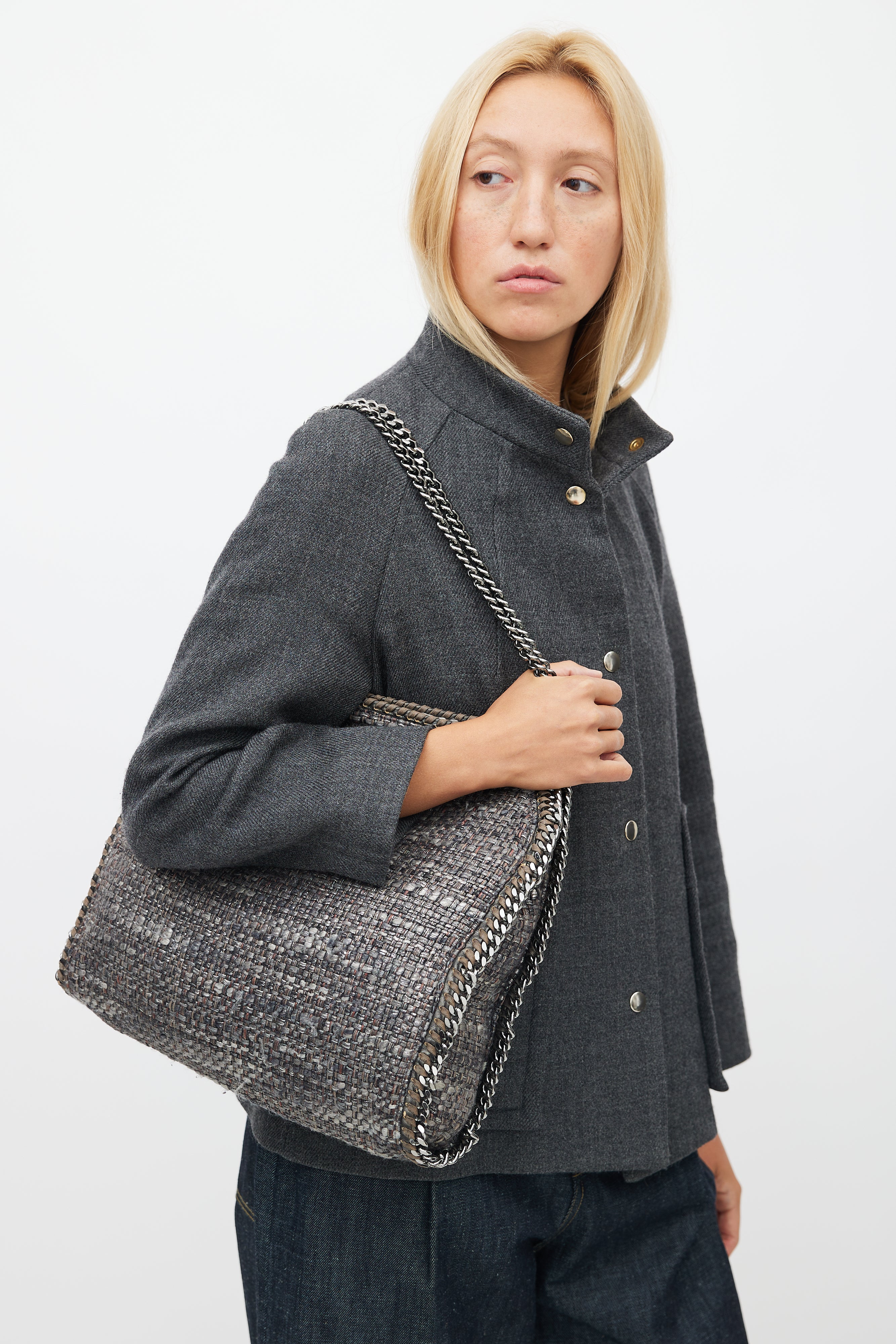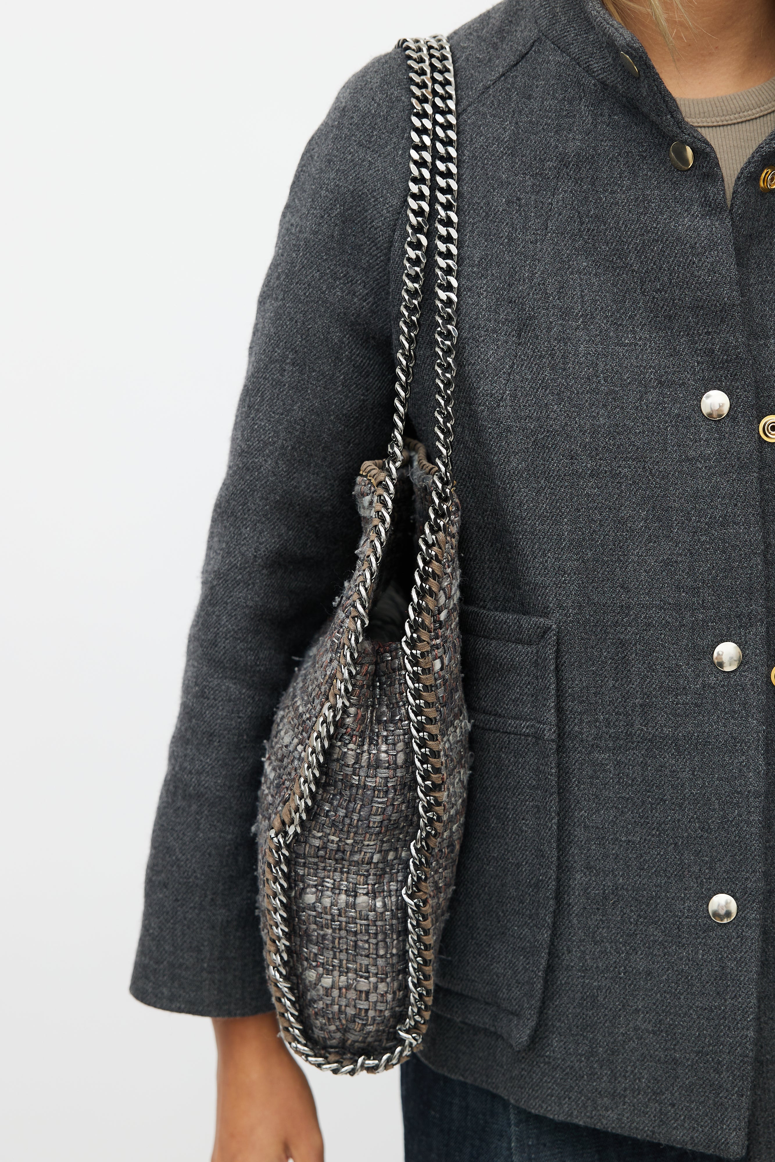 Pre-owned Stella McCartney grey Falabella shoulder bag featuring a metallic woven tweed throughout, silver tone braided chain trim at side, chain link shoulder straps, one main compartment with one zip pocket, and magnetic top closure.