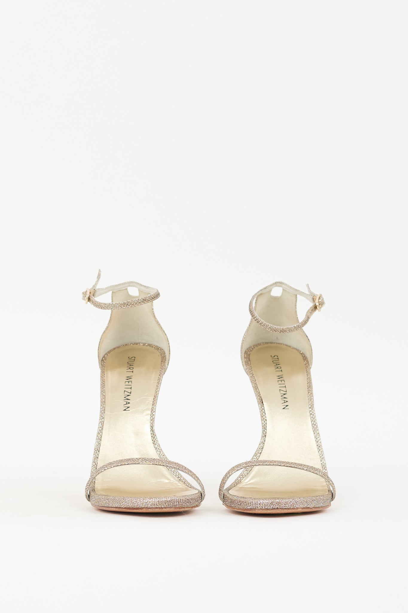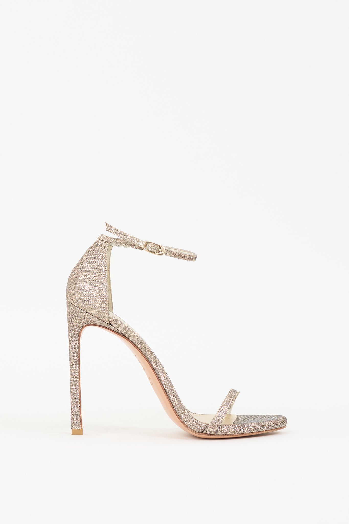 Pre-owned Stuart Weitzman gold glitter Nudistcurve heels featuring almond toe, adjustable ankle strap with buckle closure, covered stiletto heel, and leather insole and outsole.