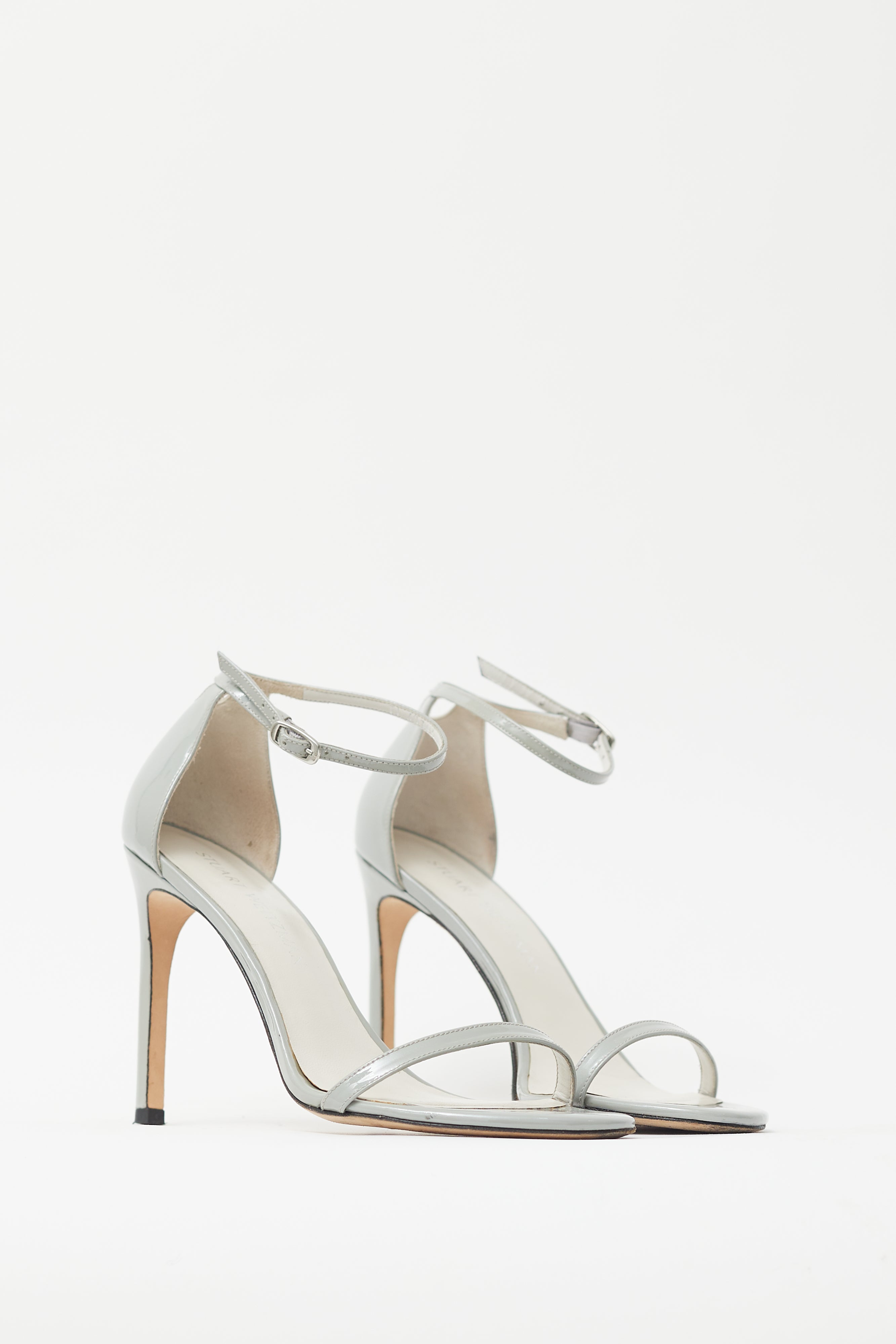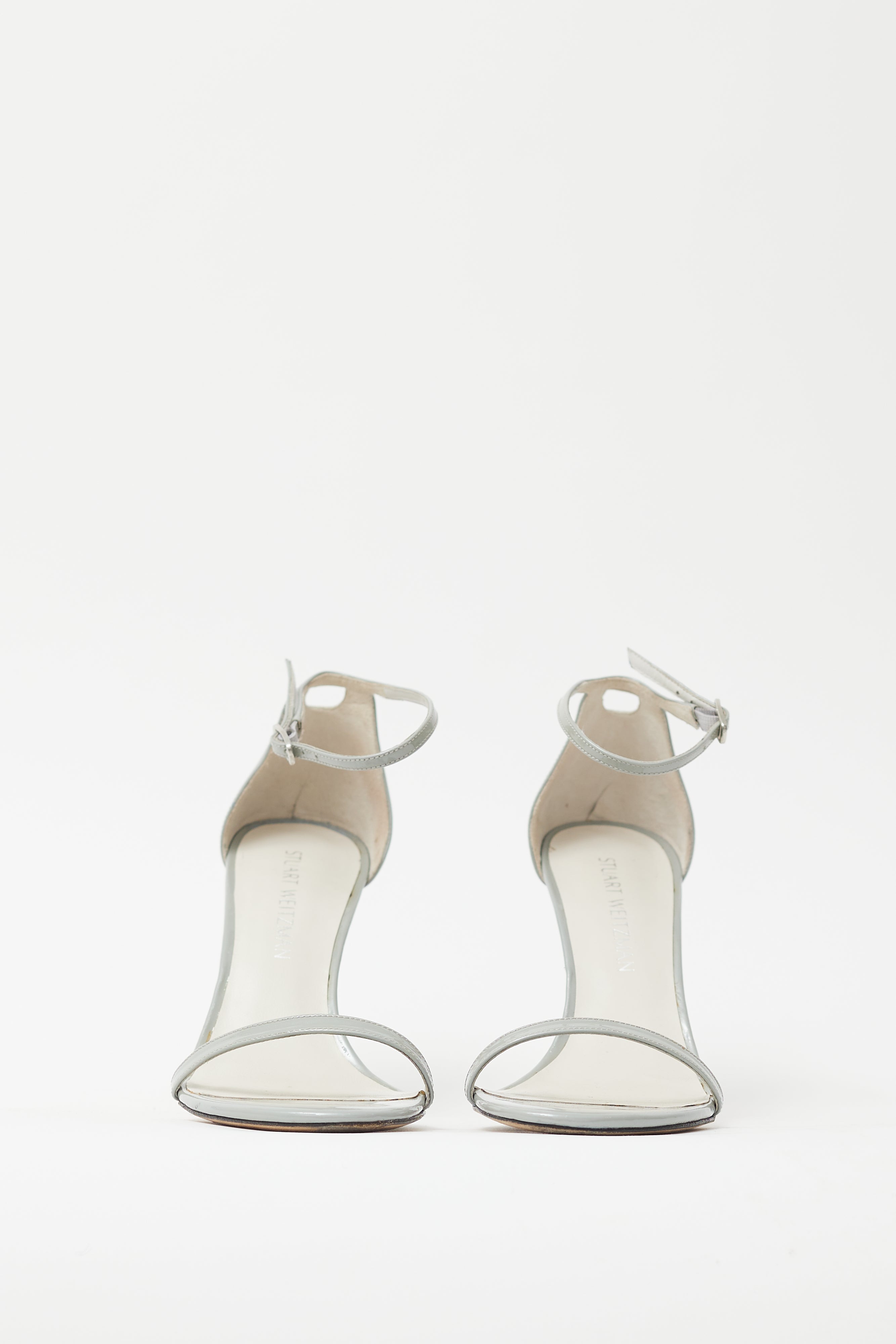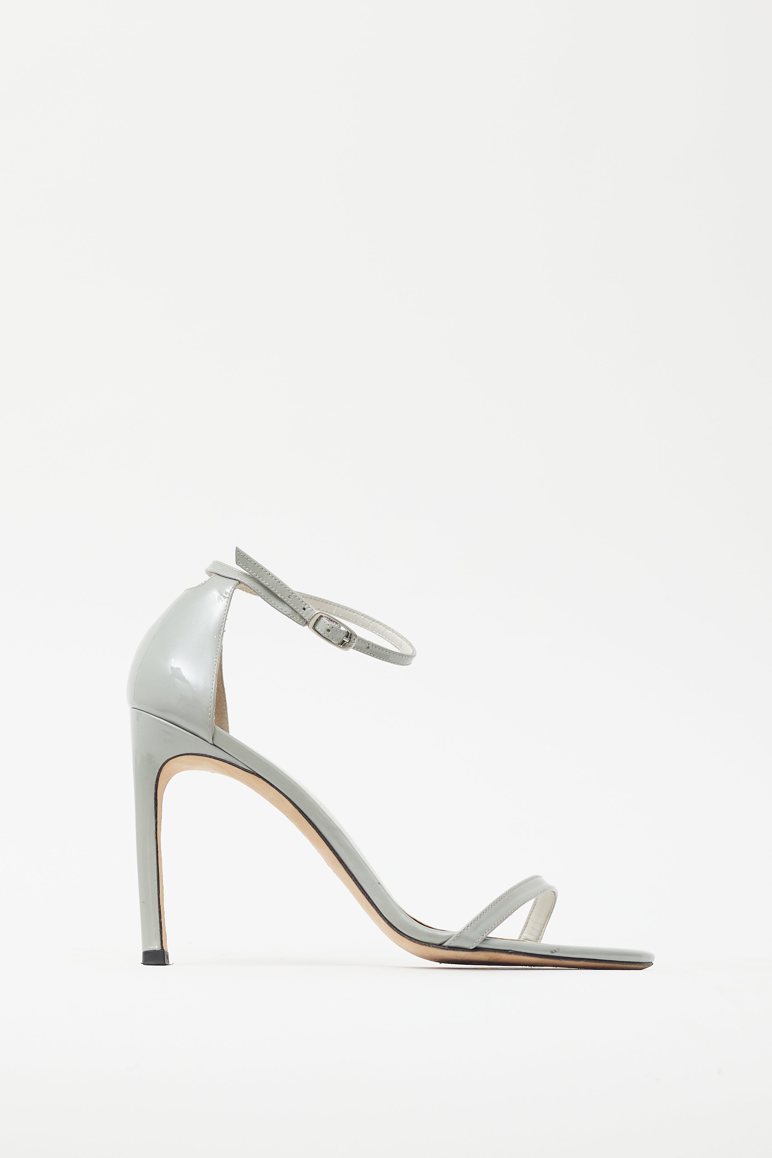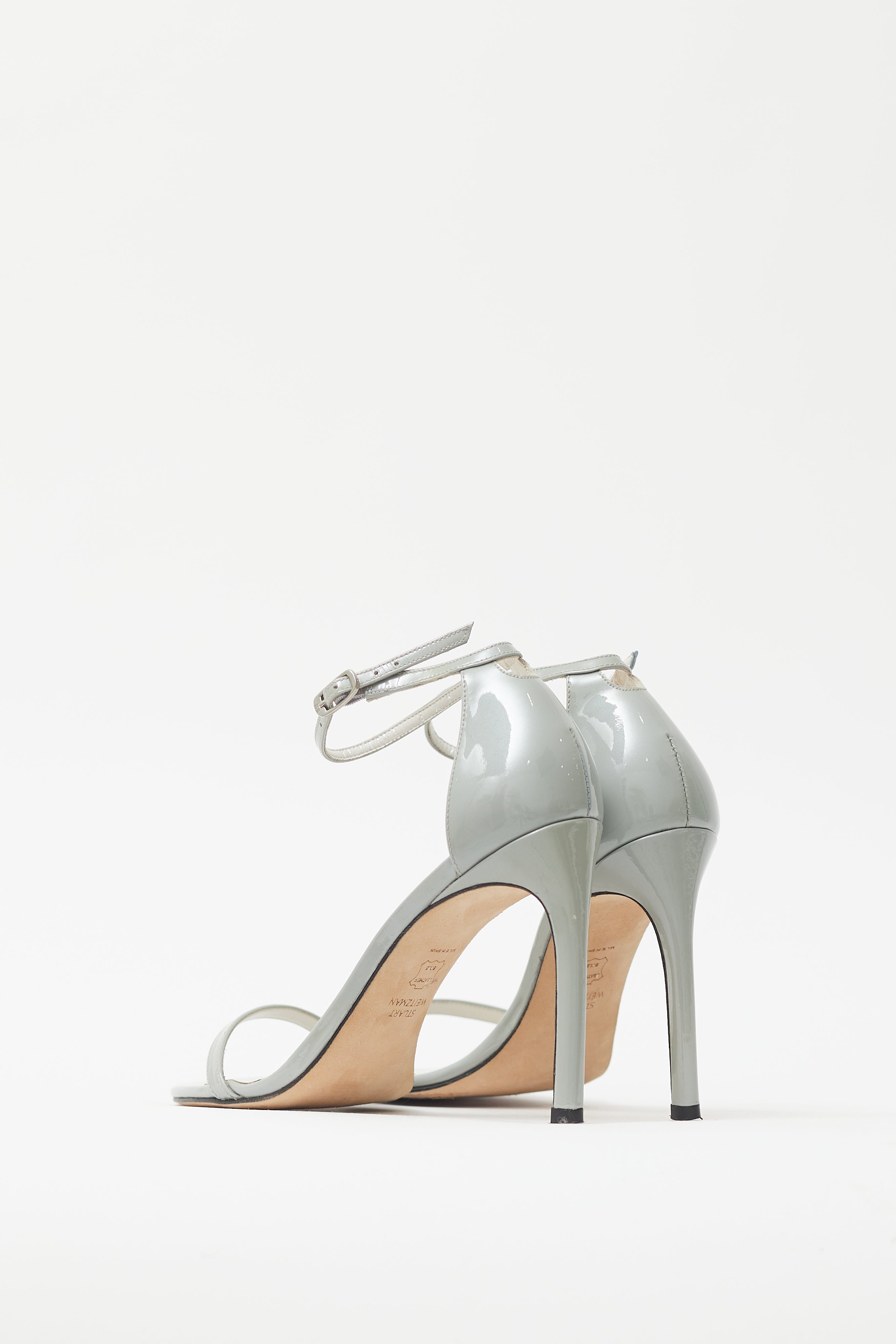 Pre-owned Stuart Weitzman grey glossy patent leather Nudistsong sandal featuring a rounded toe, a strap at vamp, adjustable ankle strap, stiletto heel, and leather sole.