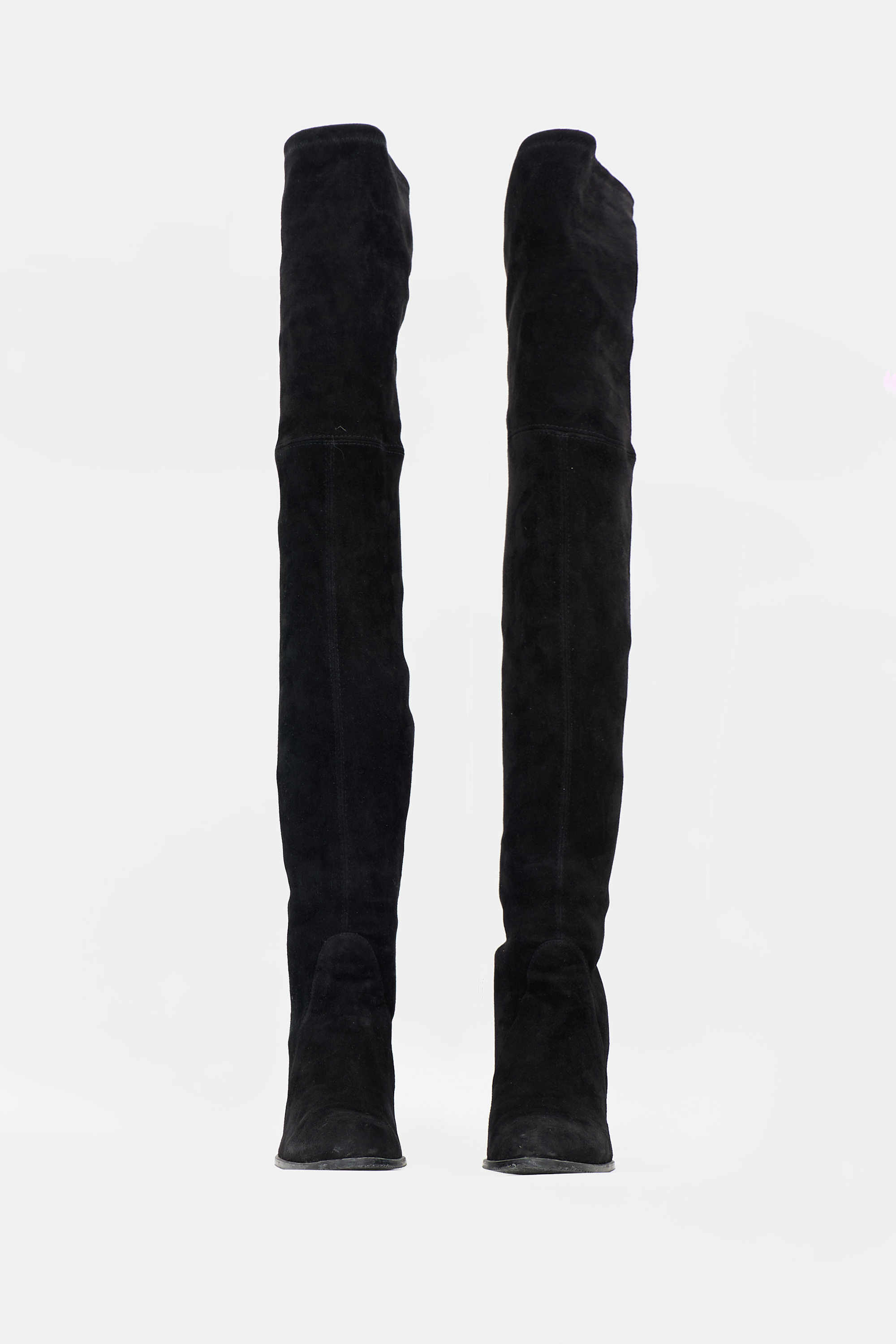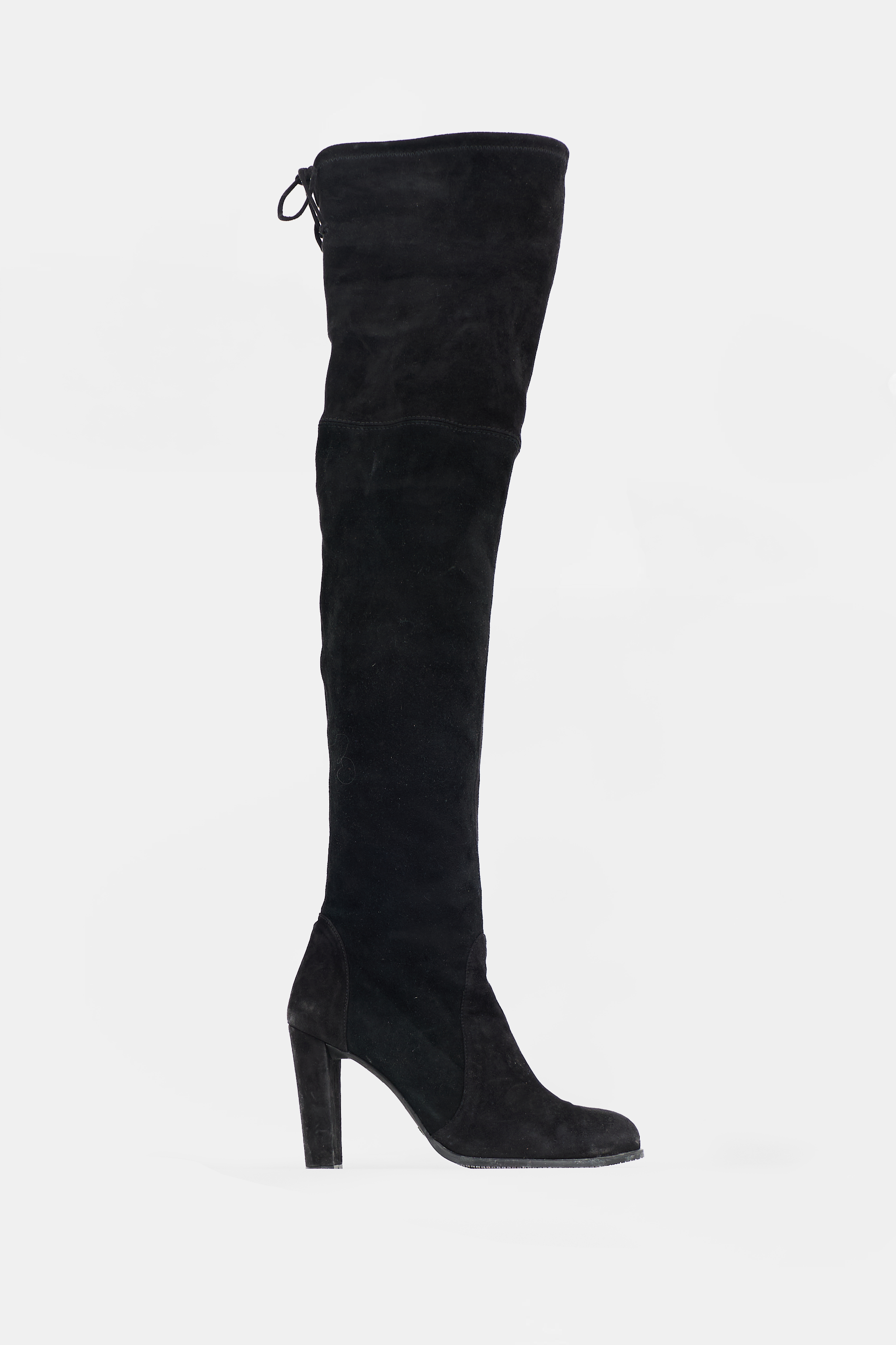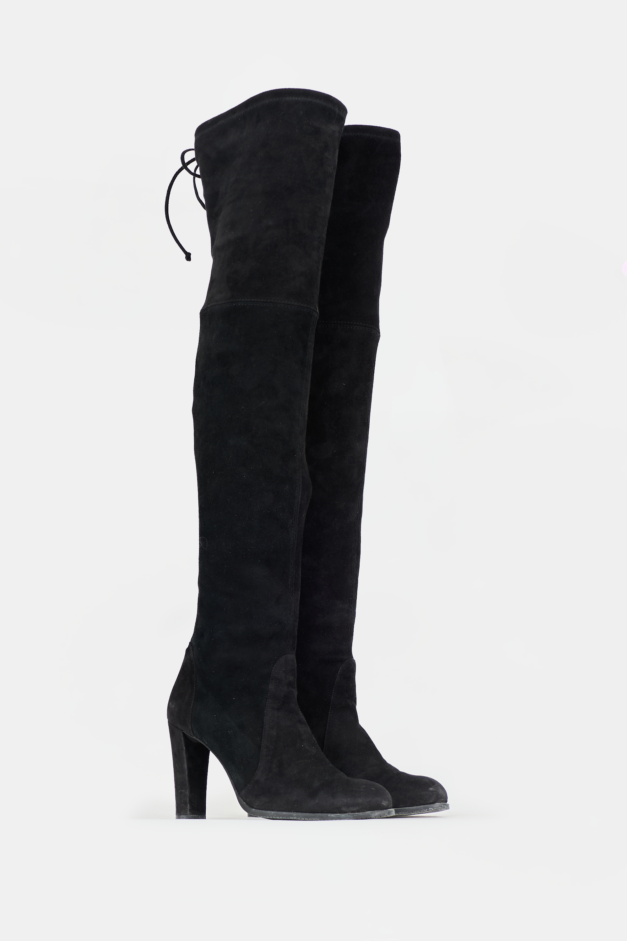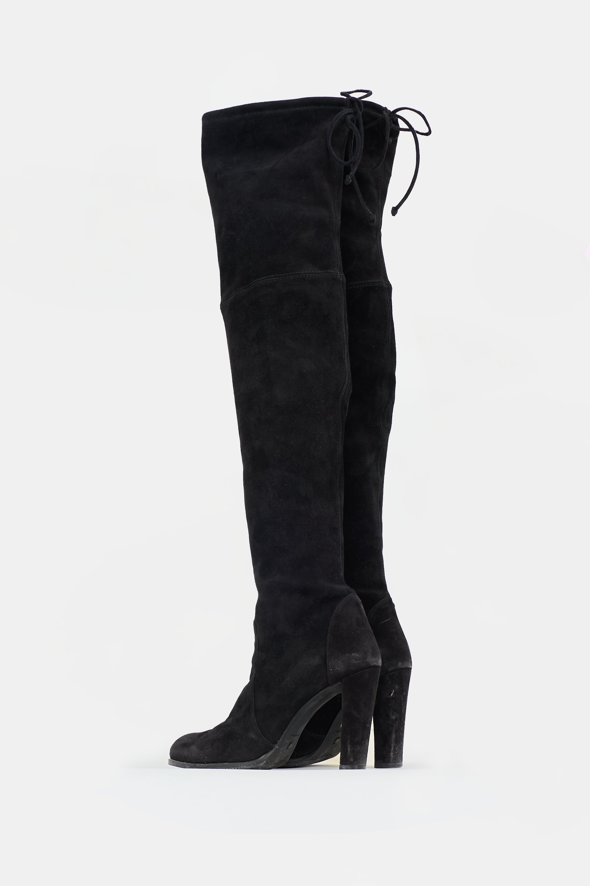 Pre-owned Stuart Weitzman black suede Highland thigh high boots featuring almond toe, pull on entry, tie topline, and covered chunky heel.