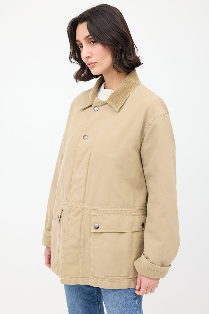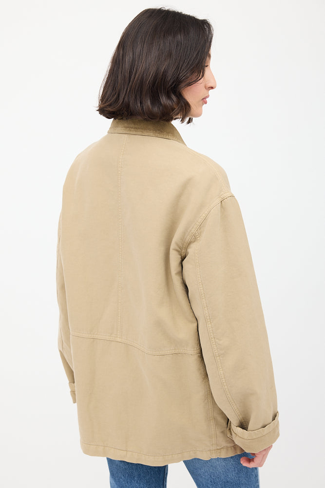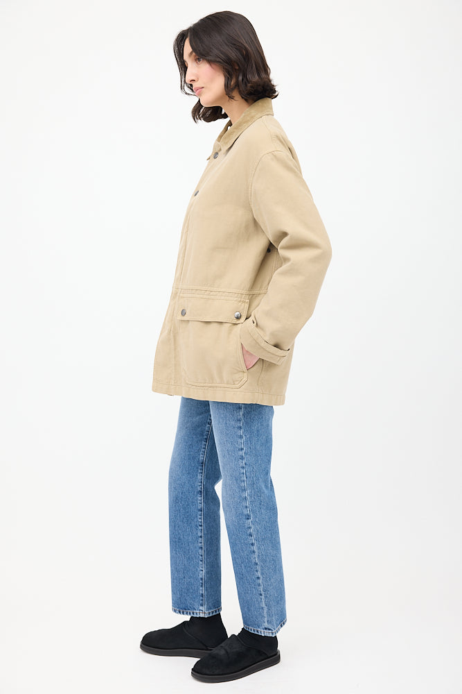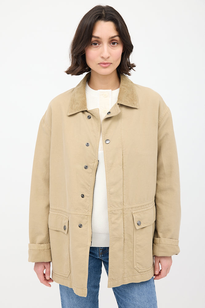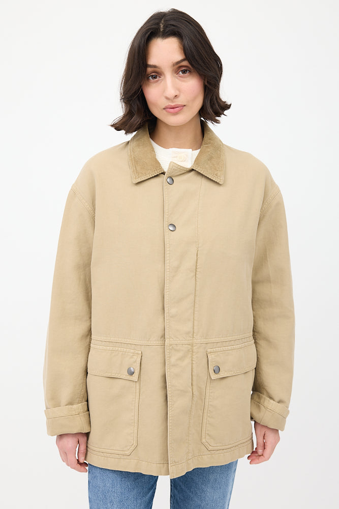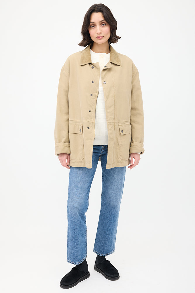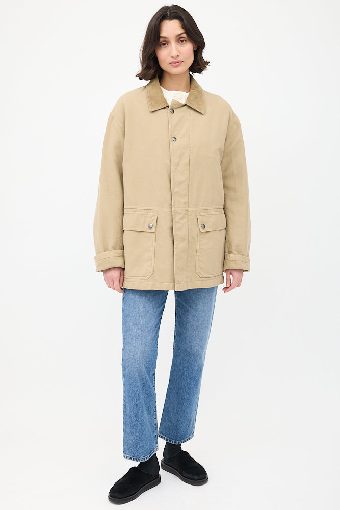 Pre-owned The Row brown cotton canvas Frank jacket featuring a corduroy spread collar, front zip closure with snap button placket, and two buttoned flap pockets at front hip. Unlined.