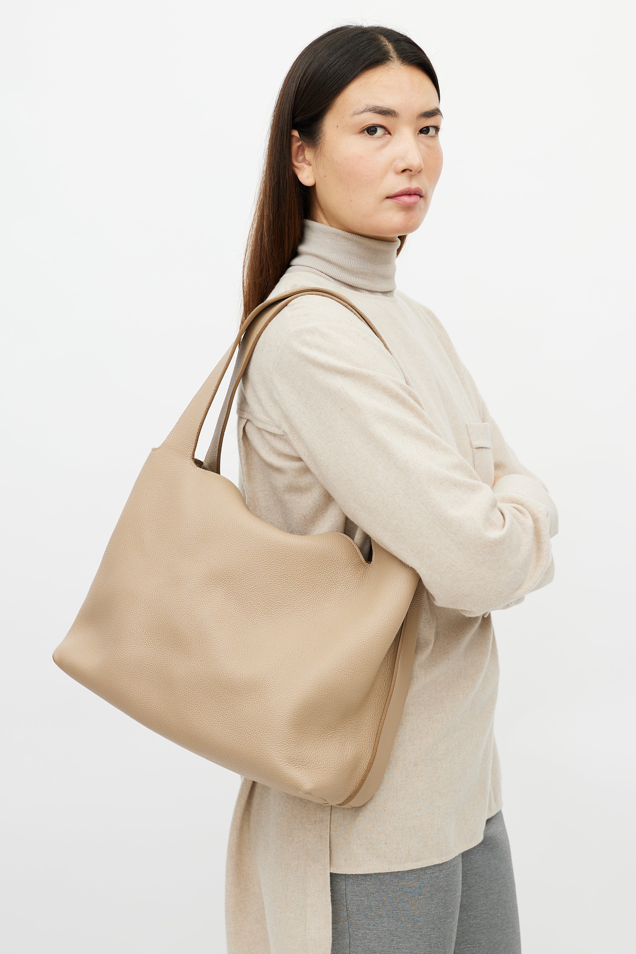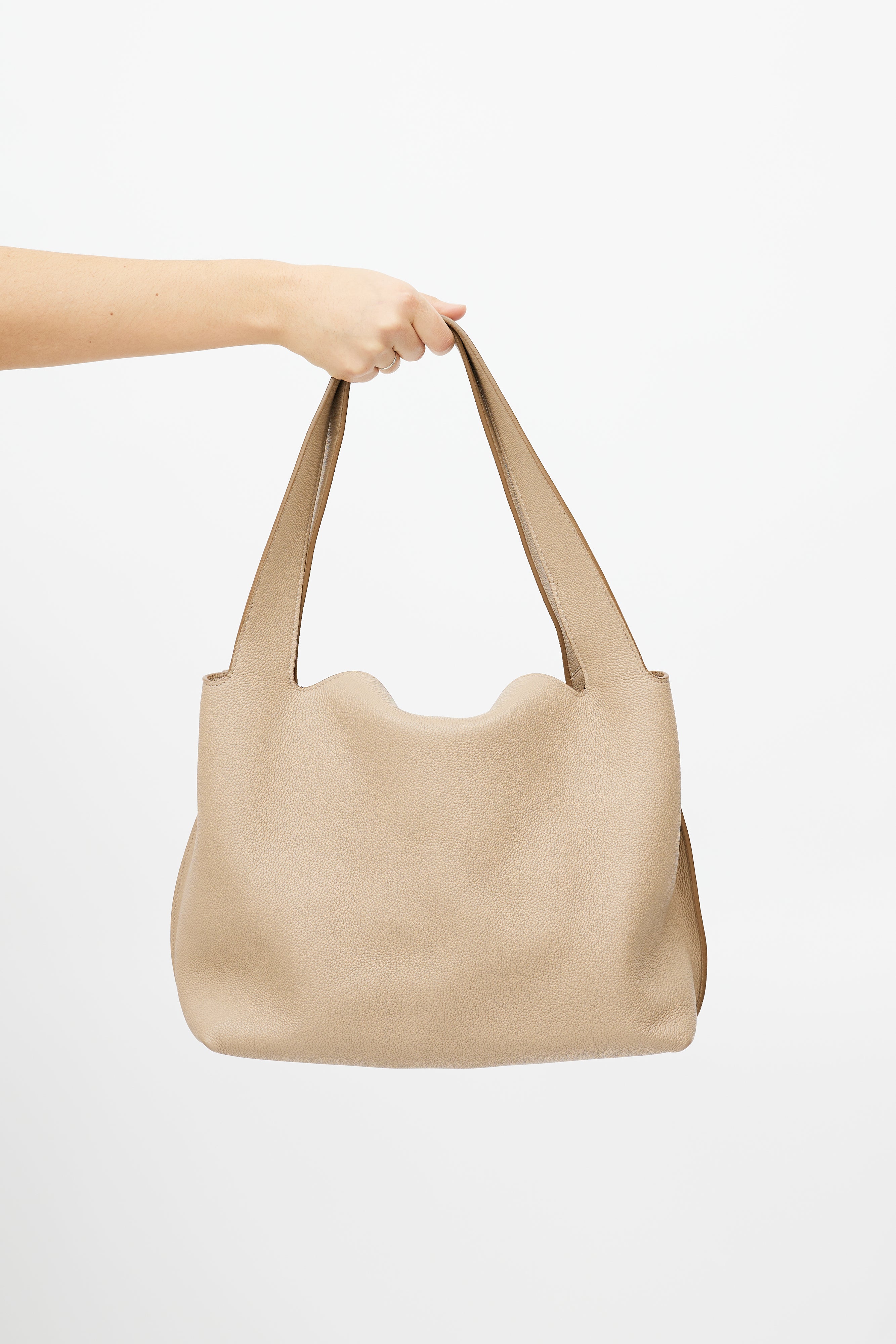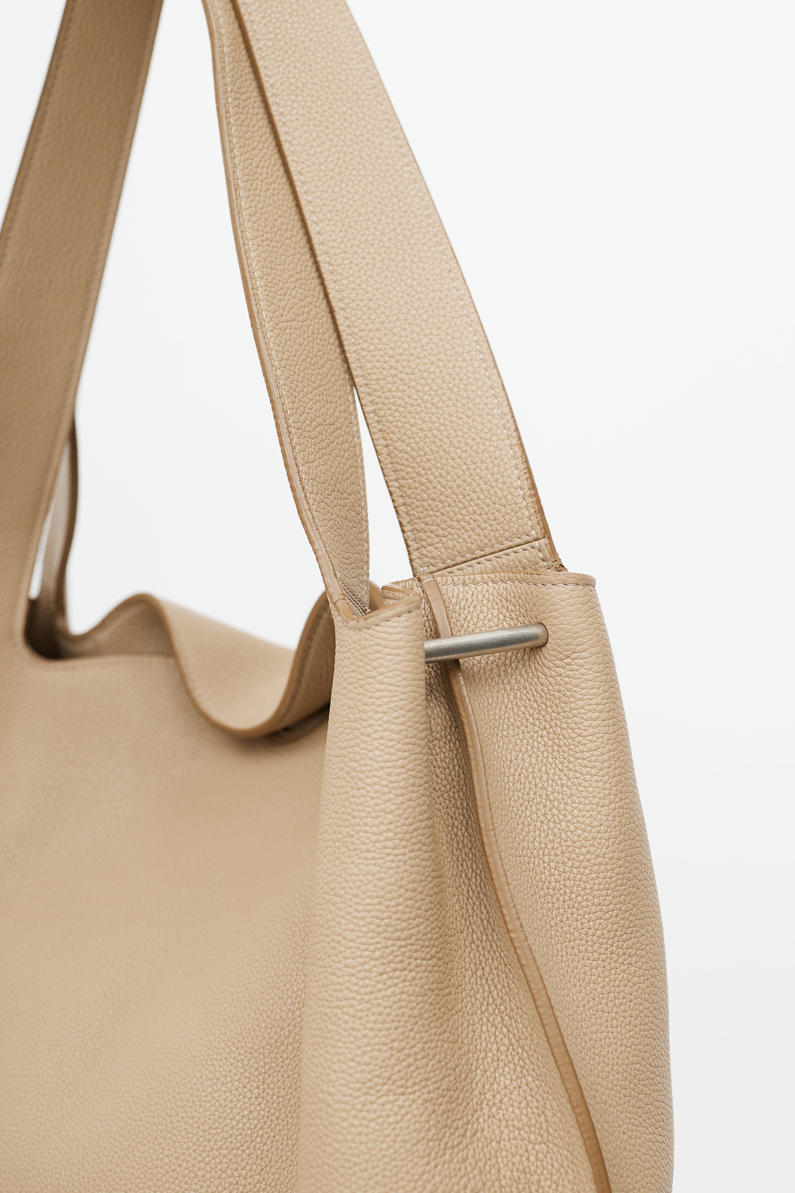 Pre-owned The Row beige Duplex leather bag featuring two top handles, one interior pouch with two slip pockets, top zip closure, two main compartments, silver tone hardware at sides, and top magnetic snap closure.