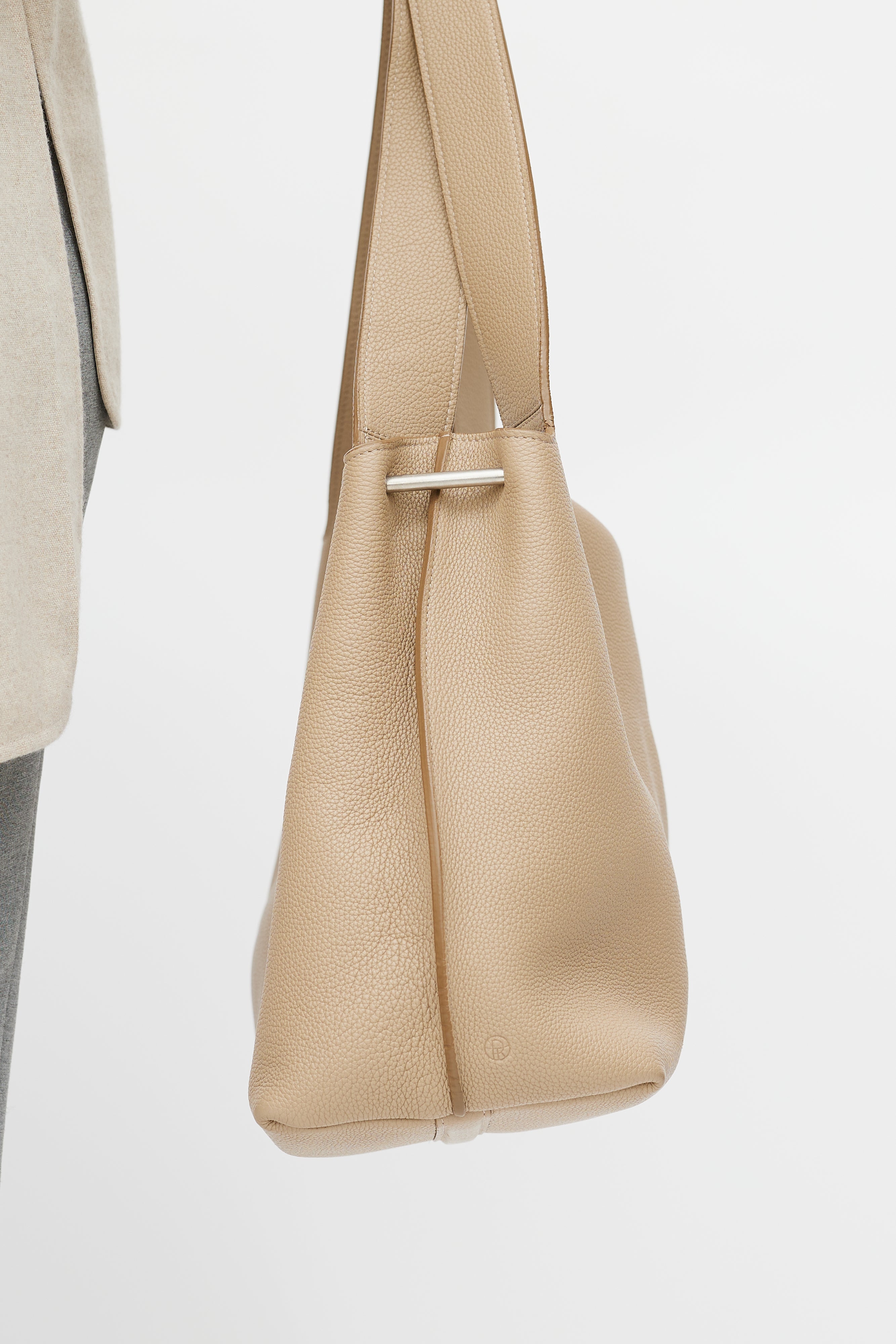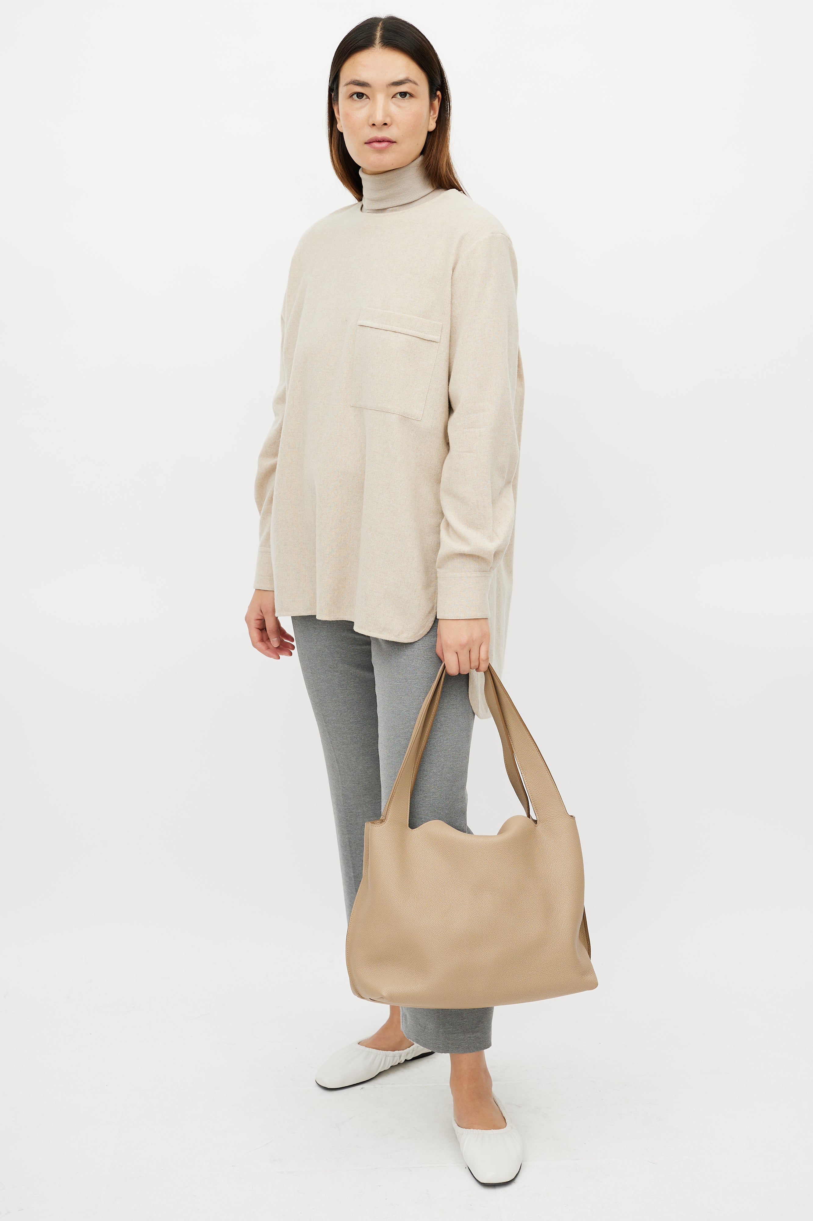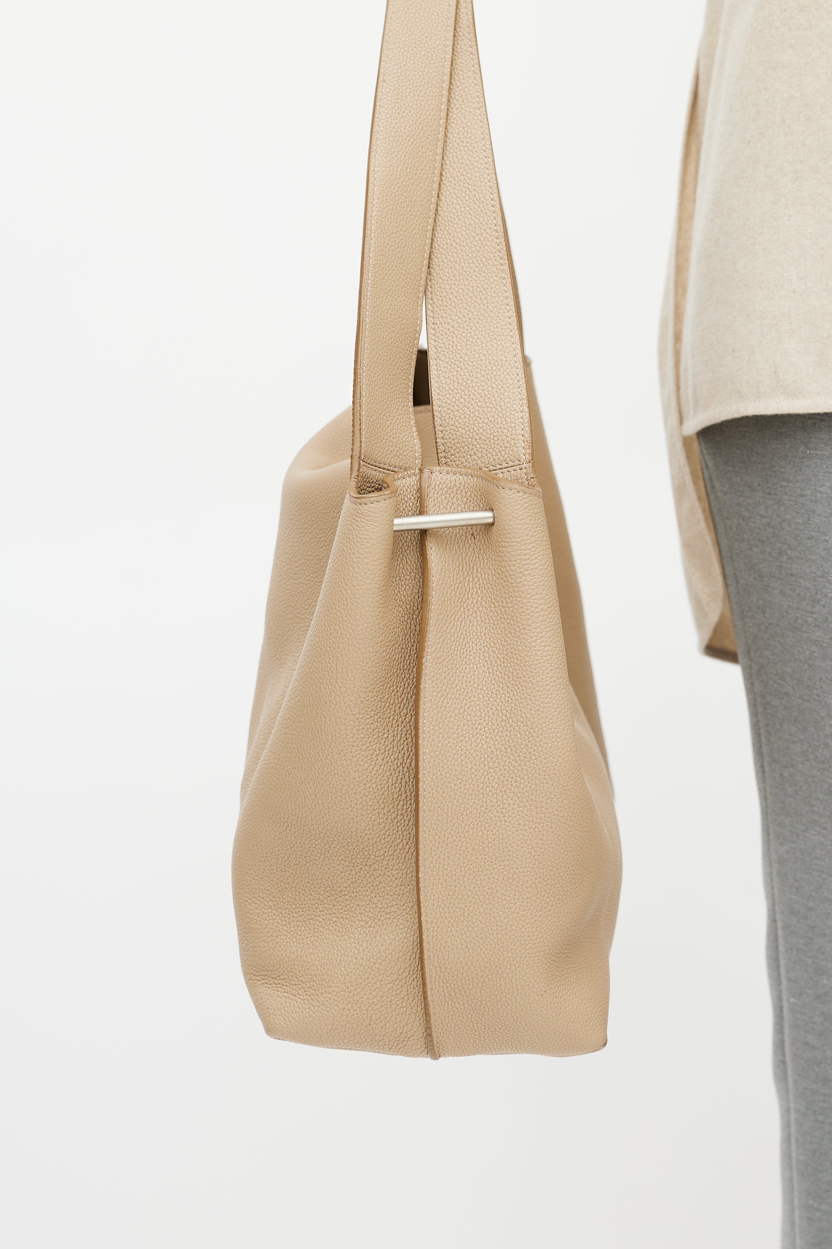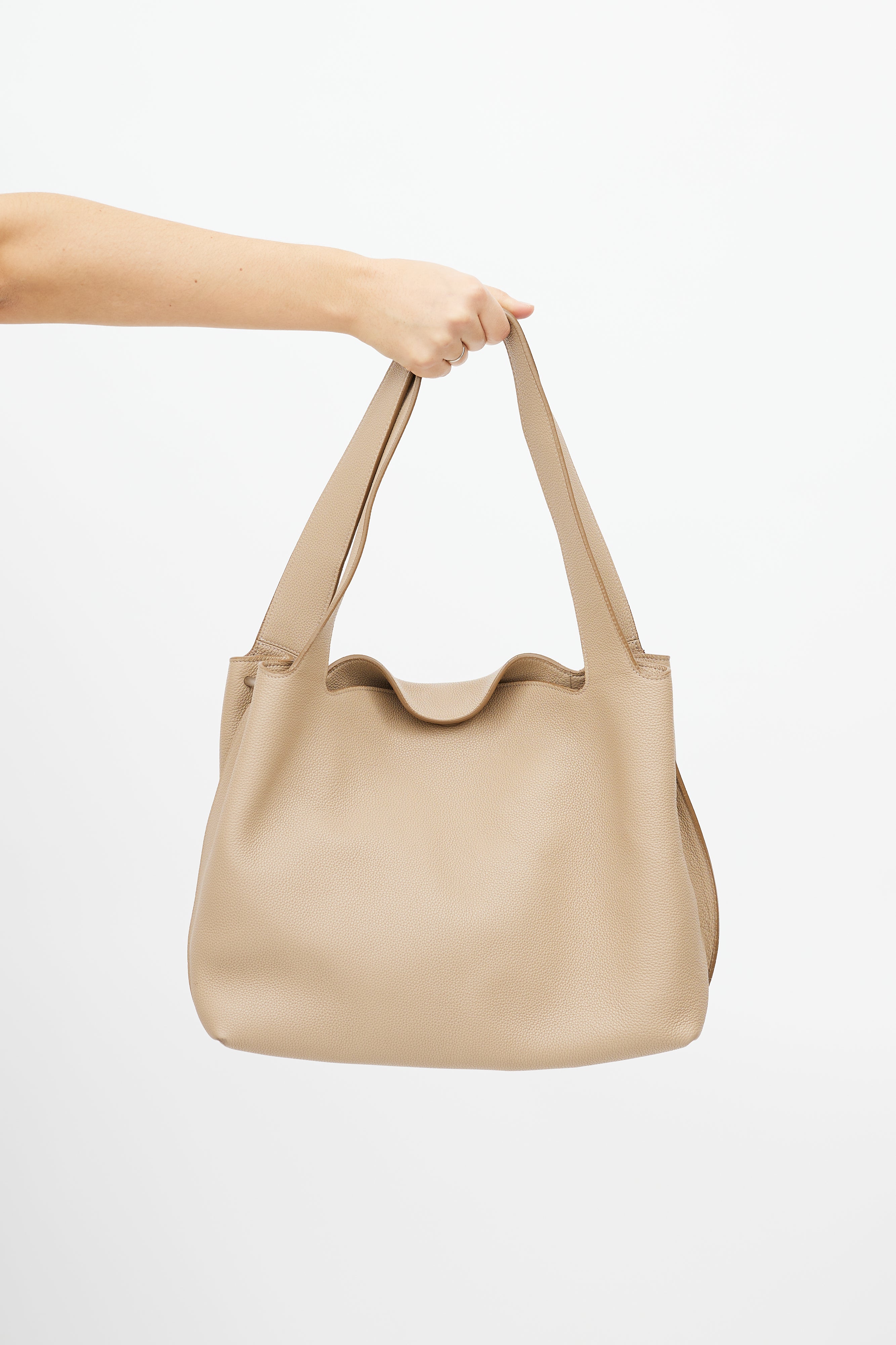 Pre-owned The Row beige Duplex leather bag featuring two top handles, one interior pouch with two slip pockets, top zip closure, two main compartments, silver tone hardware at sides, and top magnetic snap closure.