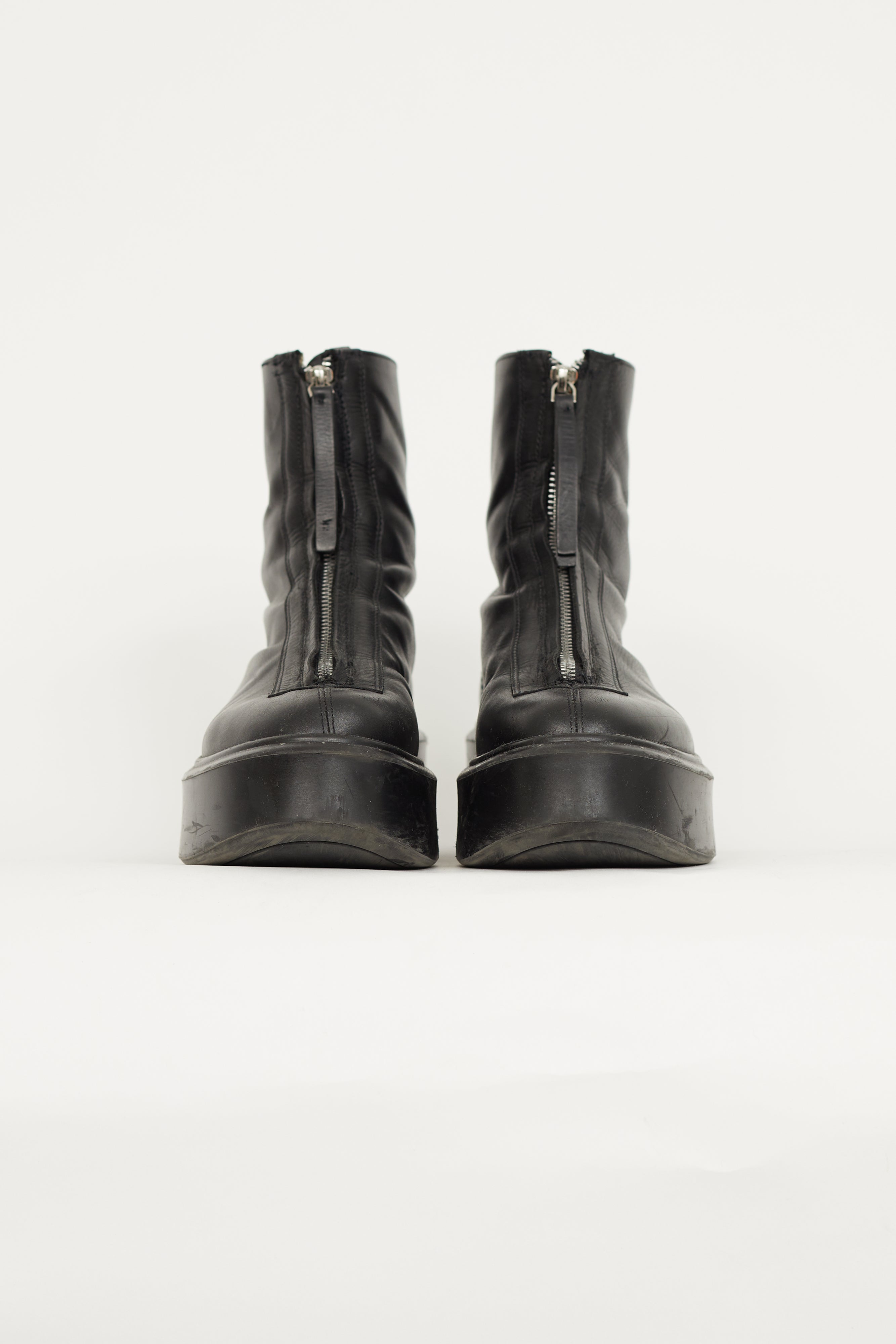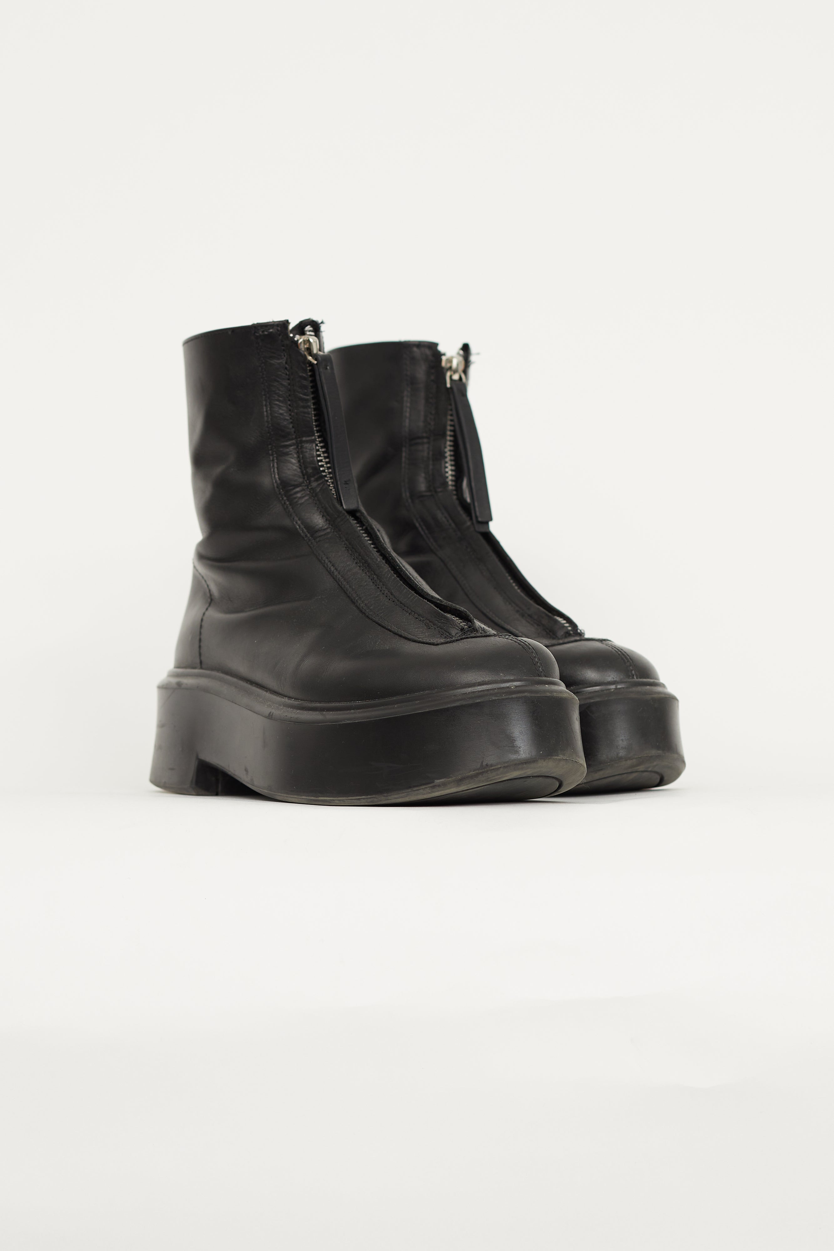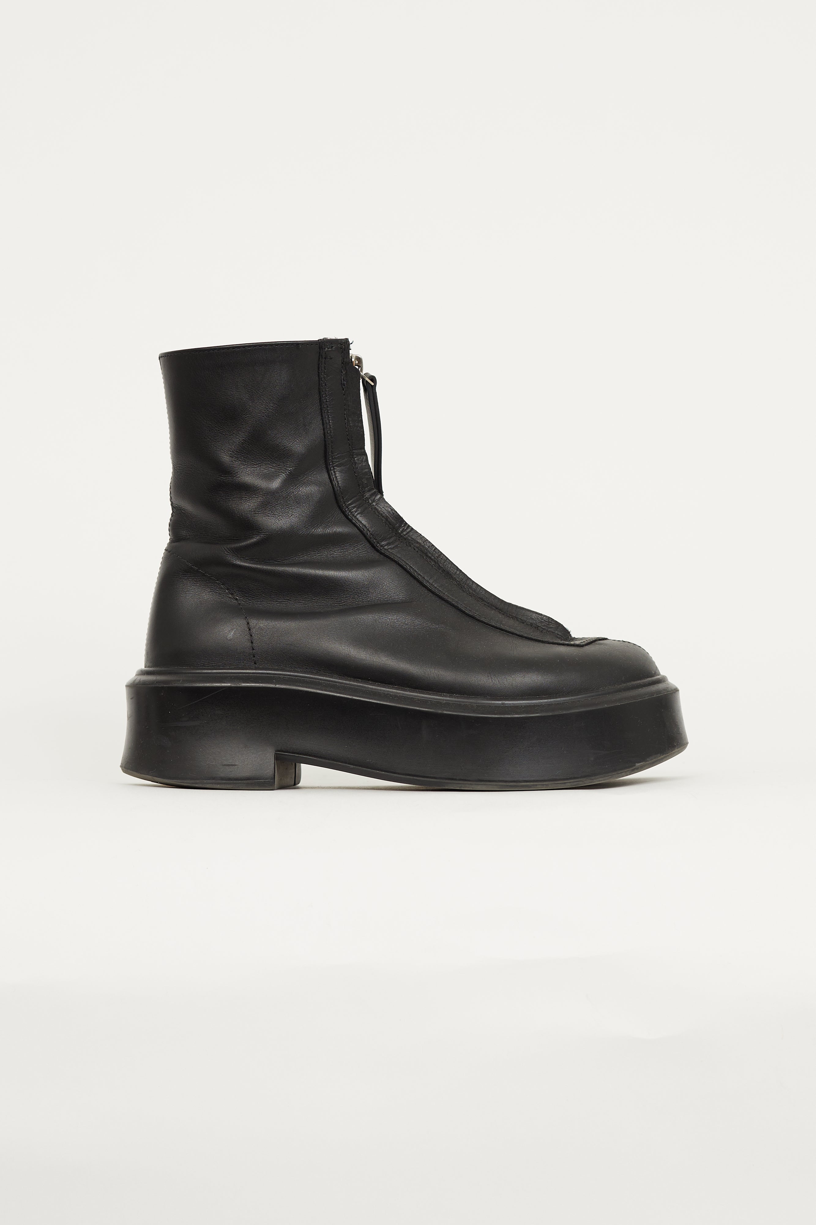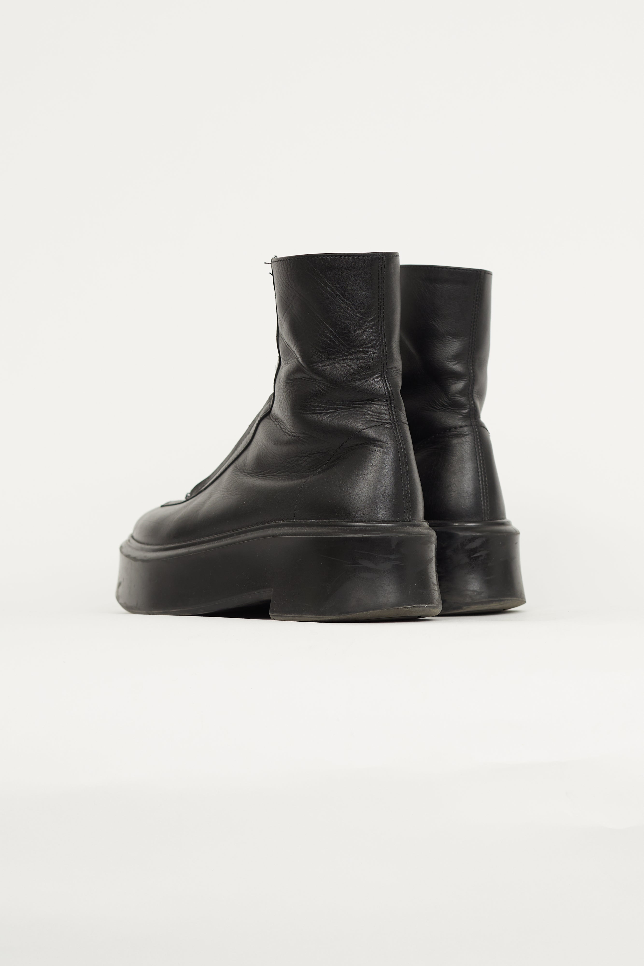 Pre-owned The Row black leather boot featuring a narrow rounded toe, exposed zip at front, chunky platform sole and a narrow ankle shaft.