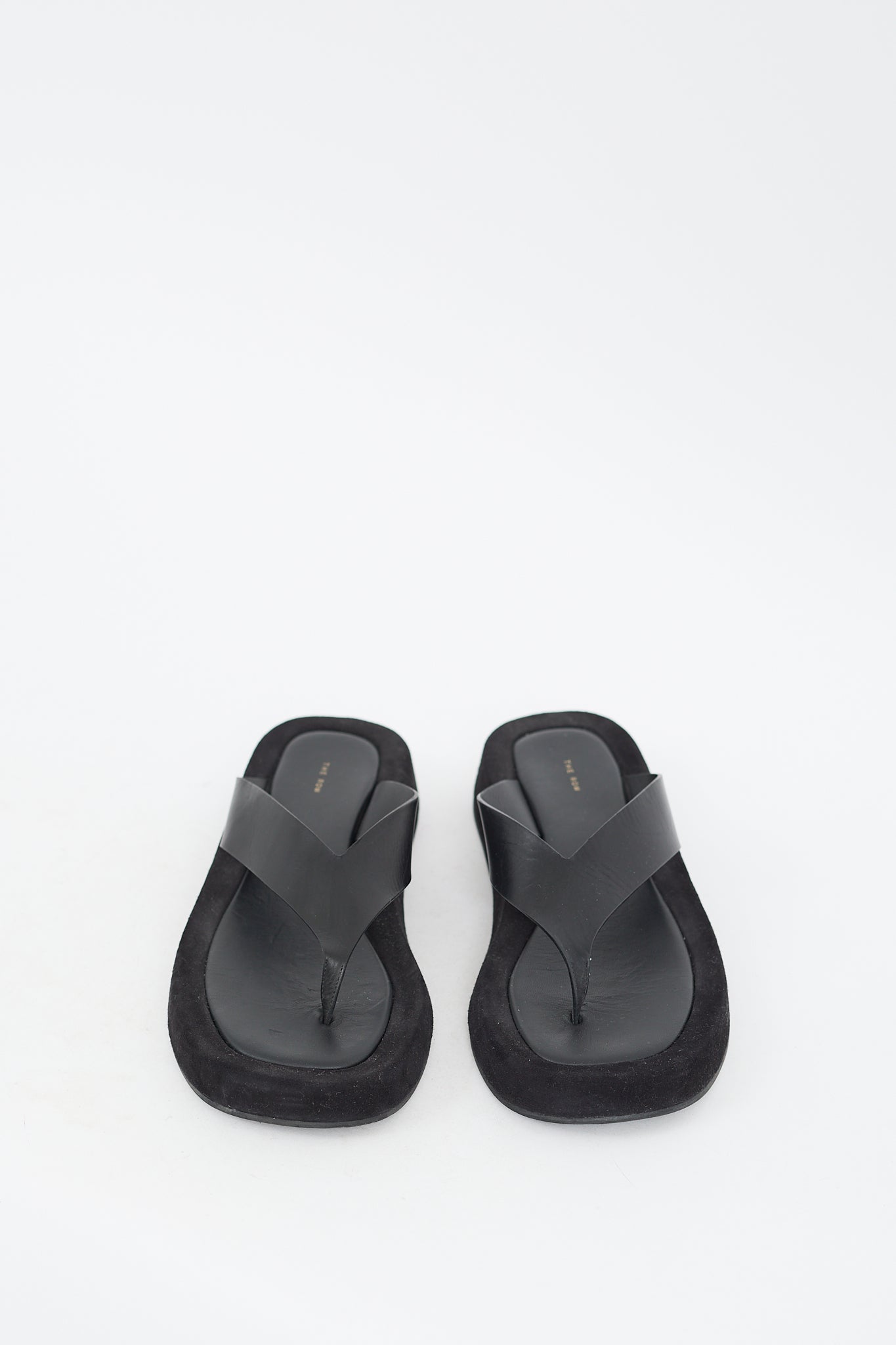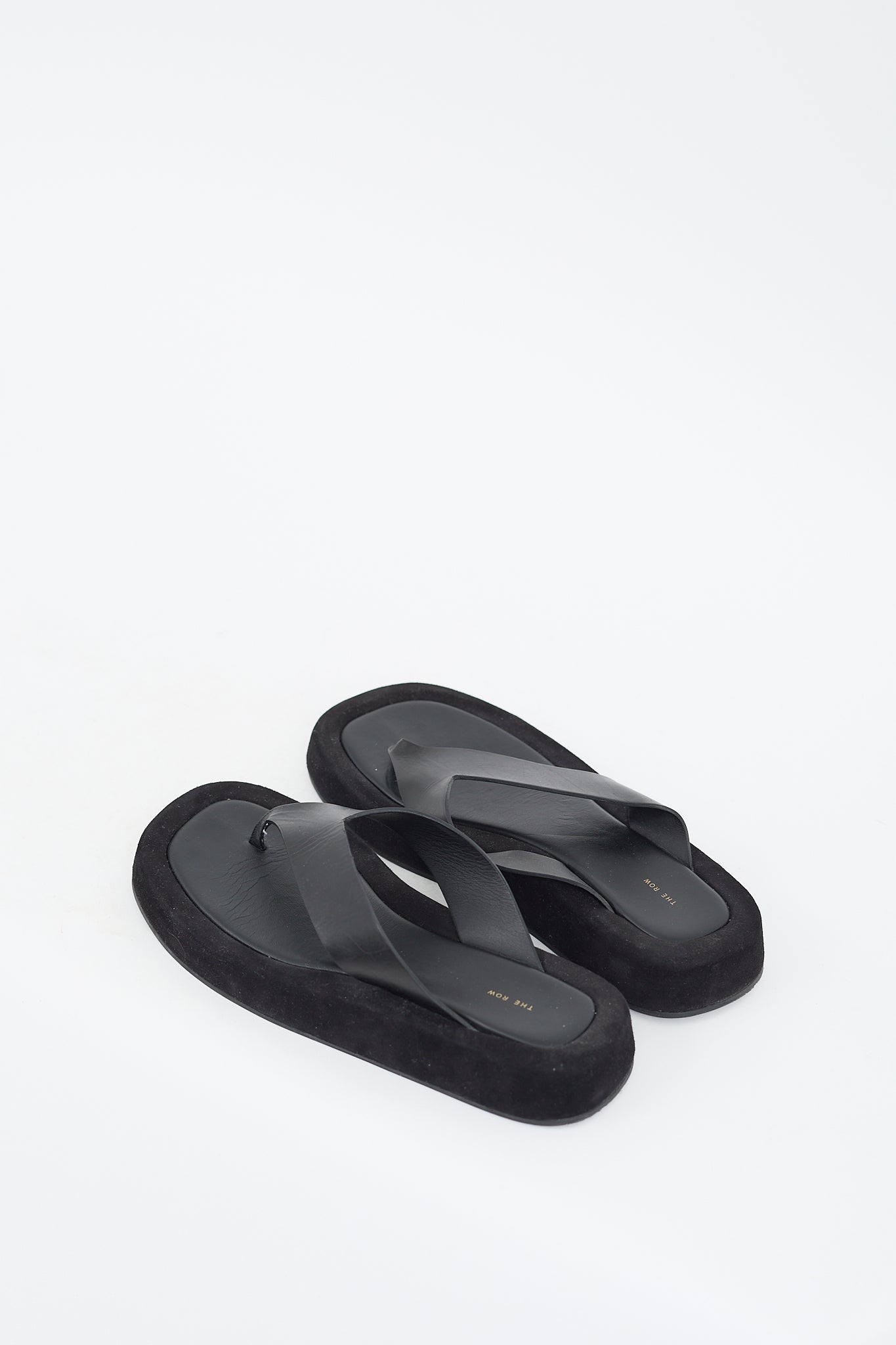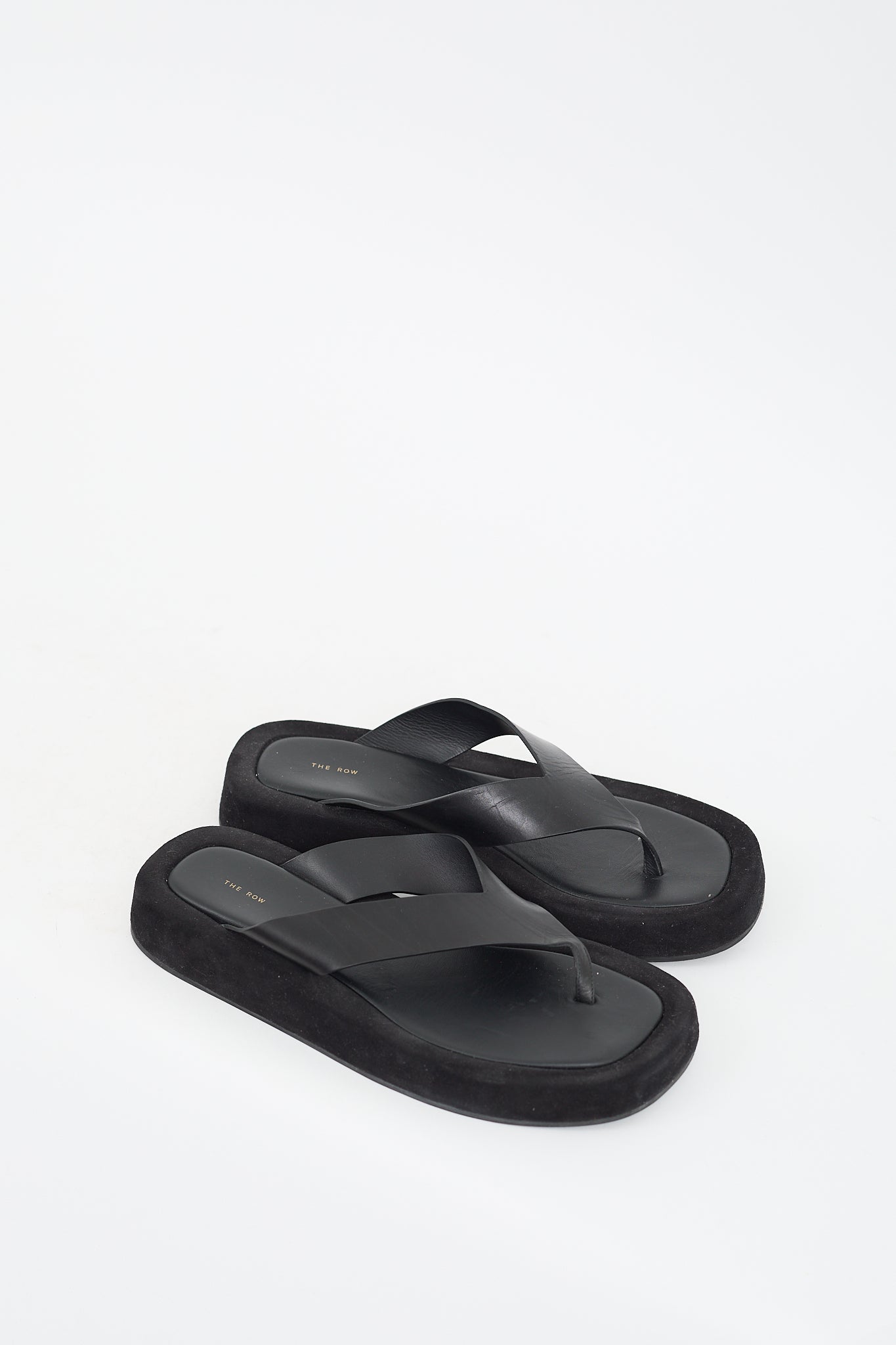 Pre-owned The Row black Ginza sandals featuring an open square toe, leather thong strap, gold stamped logo at insole, suede midsole, and rubber outsole. Comes with original dust bag.