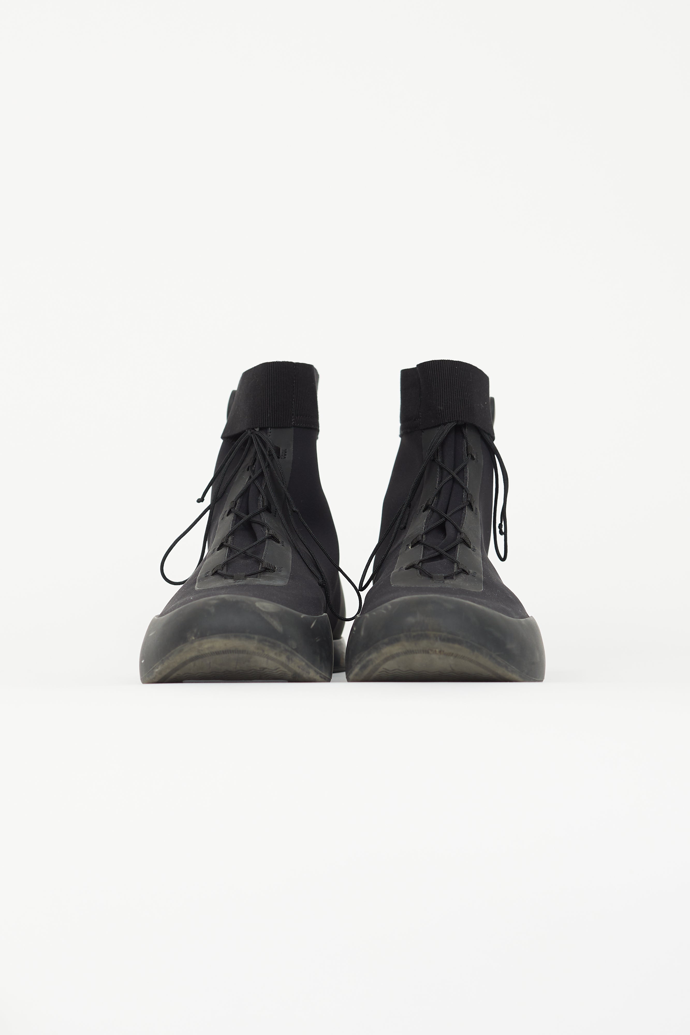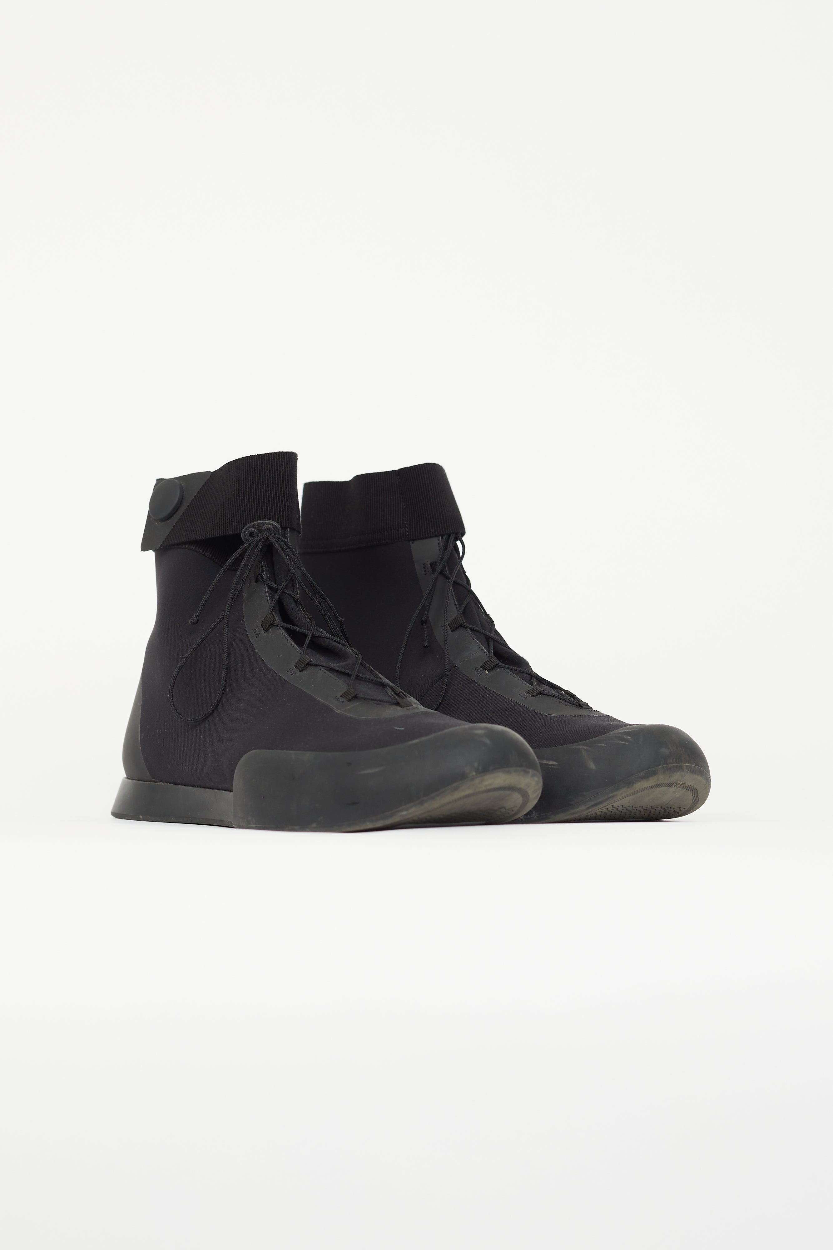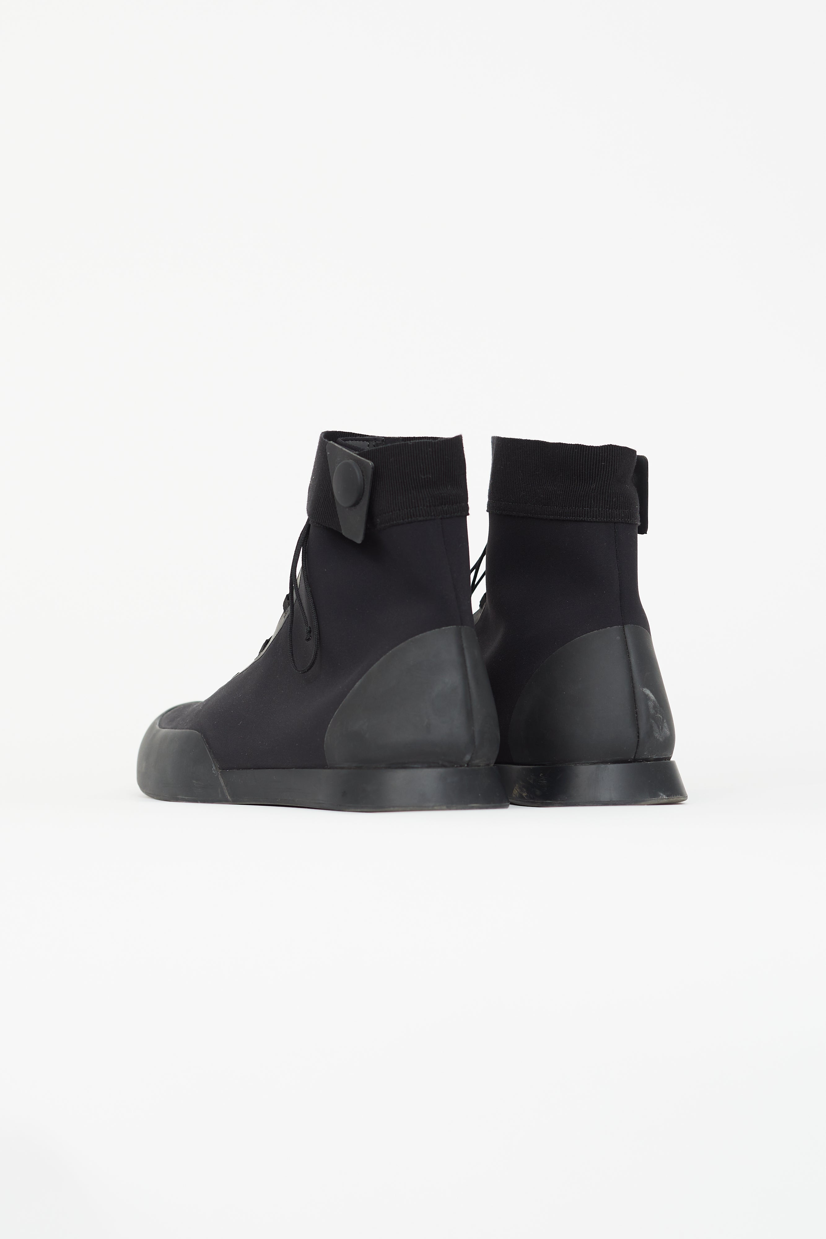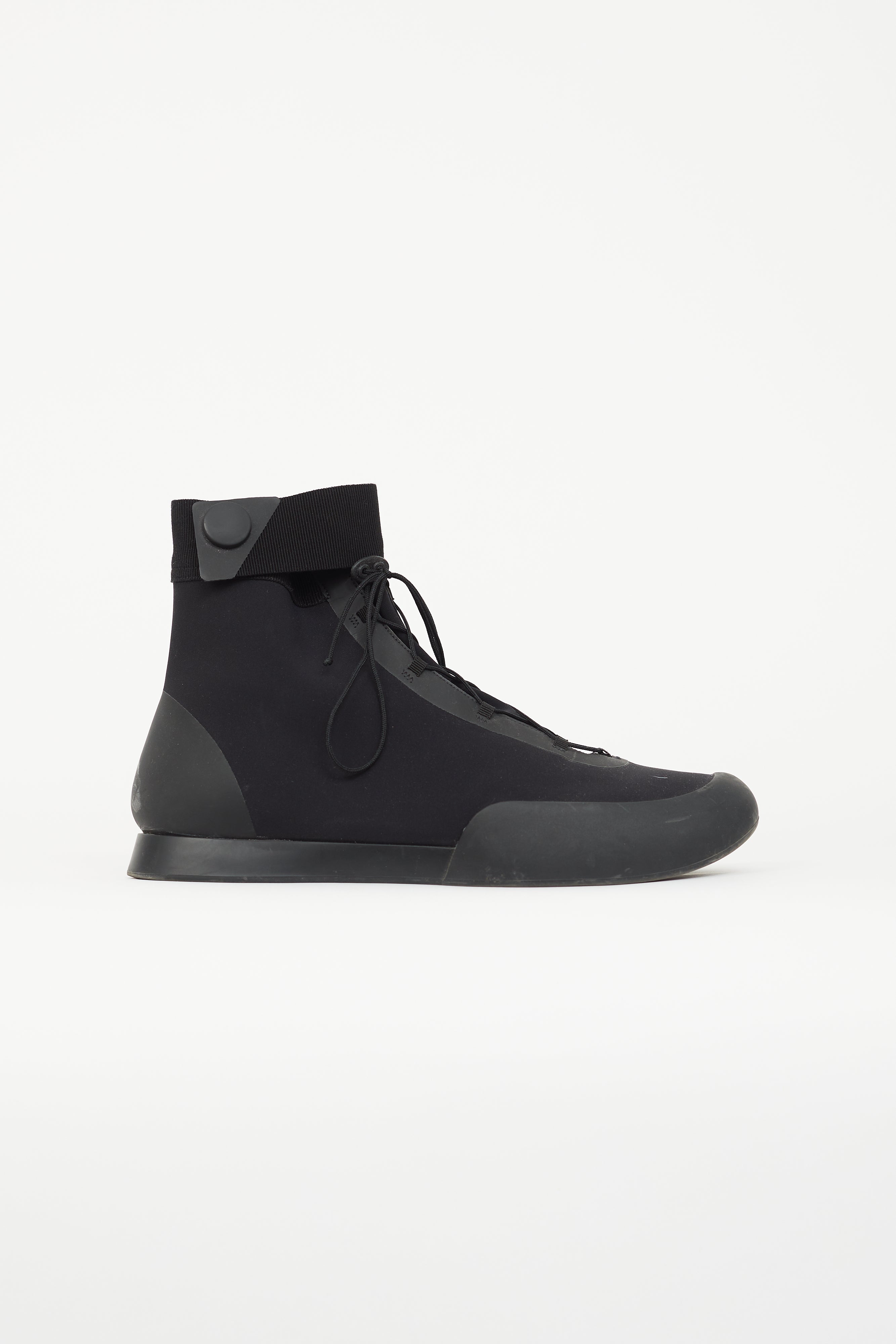 Pre-owned The Row black TR high top sneakers featuring a round cap toe, heel cap, gusseted tongue, ribbed collar, and lace up front with snap button closure.