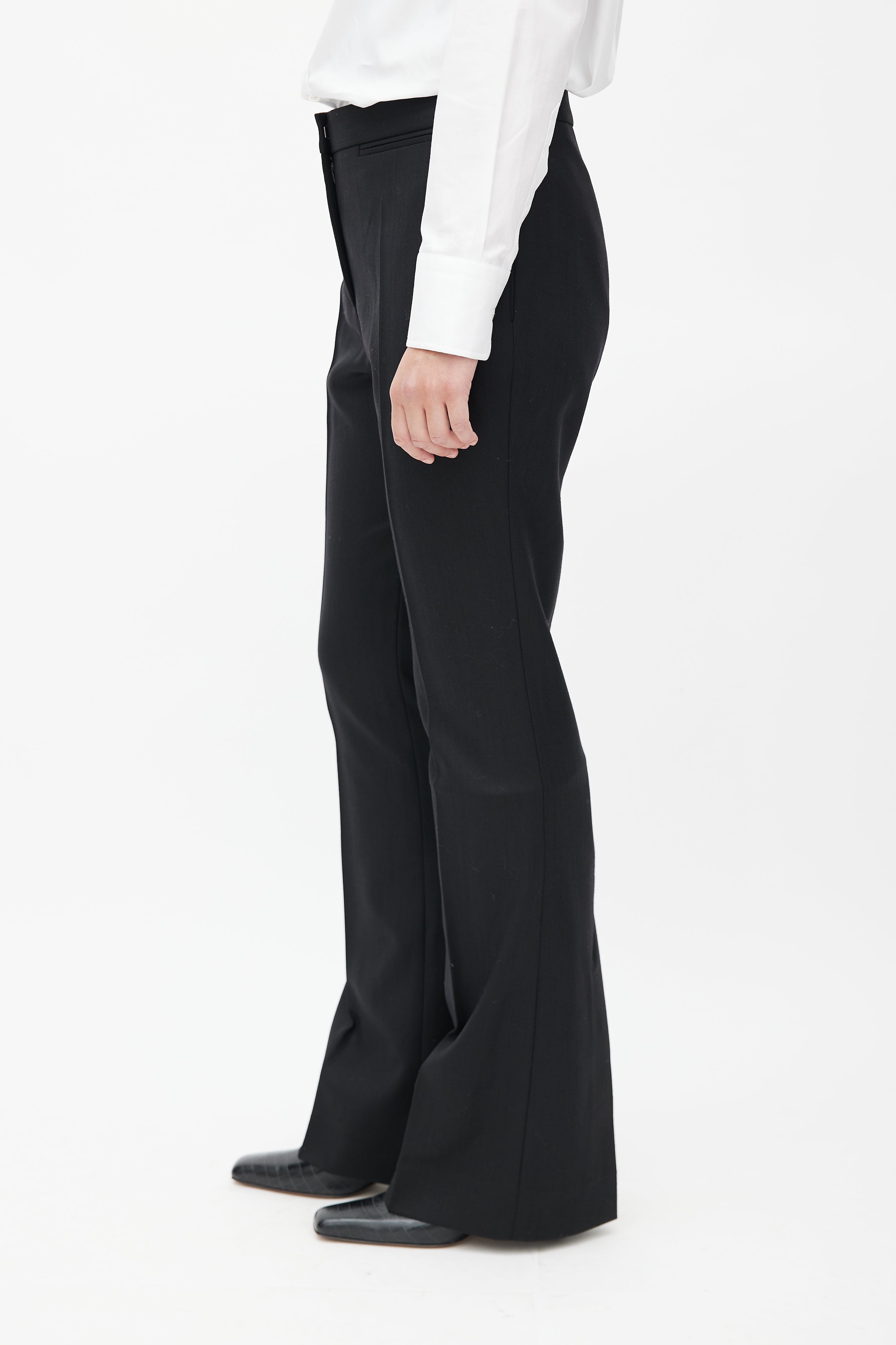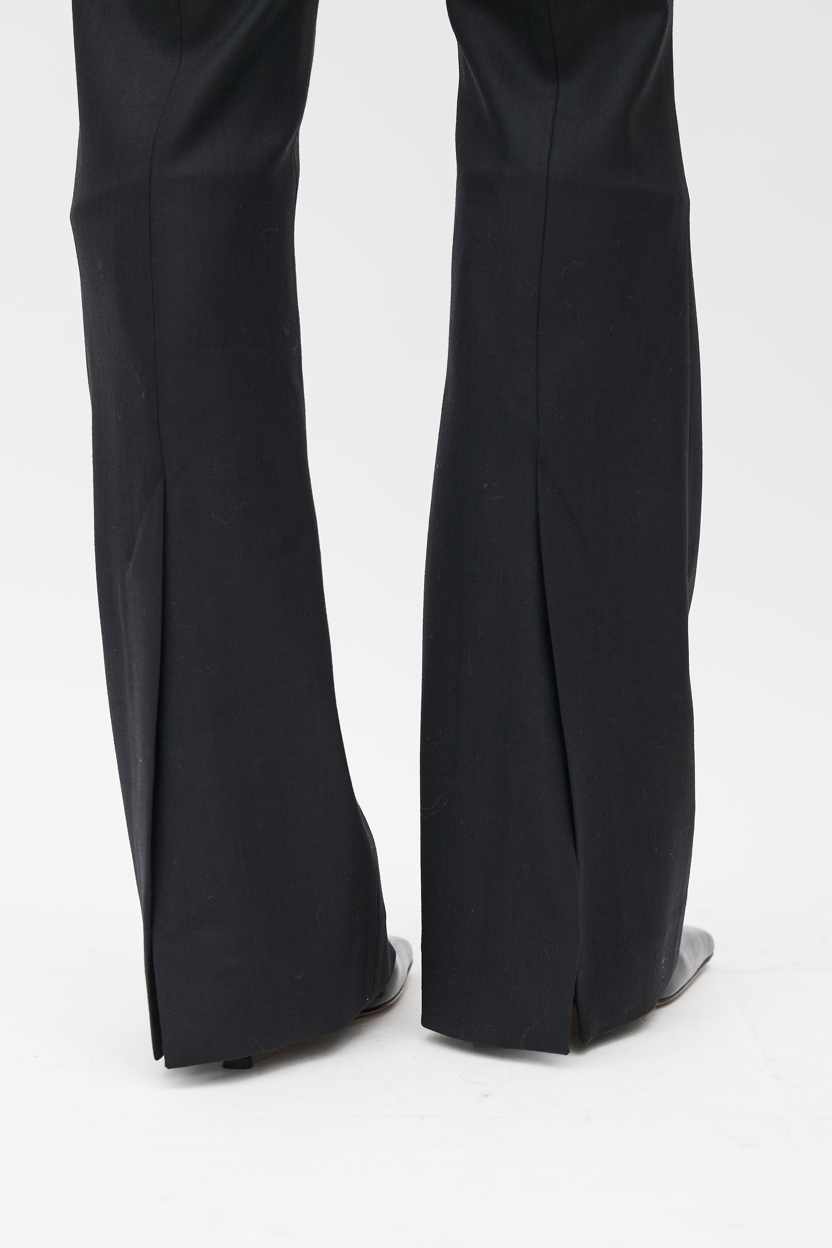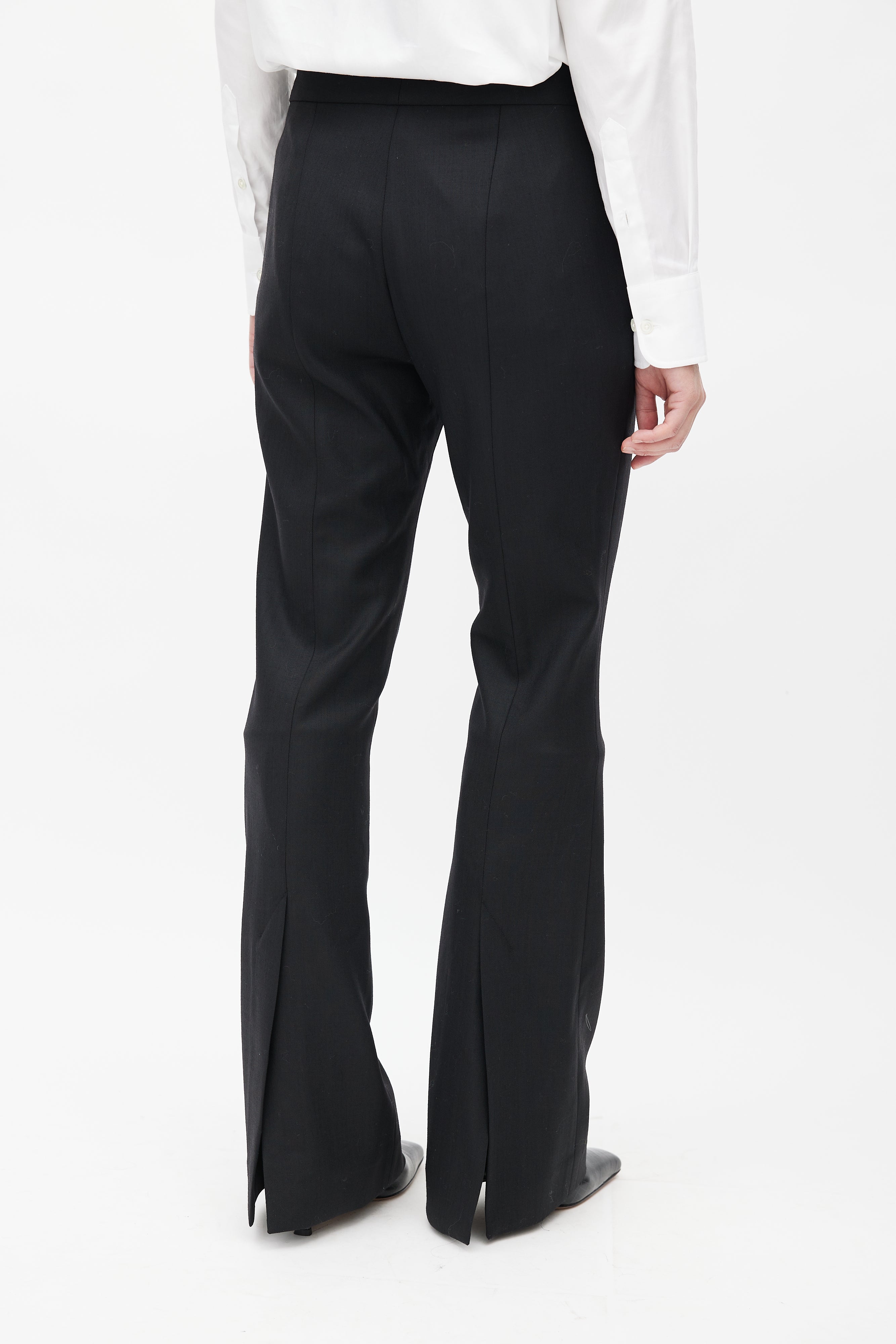 Pre-owned The Row black wool trousers featuring two slip pockets at waist, centre pleat, flared leg, slit at hem, and zip fly with hook and eye closure. Lined.