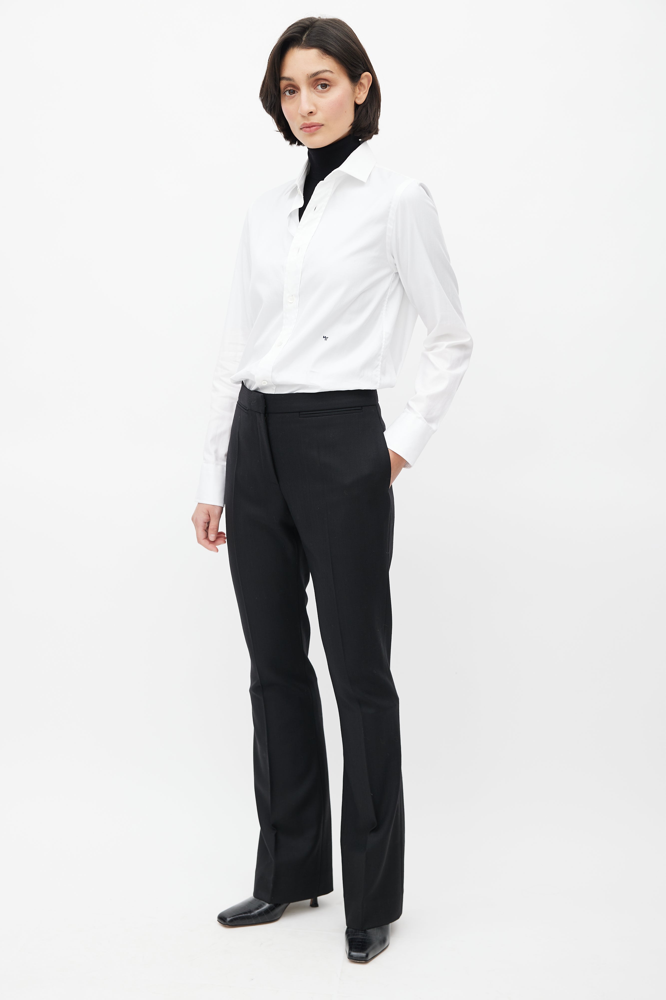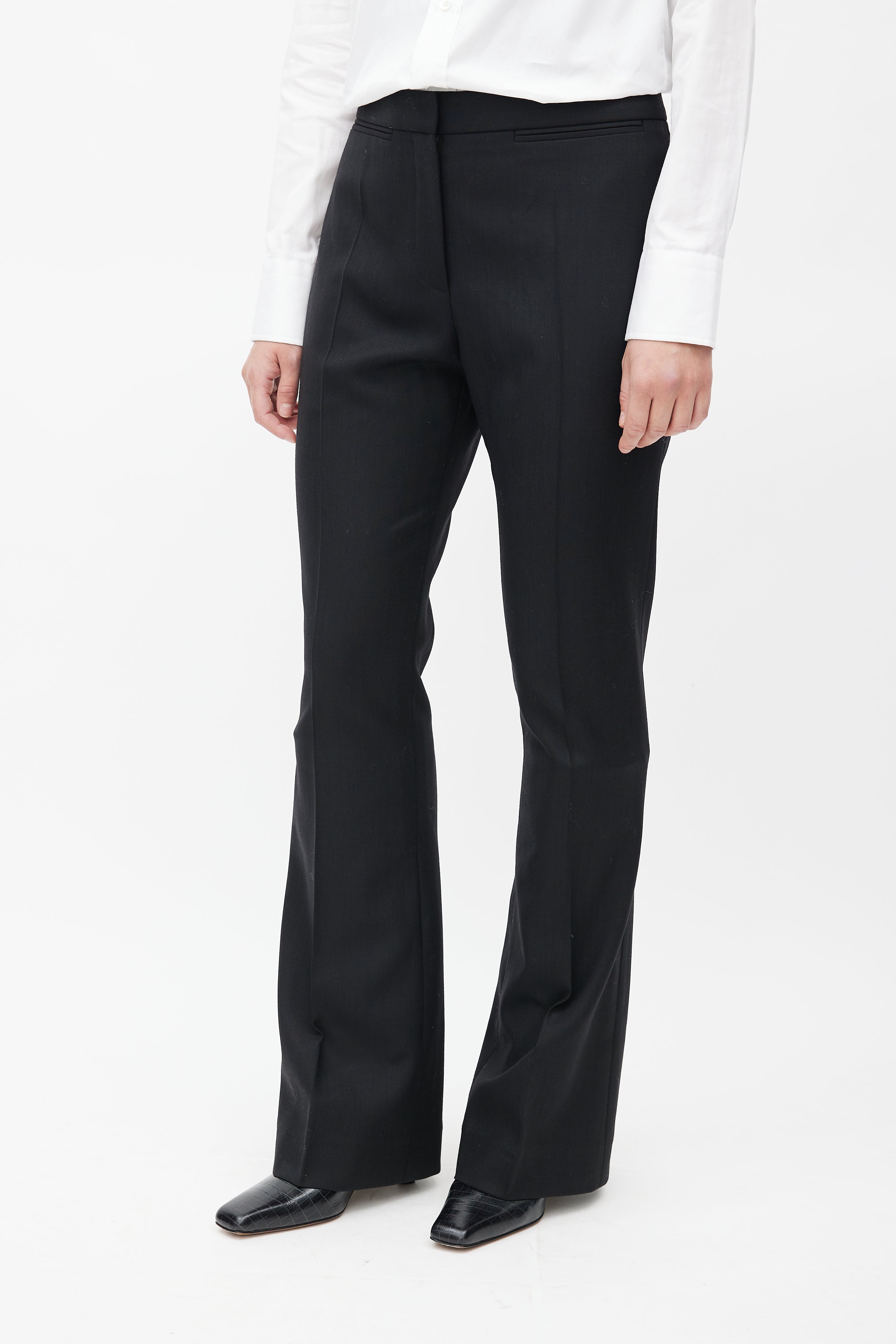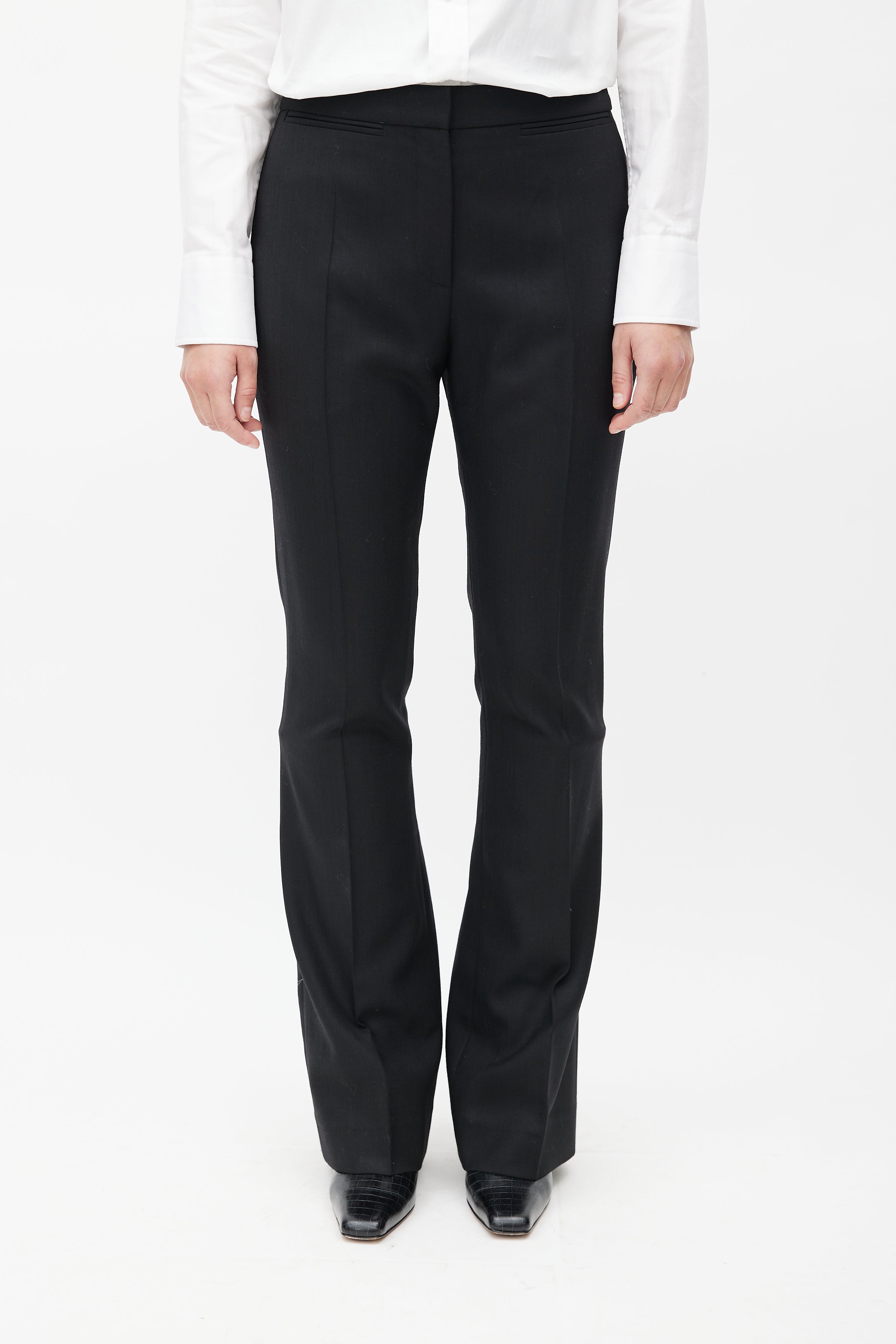 Pre-owned The Row black wool trousers featuring two slip pockets at waist, centre pleat, flared leg, slit at hem, and zip fly with hook and eye closure. Lined.