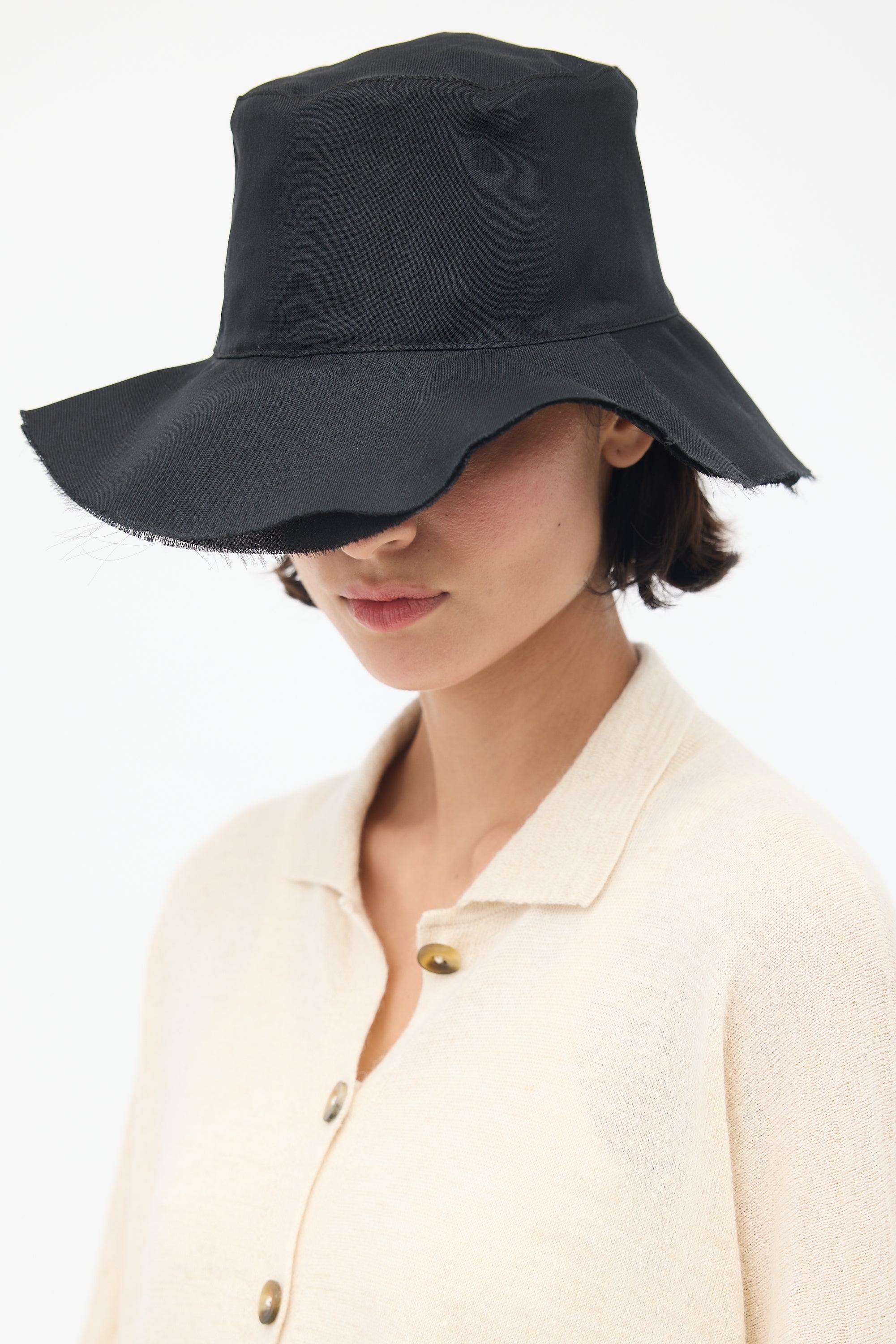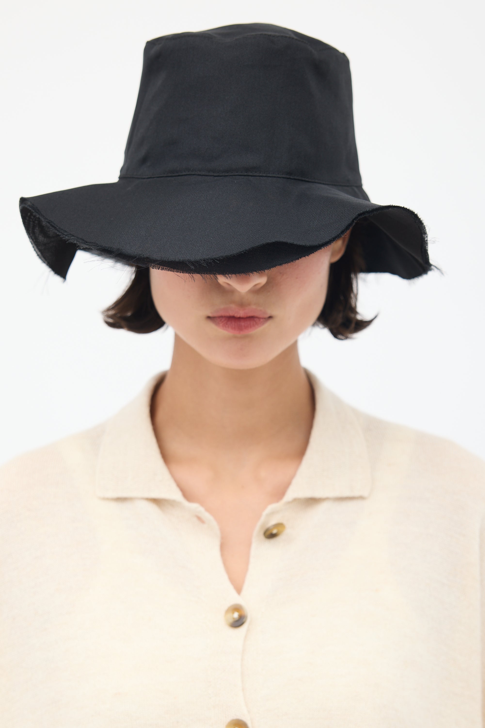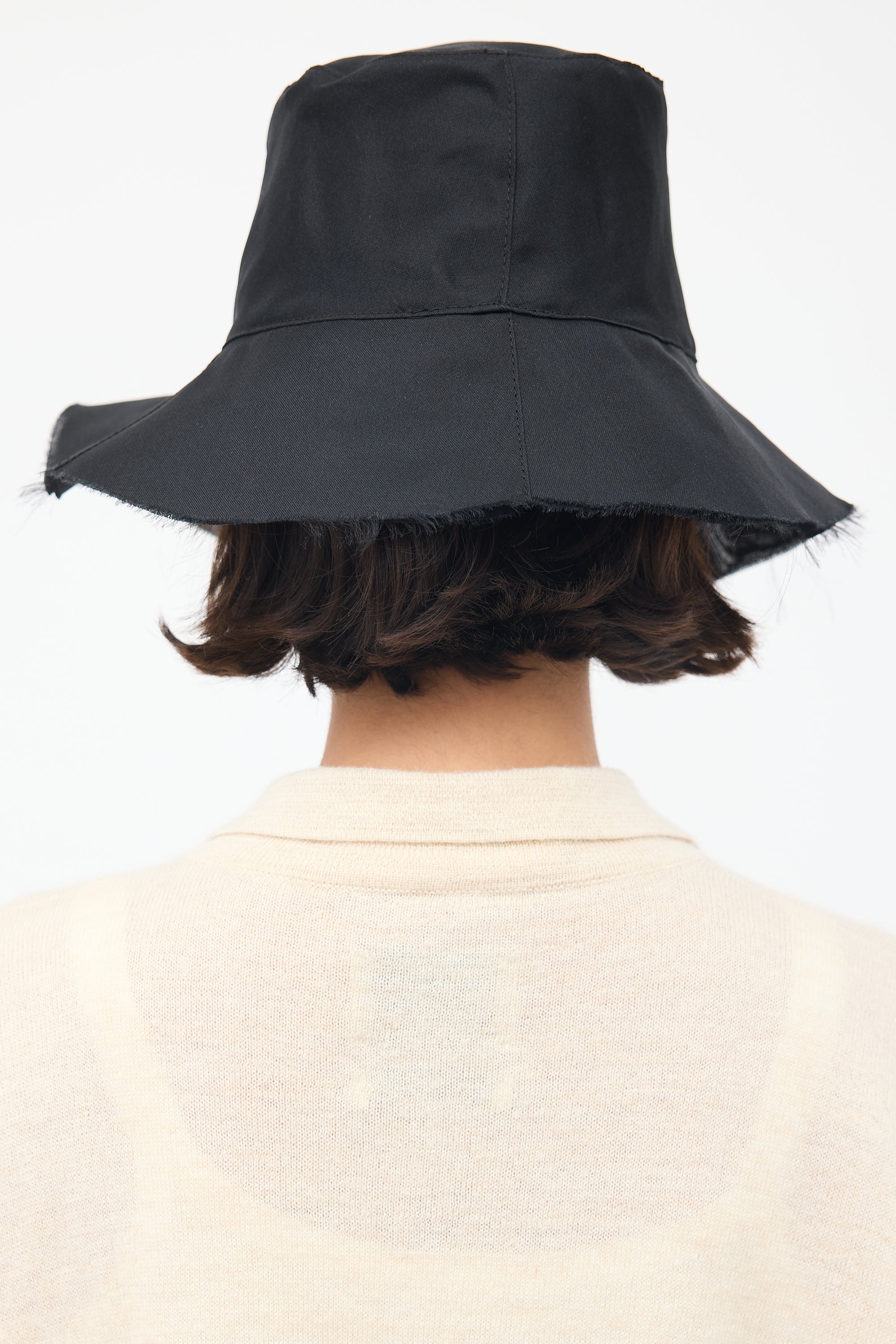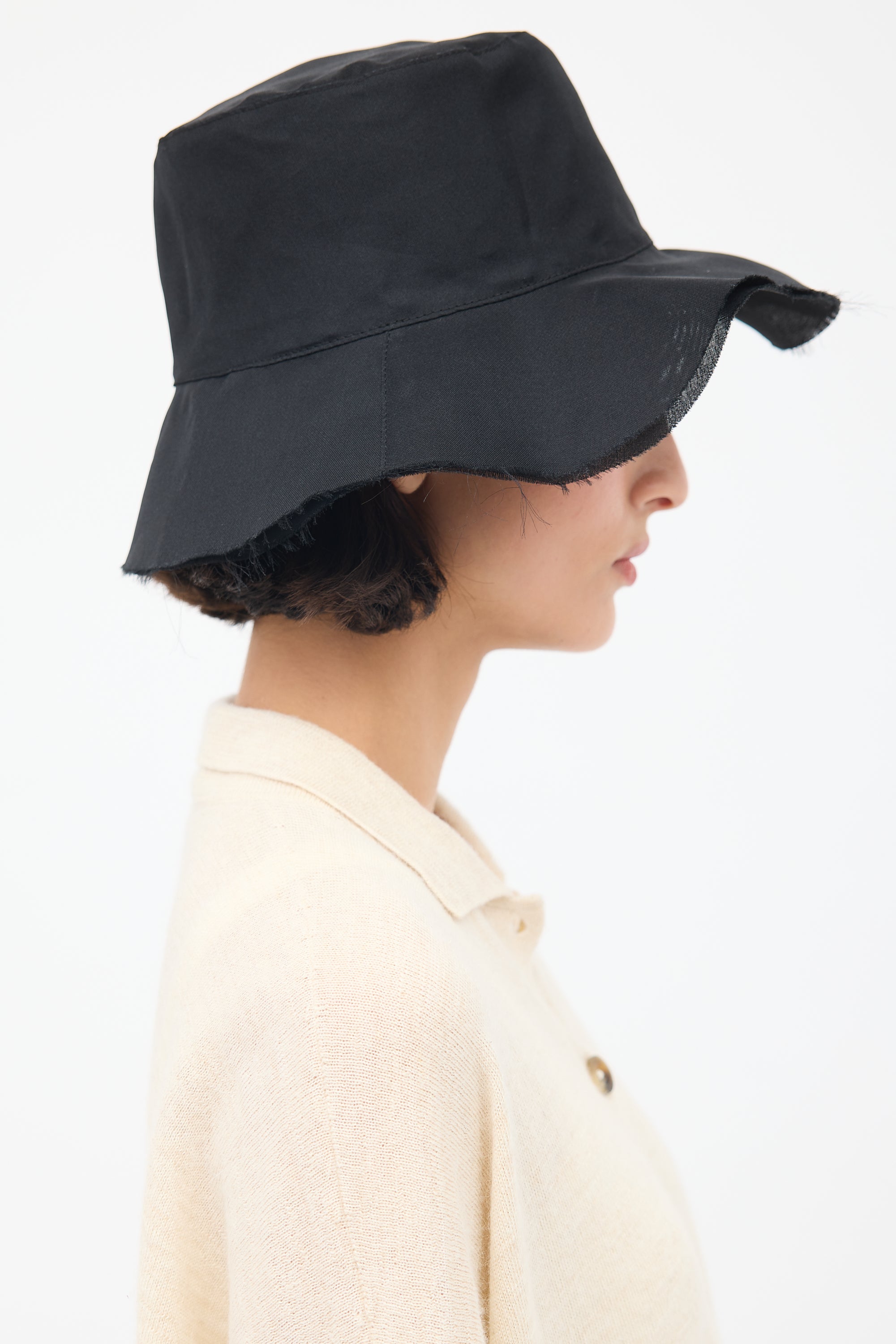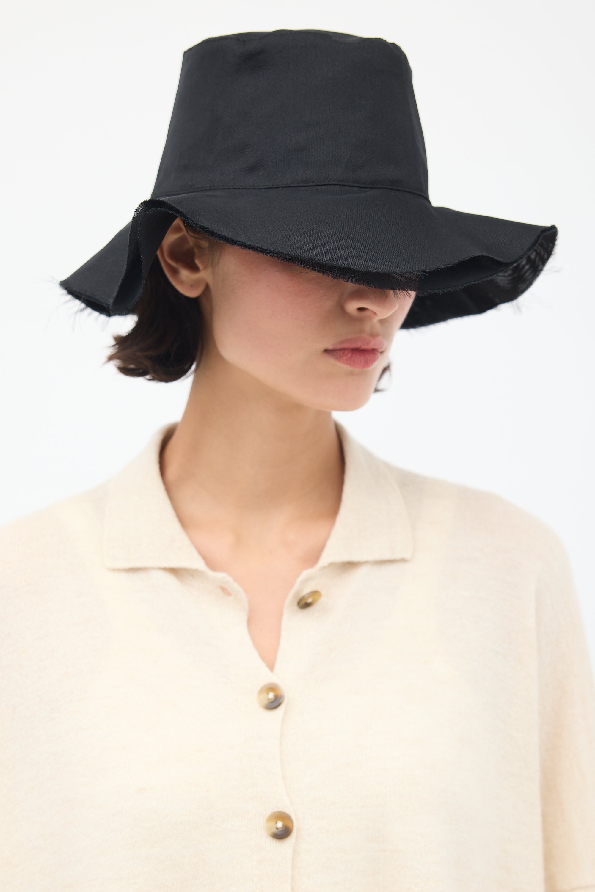Pre-owned The Row black silk Sofia bucket hat featuring double layer, tonal stitching, and raw hem.