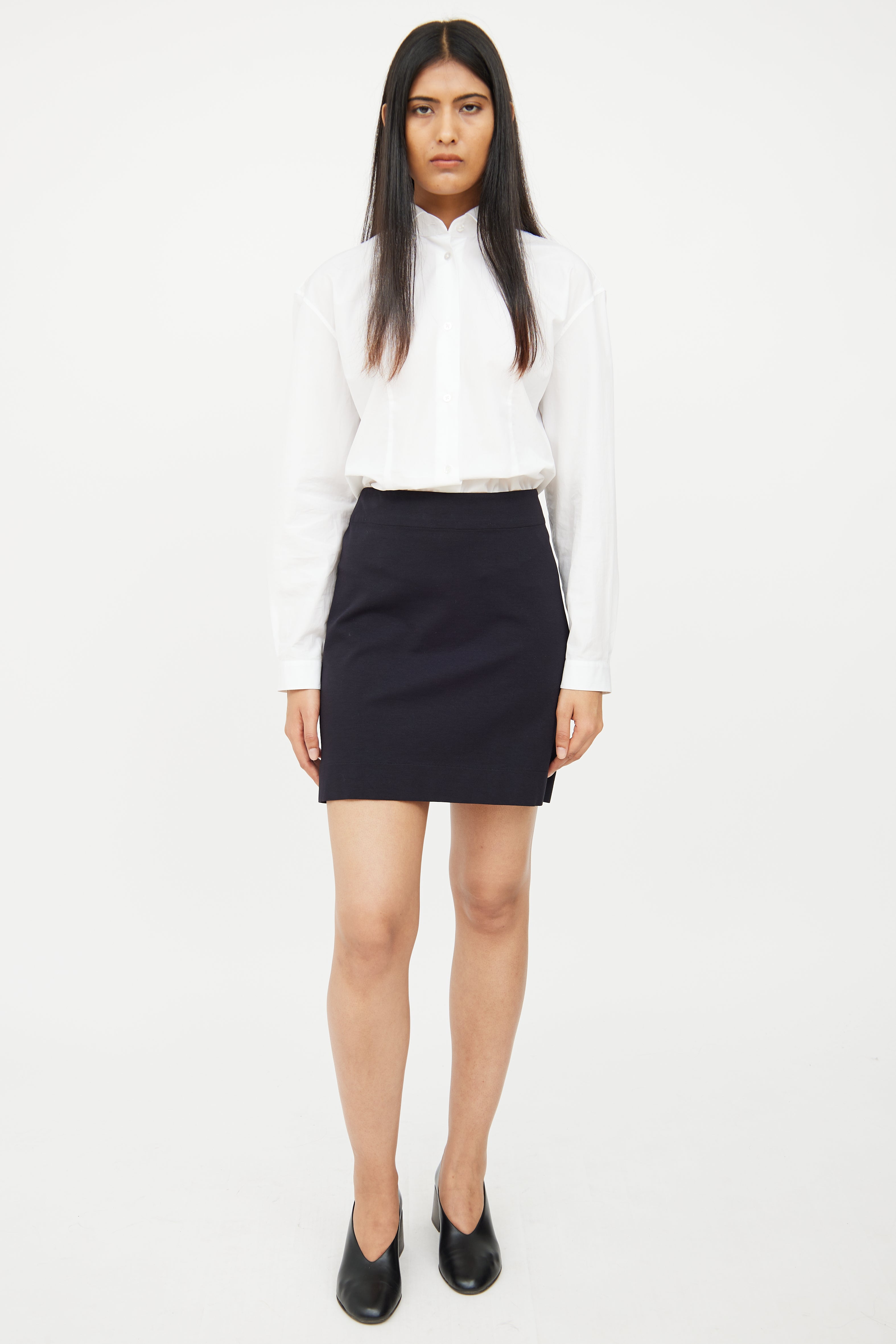 Pre-owned The Row black skirt featuring minimal styling, darted back, and dual zip closures at waist. Clipped to fit model.