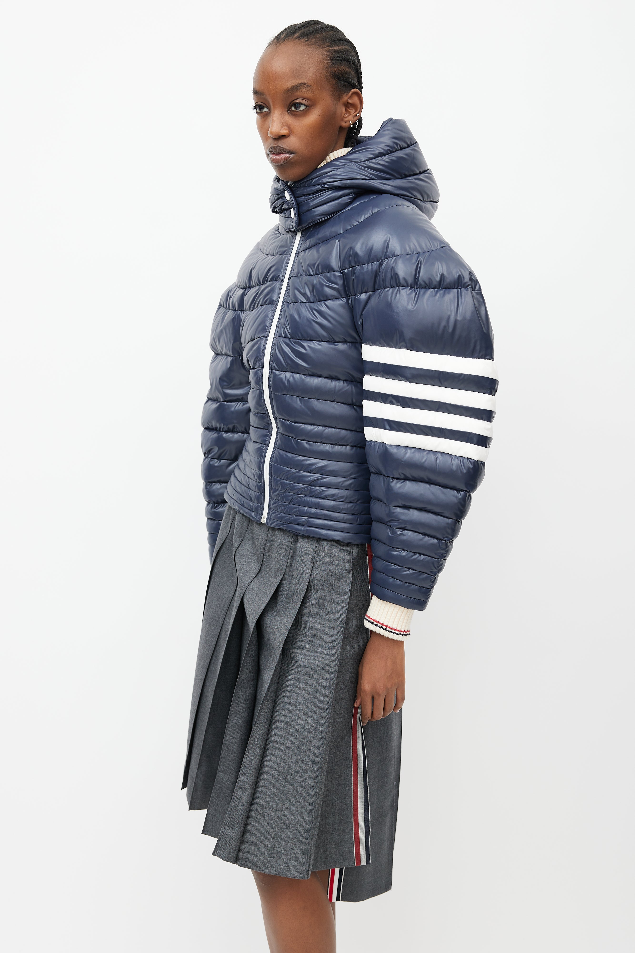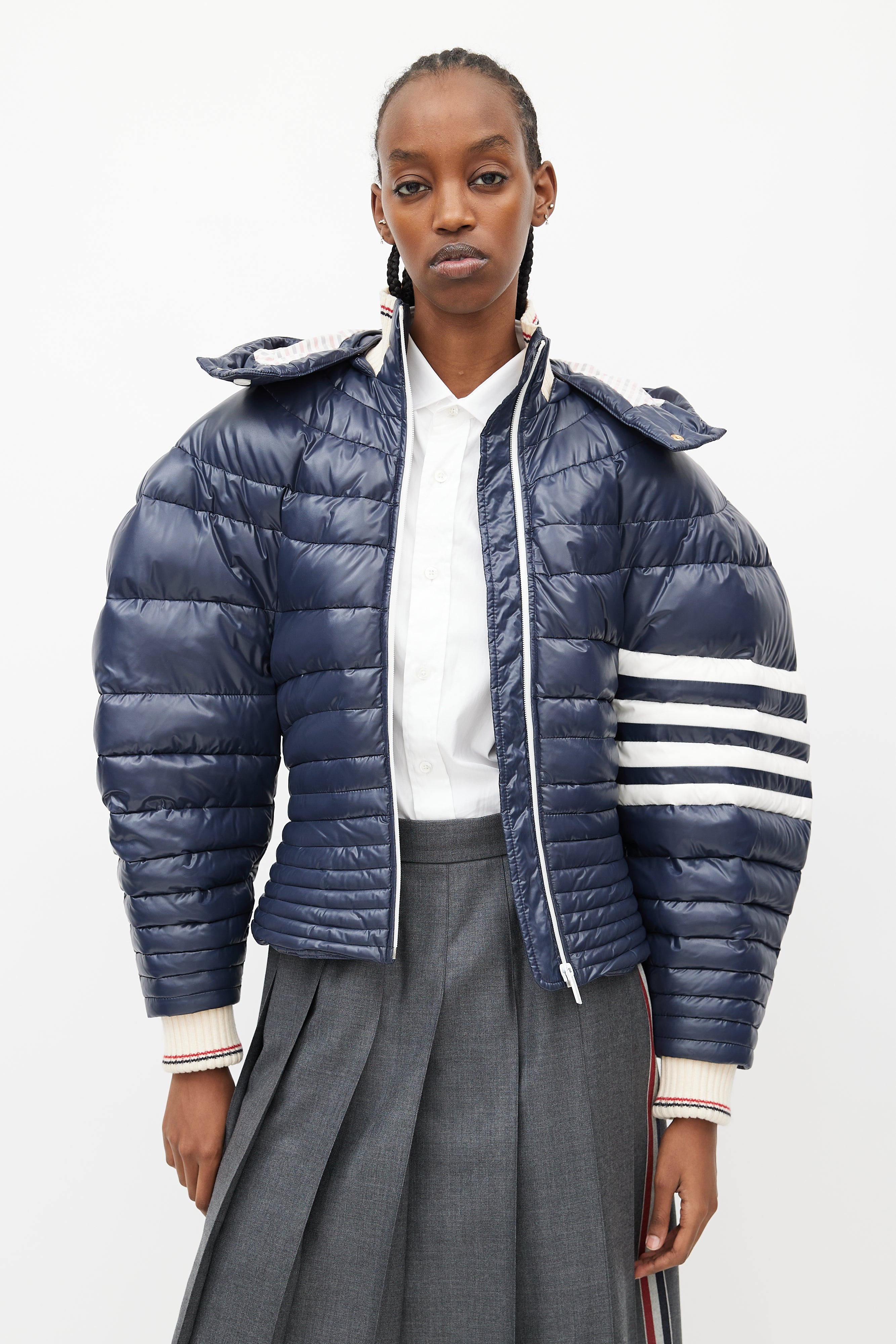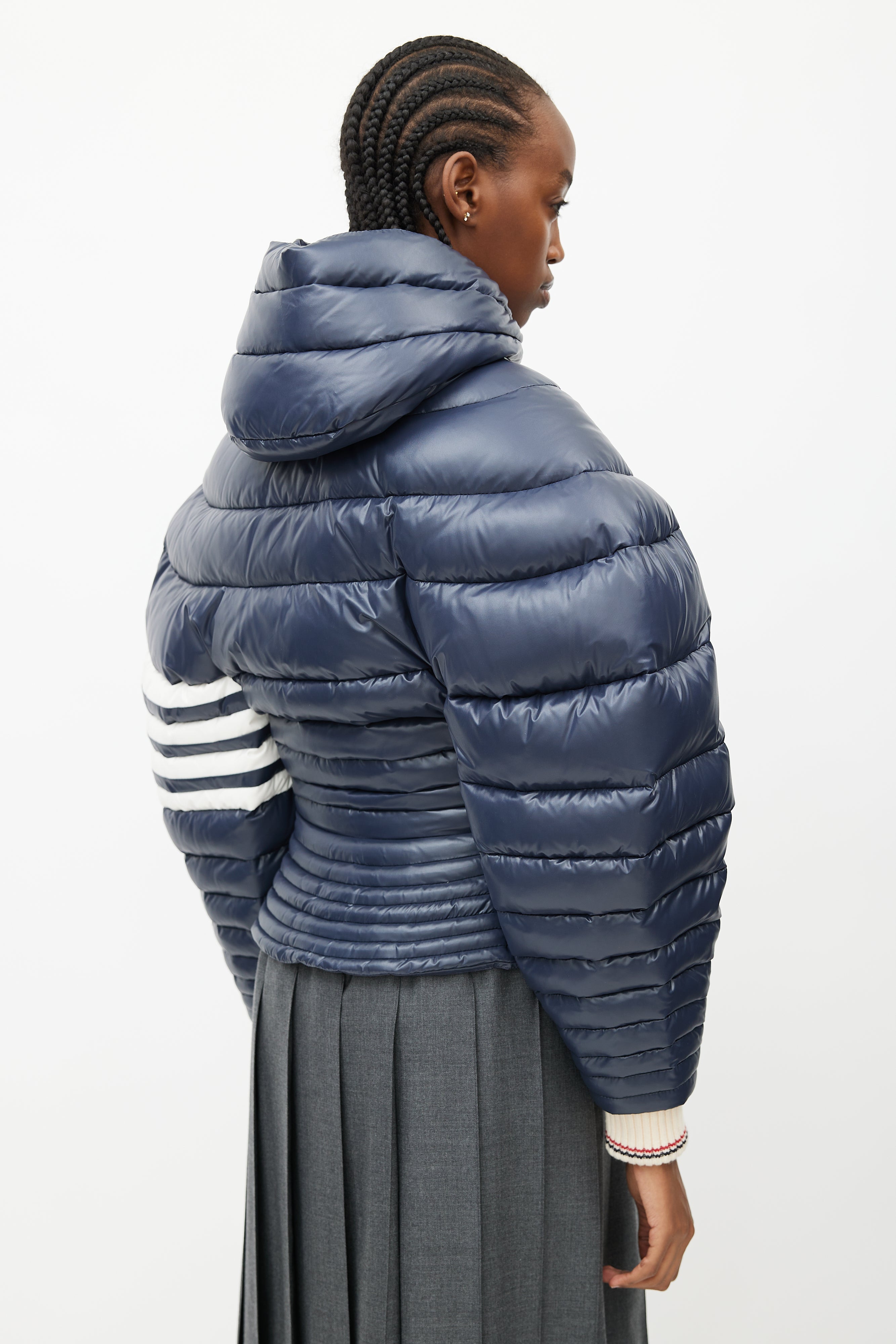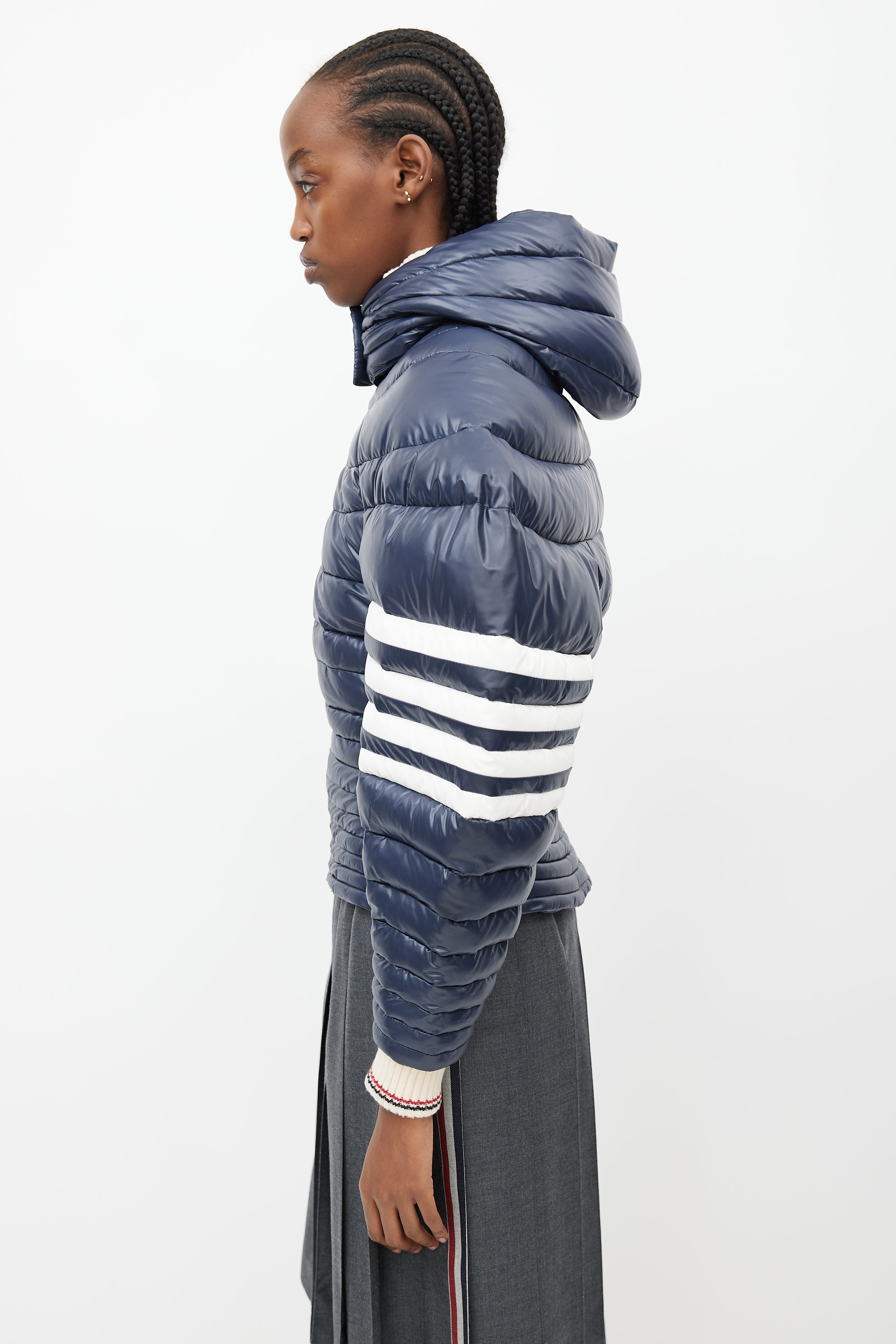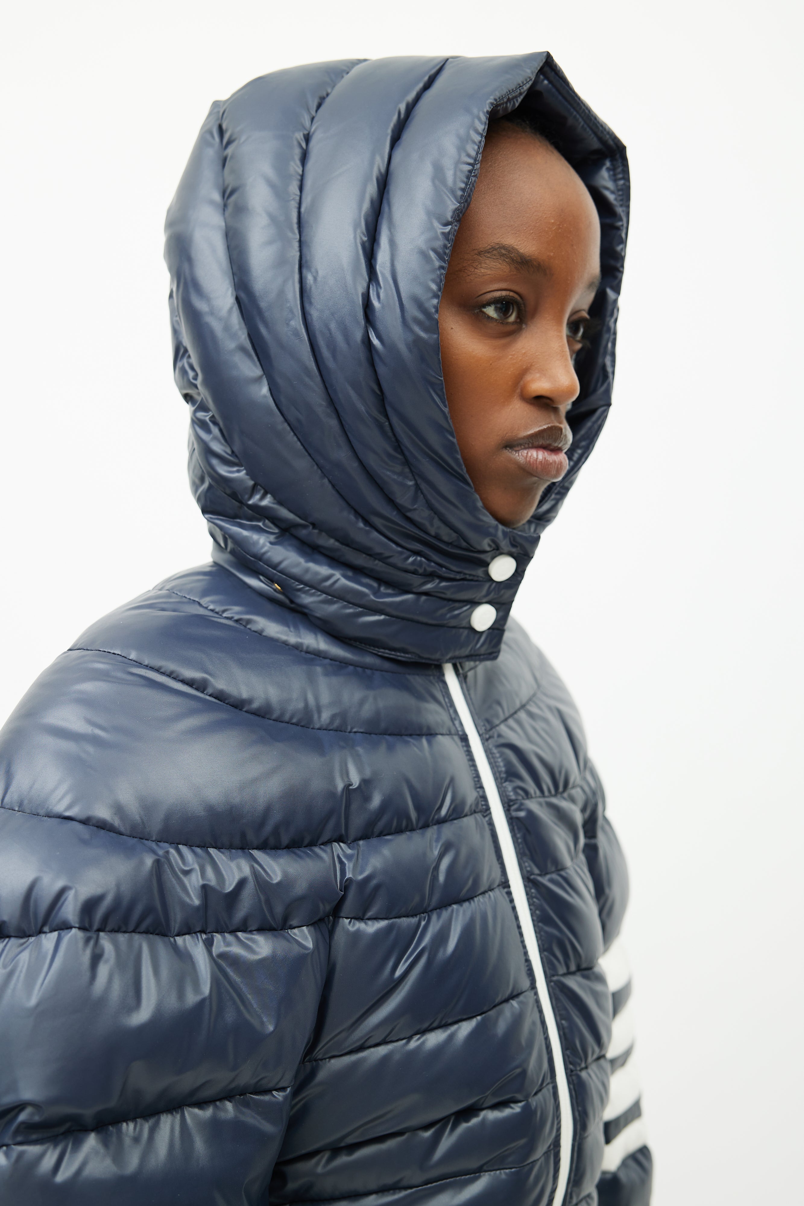 Pre-owned Thom Browne navy down jacket featuring zip up front, detachable hood, four white stripes at left sleeve, ribbed knit cuffs and collar, puffed sleeves, and fitted waist.