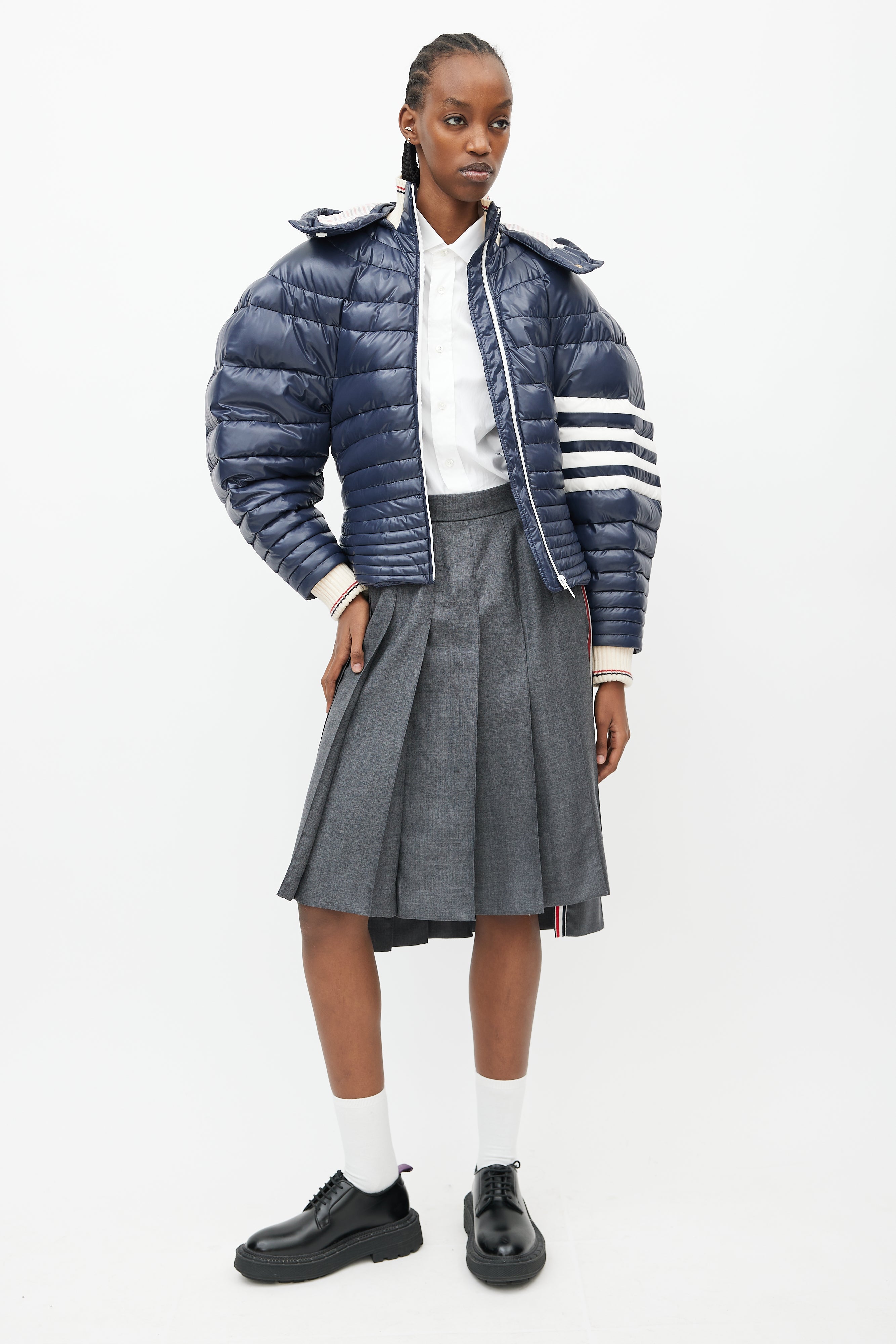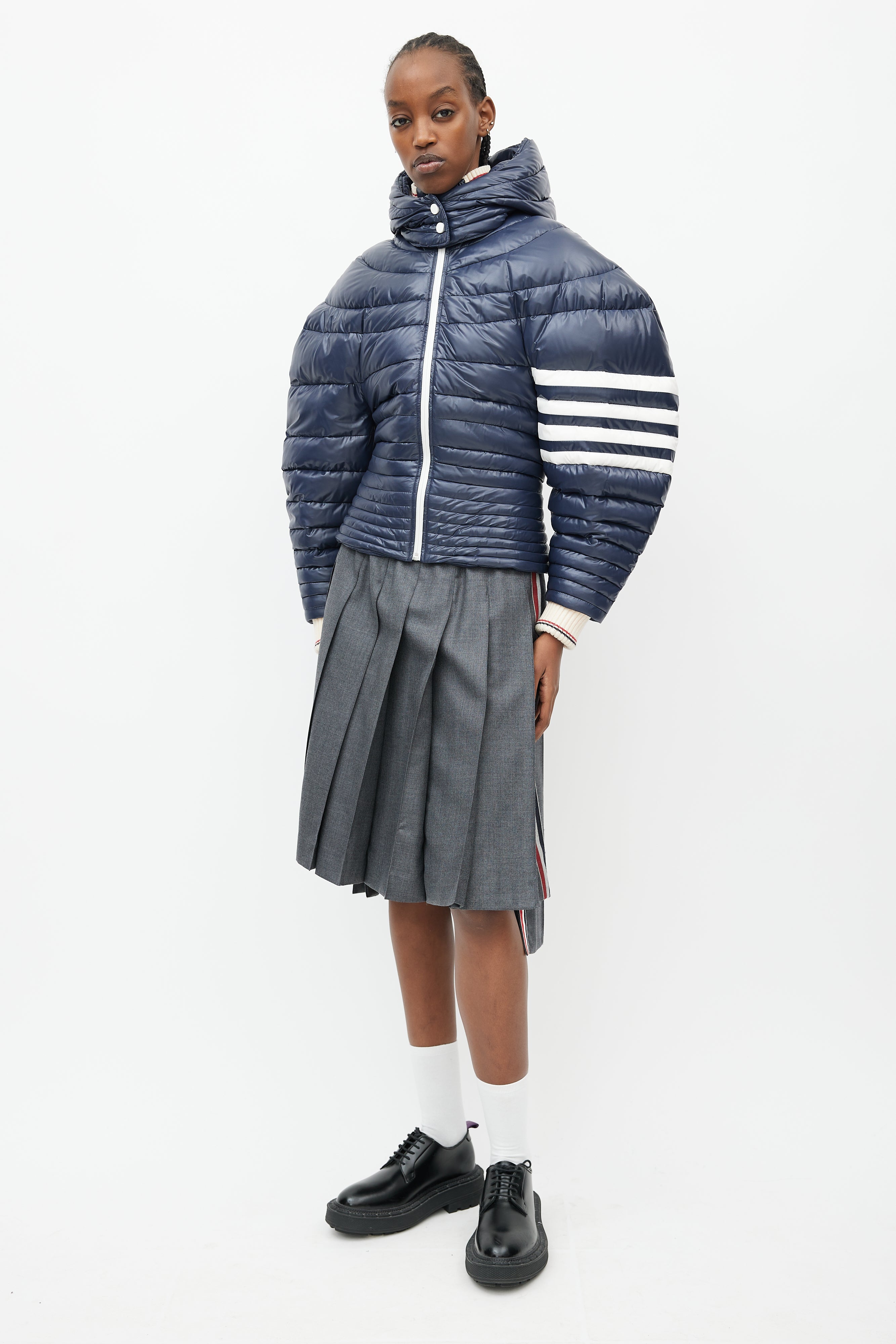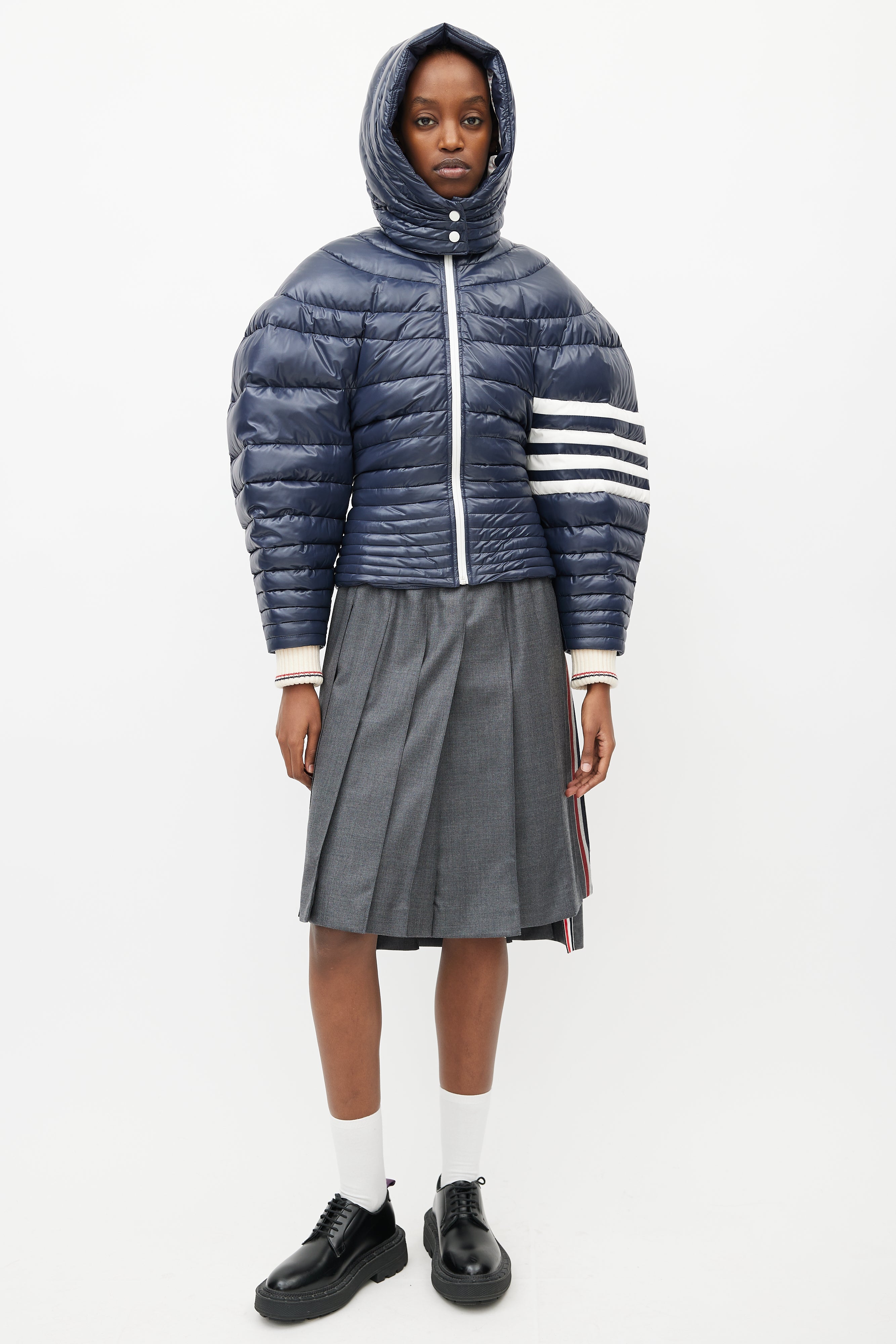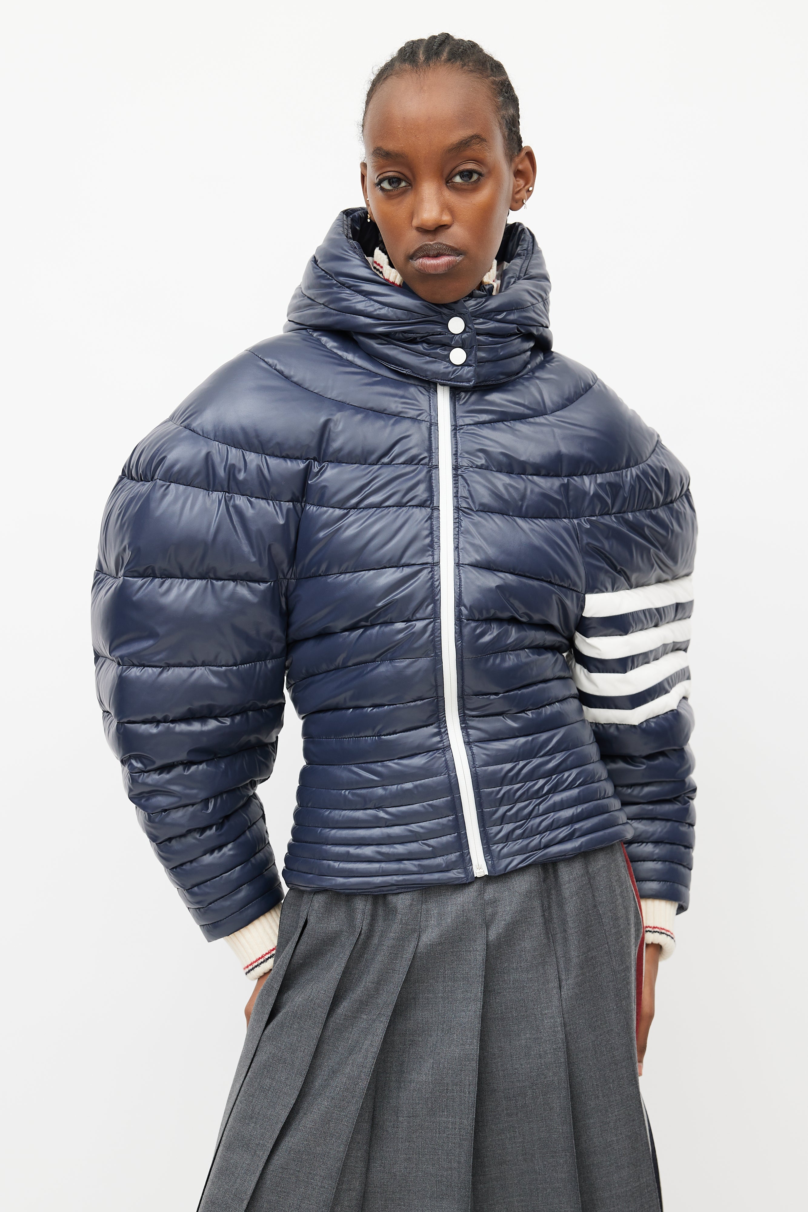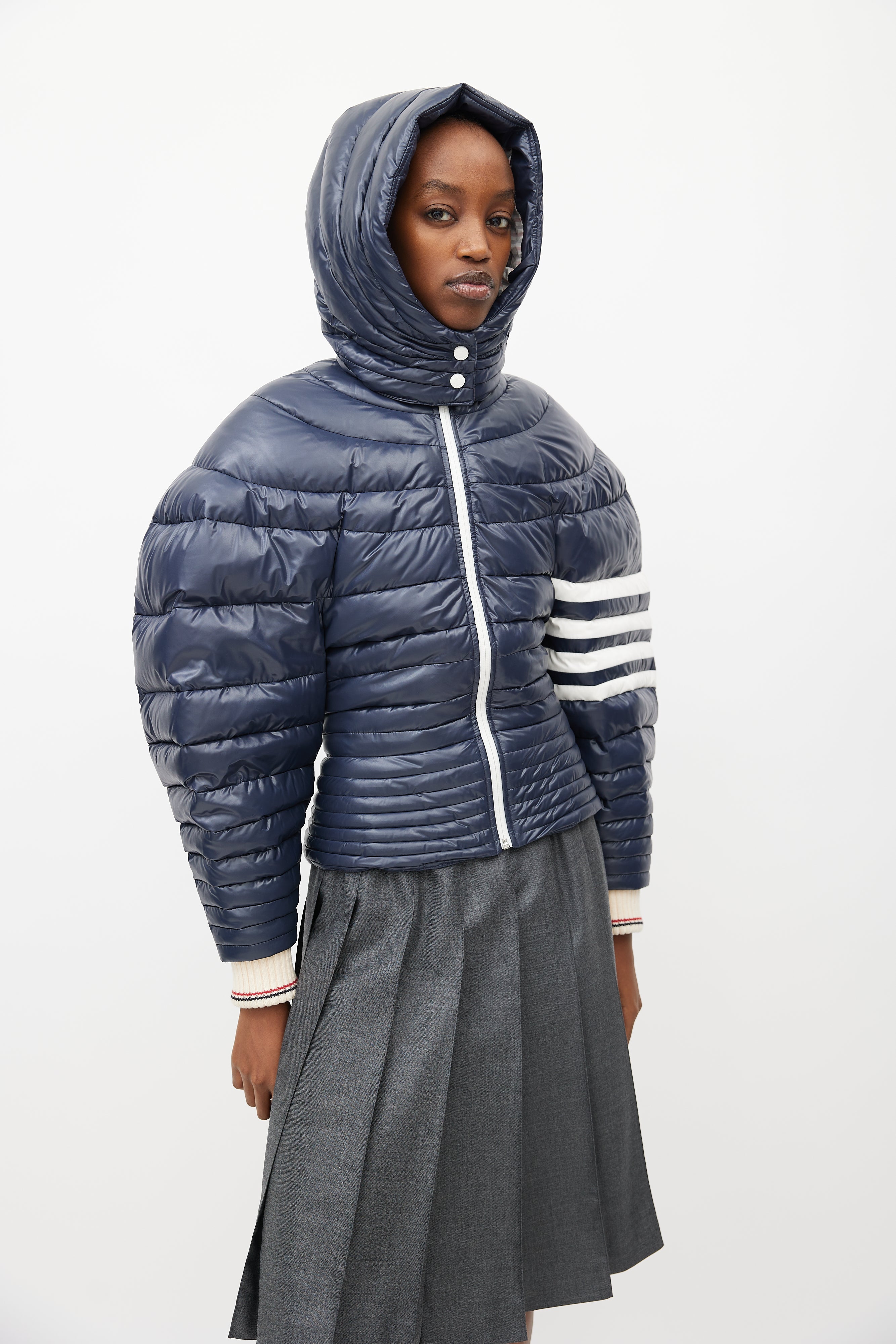 Pre-owned Thom Browne navy down jacket featuring zip up front, detachable hood, four white stripes at left sleeve, ribbed knit cuffs and collar, puffed sleeves, and fitted waist.