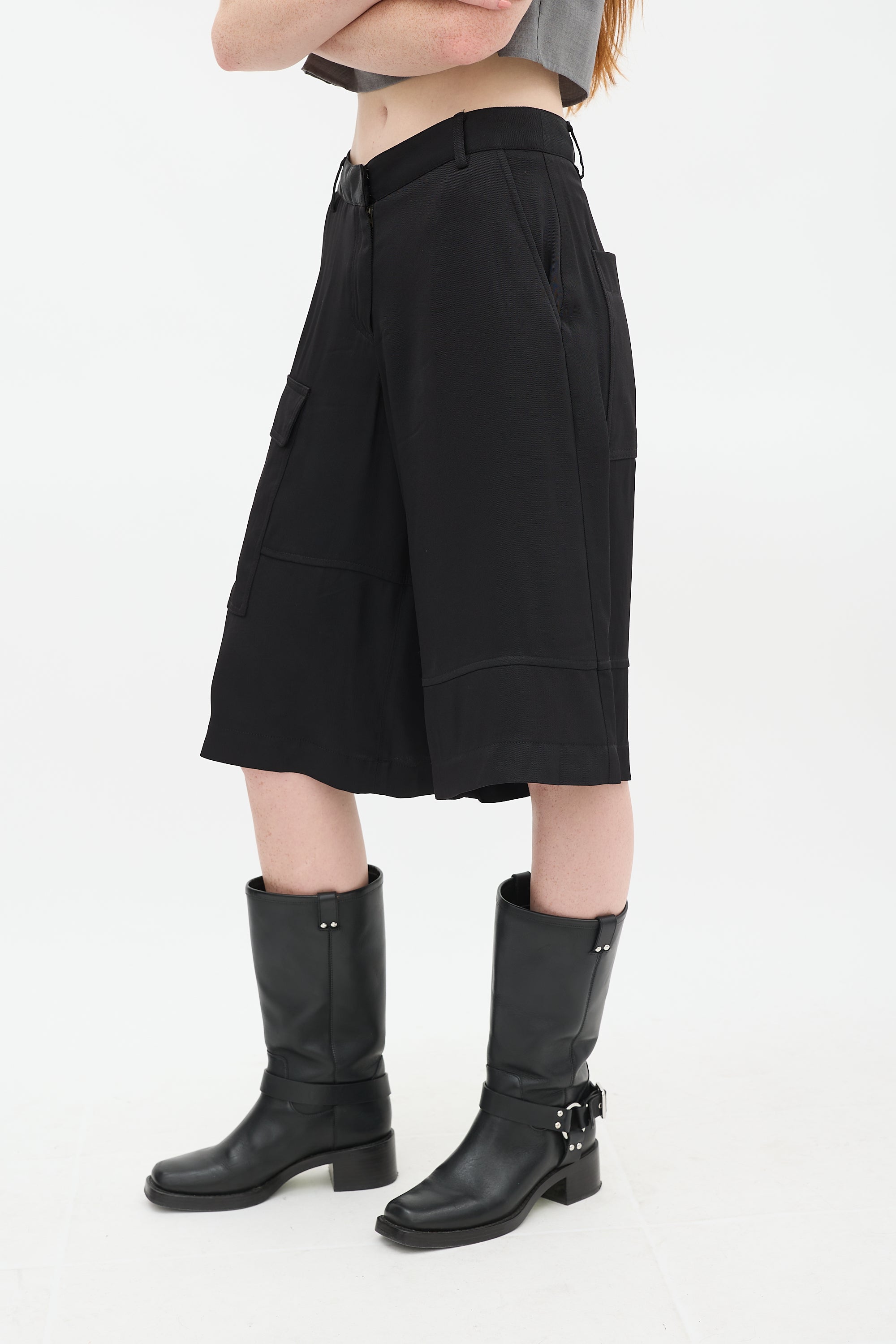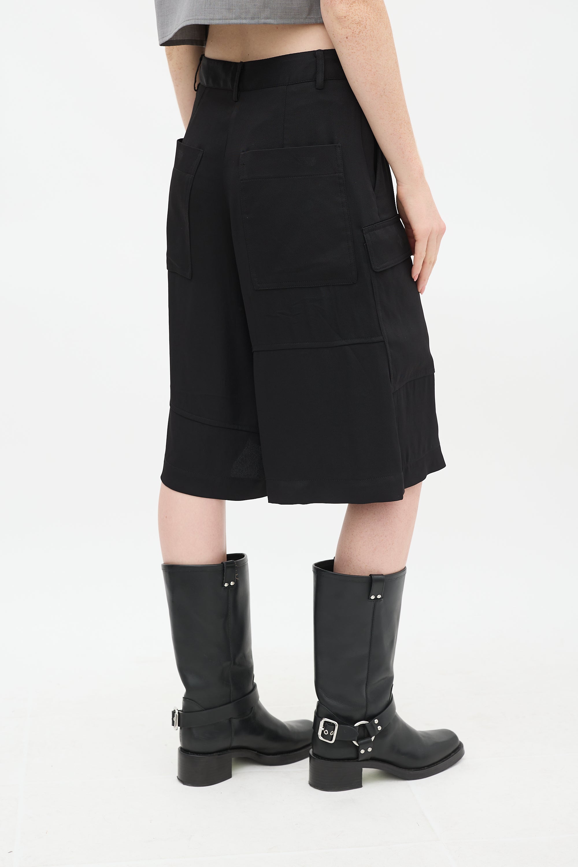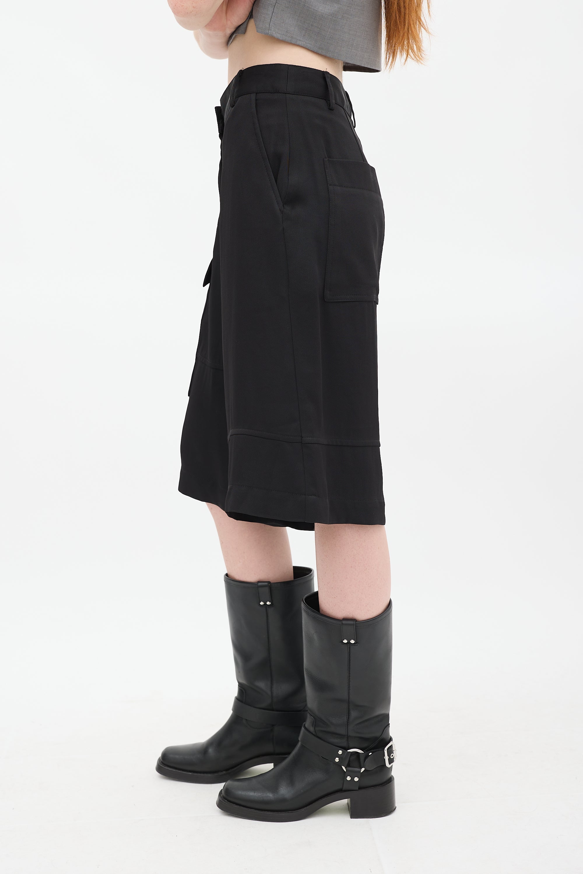 Pre-owned Tibi black Eco bermuda shorts featuring belt loops, zip fly, one cargo pocket at right leg, two slash pockets at hips, and two patch pockets at back.