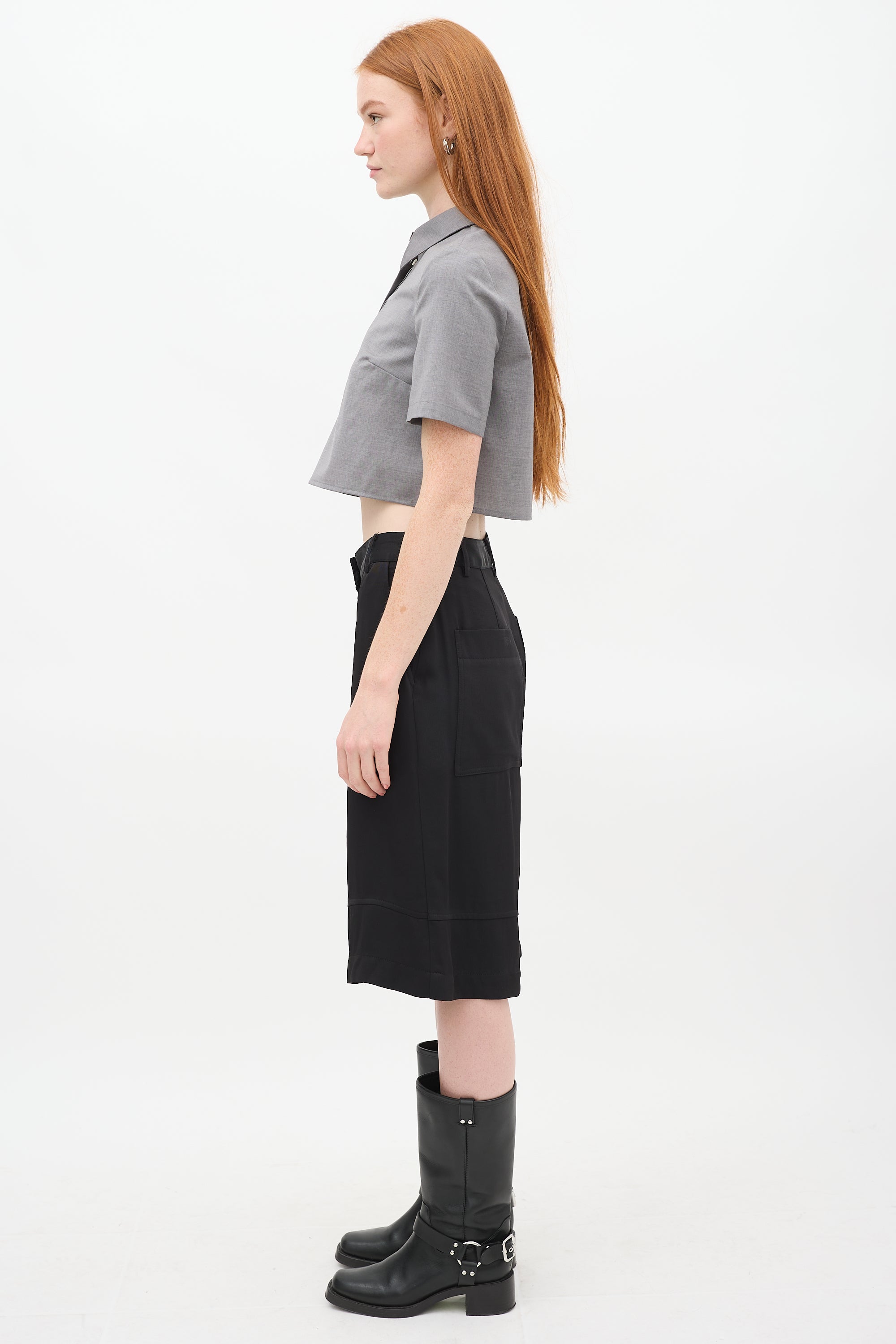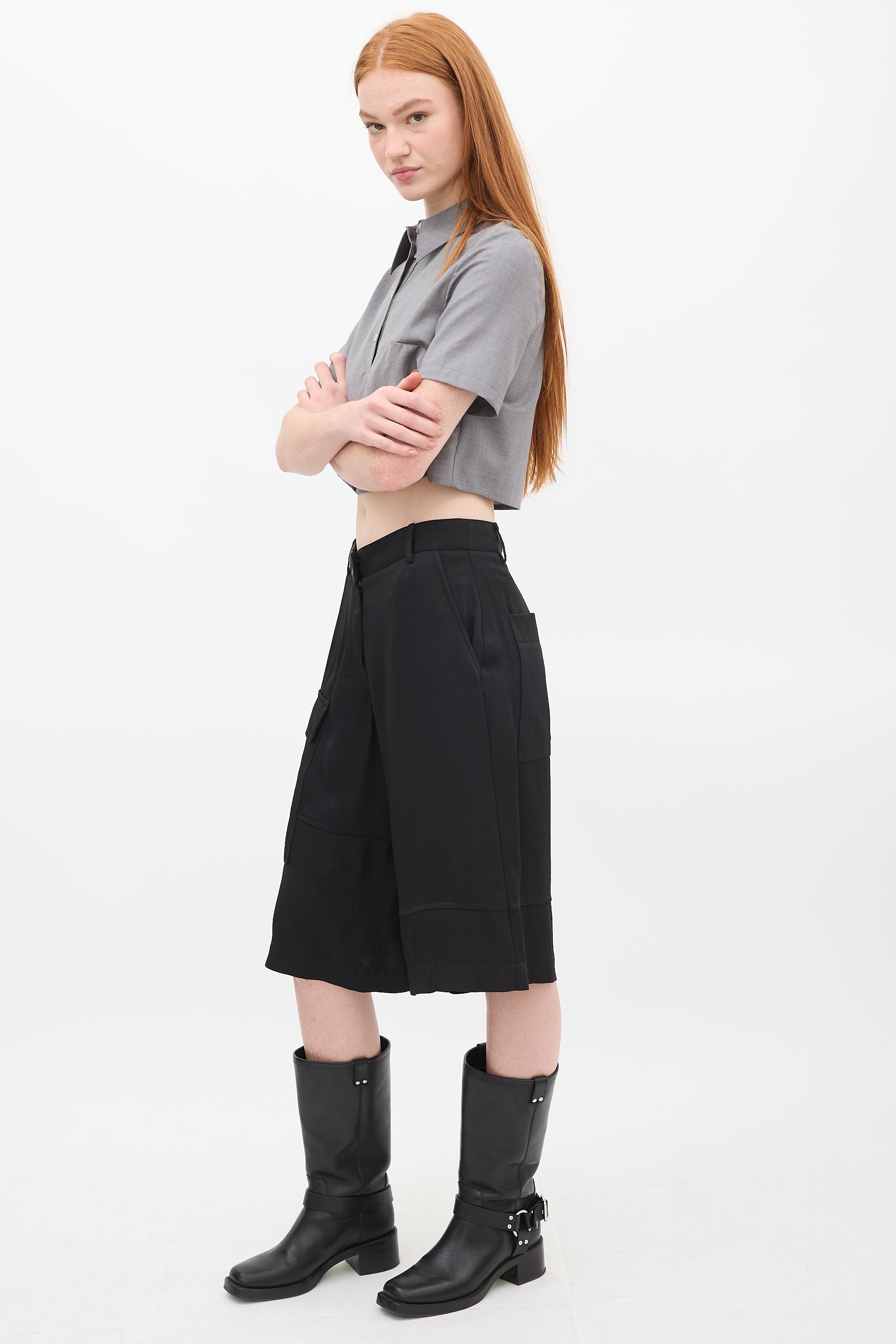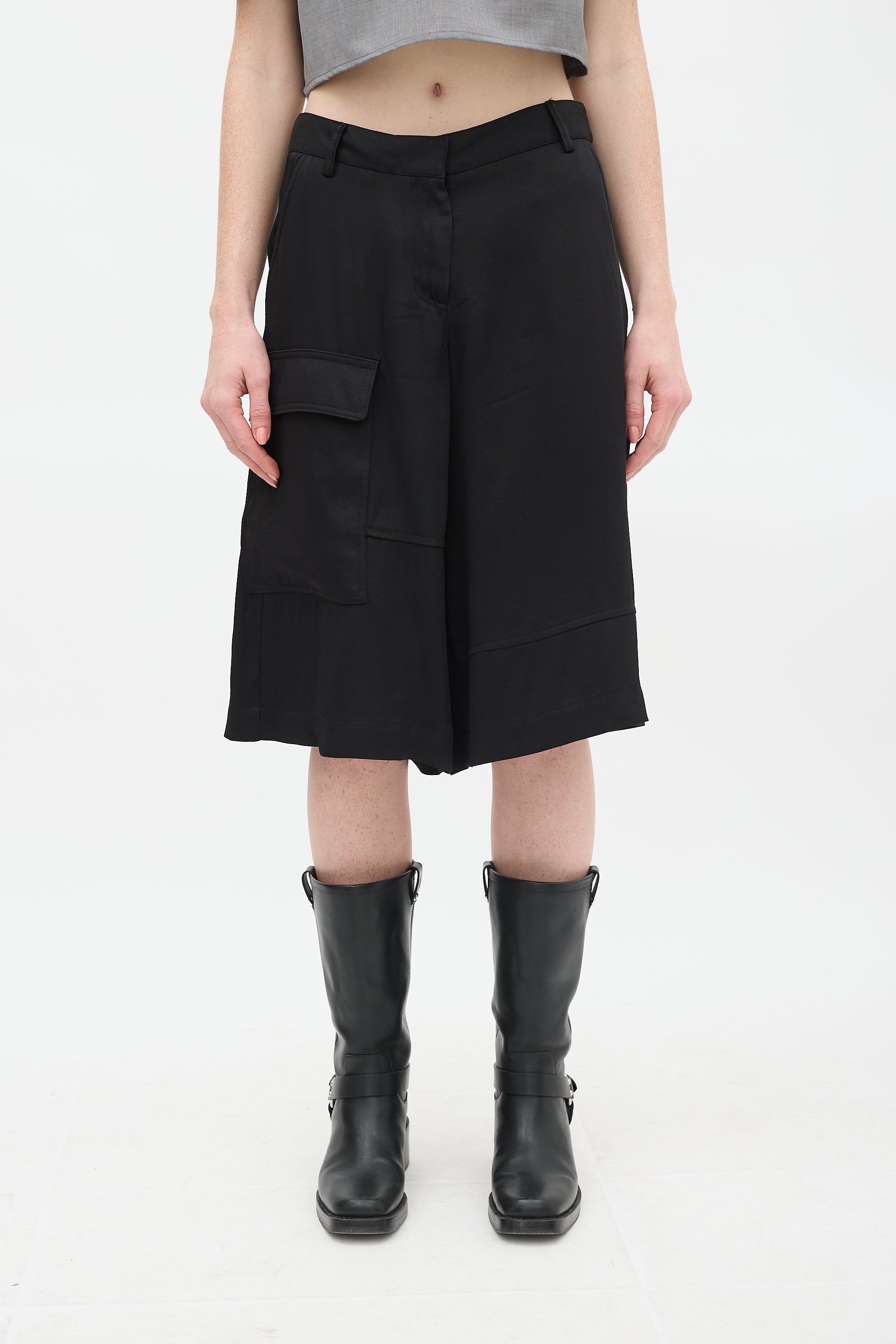 Pre-owned Tibi black Eco bermuda shorts featuring belt loops, zip fly, one cargo pocket at right leg, two slash pockets at hips, and two patch pockets at back.