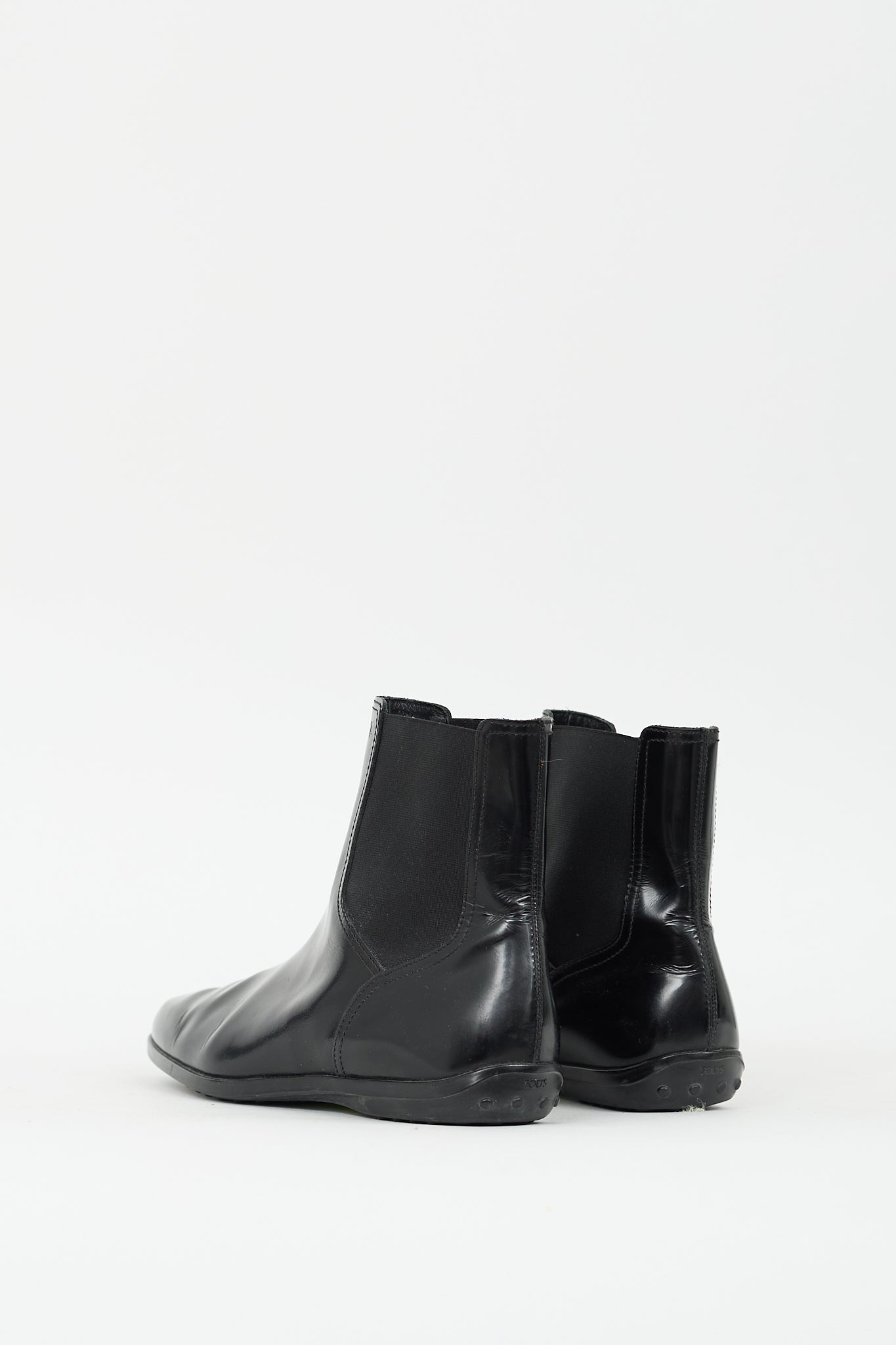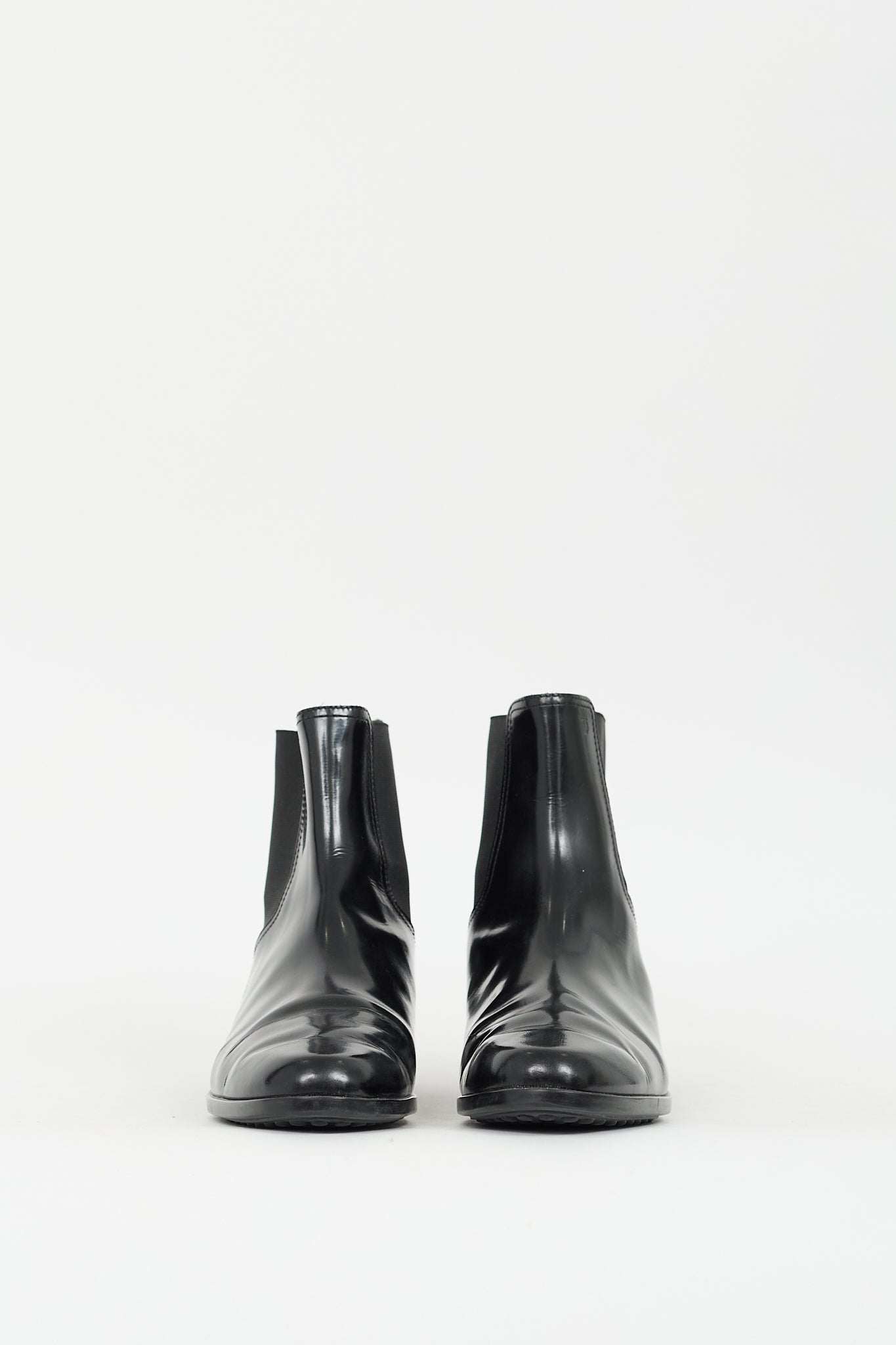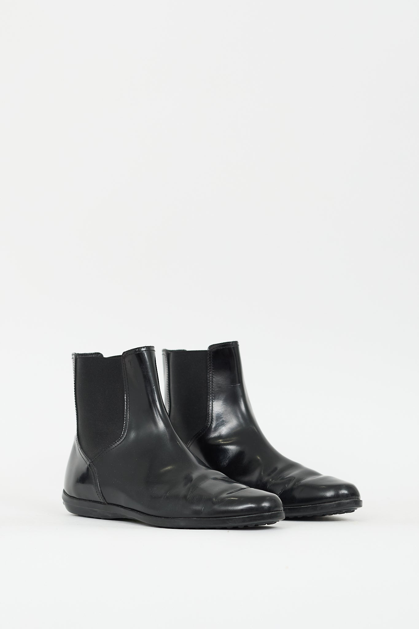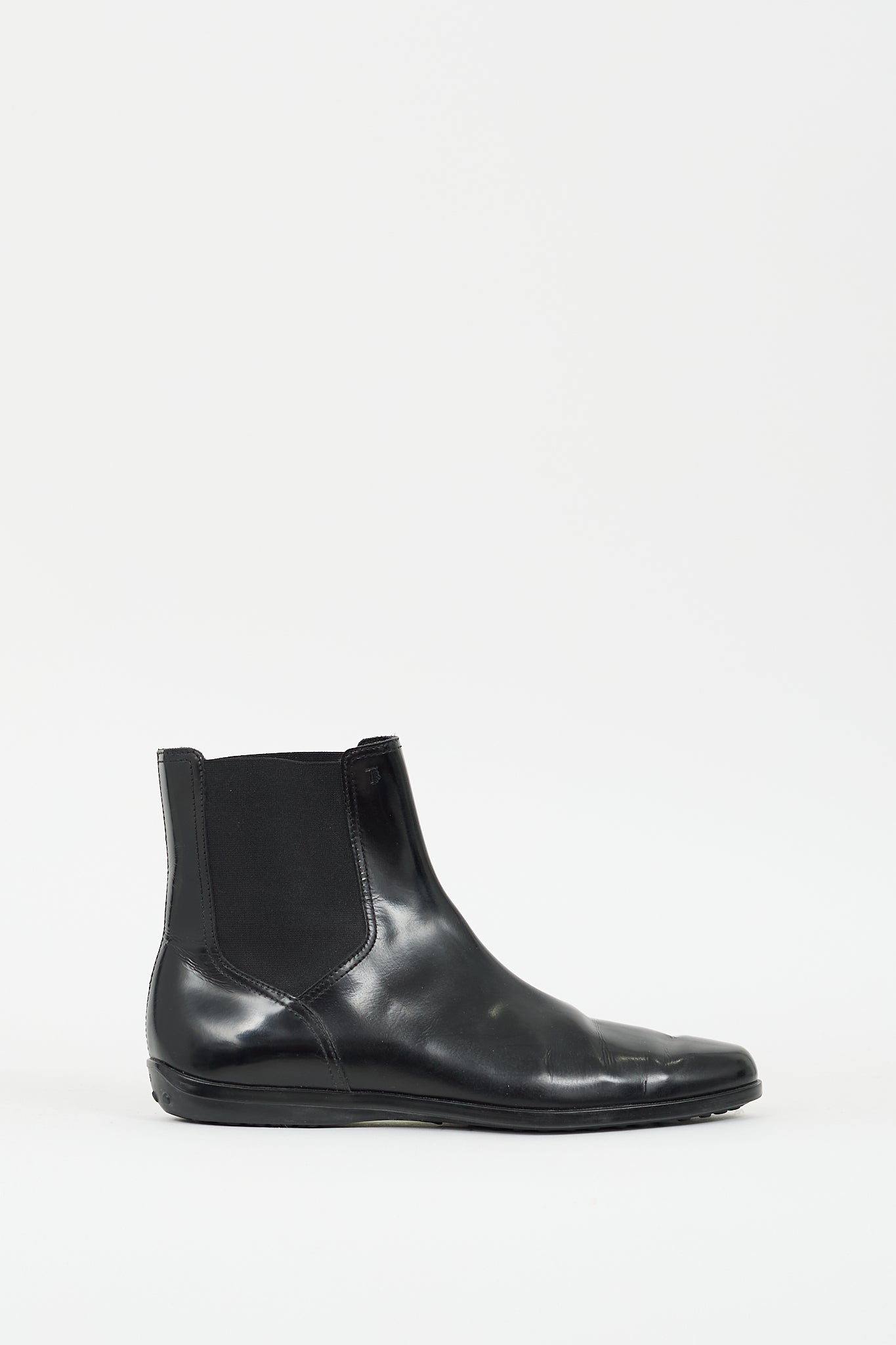 Pre-owned Tod's black leather chelsea boots featuring rounded toe, elasticized gore at sides, interior pull tab at counter, and pull on entry.