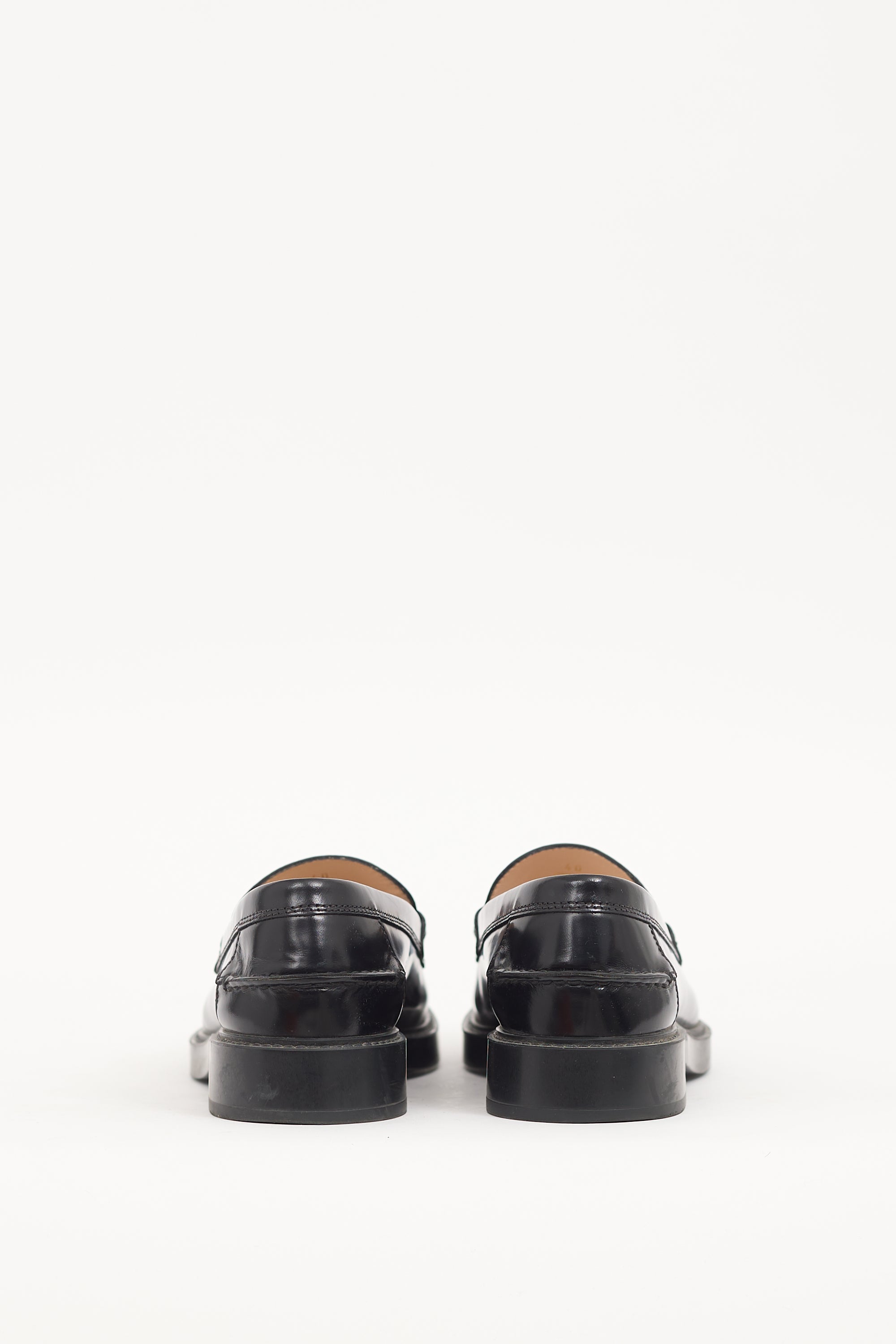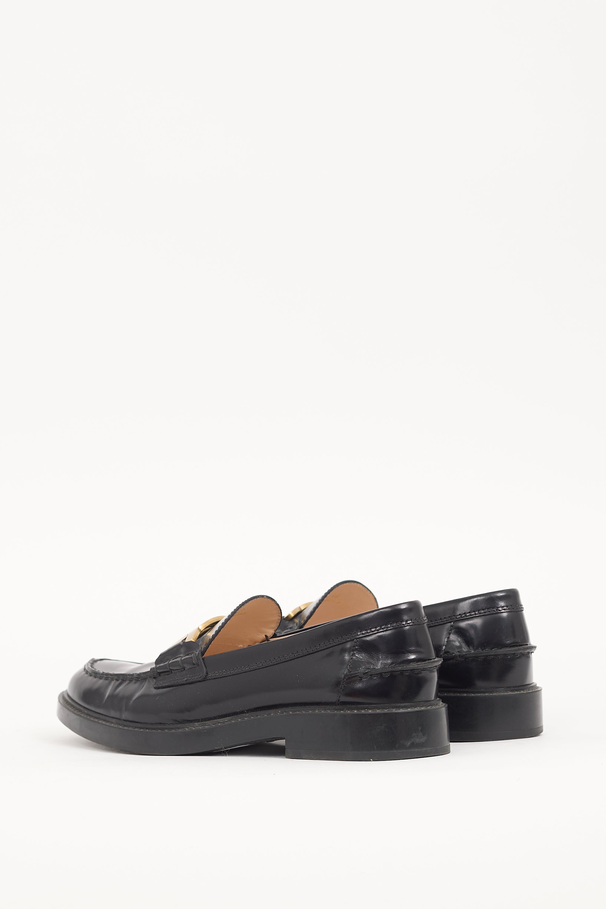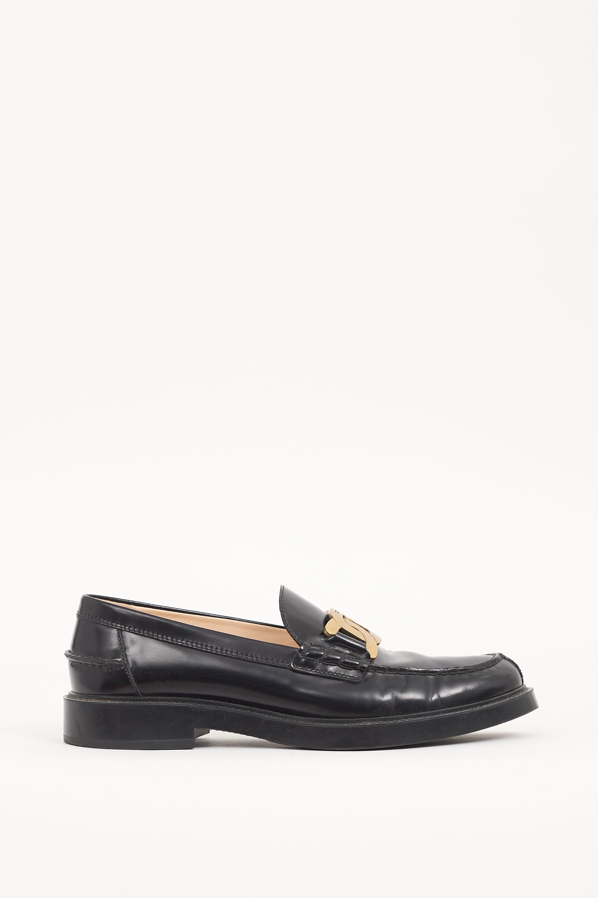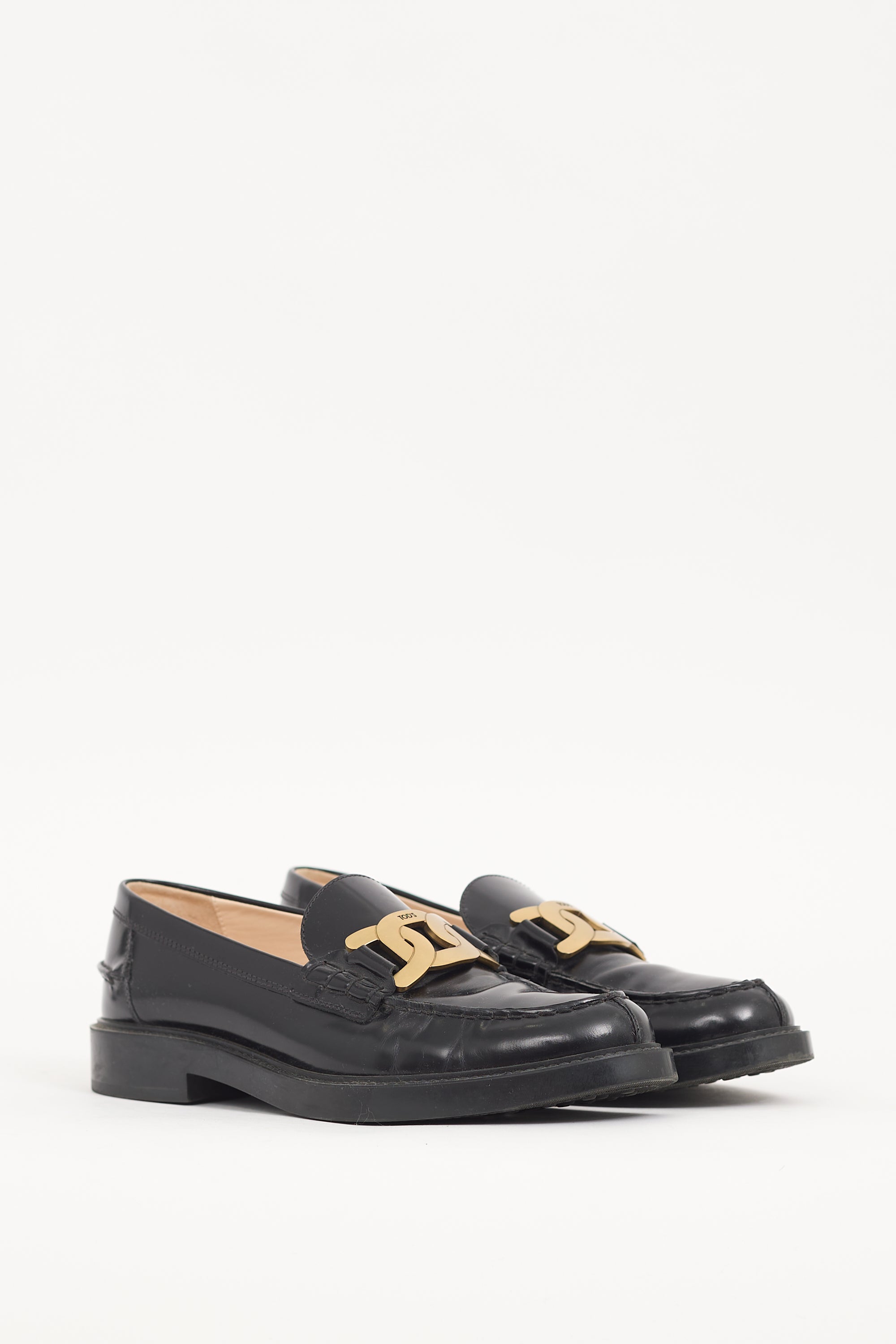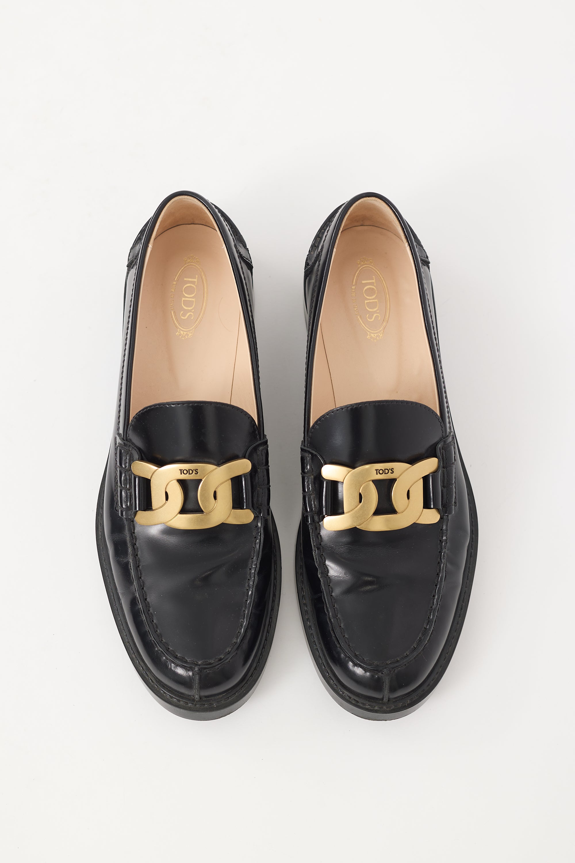 Pre-owned Tod's black patent leather loafers featuring a rounded toe, notched topline, gold tone chain motif hardware embellishment with engraved logo at vamp, and rubber sole with short heel.