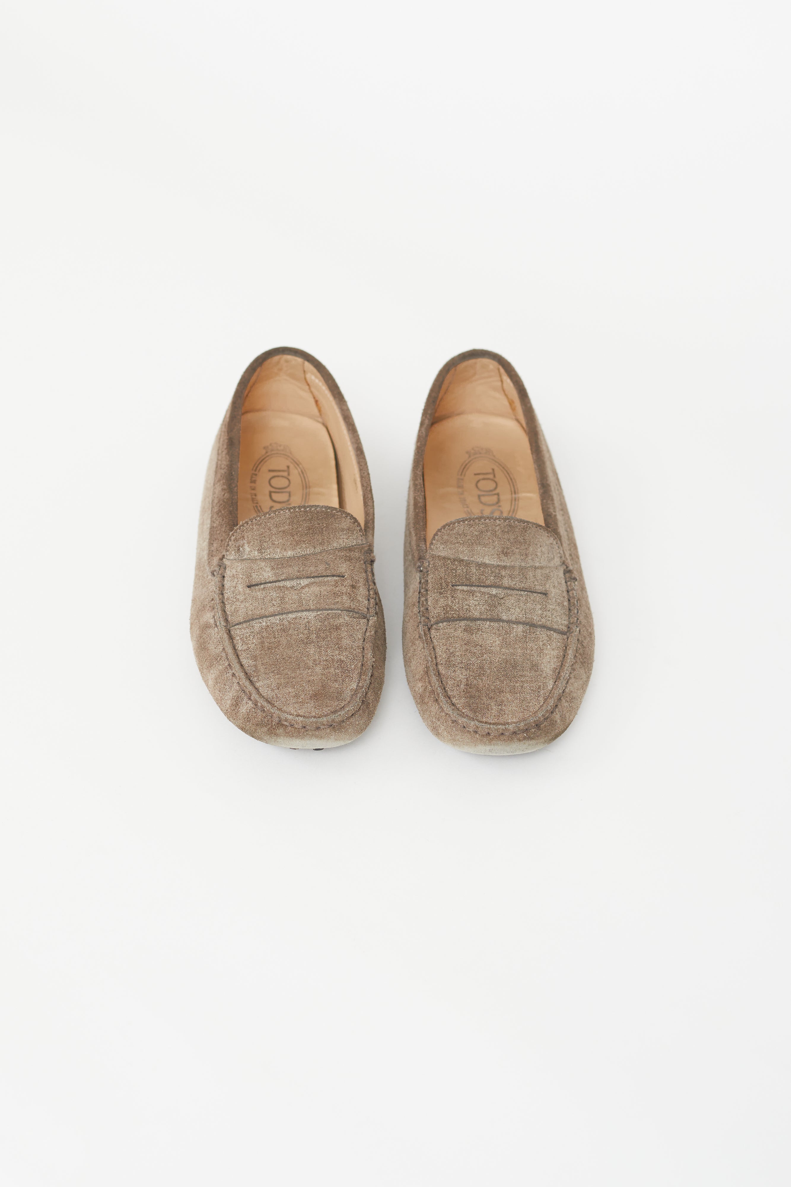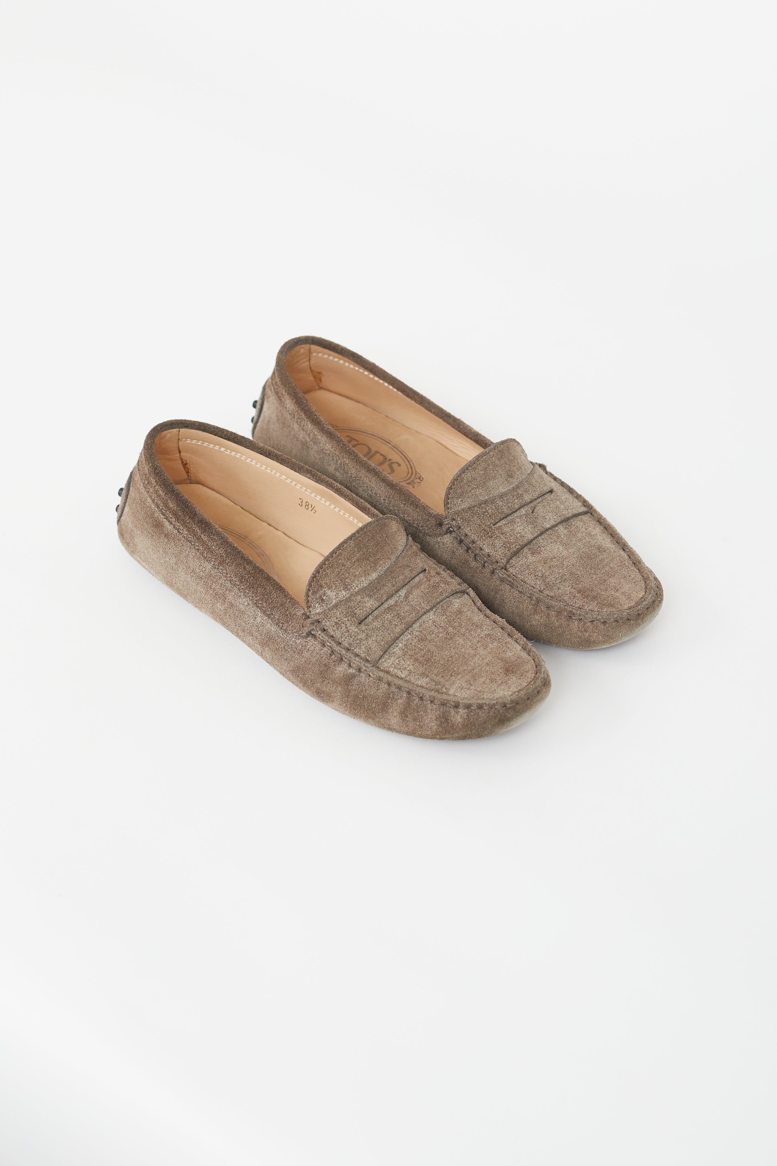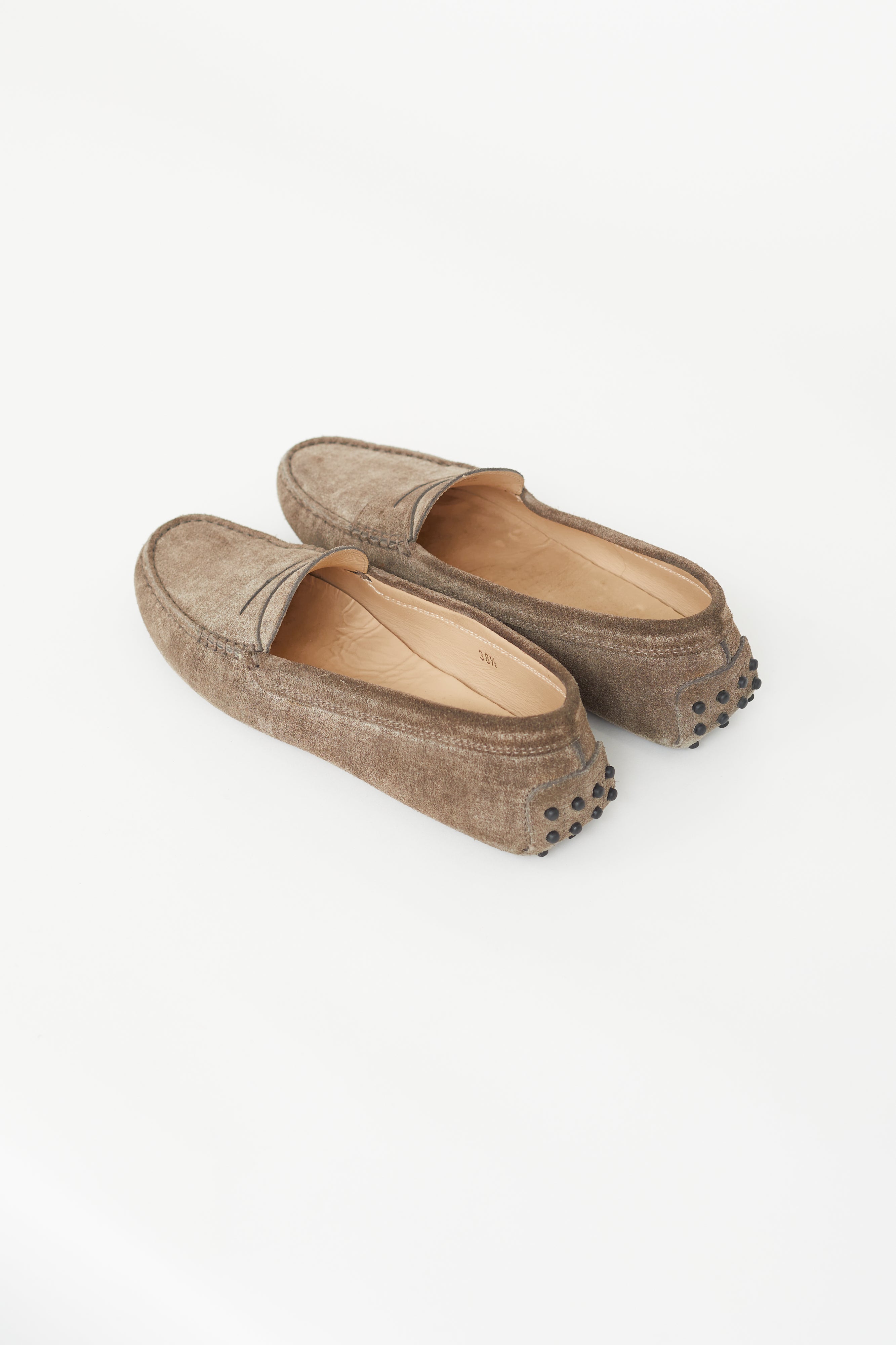 Pre-owned Tod's brown suede loafer featuring a round toe, strap at vamp, and rubber outsole. Comes with original dust bag.