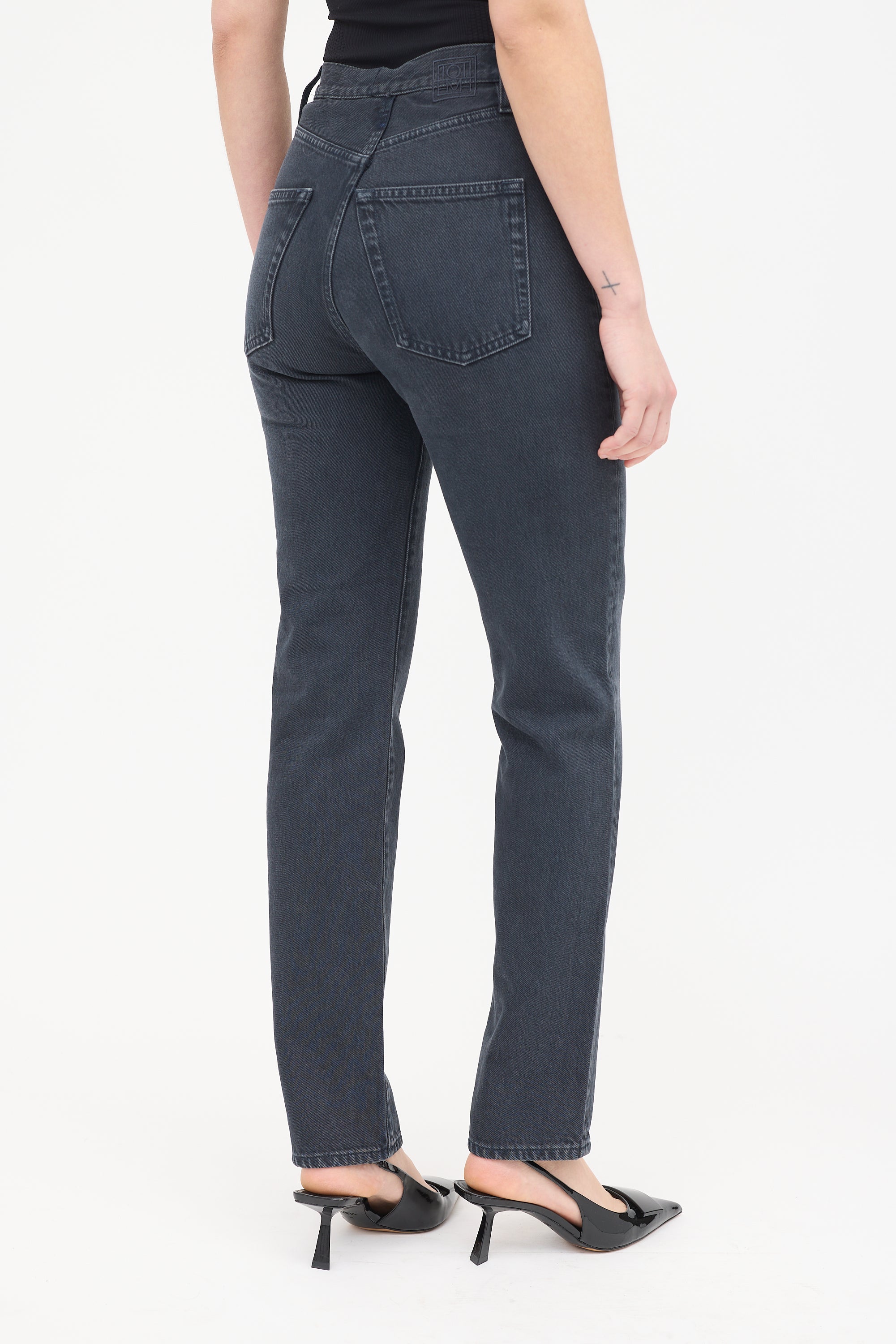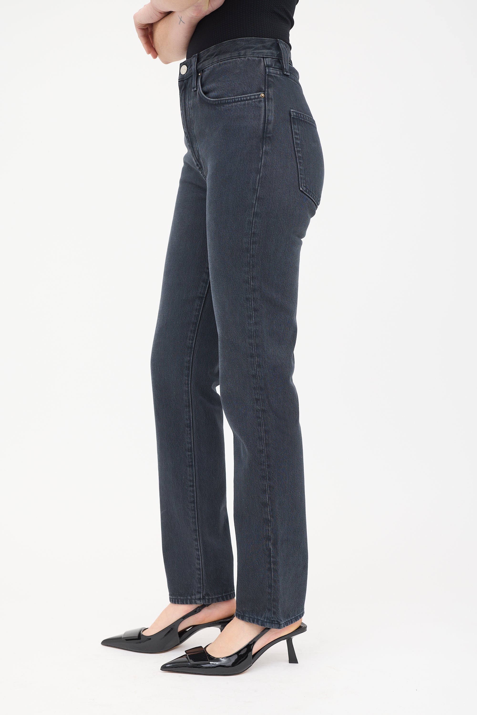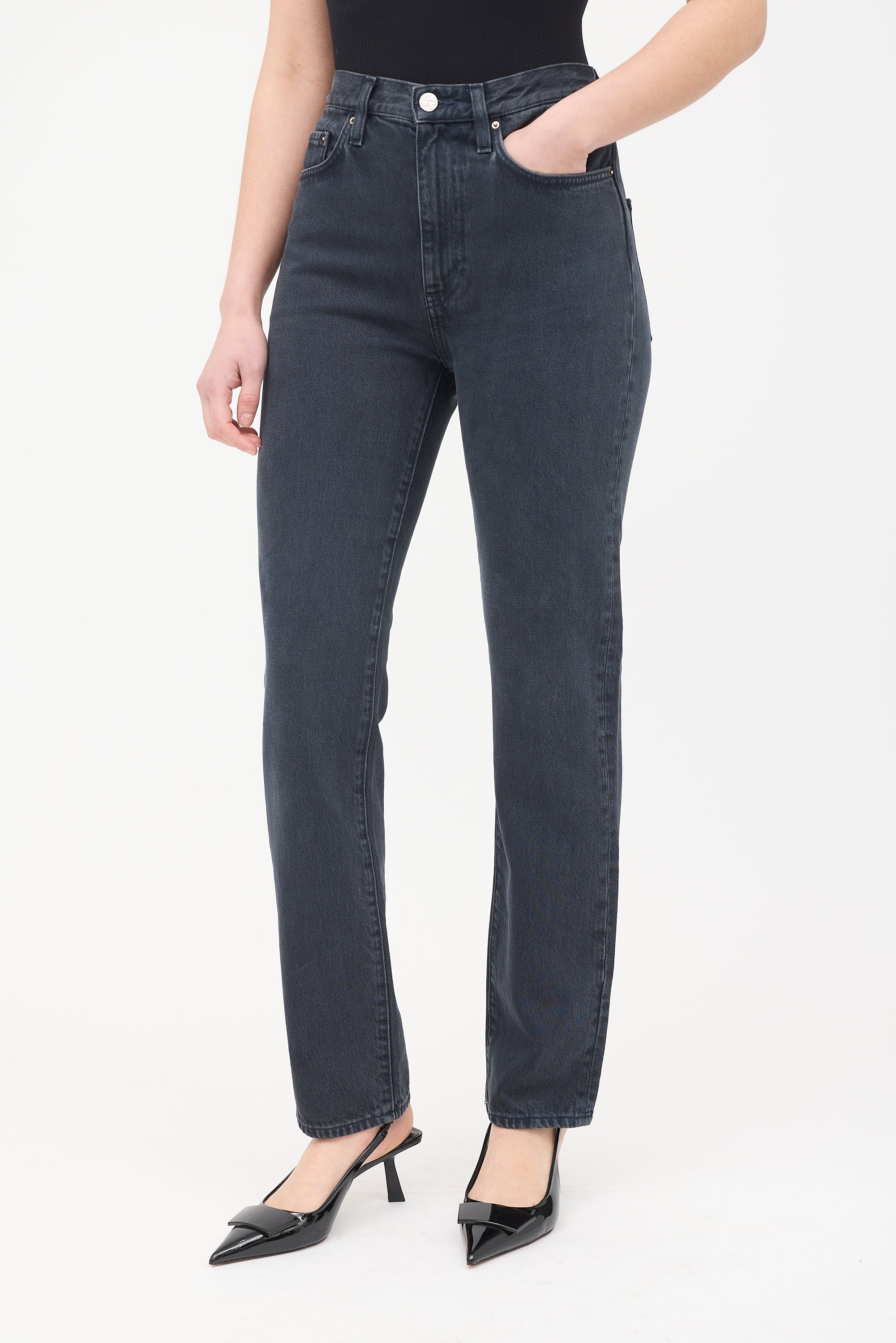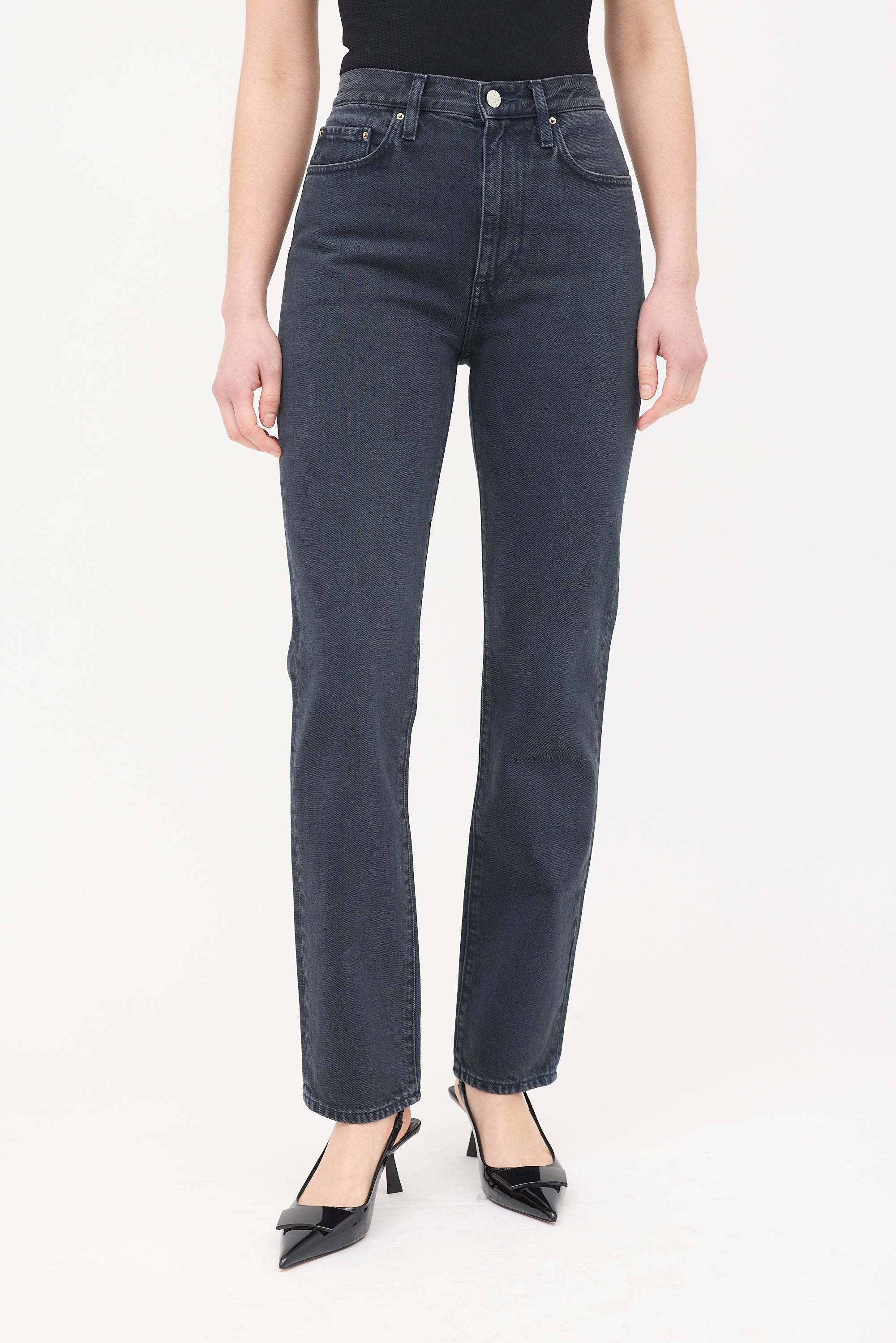 Pre-owned Toteme washed black Regular Fit jeans featuring high waist, slightly tapered leg, five pocket styling, embroidered logo at back right waist, and zip fly.