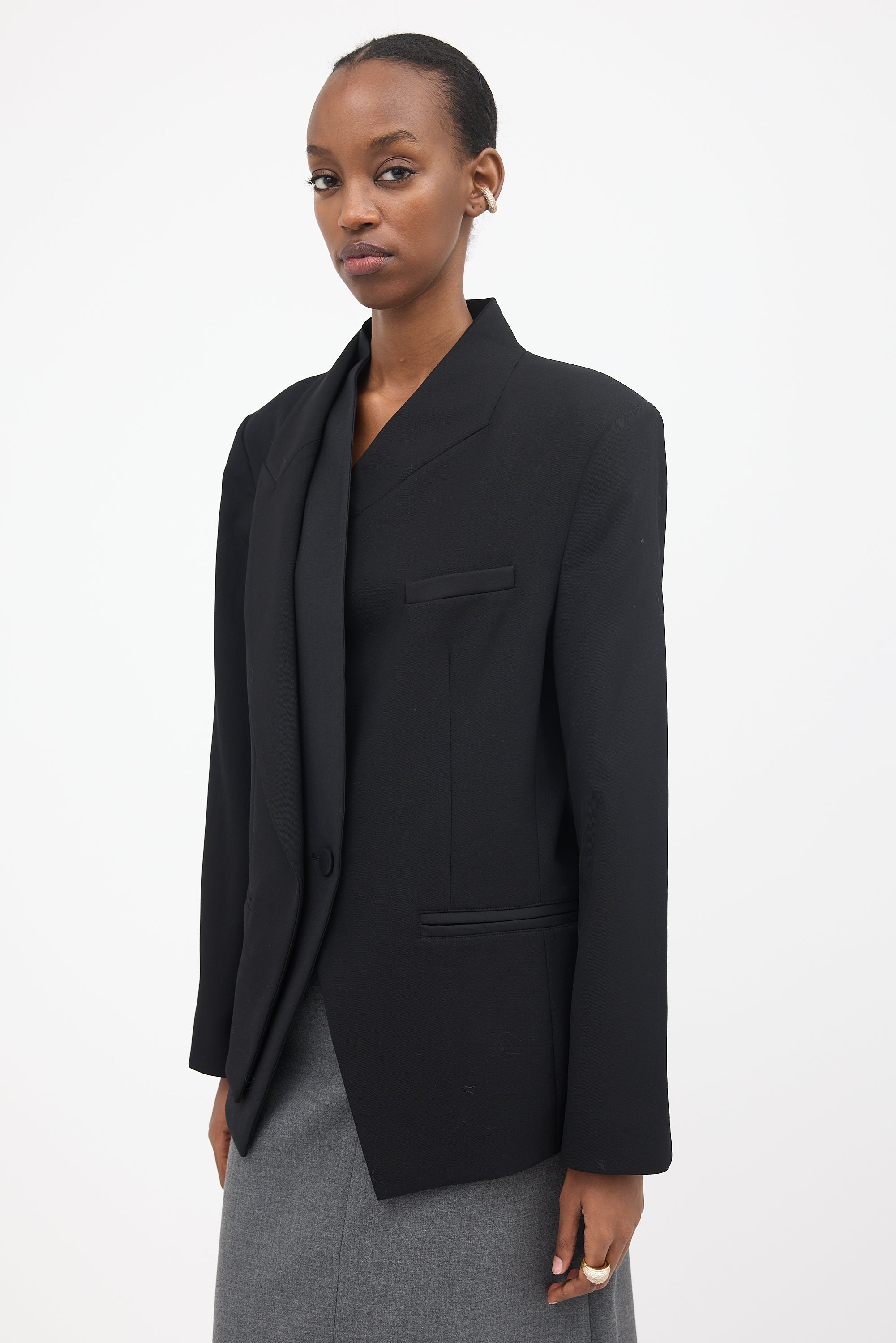 Pre-owned TWP black wool blend Bianca blazer featuring a layered lapel at right side, single button closure, three welt pockets at front, vented back, and buttoned cuffs. Lined.