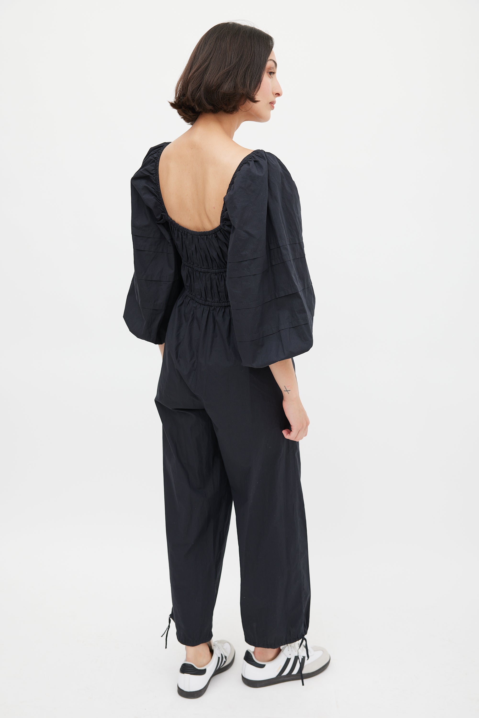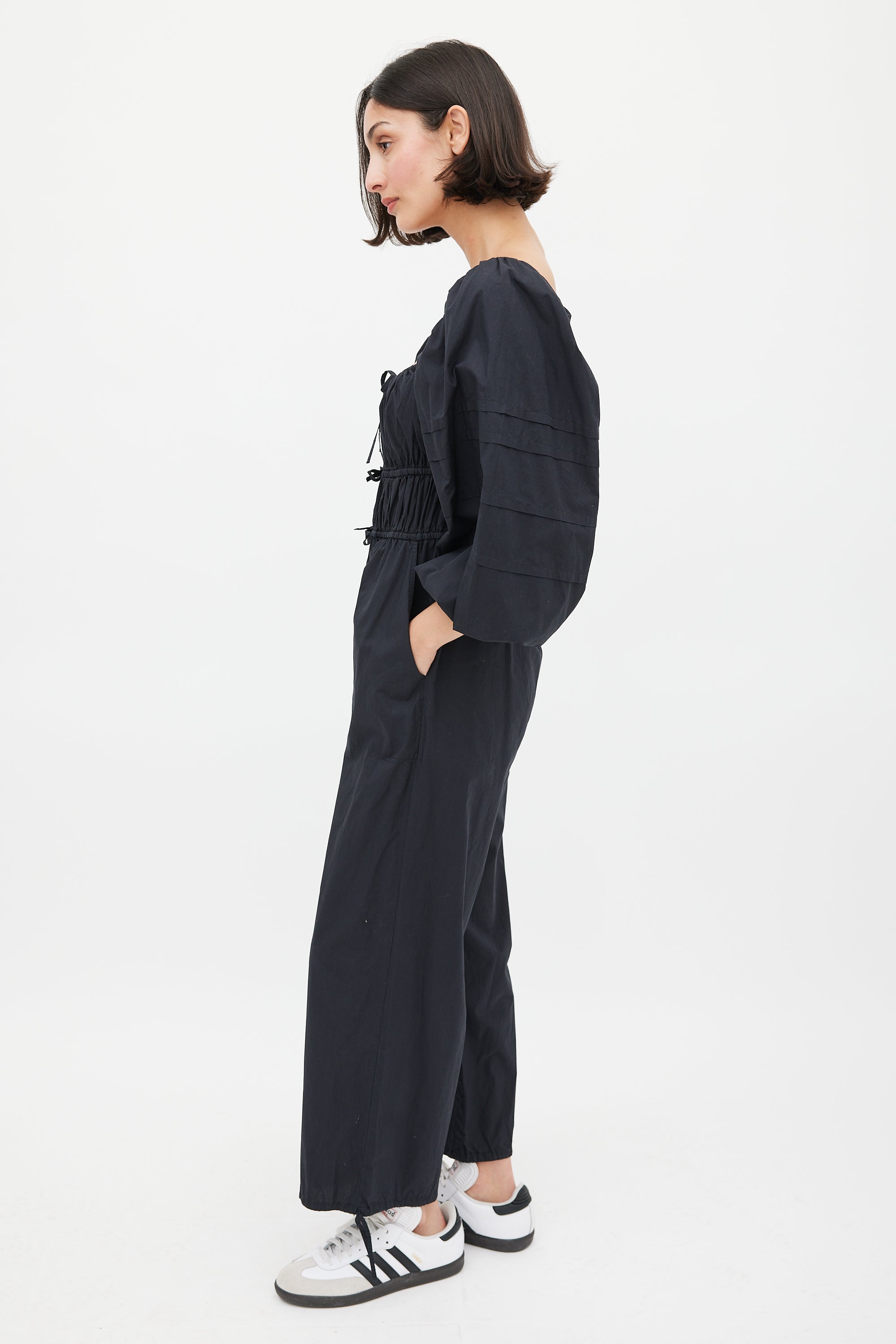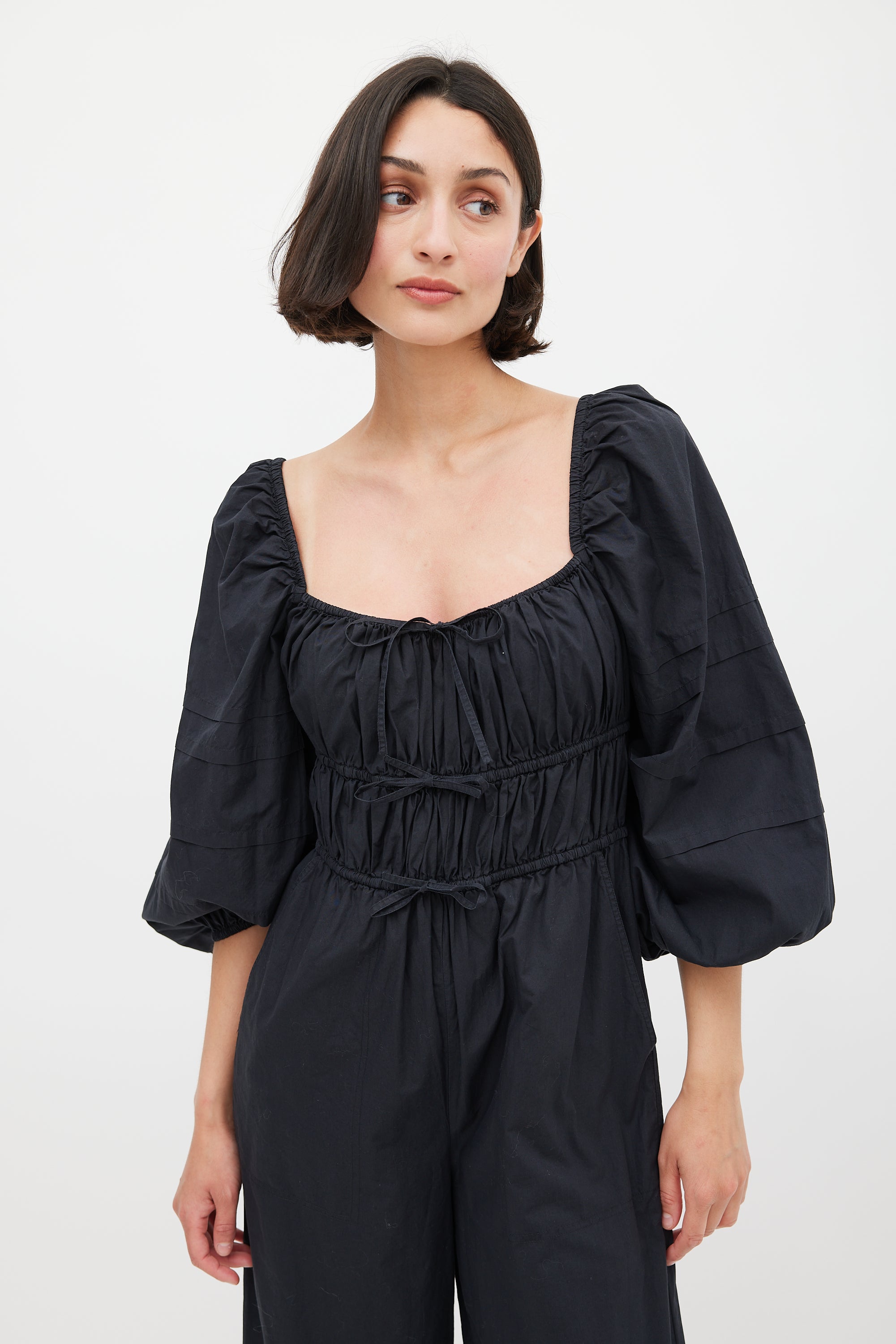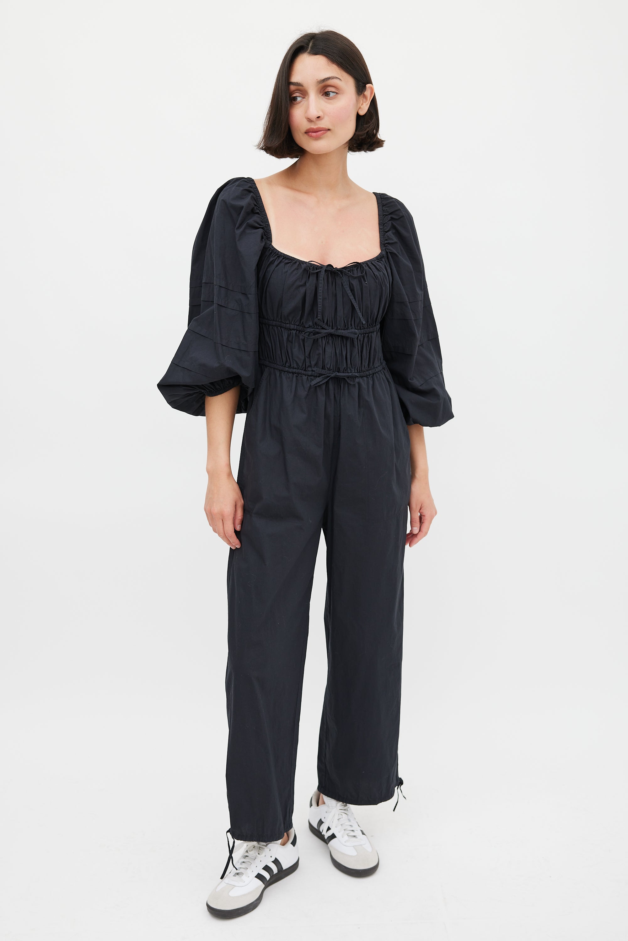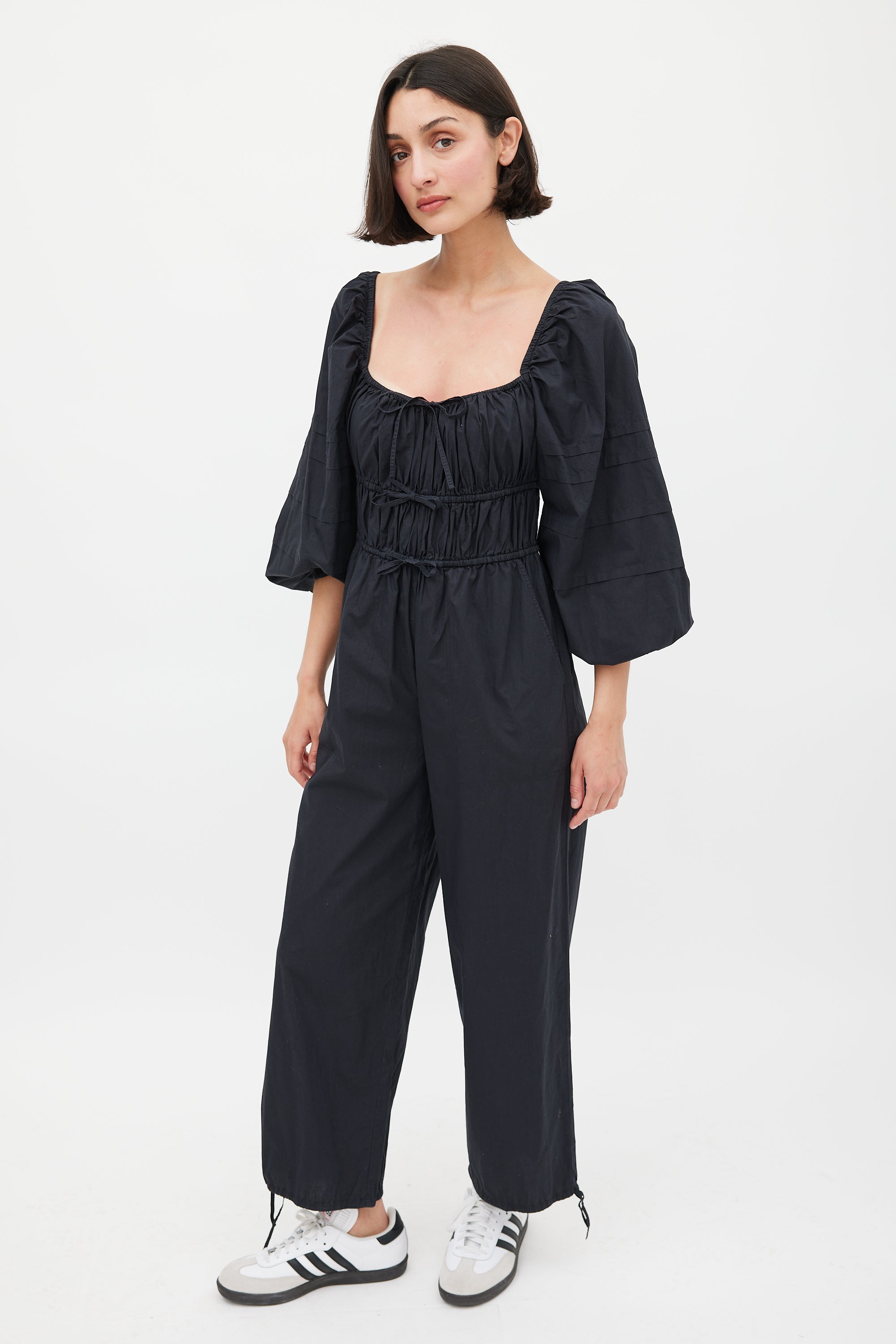 Pre-owned Ulla Johnson black cotton Amalie jumpsuit featuring a round neck, smocking at chest with three front tie detail, long puff sleeves with pleating and elasticized shoulders and cuffs, front slash pockets, dropped seat, and straight leg with drawstring cuffs.