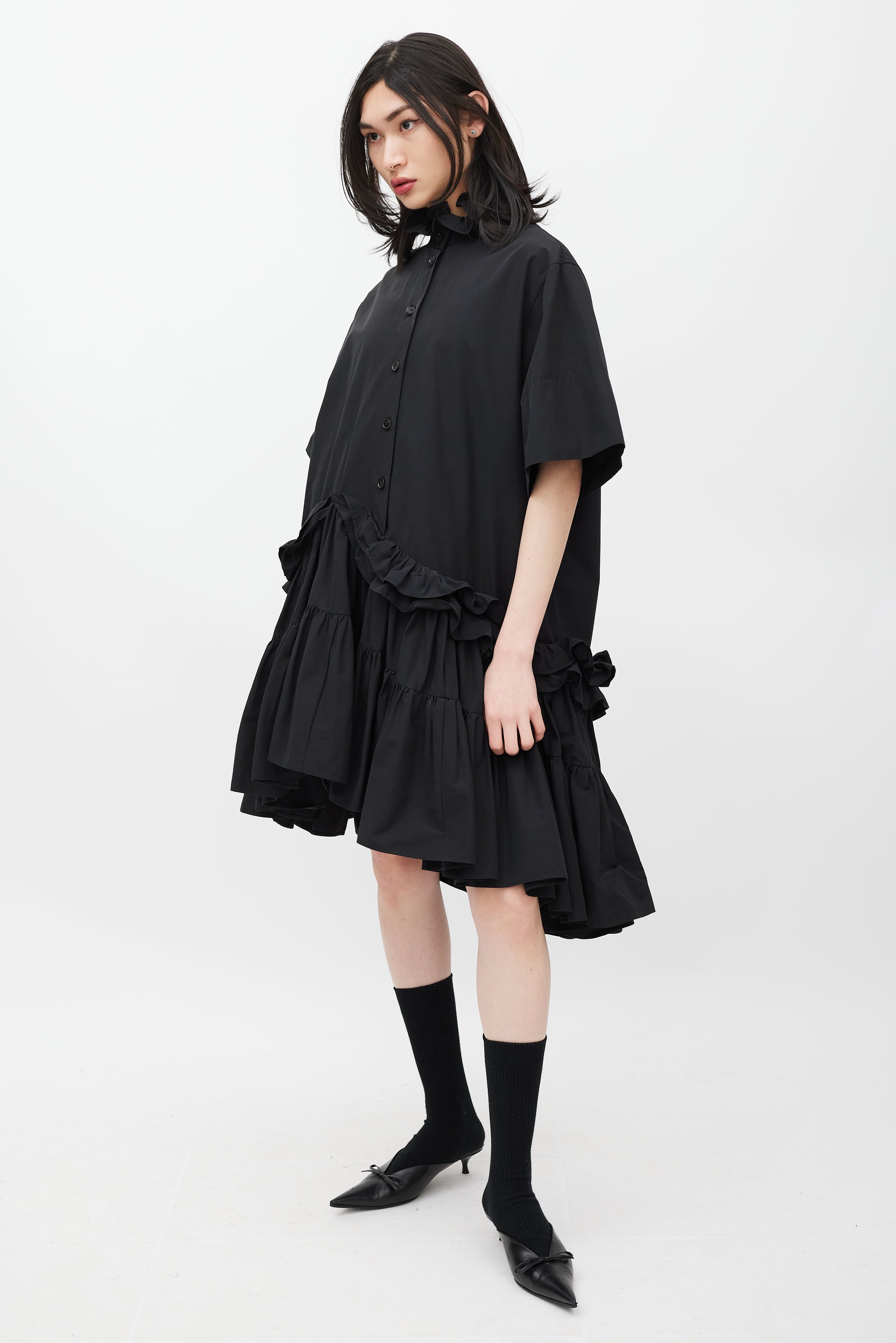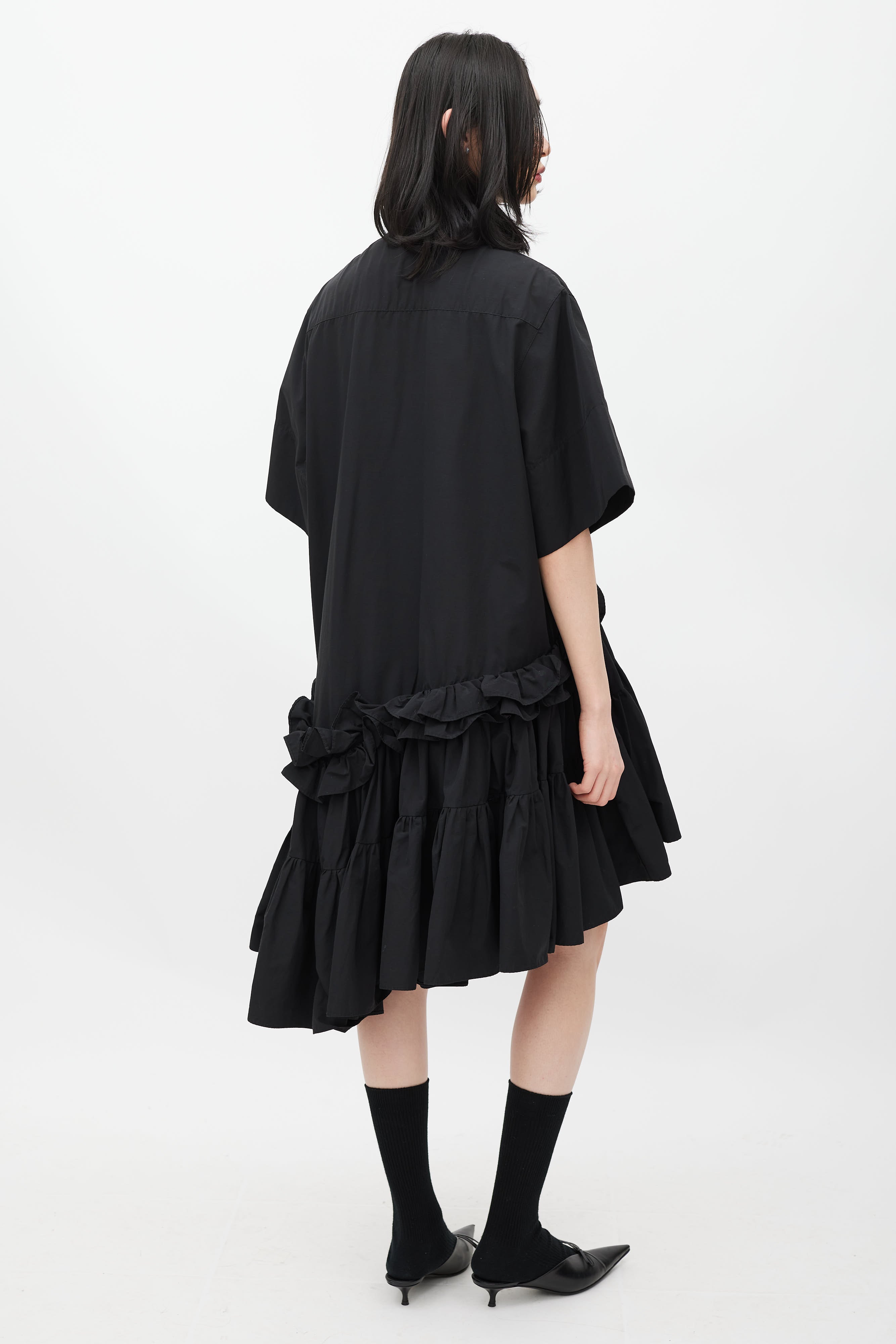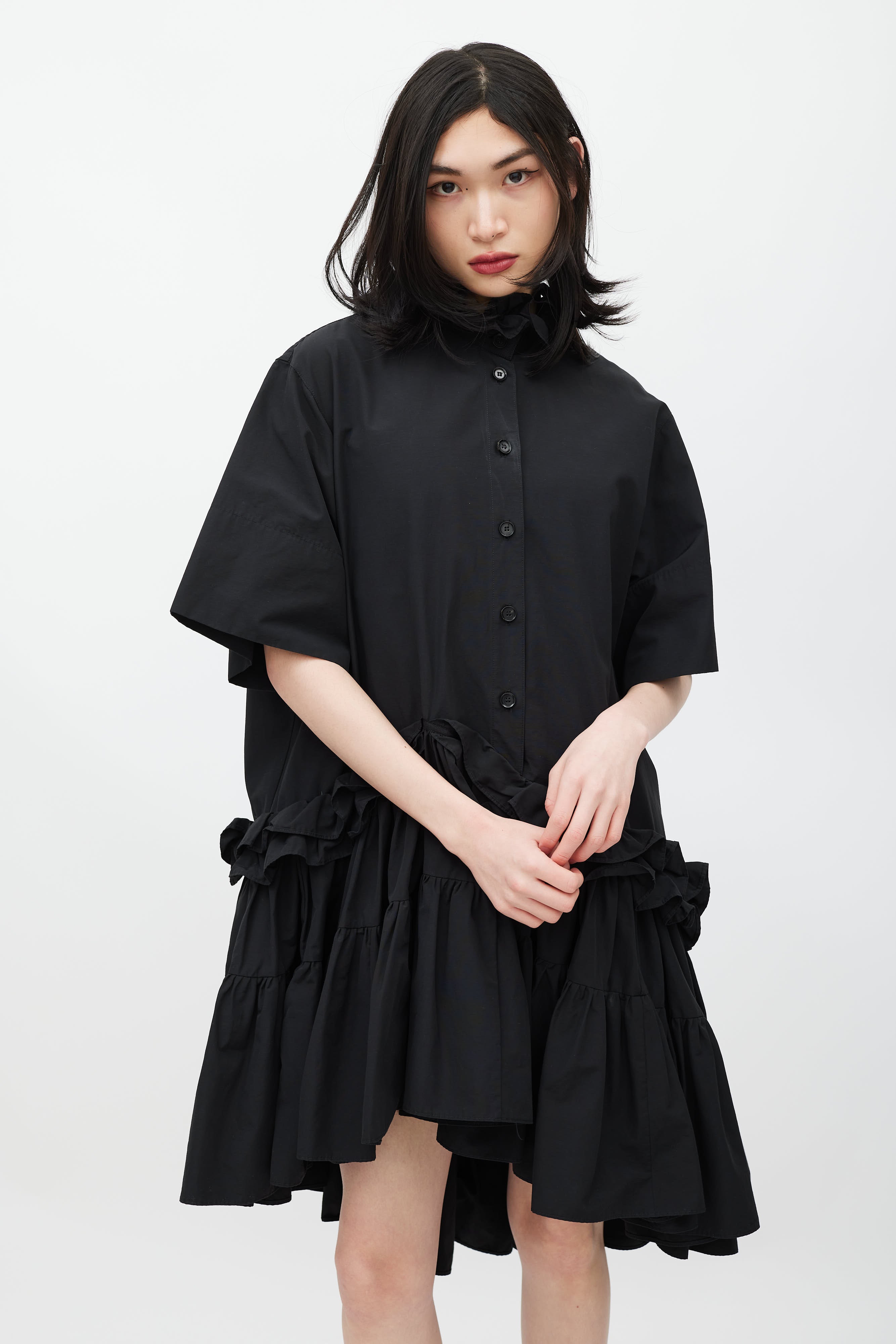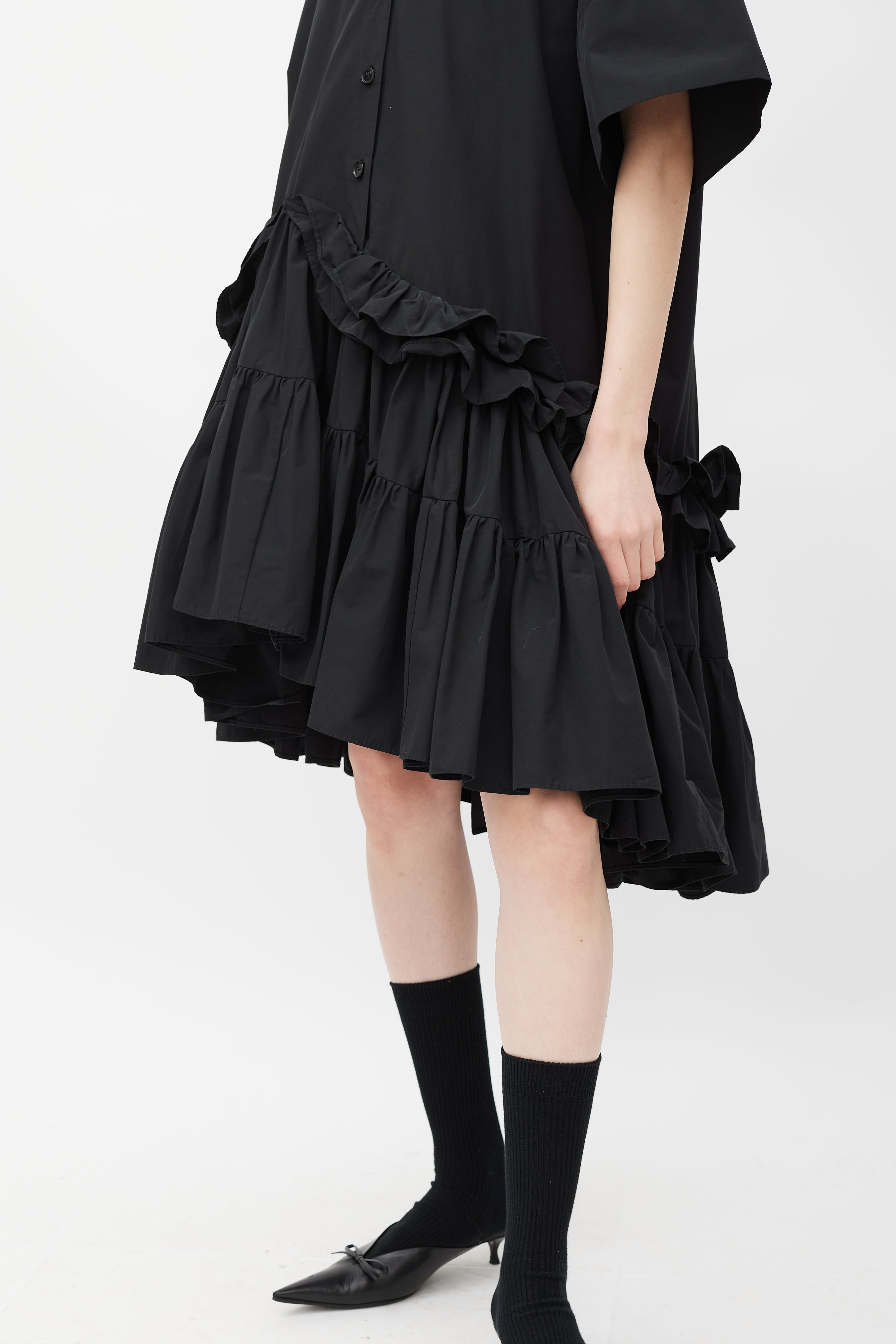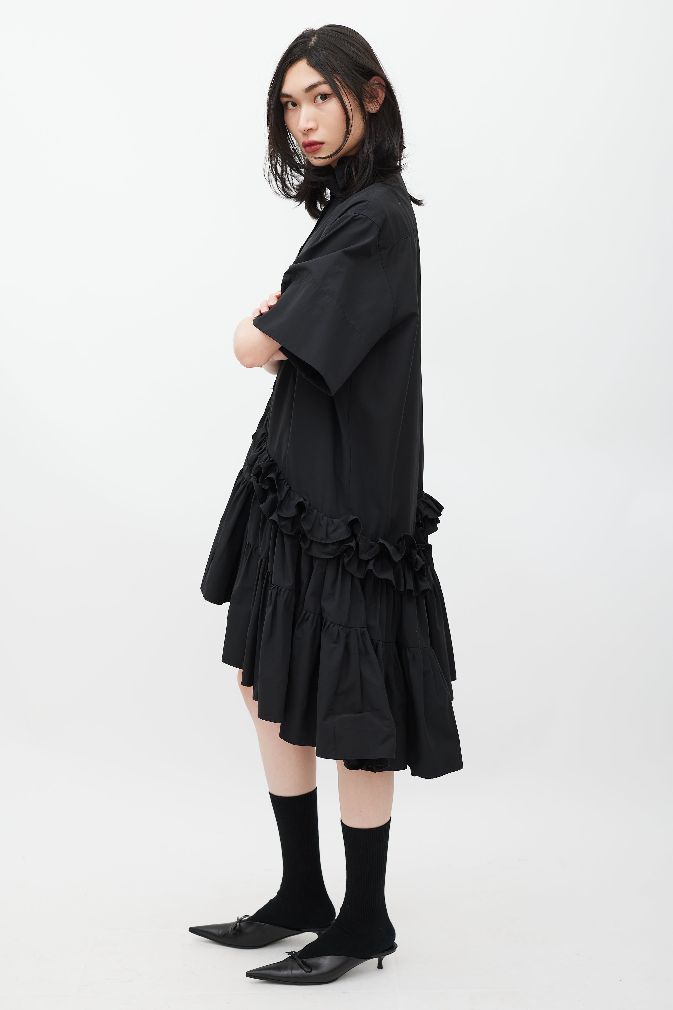 Pre-owned UNTTLED black dress featuring a round neckline, short sleeves, asymmetrical ruffled hem, and button up closure.