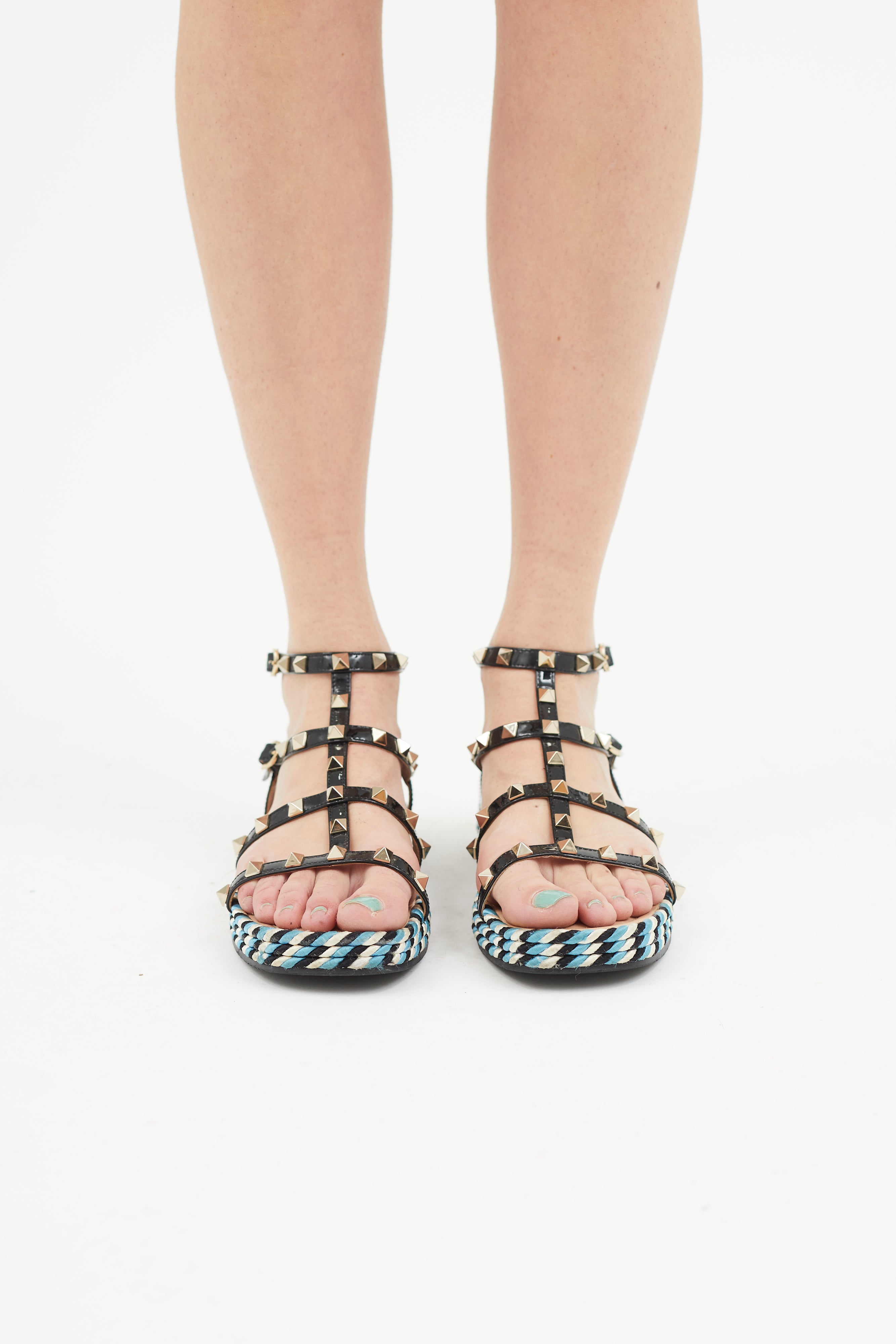 Pre-owned Valentino black sandals featuring open square toe, multicolour braided midsole, caged patent leather straps at vamp featuring gold tone Rockstud embellishment, and an adjustable ankle strap with gold tone buckle. Comes with original dust bags.
