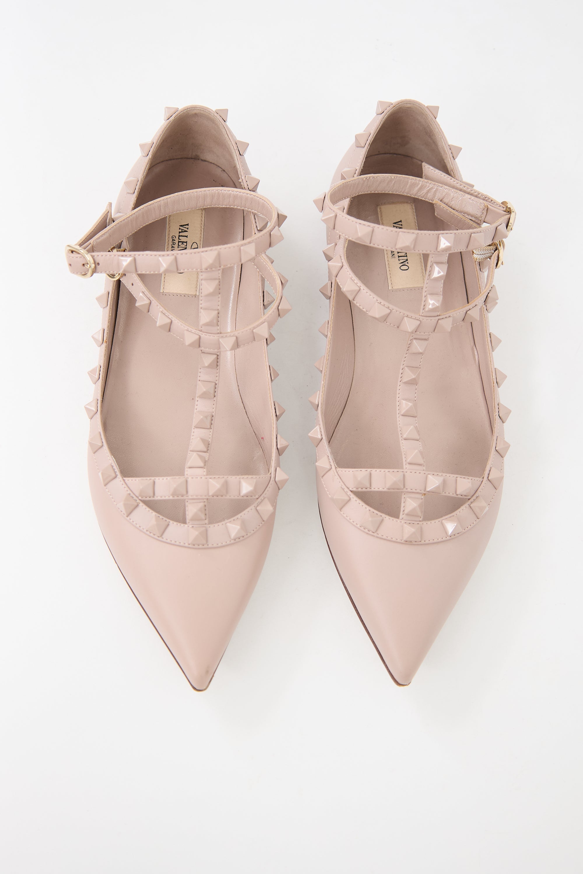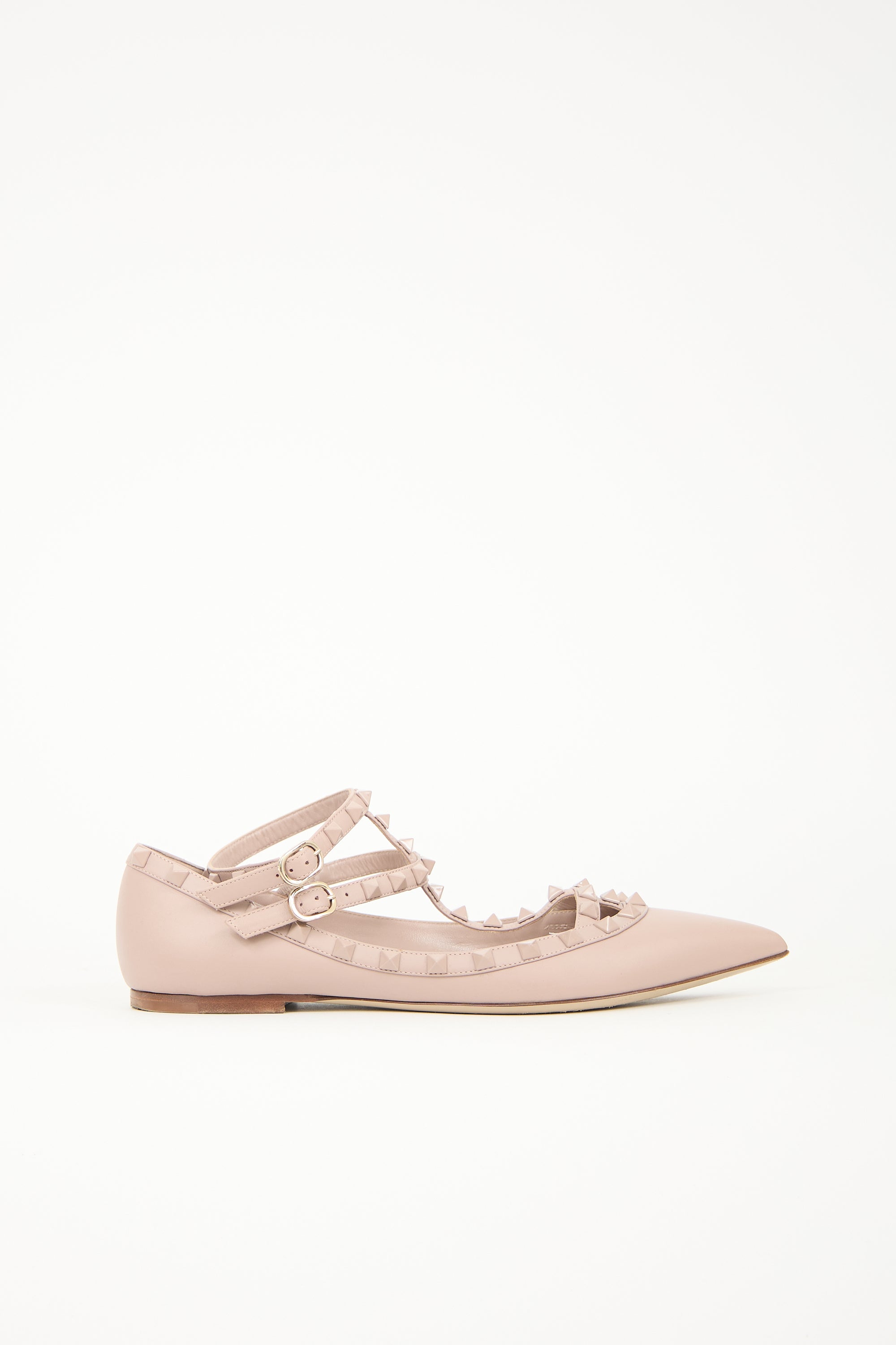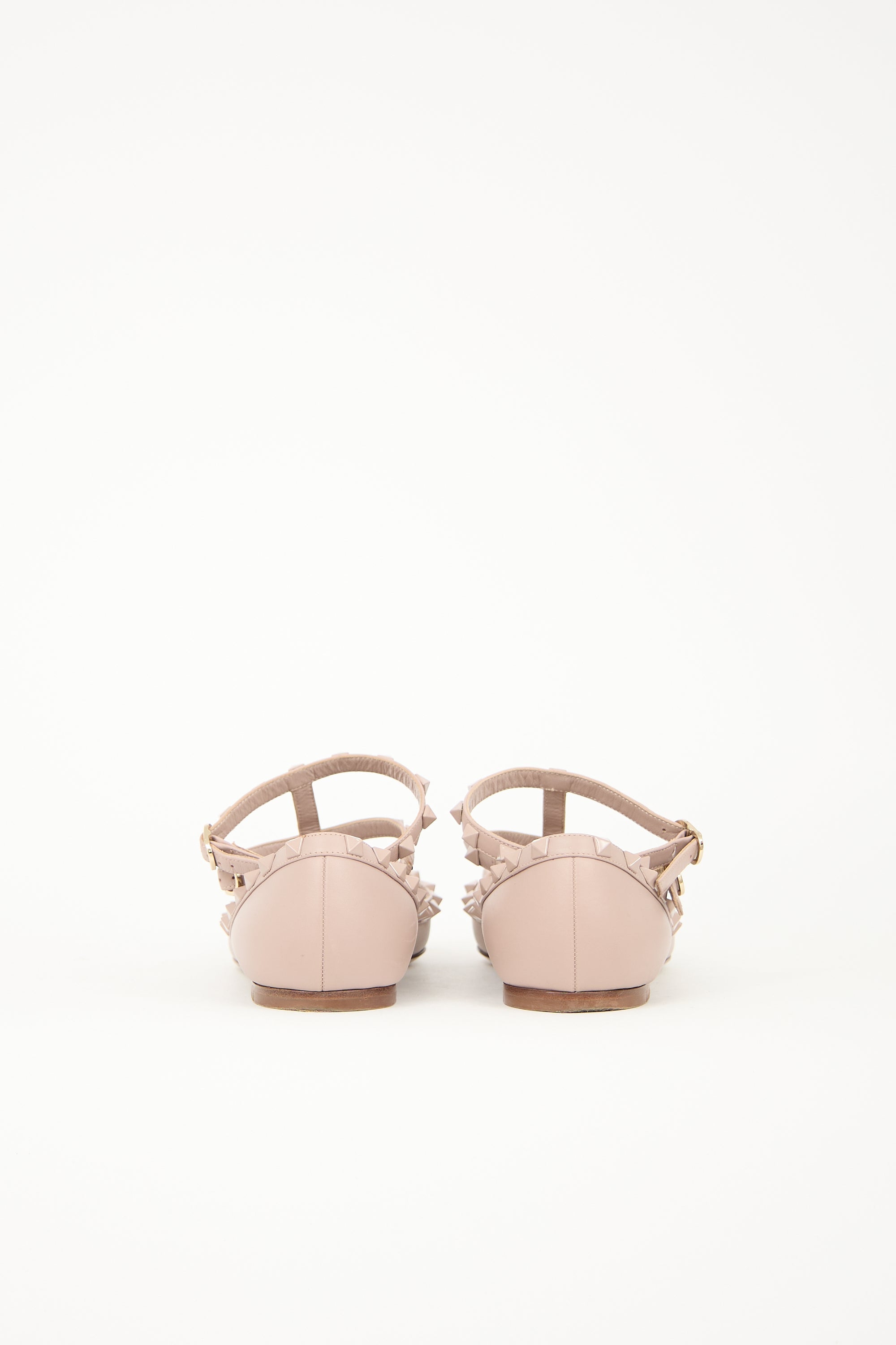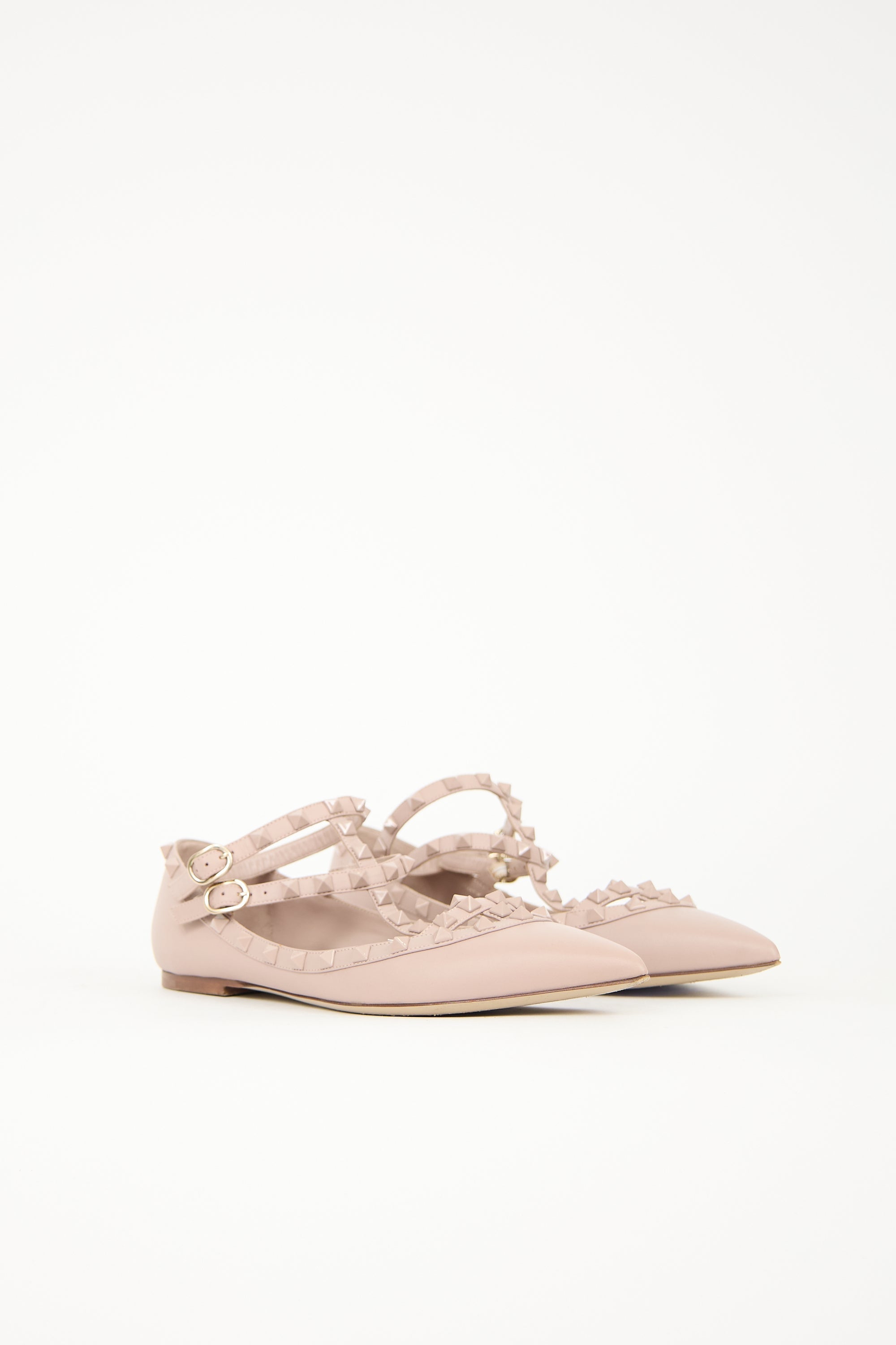 Pre-owned Valentino pink leather flats featuring pointed toe, cage upper with tonal signature Rockstud trim, and two adjustable ankle straps.