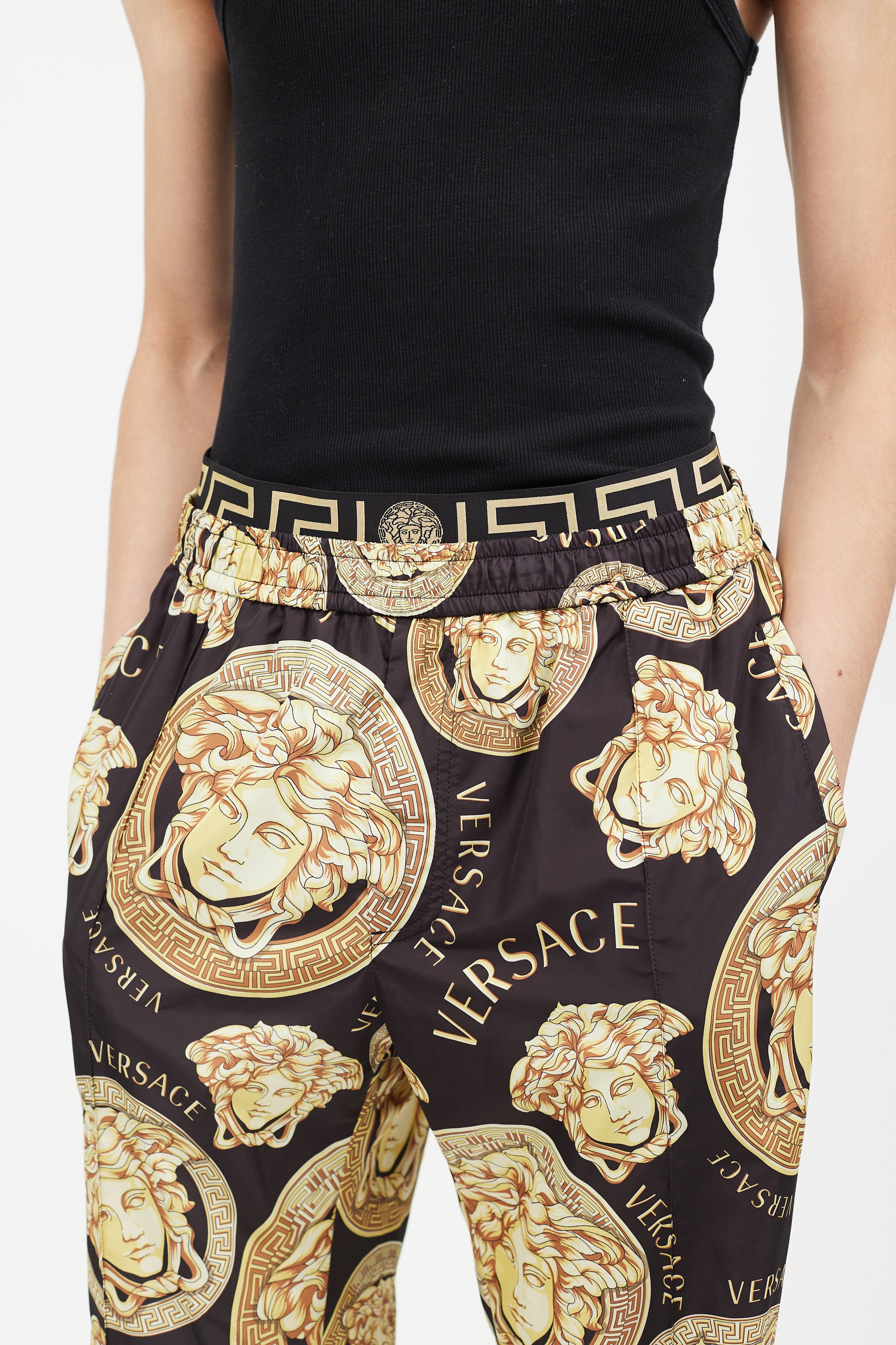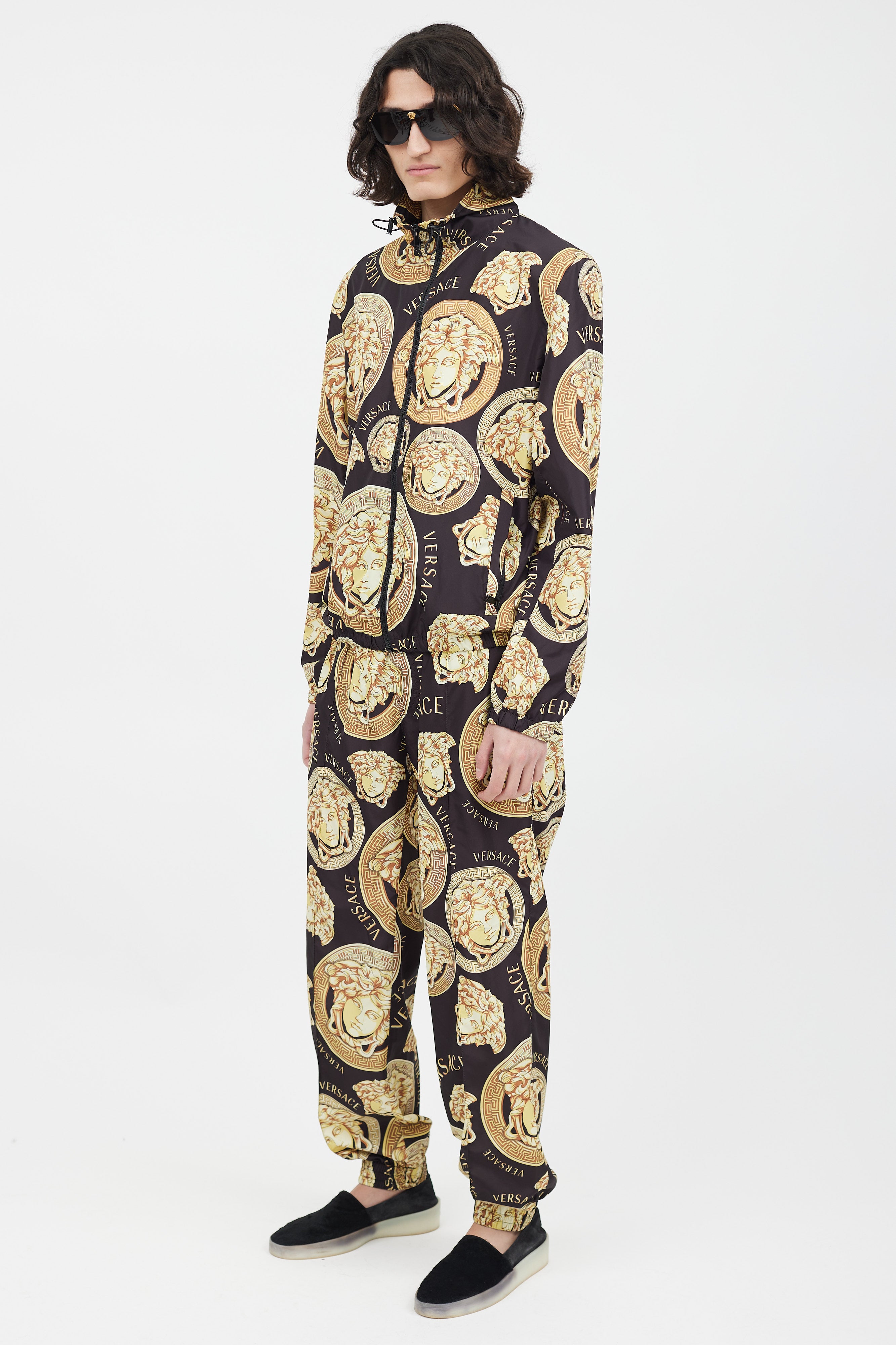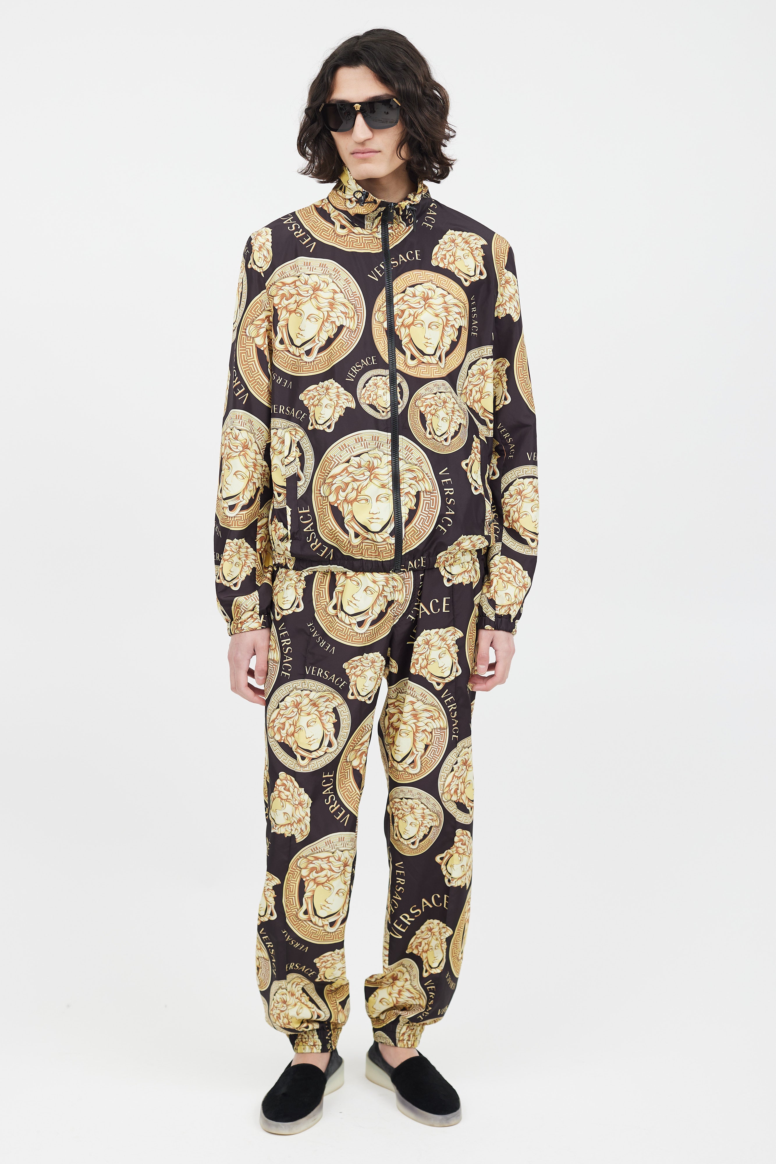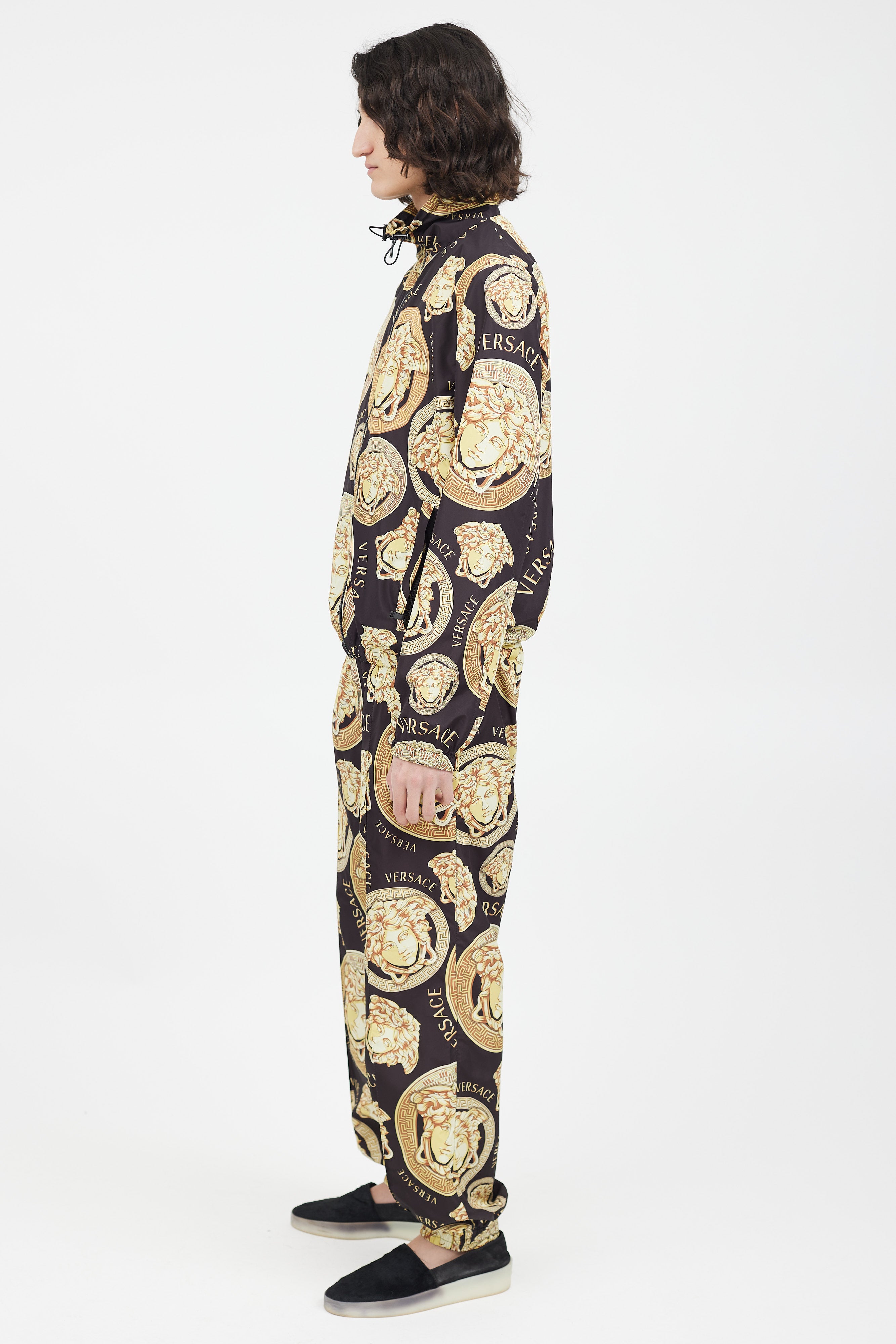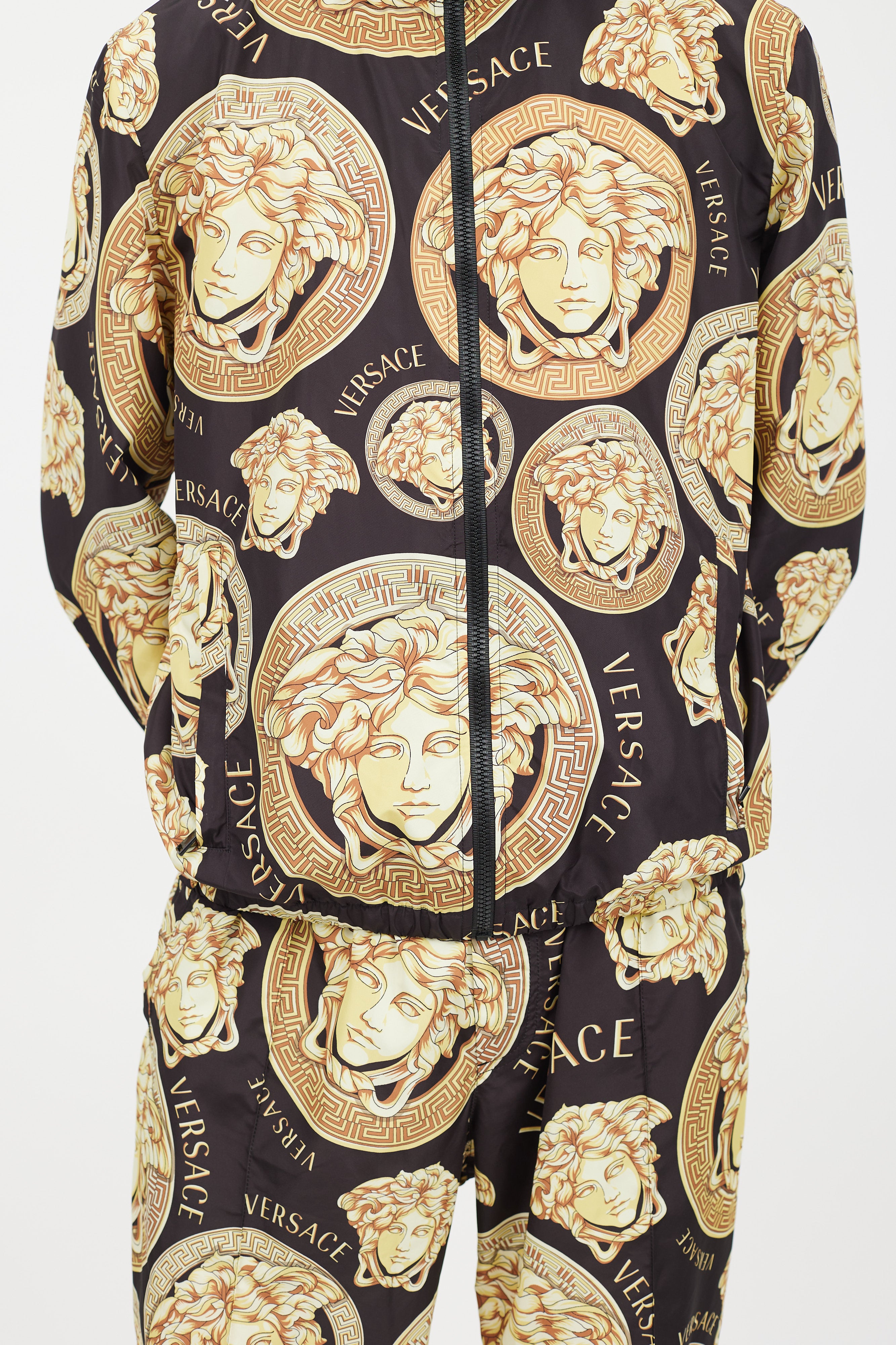 Pre-owned Versace black track jacket featuring a gold tone Medusa logo print throughout, funnel neck collar with drawstring, two zip pockets at hip, and zip closure. Matching trousers feature an elasticized waist, two slip pockets at hip, two welt pockets at back, and elasticized cuffs. All garments lined.