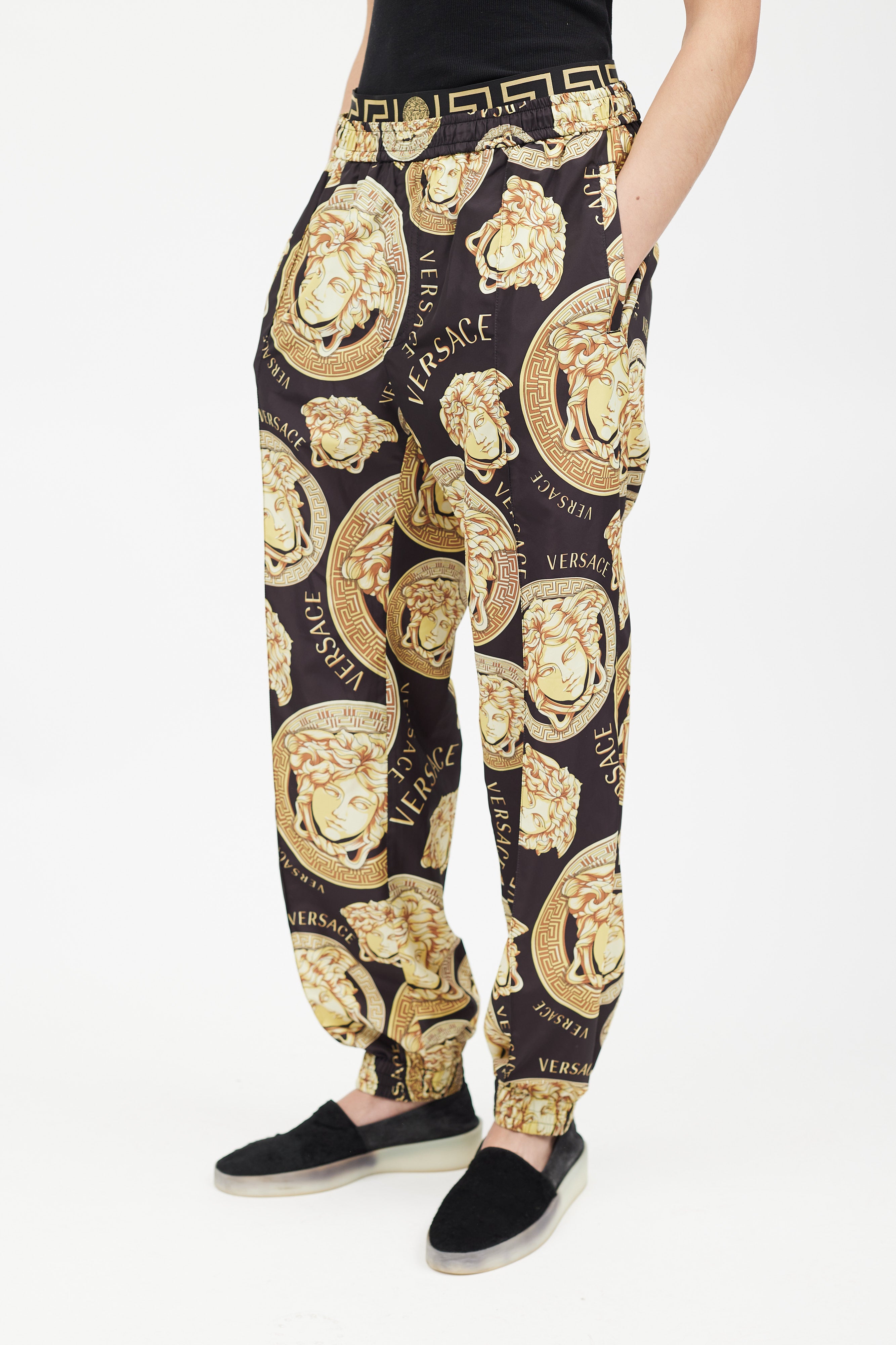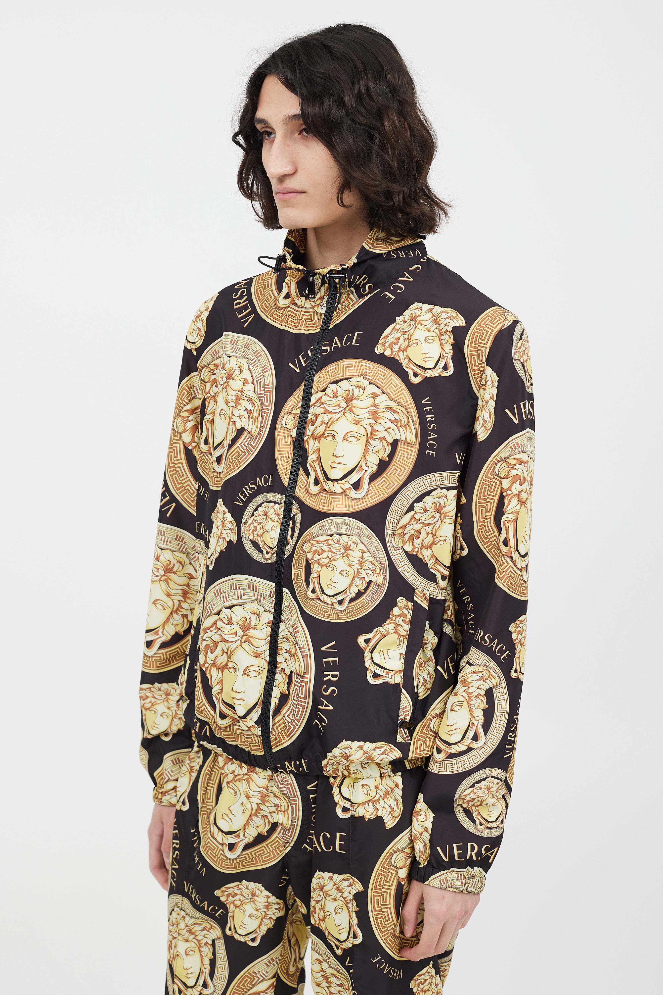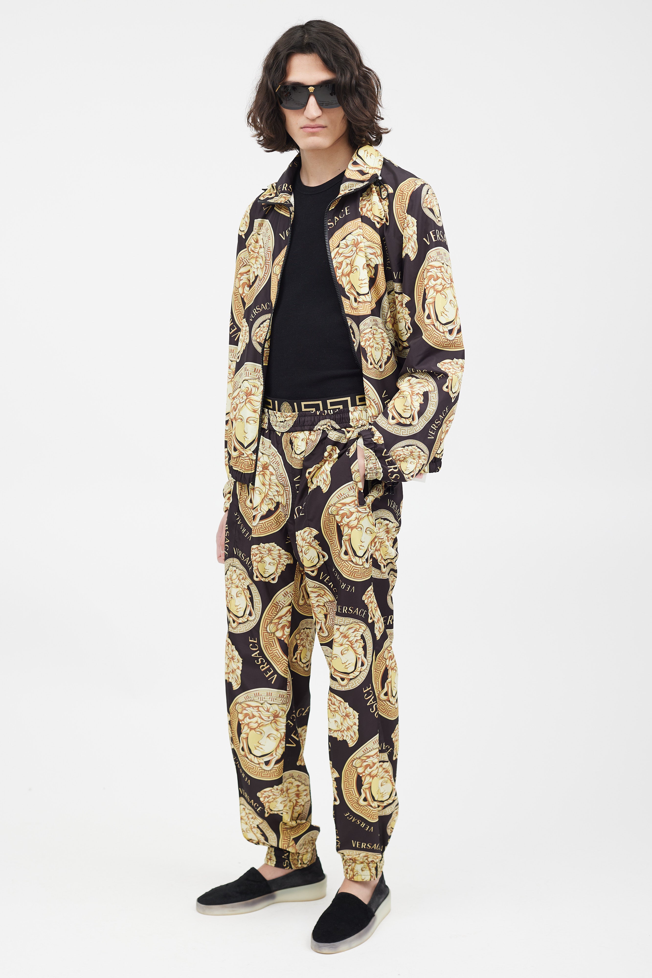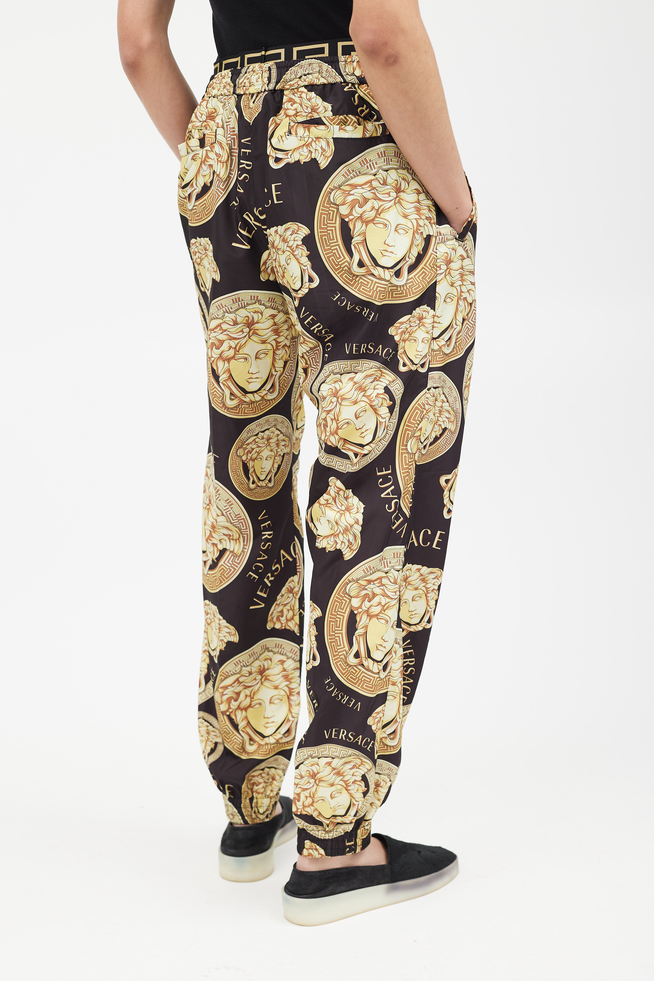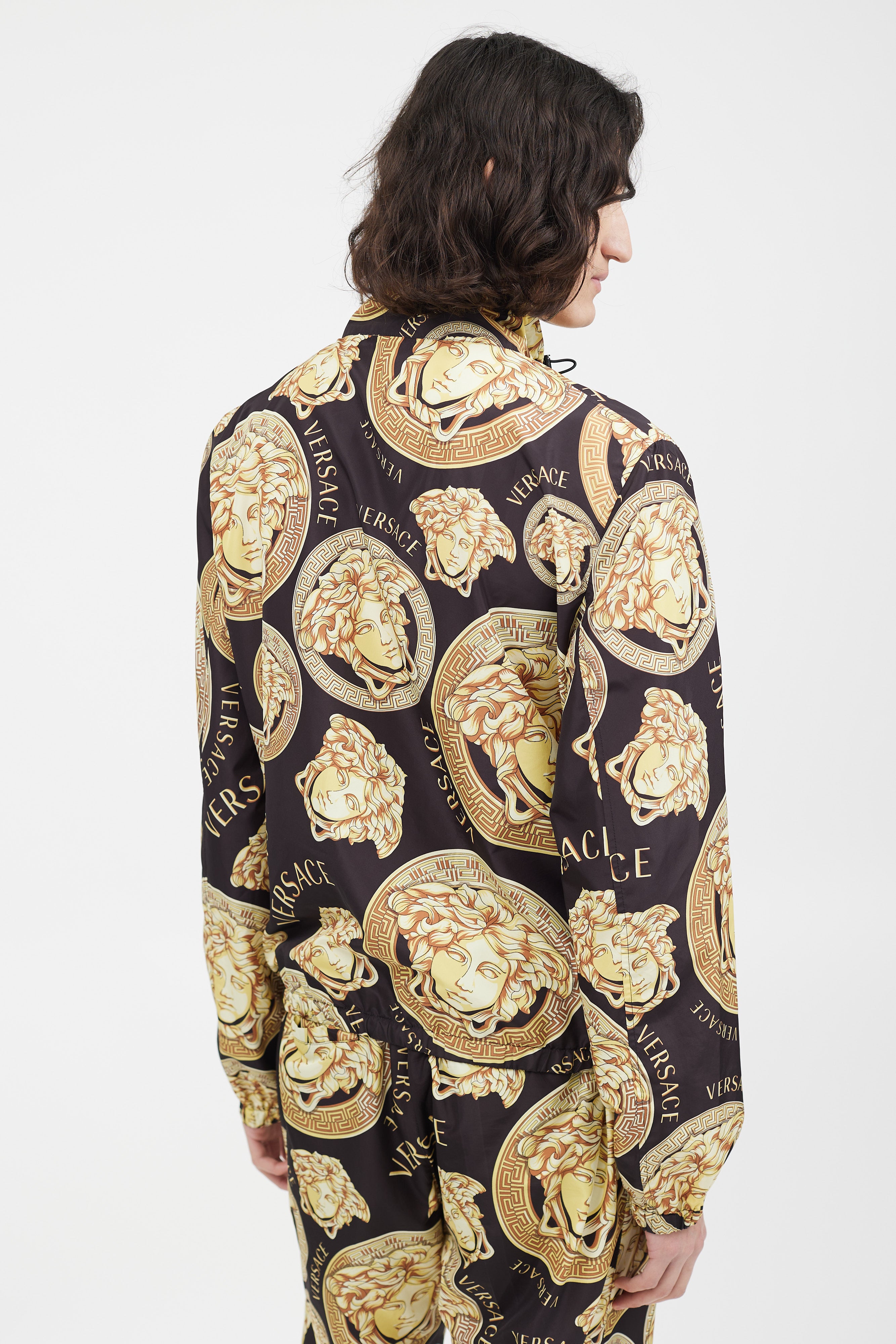 Pre-owned Versace black track jacket featuring a gold tone Medusa logo print throughout, funnel neck collar with drawstring, two zip pockets at hip, and zip closure. Matching trousers feature an elasticized waist, two slip pockets at hip, two welt pockets at back, and elasticized cuffs. All garments lined.