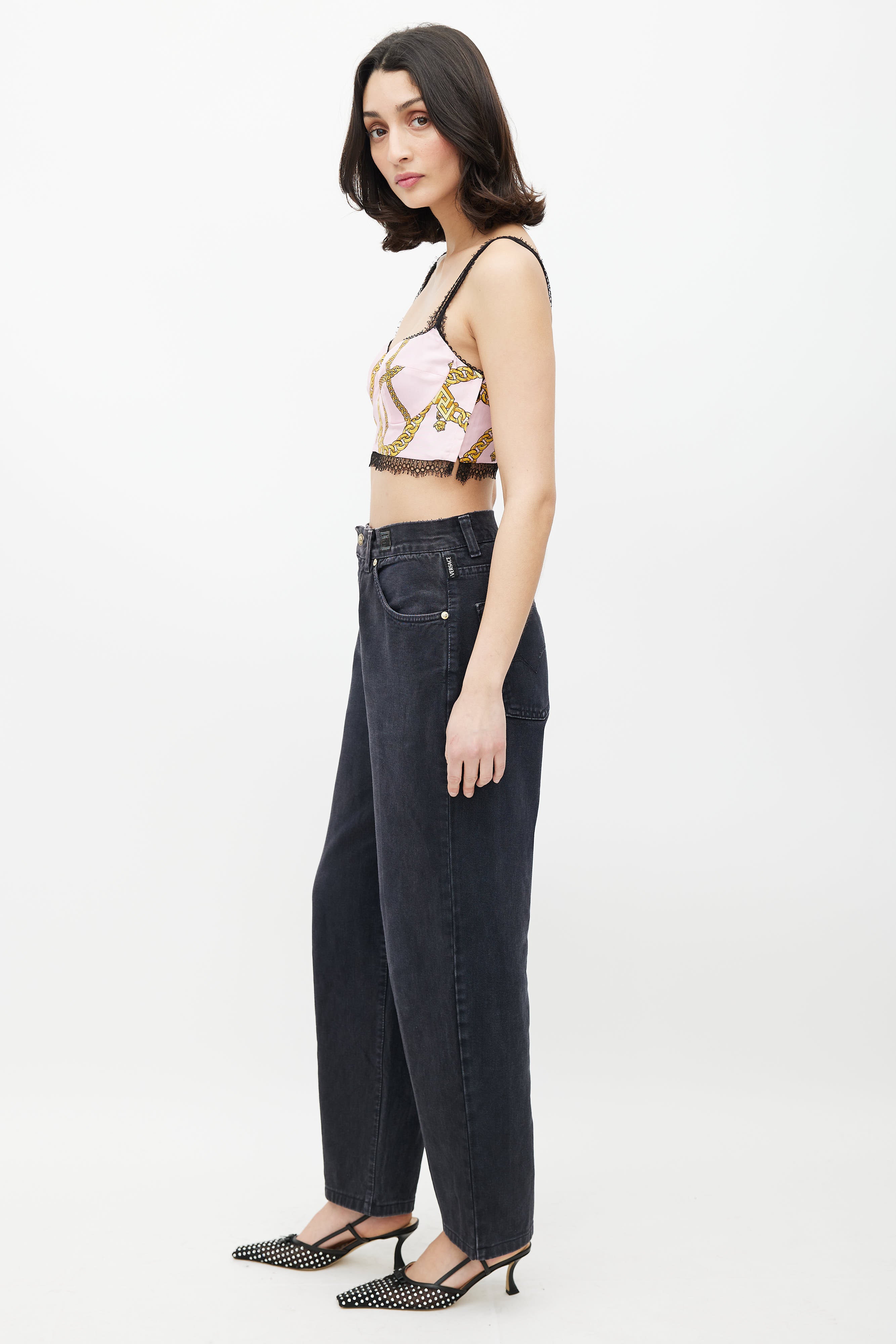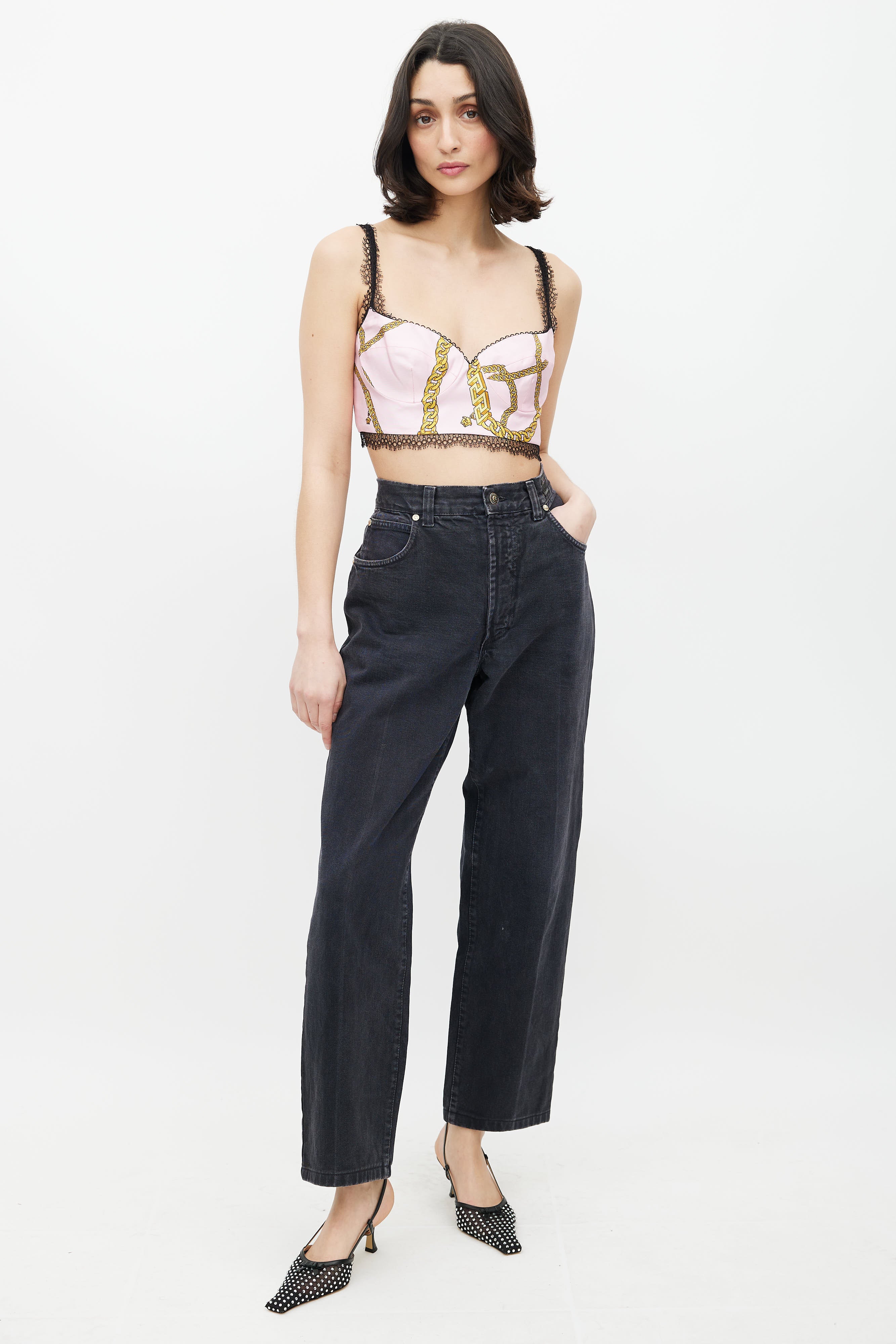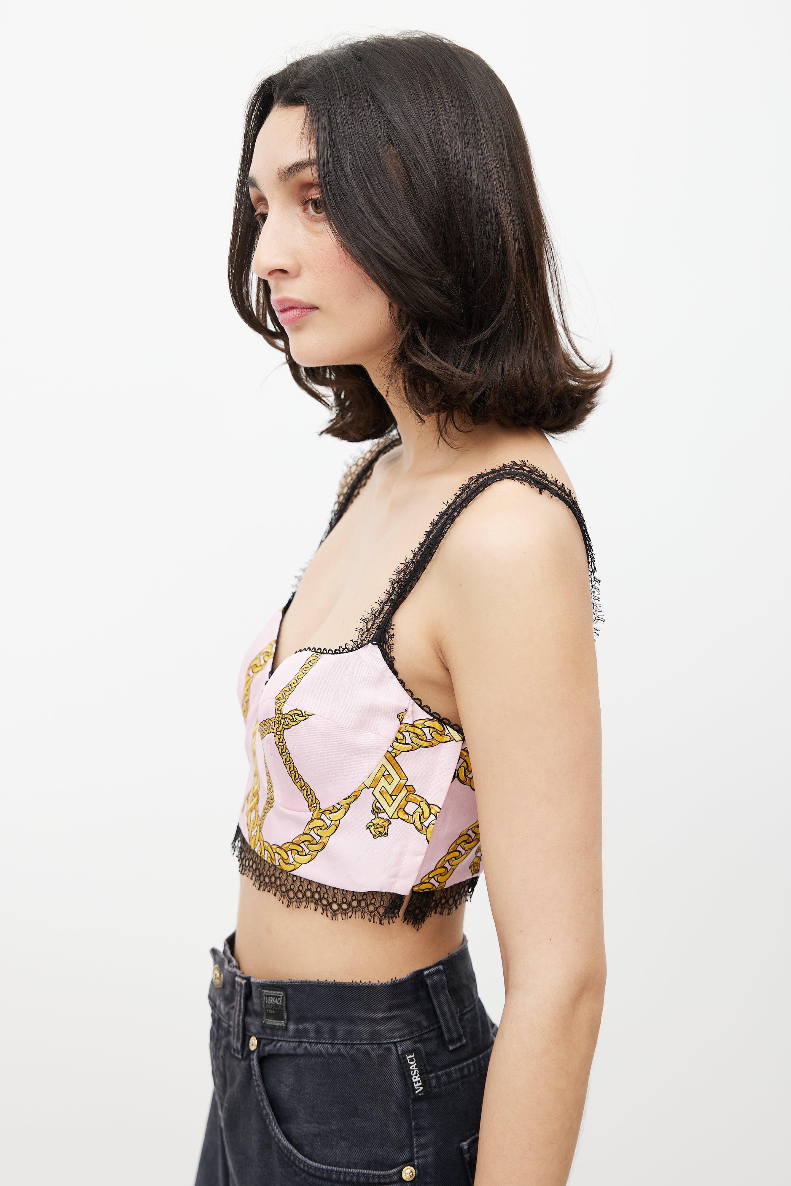 Pre-owned Versace pink top featuring a gold logo chain pattern throughout, sweetheart neckline, lace shoulder straps, cropped fit, structured bust, and zip closure at side. Lined.