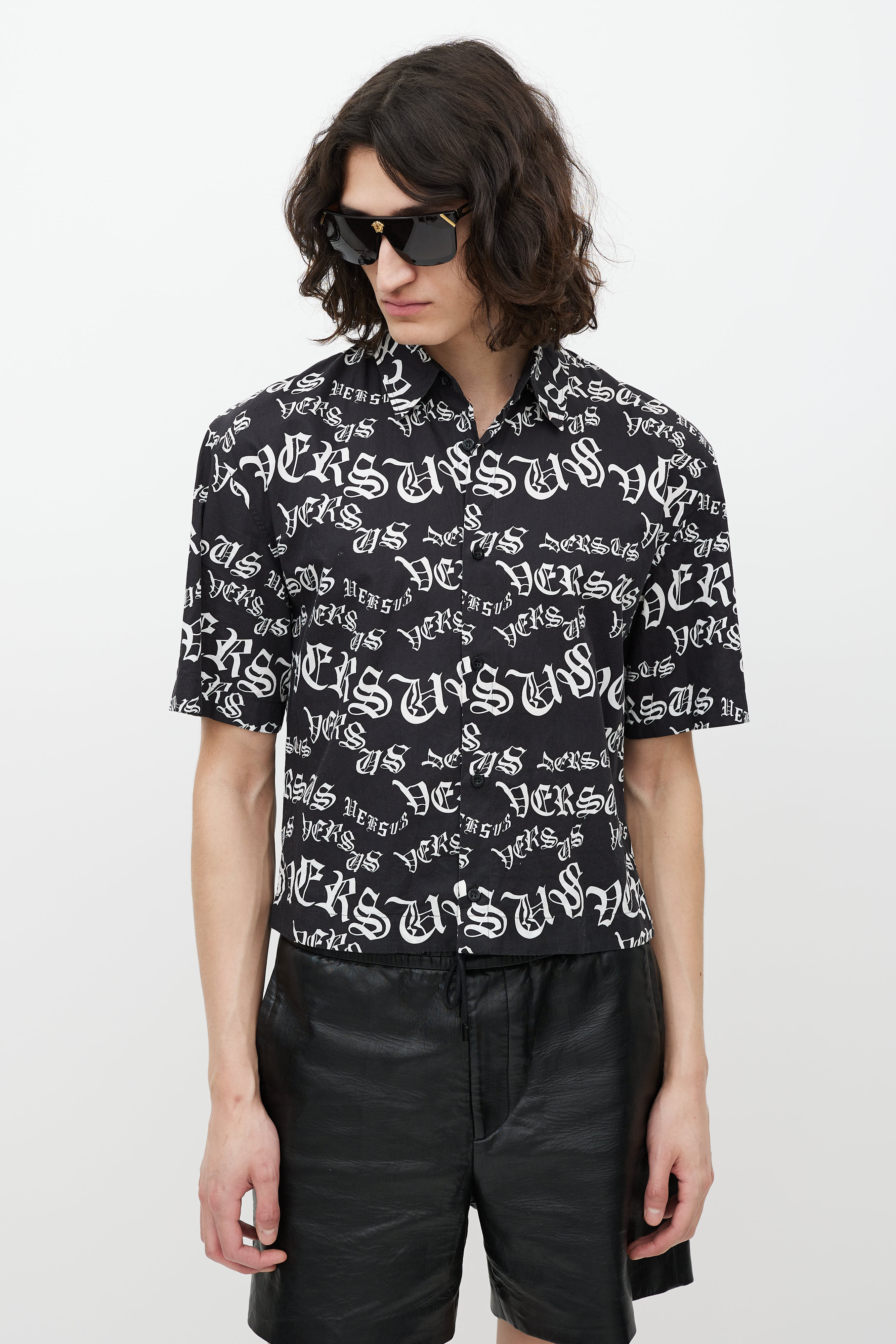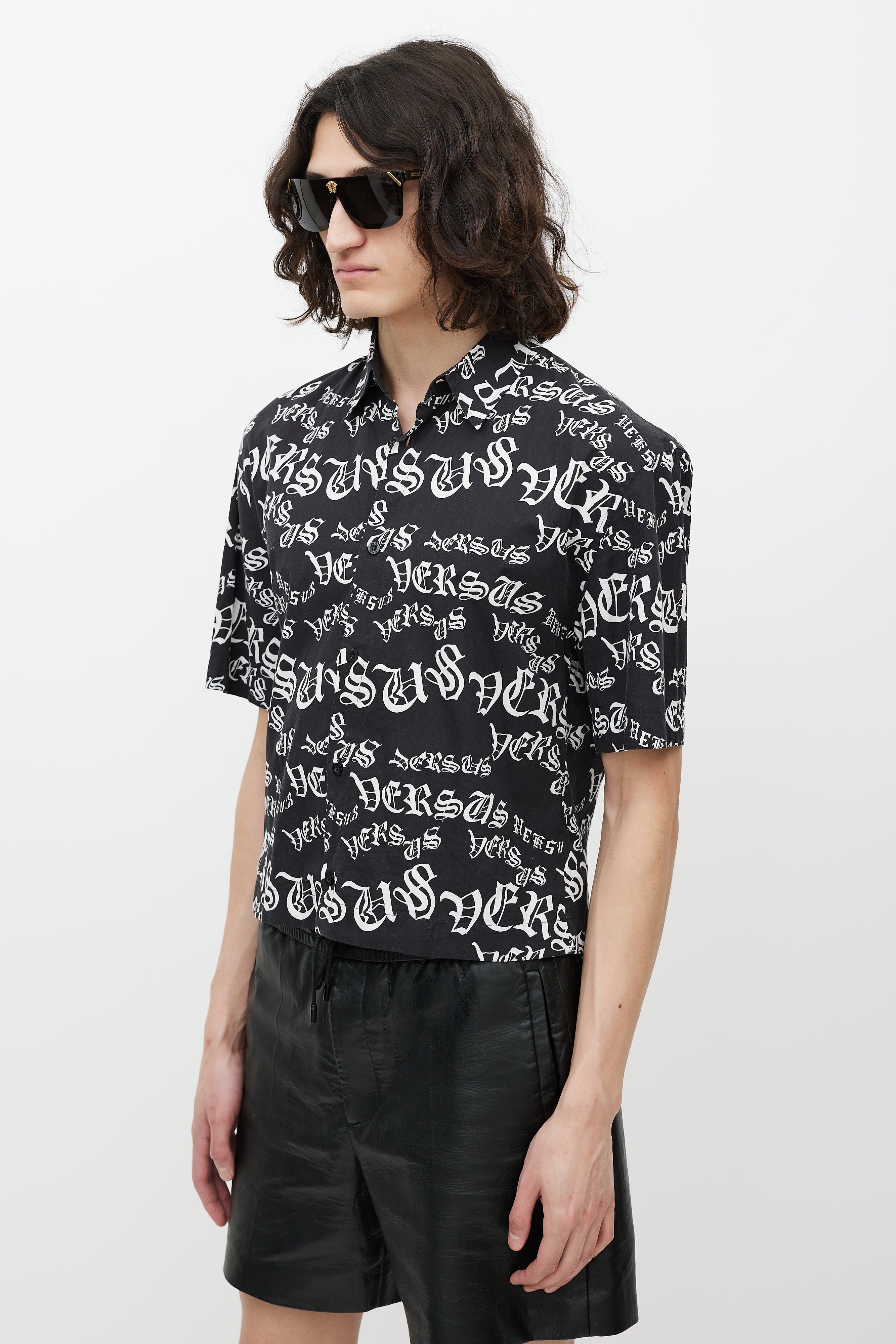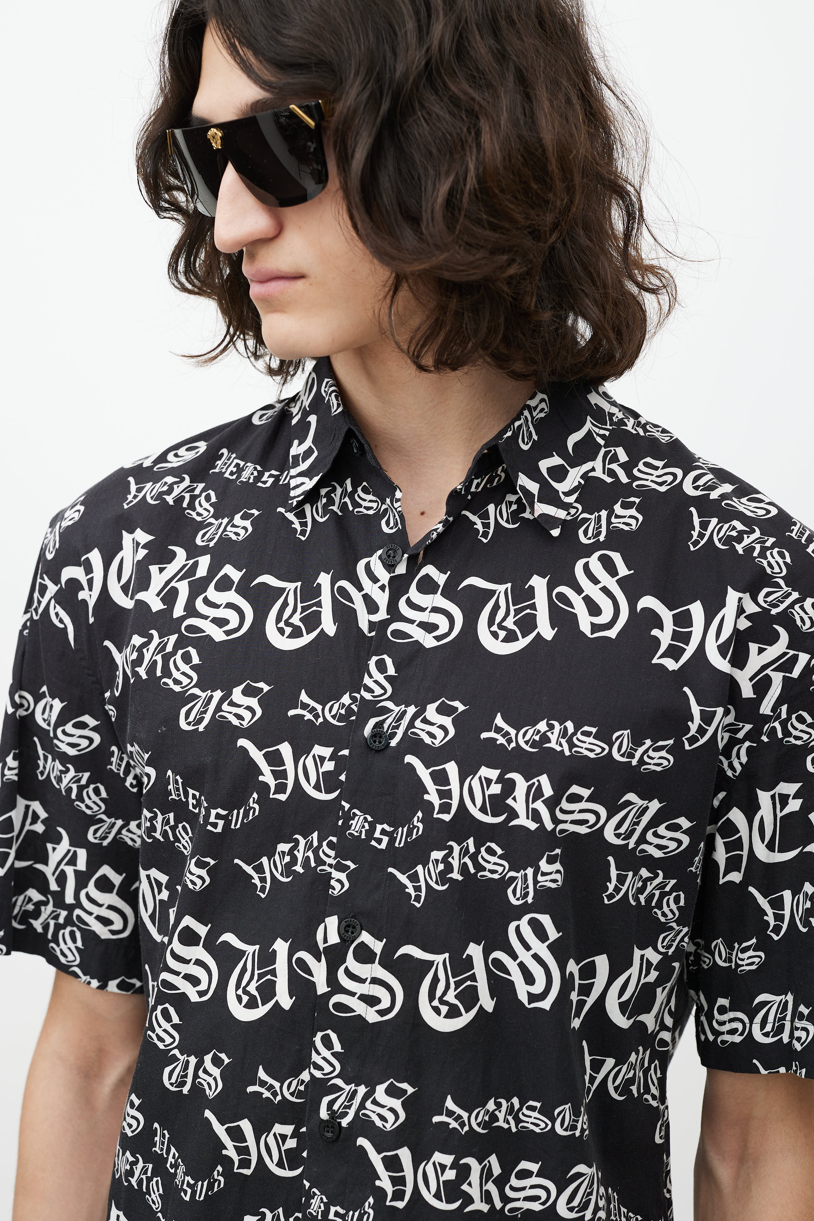 Pre-owned Versus Versace black shirt featuring a white logo print throughout, pointed collar, and button up front.