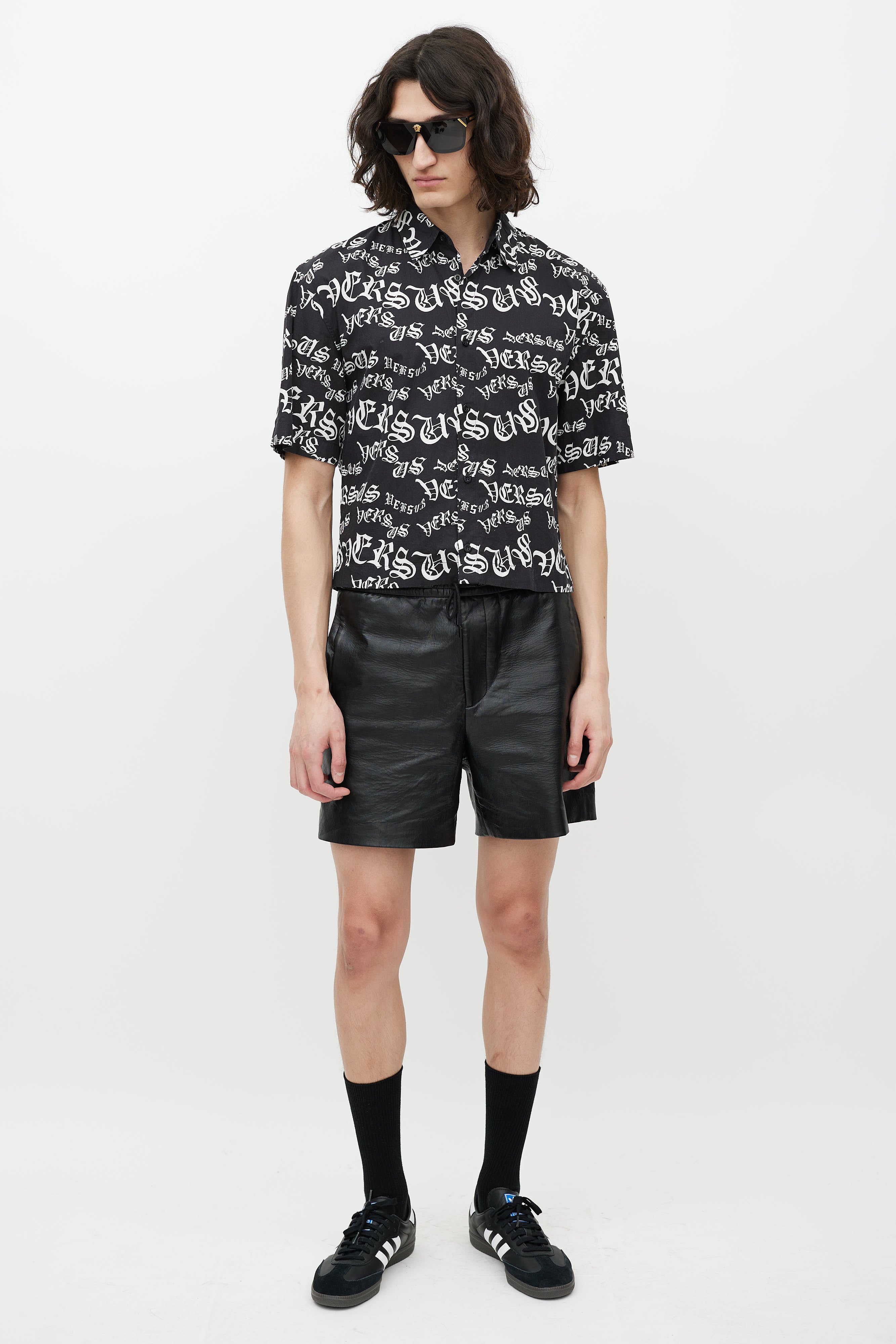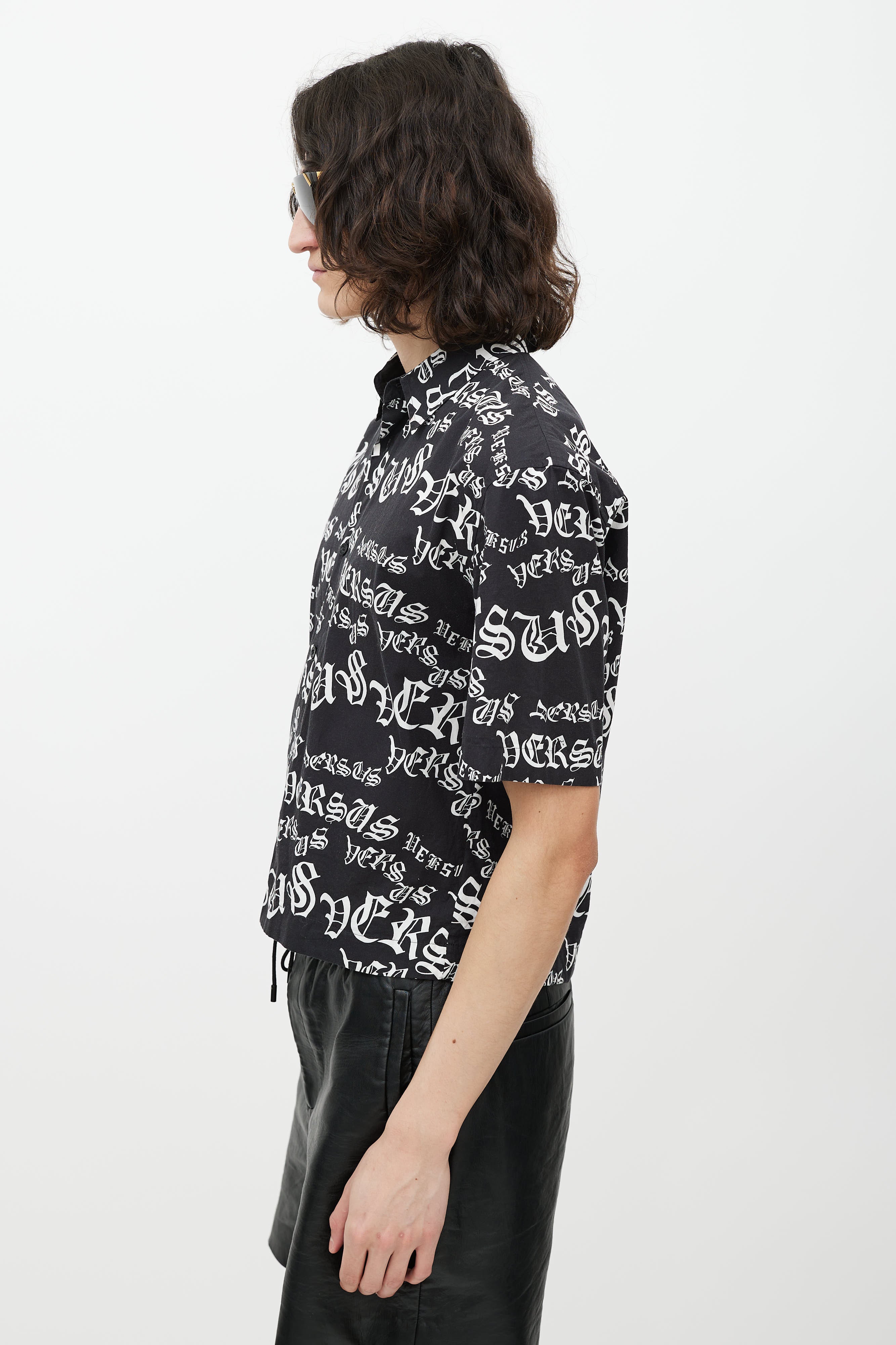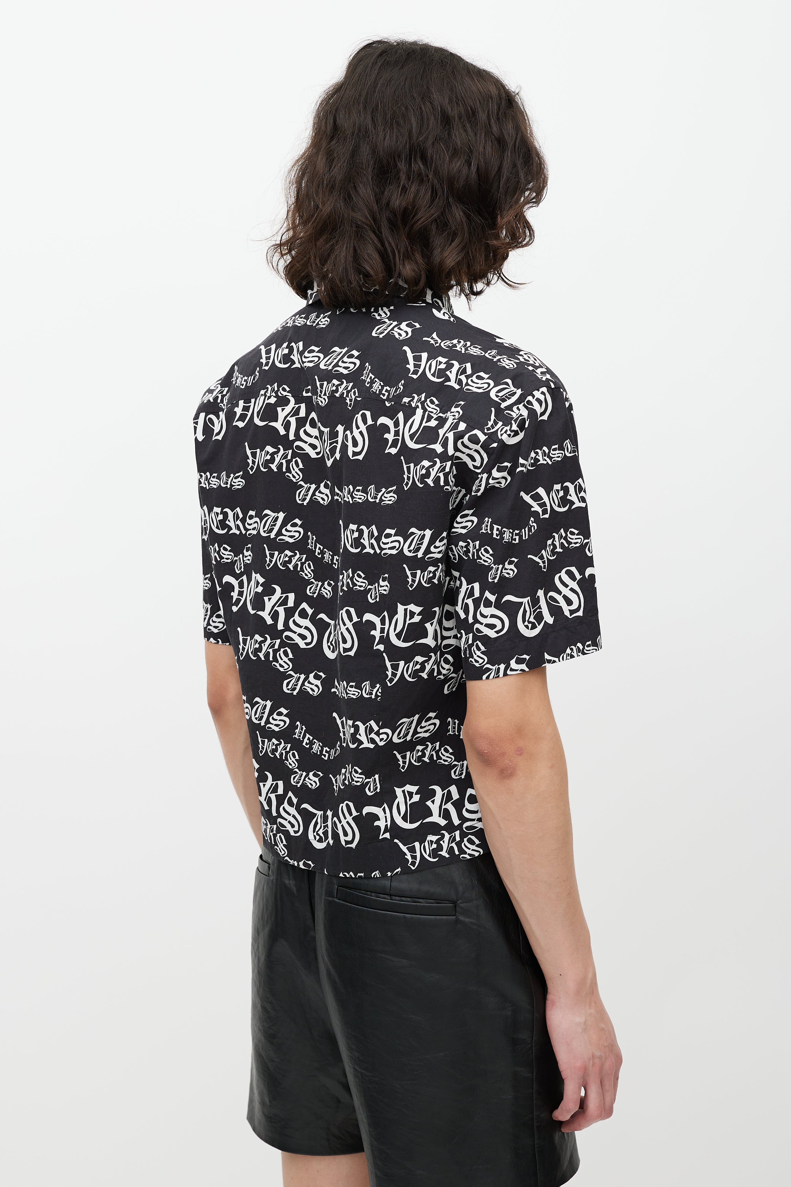Pre-owned Versus Versace black shirt featuring a white logo print throughout, pointed collar, and button up front.