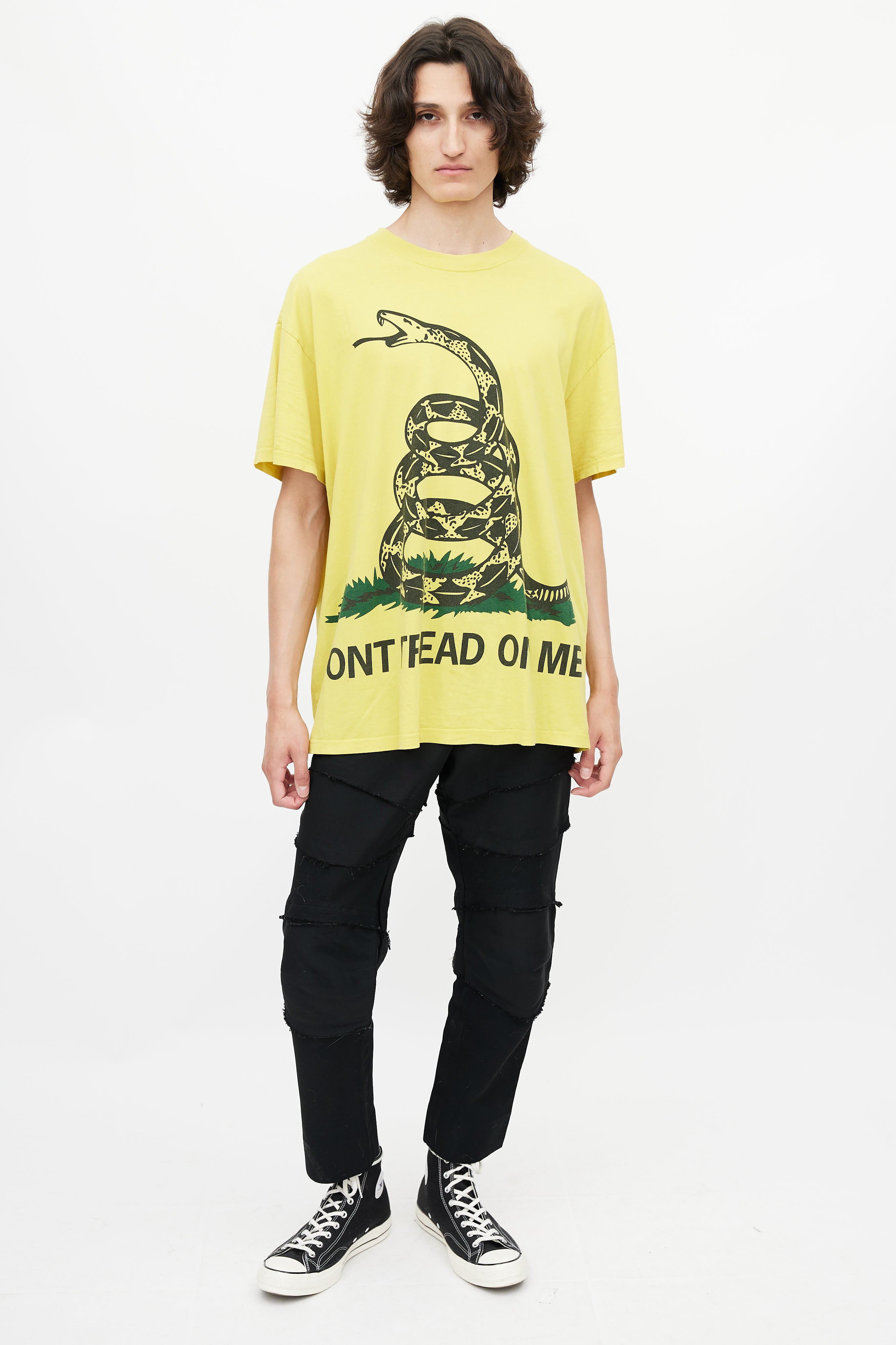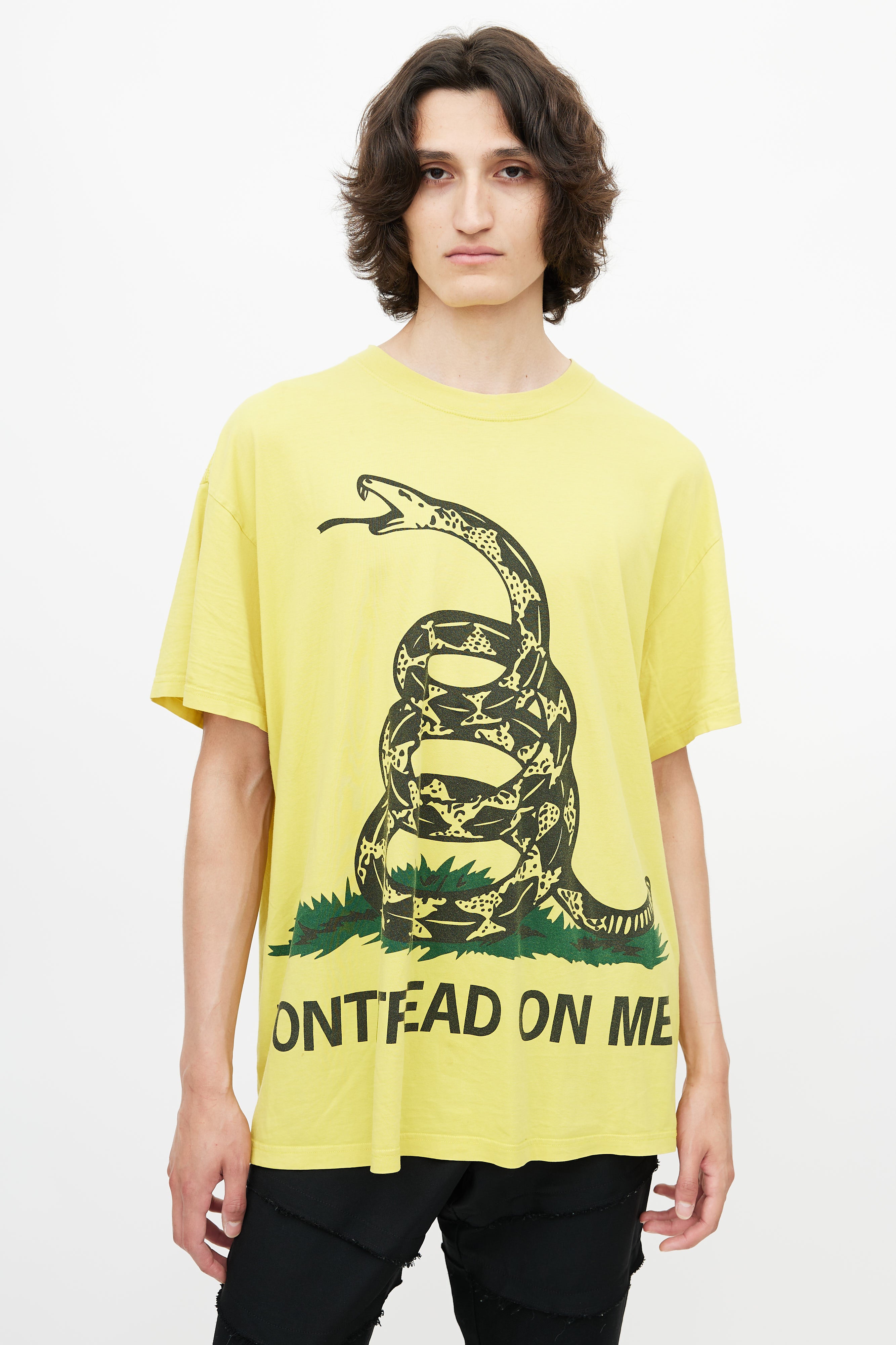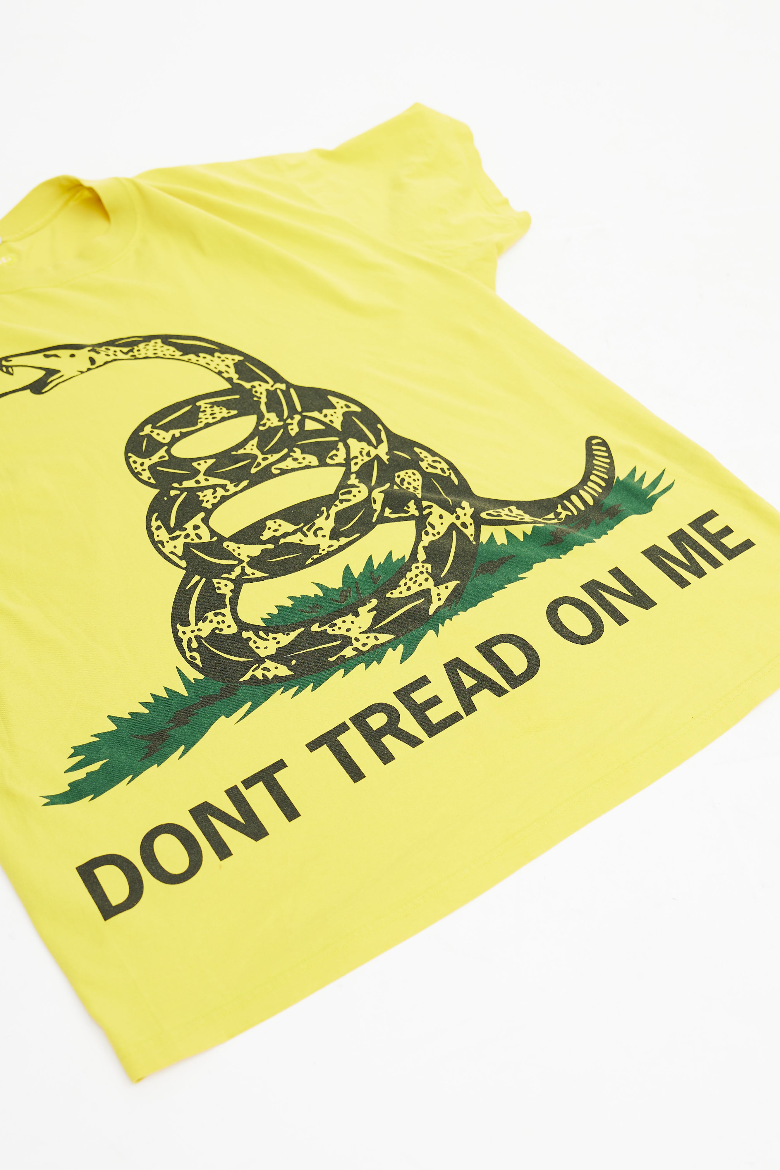 Pre-owned Vetements yellow t-shirt featuring a multicolour dont tread on me print at front, crew neckline, and tonal embroidered logo at back.