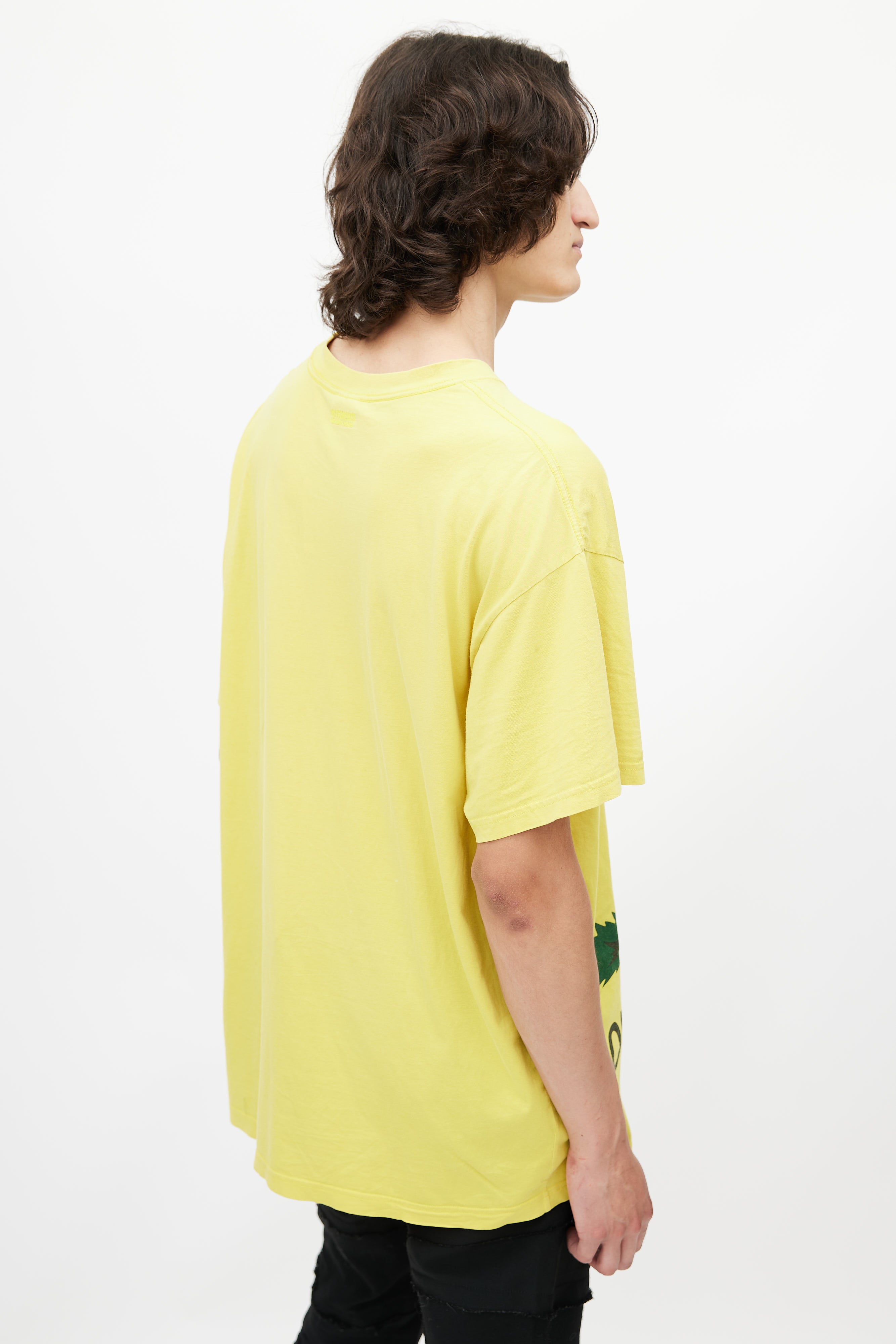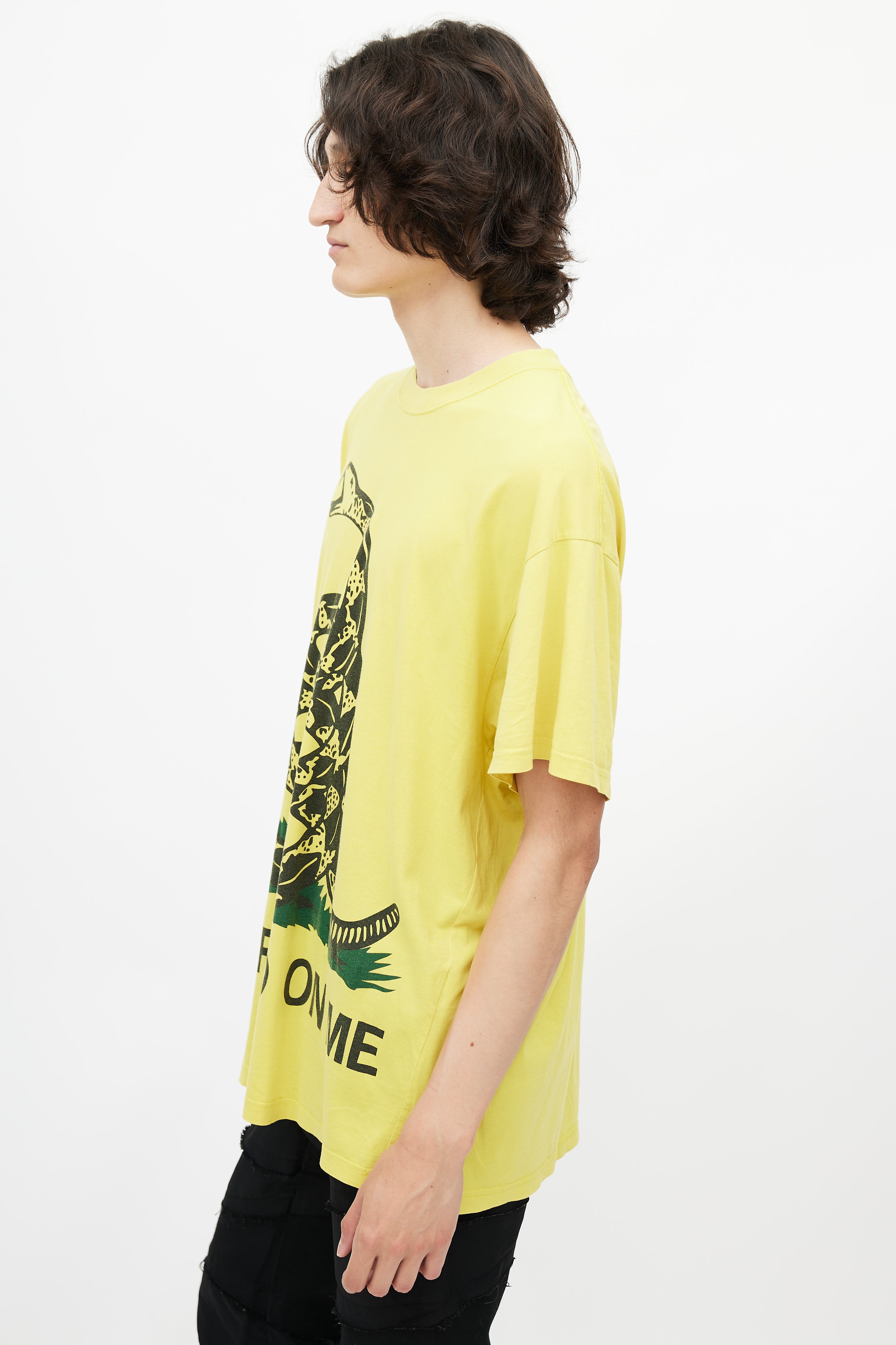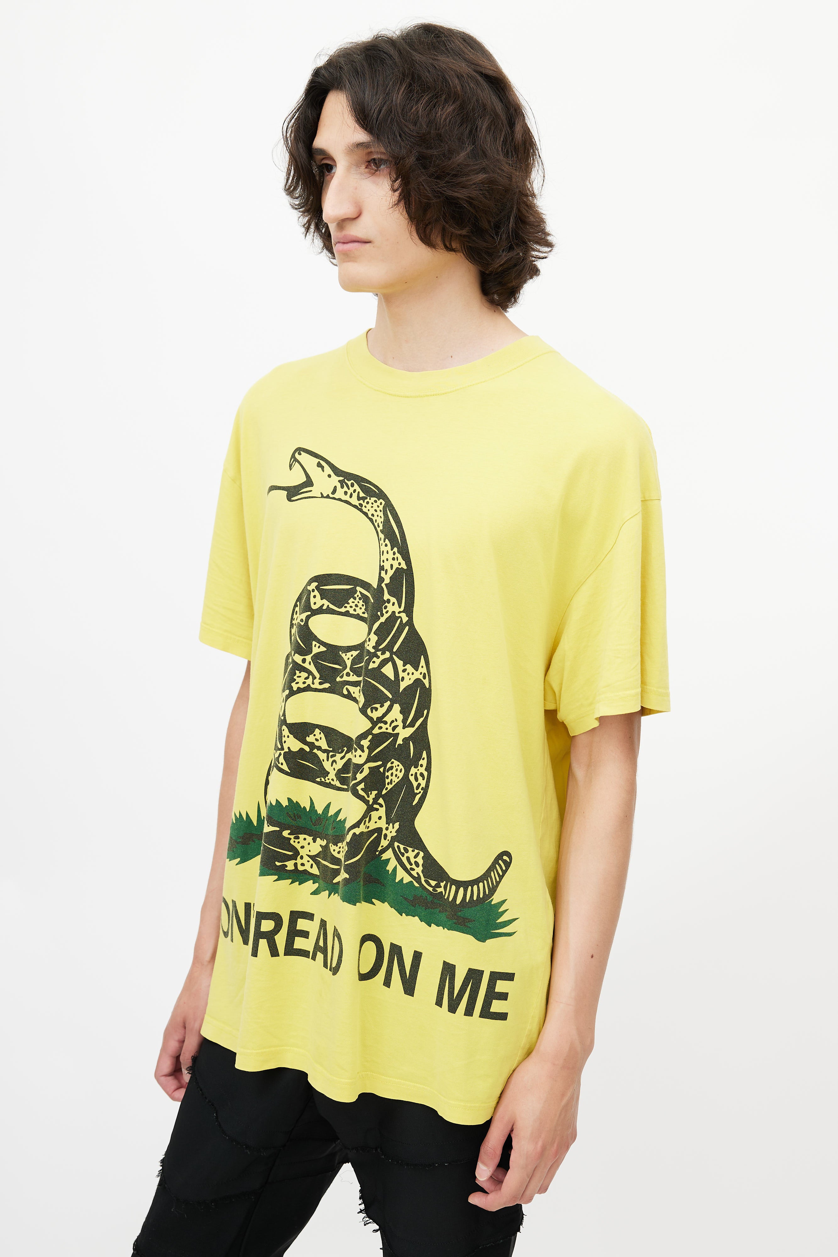 Pre-owned Vetements yellow t-shirt featuring a multicolour dont tread on me print at front, crew neckline, and tonal embroidered logo at back.