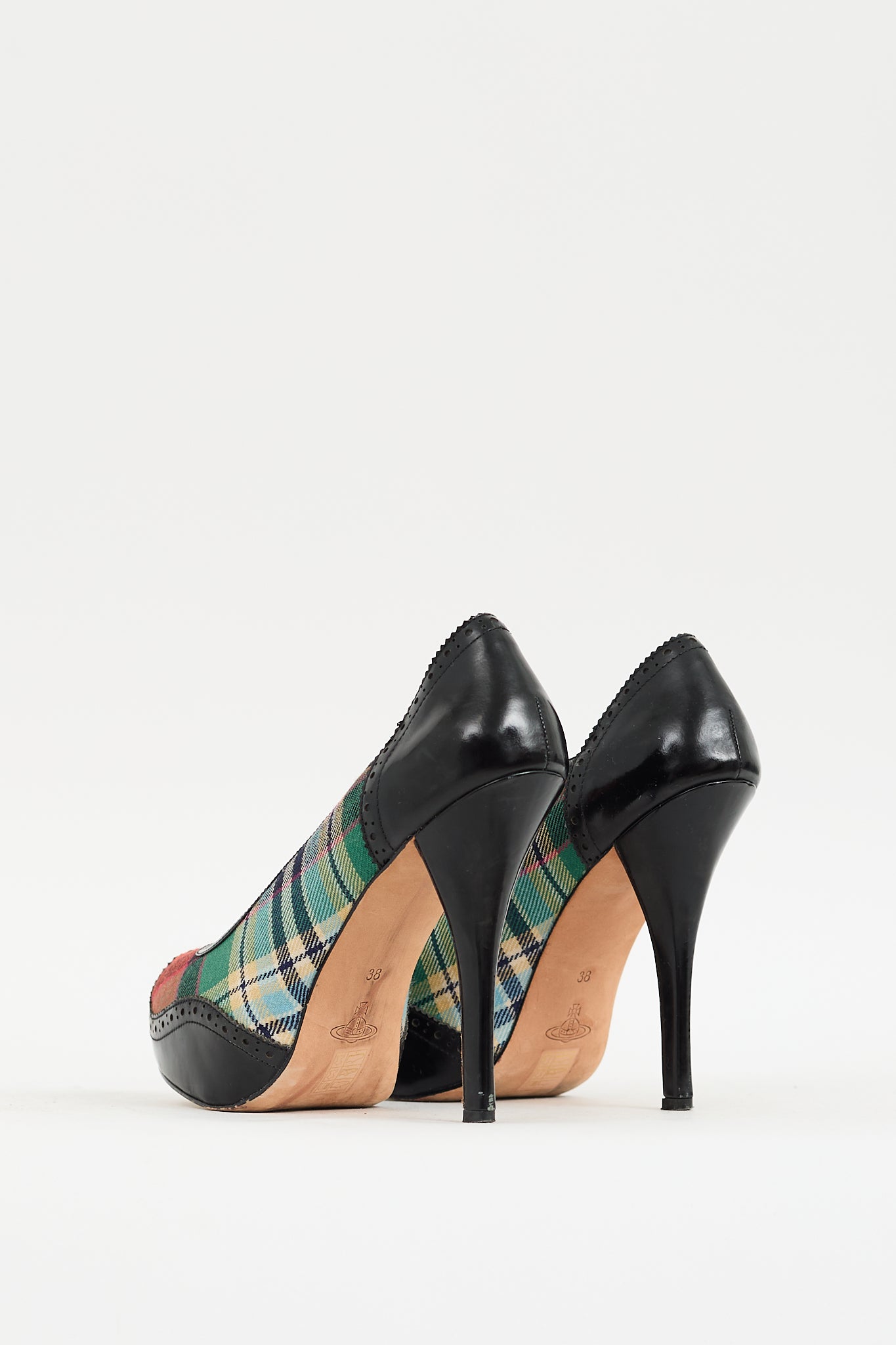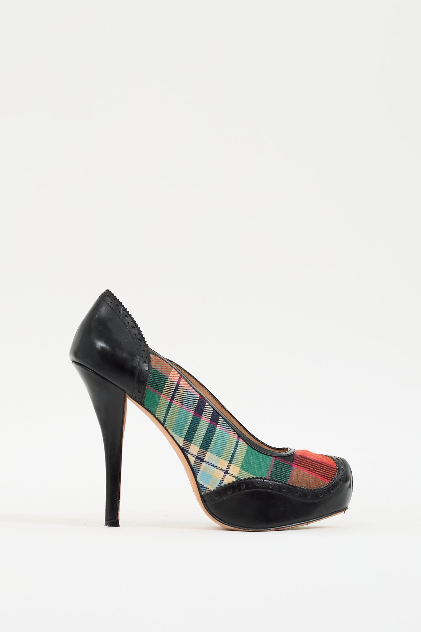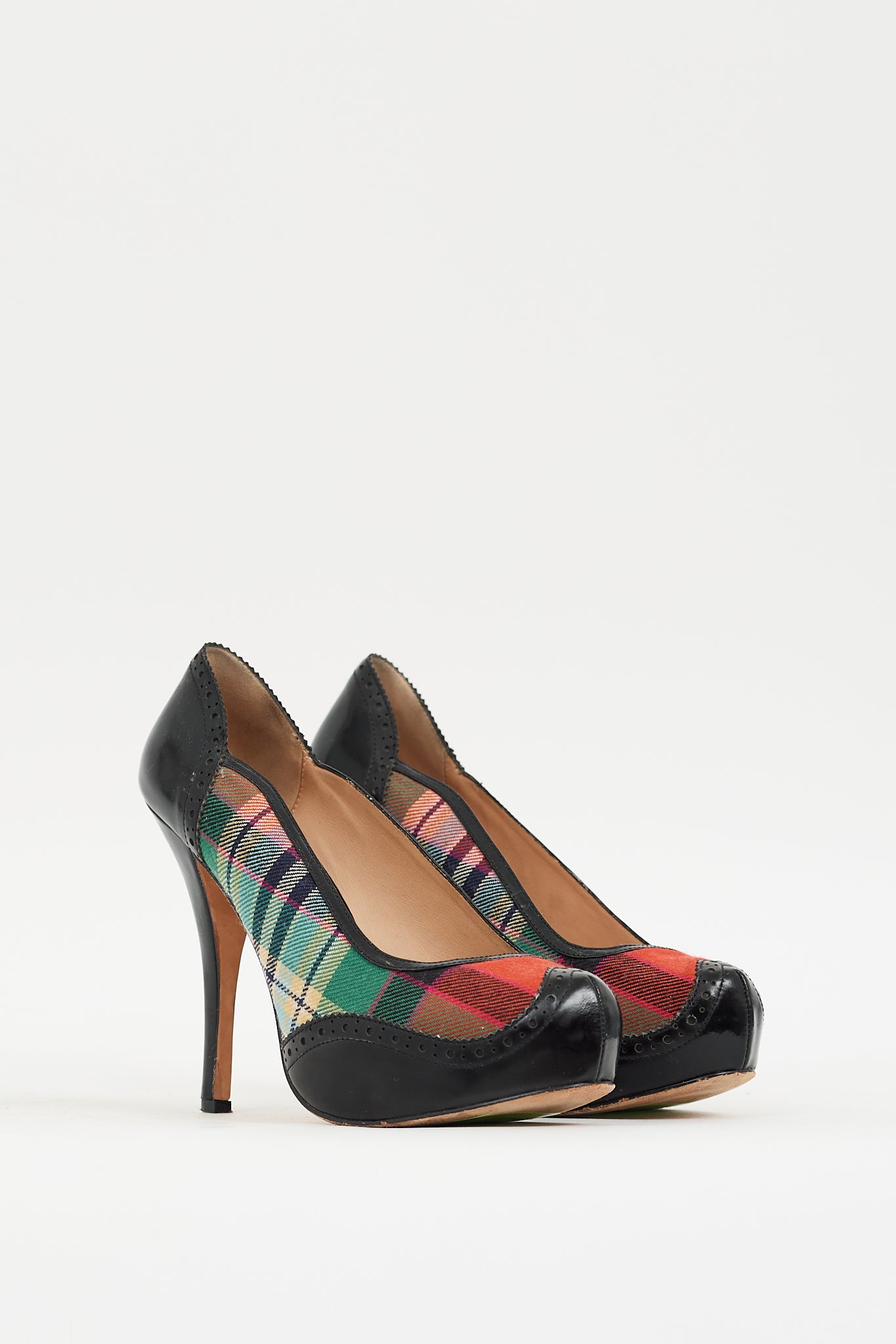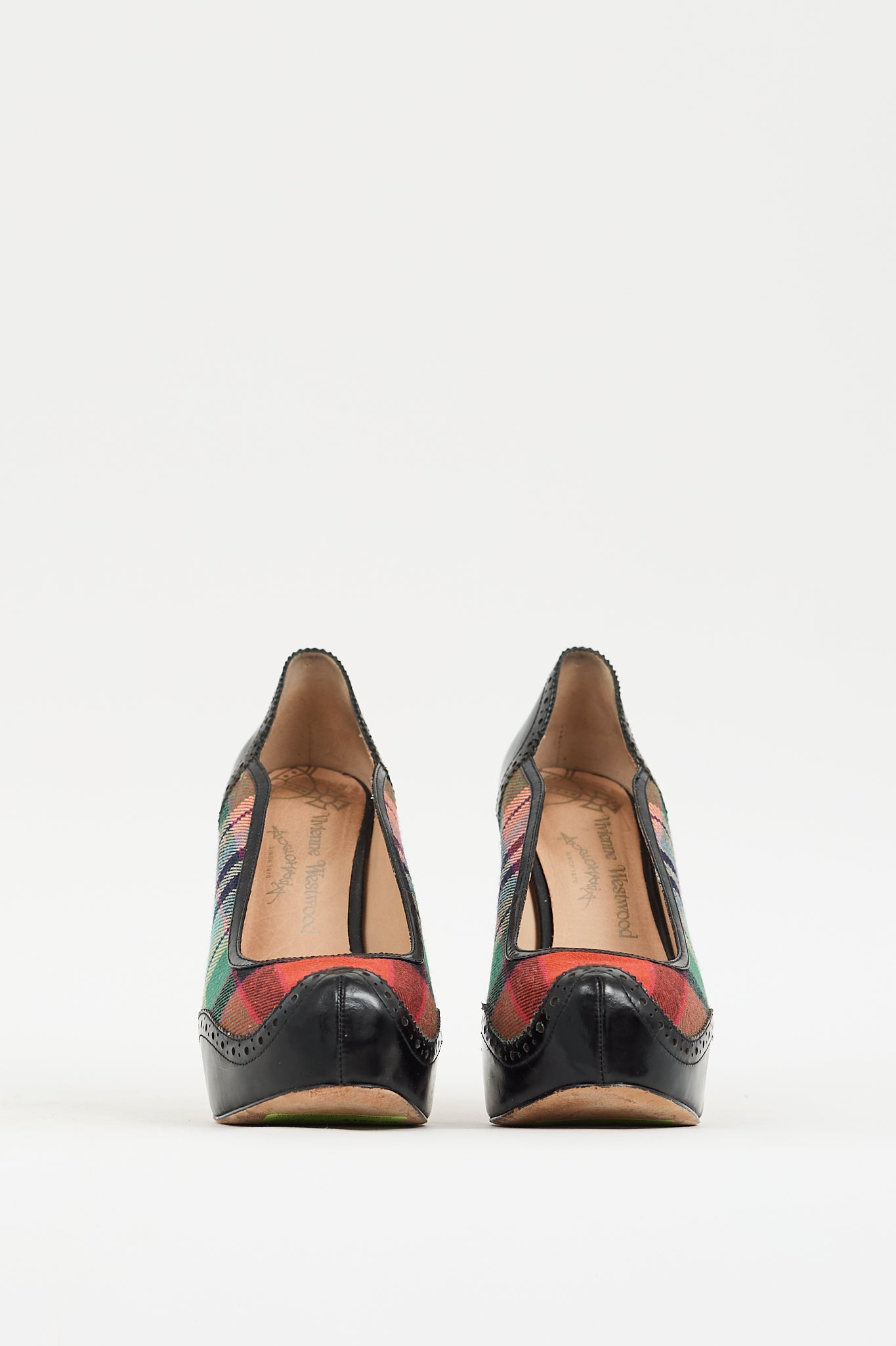 Pre-owned Vivienne Westwood Anglomania pumps featuring a rounded toe, red and multicolour plaid upper, black leather panelling with wingtip and perforation throughout, concealed platform, covered continental heel, and leather insole and outsole.