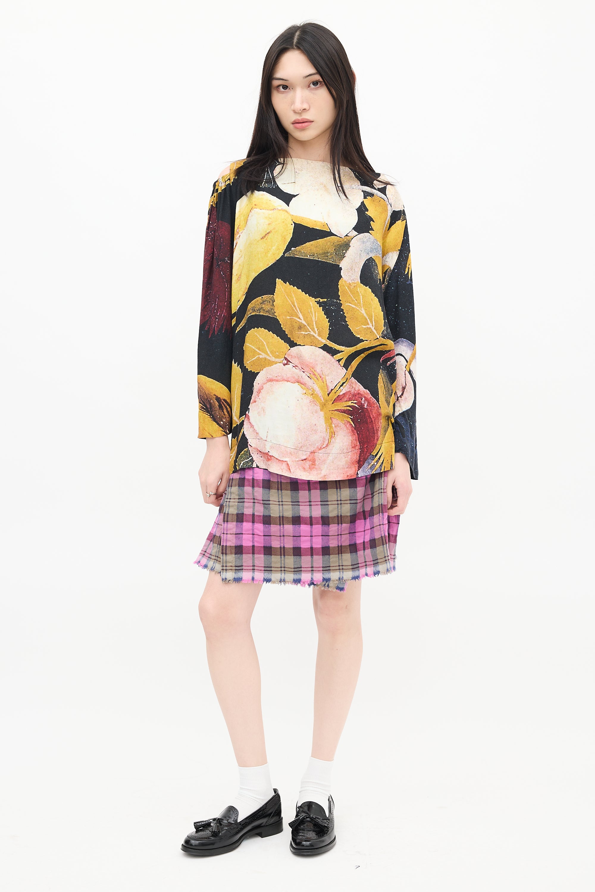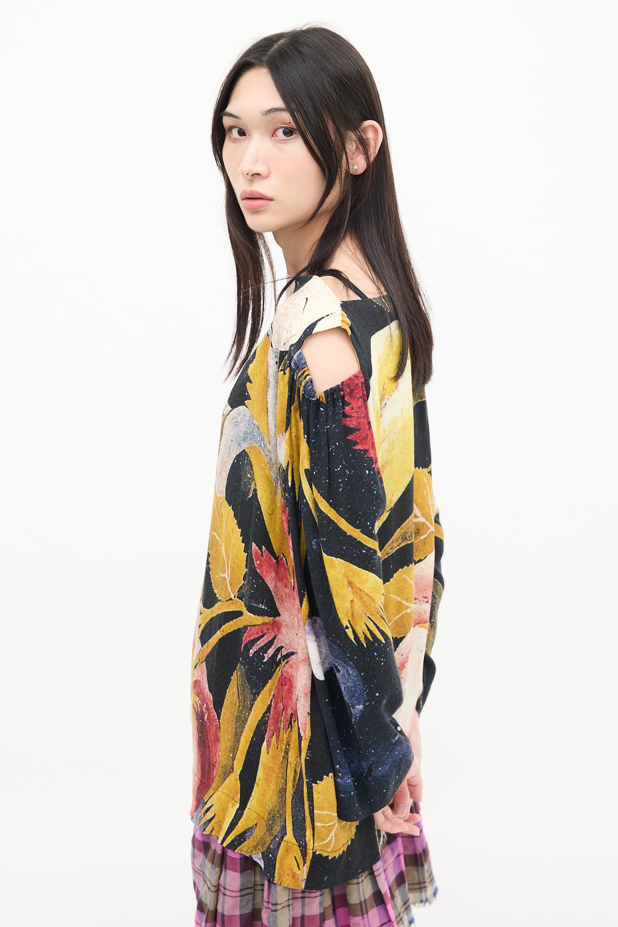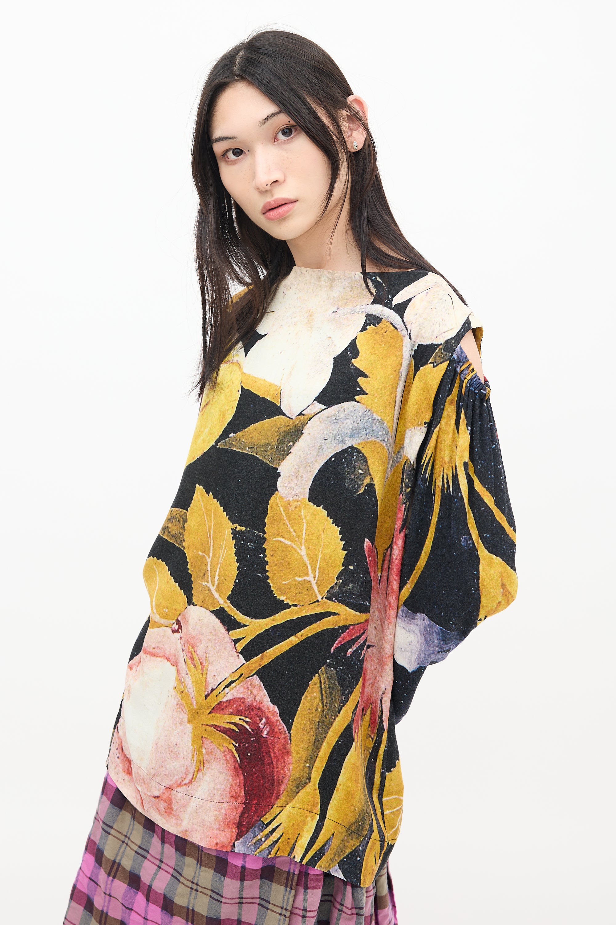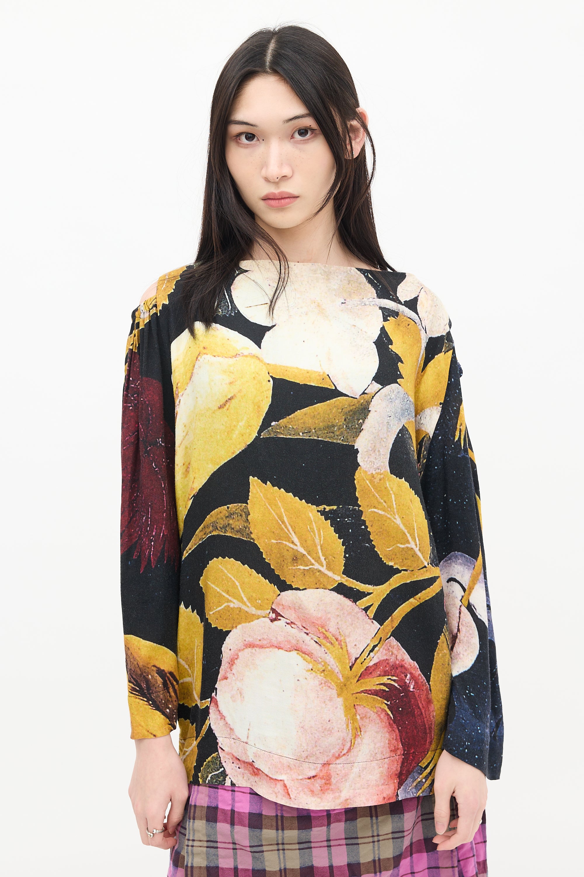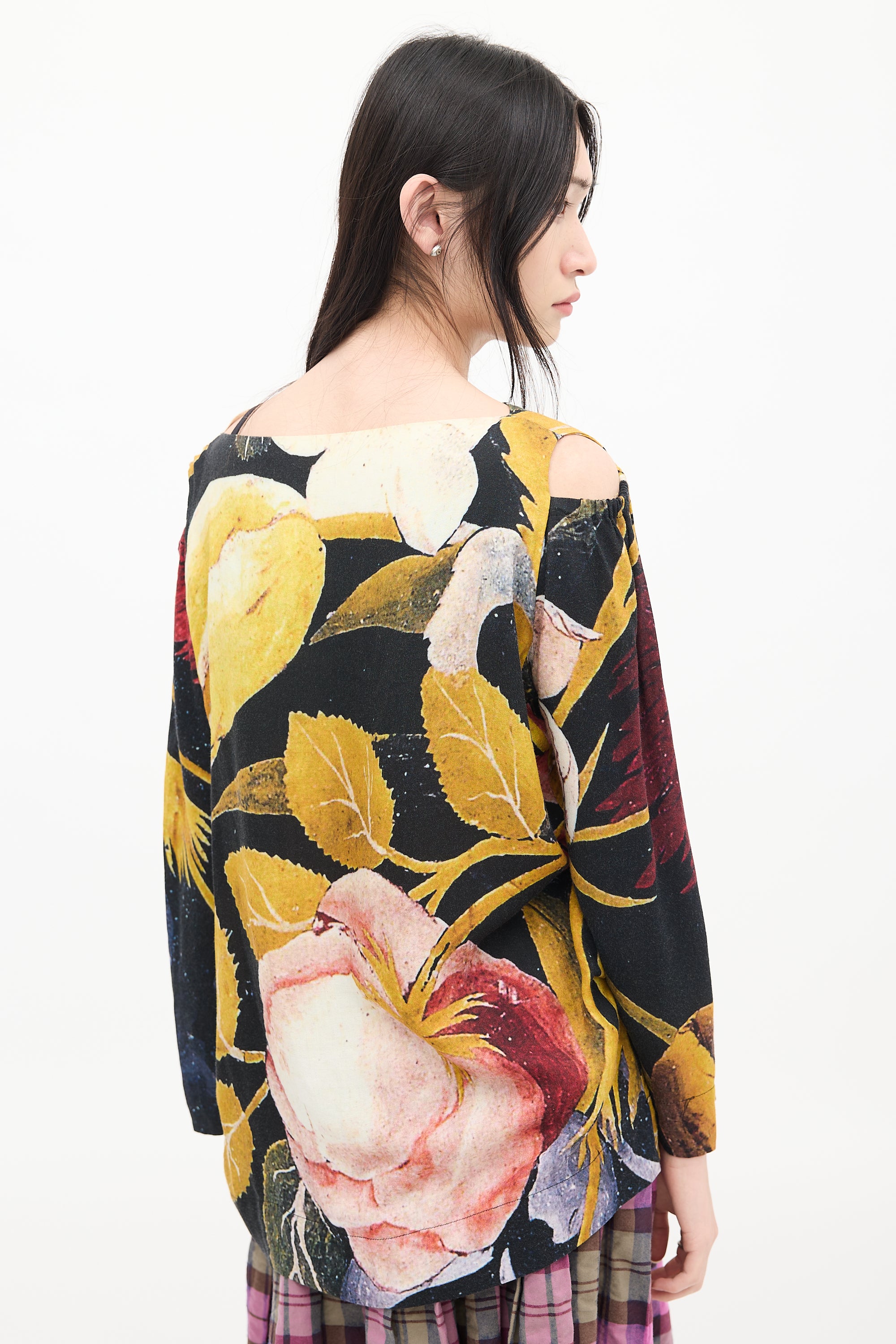 Pre-owned Vivienne Westwood Anglomania black and multicolour wool blend top featuring a bateau neckline, elasticized cold shoulder design, long sleeves, and floral pattern throughout.